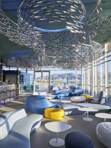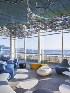 Le Sky Bar : Entre le lustre composé de 4000 sardines d’acier (réalisé pour Sciabetti par l’artiste anglaise Frances Bromley) et le mobilier sobre évoquant les vagues et les galets, le bleu clair du ciel et le bleu sombre des profondeurs aquatiques, le sky-bar est un plongeon visuel magnifique dans la rade de Marseille.