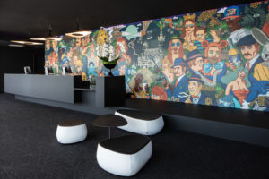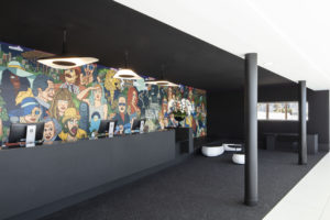 Le Lobby : Derrière le desk, une fresque de l’artiste marseillais Tristan Bonnemain qui met en scène des personnages marseillais historiques ou contemporains, réels ou fictifs.