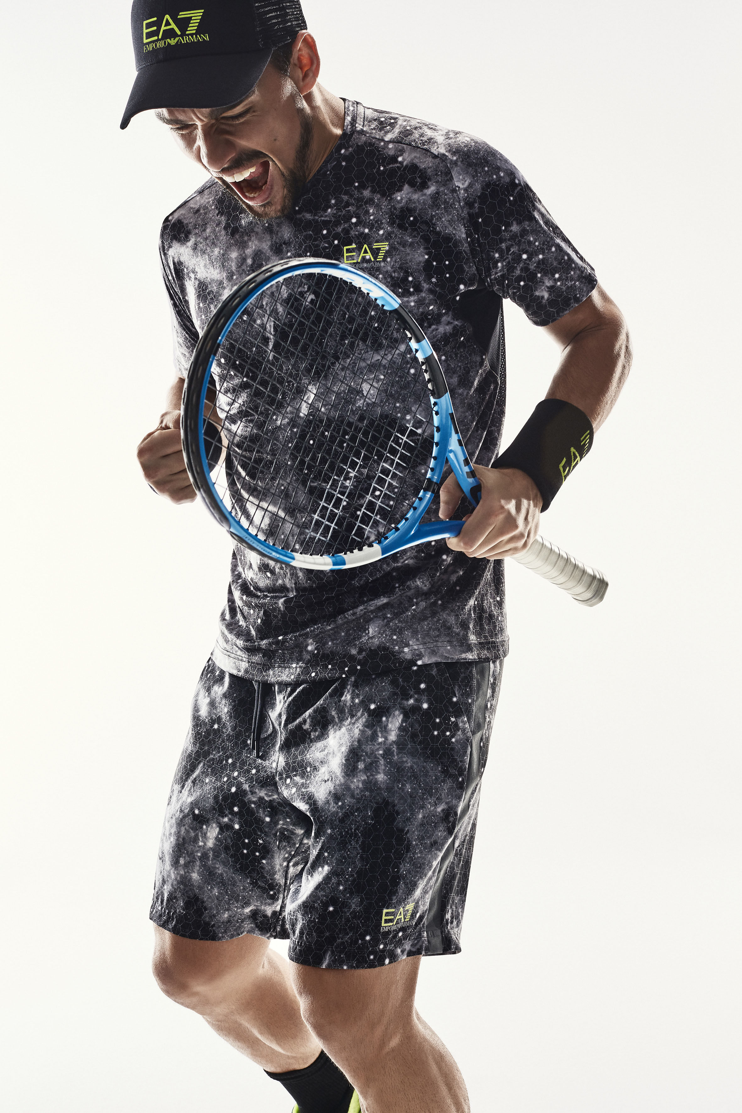 Les tenues techniques comprennent des t-shirts et des shorts fonctionnels – une en vert et gris et l’autre en motifs graphiques gris; un polo de tennis supplémentaire et des shorts en bleu complètent le vestiaire. Les tenues ont été pensées de manière à accompagner les performances sportives. La technologie VENTUS, avec son système innovant régulant la tempéarture du corps et ses finitions résistantes à l’abrasion, répond aux attentes des joueurs de tennis, jouant aussi bien à l’intérieur qu’à l’extérieur. Les silhouettes sont inspirées par la collection estivale EA7 et sont complétées par des serre-poignets, des visières, des chaussettes et des sweats à capuche en coton French Terry.