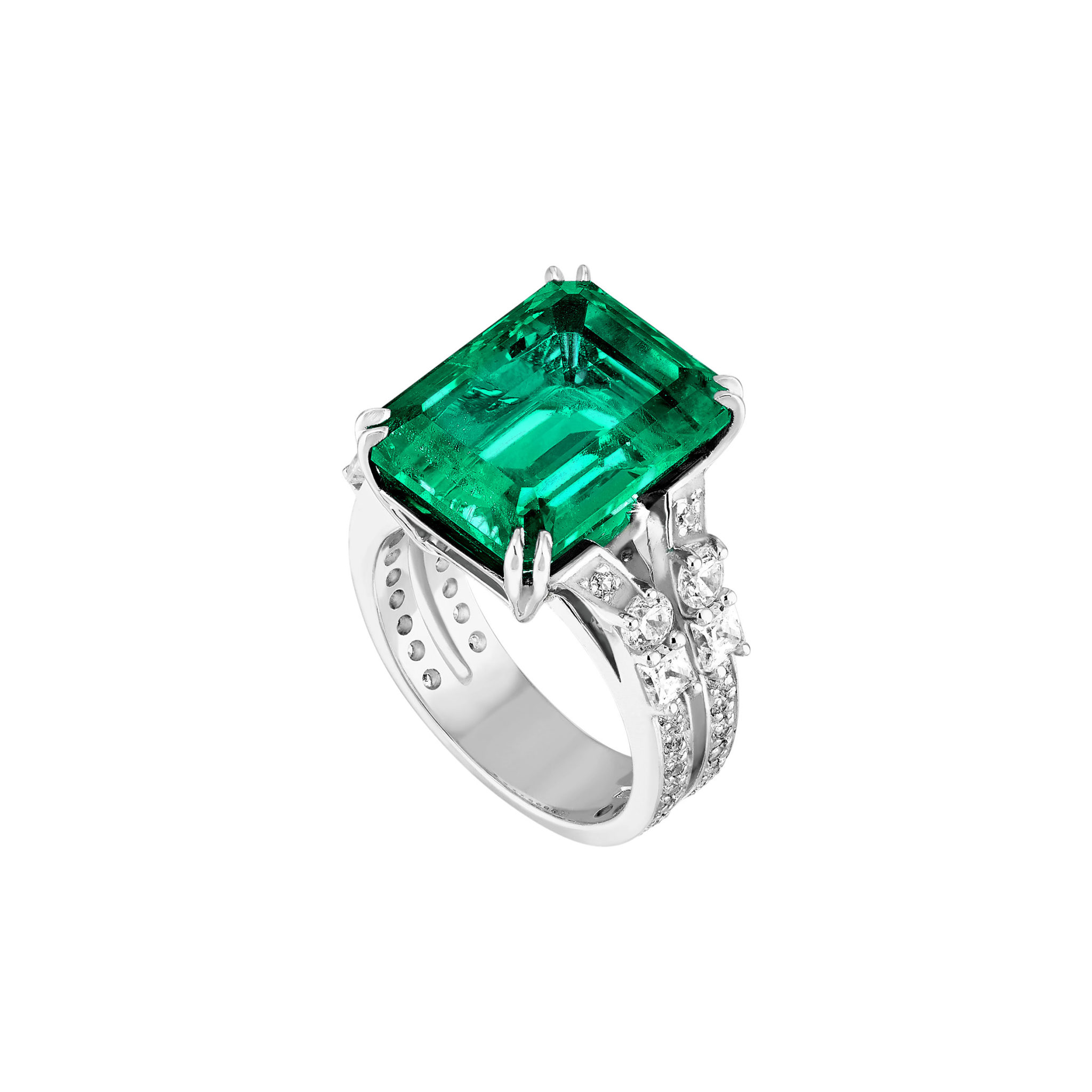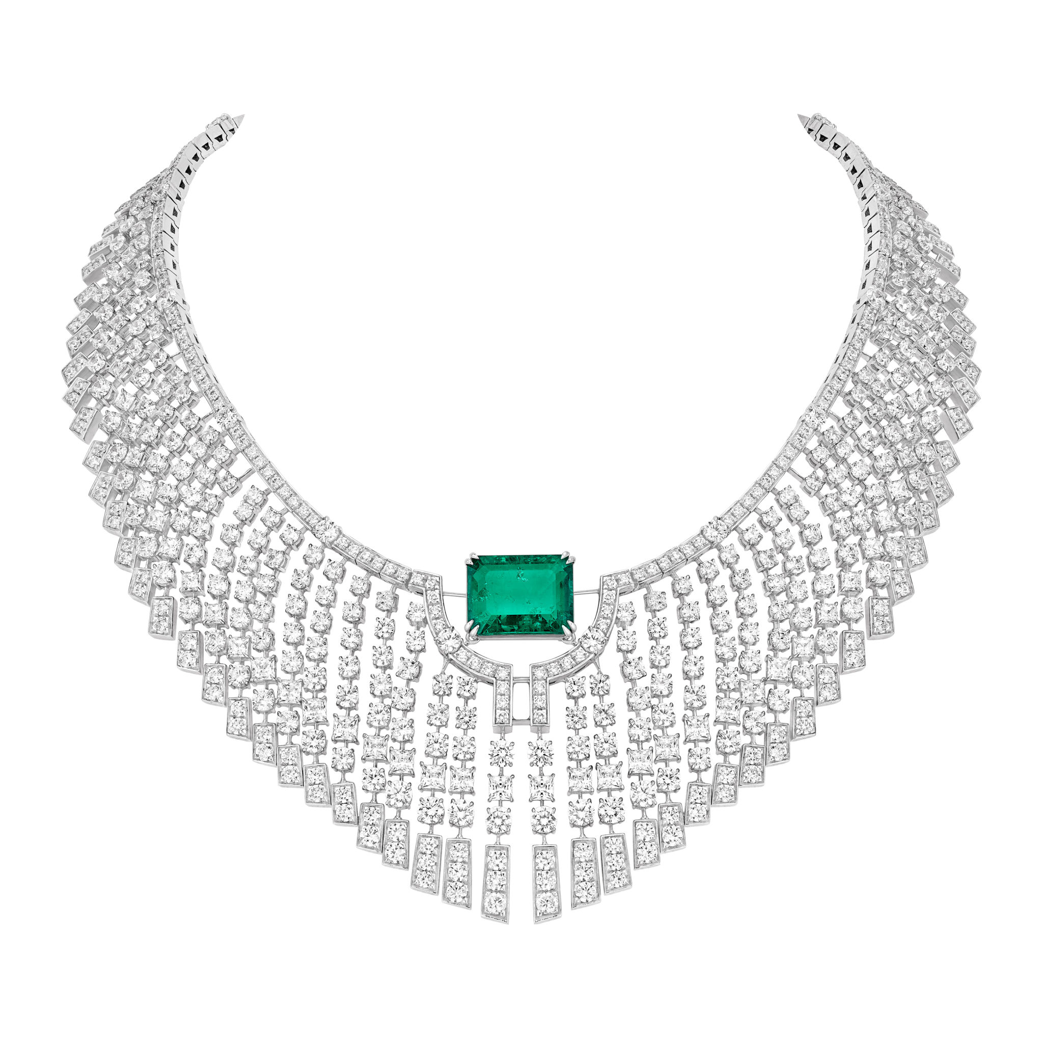 Pour orner cette parure, des émeraudes de synthèse d’une extrême qualité, dont la couleur rappelle le vert émeraude de Colombie, vert intense nuancé de quelques pointes de bleu. Depuis plusieurs décennies déjà, la force du joaillier réside dans le soin apporté à la sélection de ses created stones à l’état brut, réussissant l’exploit de reproduire en laboratoire ce qui rend une gemme unique, tant ses couleurs que son jardin. Depuis son arrivée à la direction artistique, Alexandra Zarcate n’a eu de cesse de faire écho à l’ADN de la Maison, tant en termes d’inspirations que de par son Histoire. Alexandra Zarcate a dès lors imaginé cette parure telle une représentation abstraite et conceptuelle des jardins du Château de la Croix des Gardes, magnifique propriété ayant jadis appartenu au fondateur de la Maison Burma.