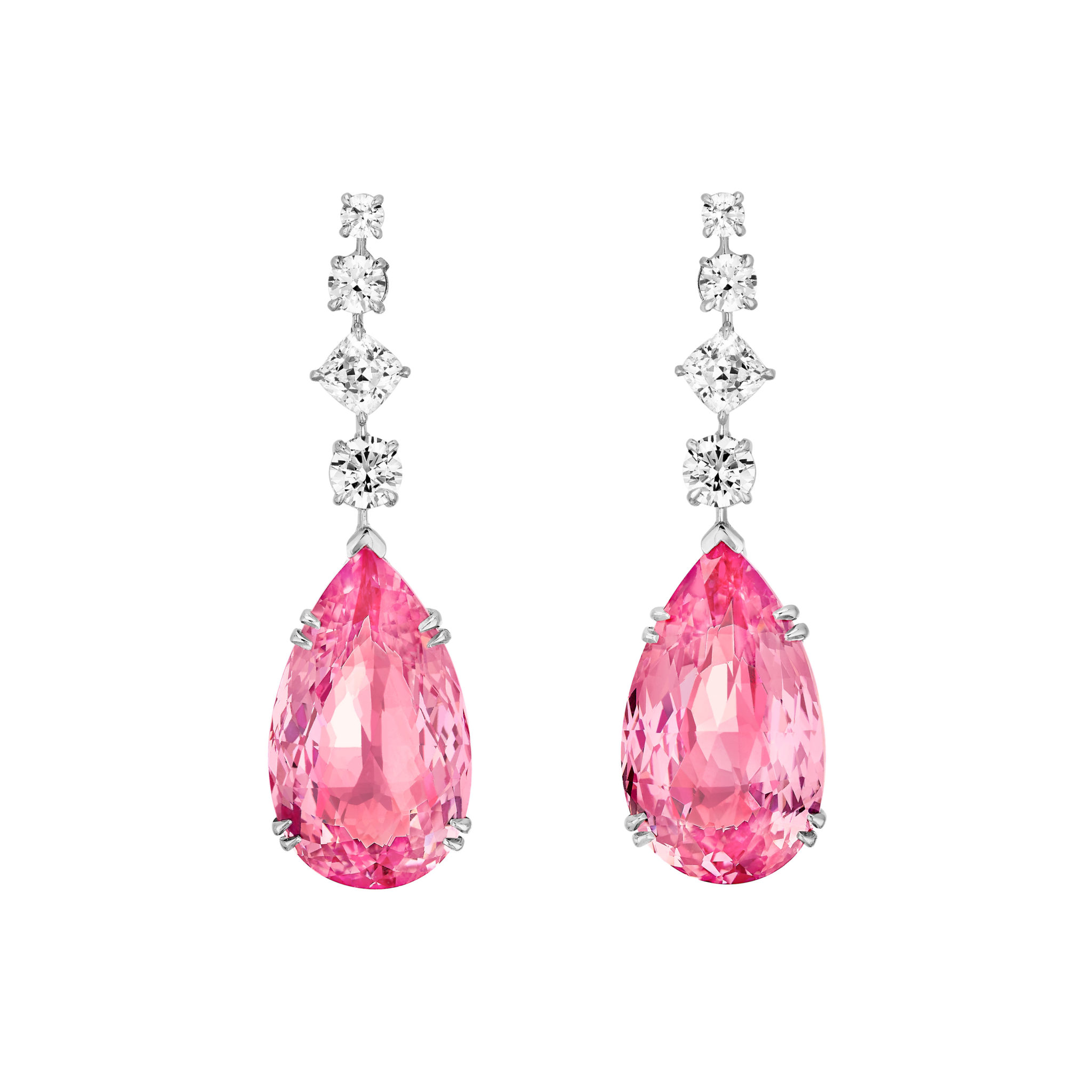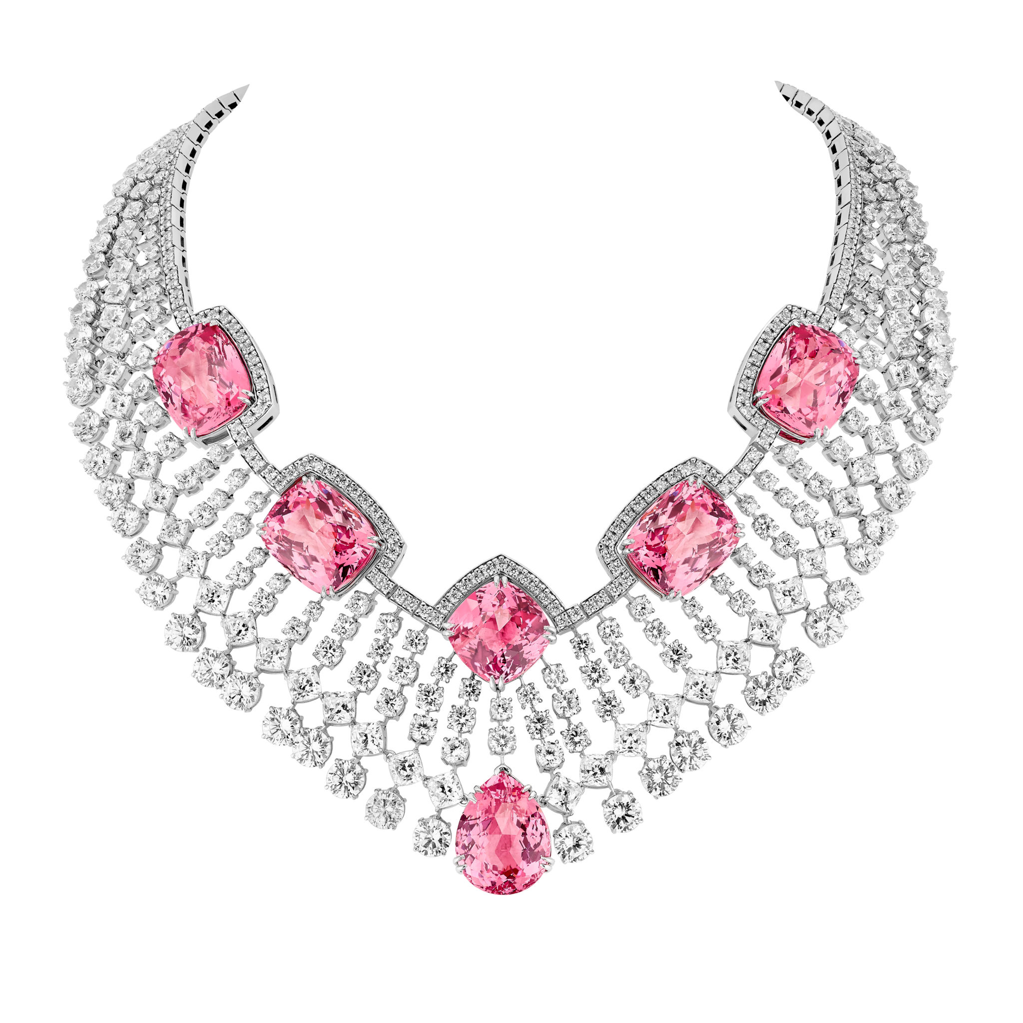 Le collier se compose de six saphirs roses de synthèse d’une équivalence de près de 220 carats, ornés de 431 gemmes Burmalite™ blanche taille brillant et coussin. Les boucles d’oreilles quant à elles, sont serties de deux saphirs roses de synthèse taille poire d’une équivalence de 49,85 carats et Burmalite ™ blanche taille coussin et brillant. Quatre tailles coussin antique d’un appairage parfait, une taille coussin, trois tailles poire, des gemmes dont la couleur intense et l’éclat font de cette parure des pièces uniques réalisées dans la plus pure tradition joaillère ayant nécessité plus de 165 heures de travail en atelier.