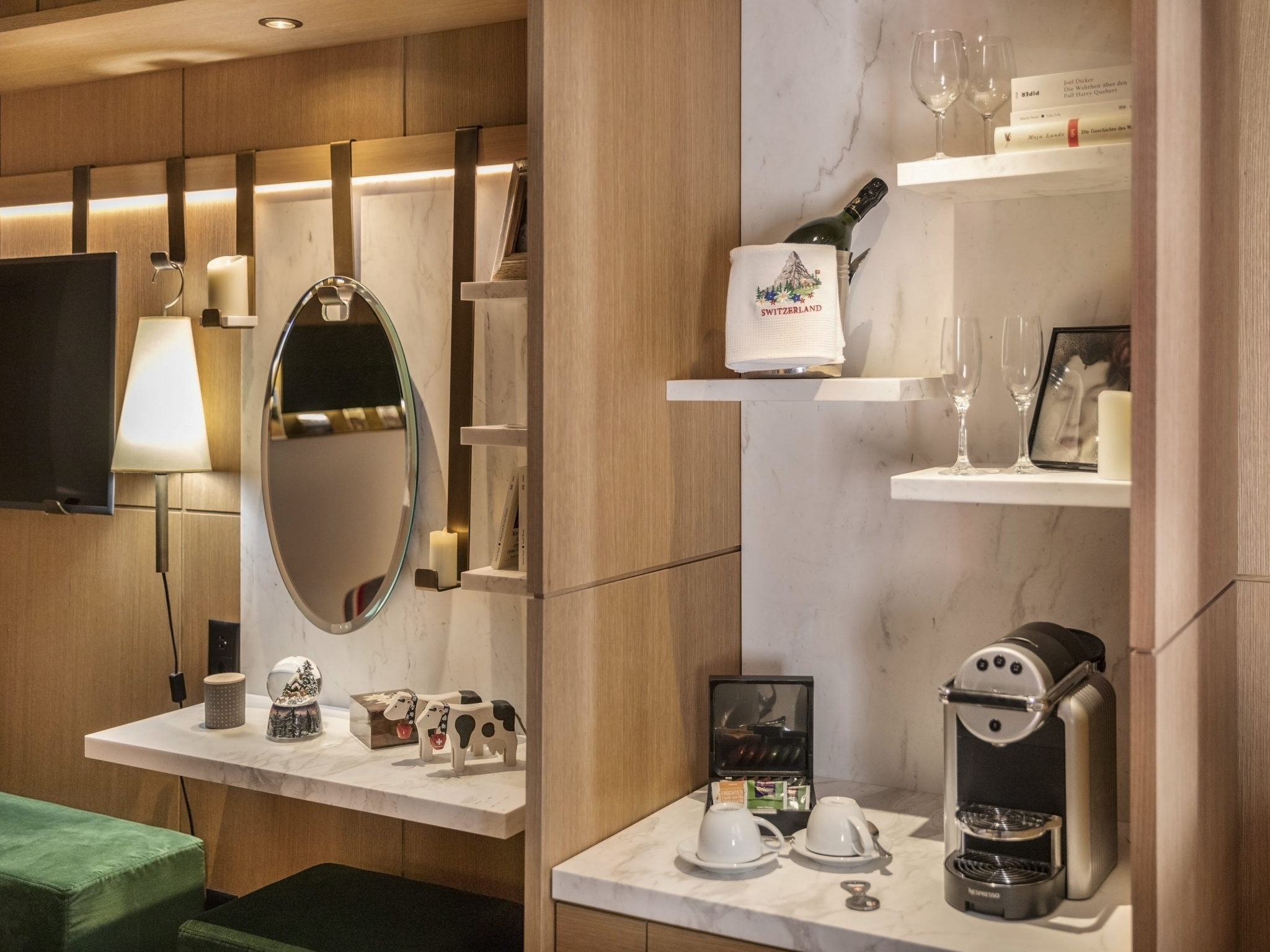 95 chambres et suites entièrement repensées par le cabinet de design & d’architecture Kristian Gavoille & Valérie Garcia, spécialiste des nouveaux nomadismes. Le style est délibérément alpin, chaleureux, audacieux : les codes « montagne » – feu + tapis moelleux + rouge + bois – sont bel et bien là, twistés pour atteindre l’harmonie entre air du temps et tradition. Au Schweizerhof Zermatt, le luxe assume la simplicité et le cool s’associe au raffinement. Les espaces sont ouverts pour favoriser le partage, partout, tout le temps. Les échanges et la fluidité. Mini-salons informels pour se retrouver à tout moment, vaste « show kitchen » avec vue sur le chef et sa brigade au travail autour d’une carte exclusive, livres reliés de cuir dans tous les espaces de l’hôtel, spa et piscine intérieure, etc.