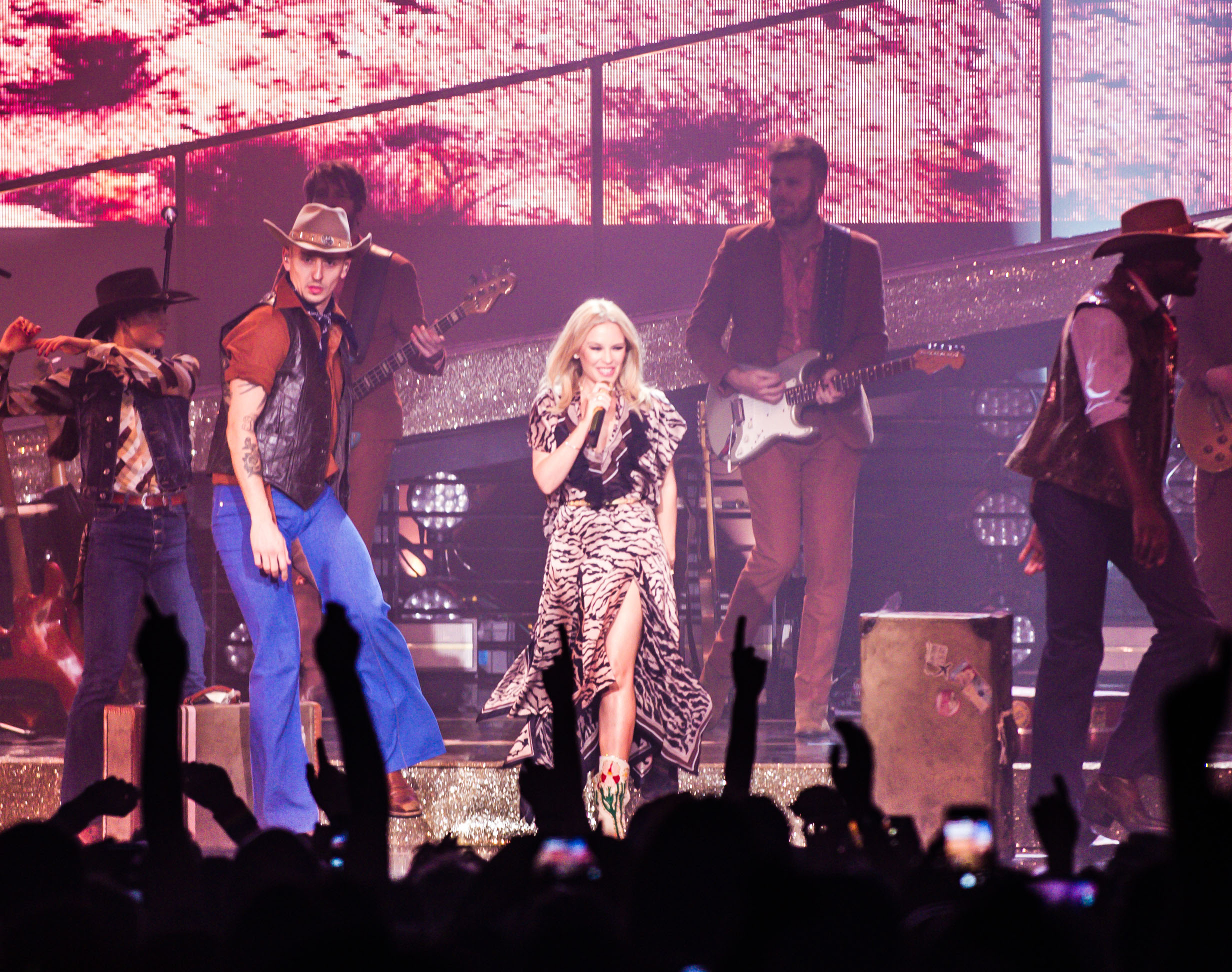 Kylie Minogue wears a sleeveless camel tiger printed dress with handkerchief skirt details from the Roberto Cavalli Fall/Winter 2018-19 collection, while opening her only concert in Italy from her worldwide “Golden Tour”.