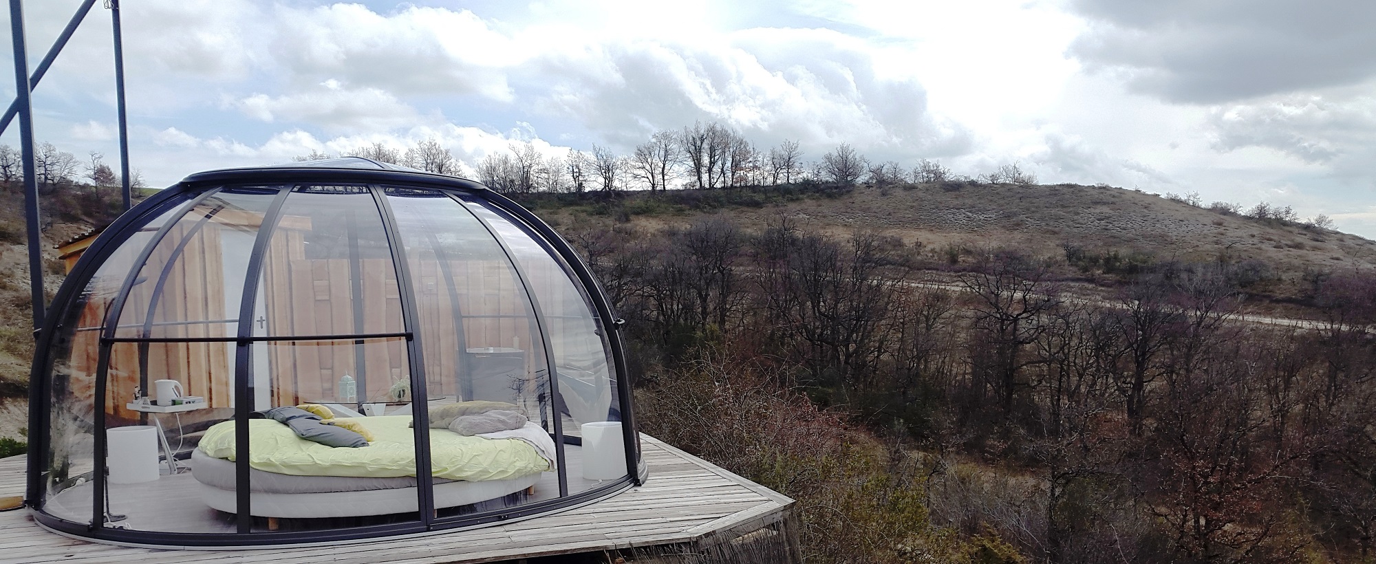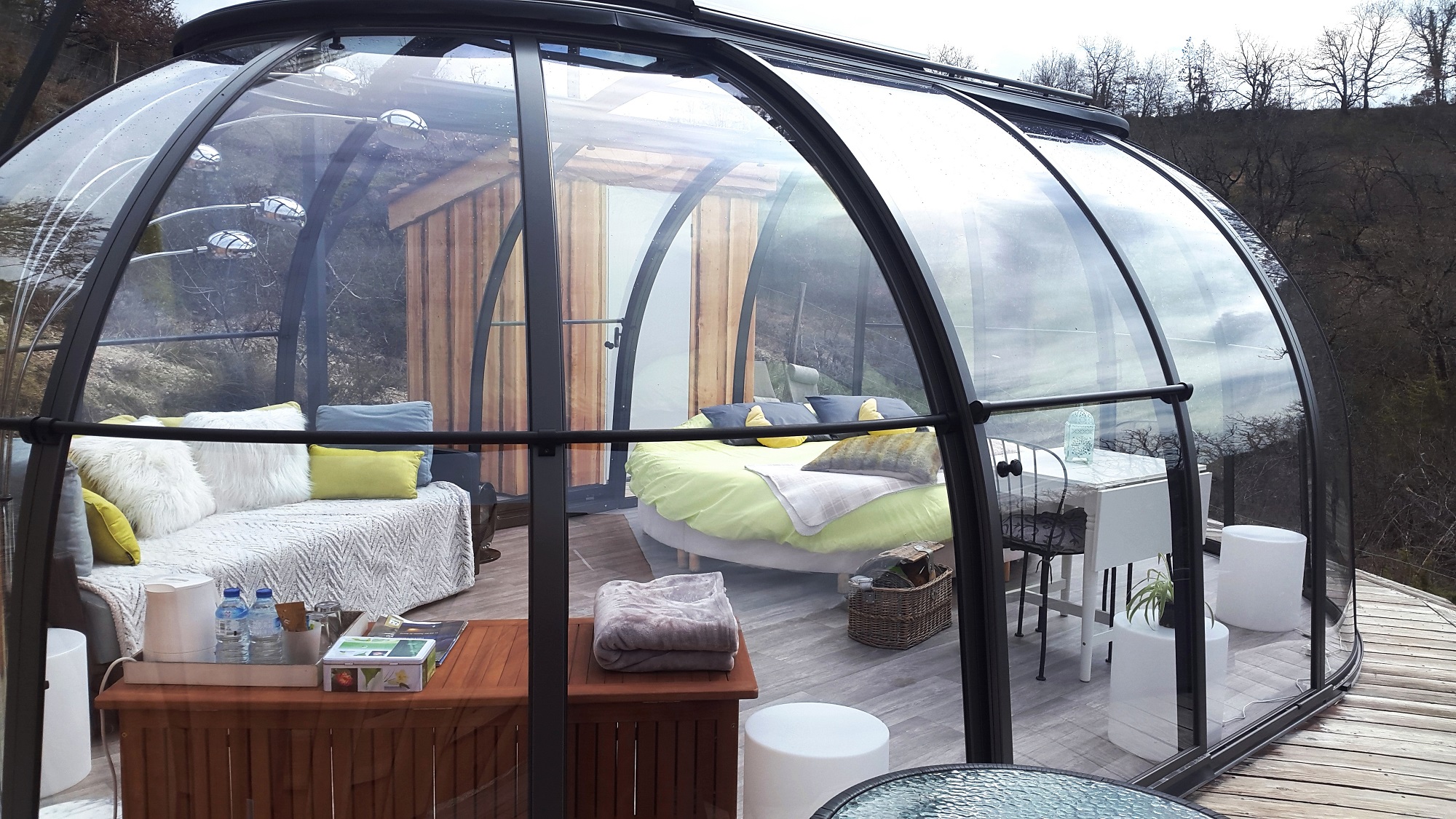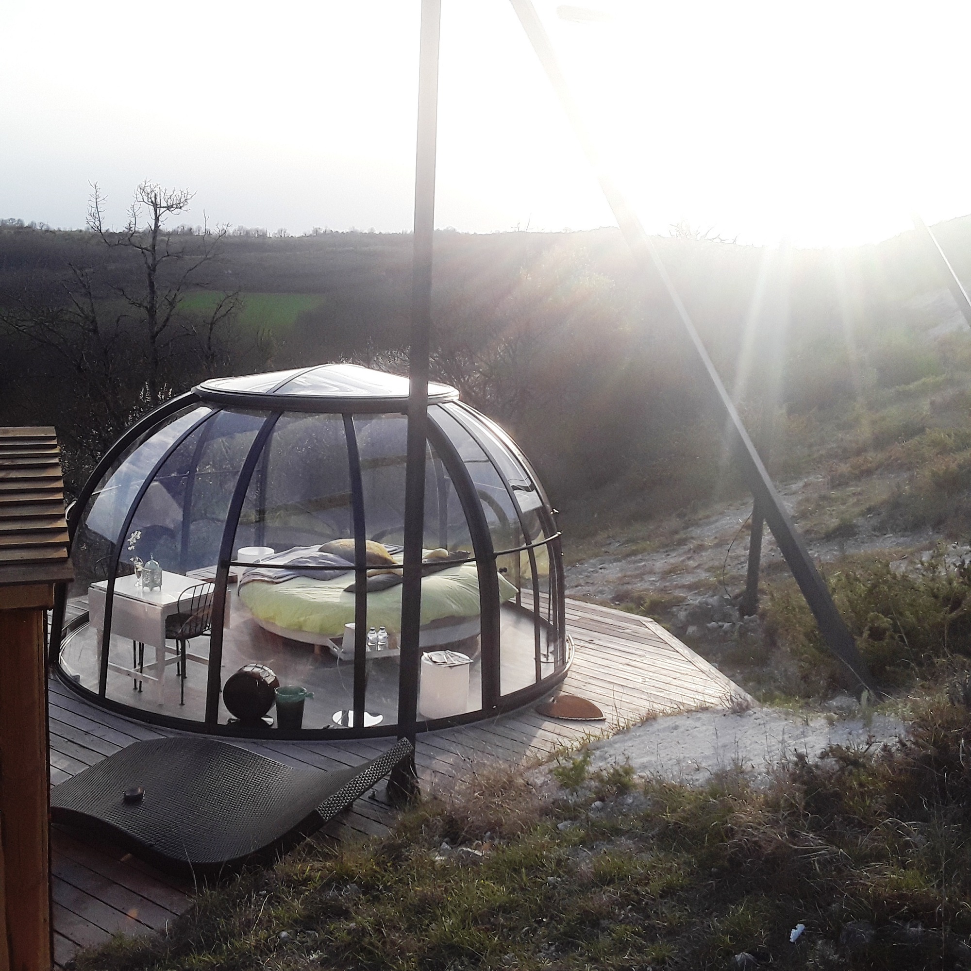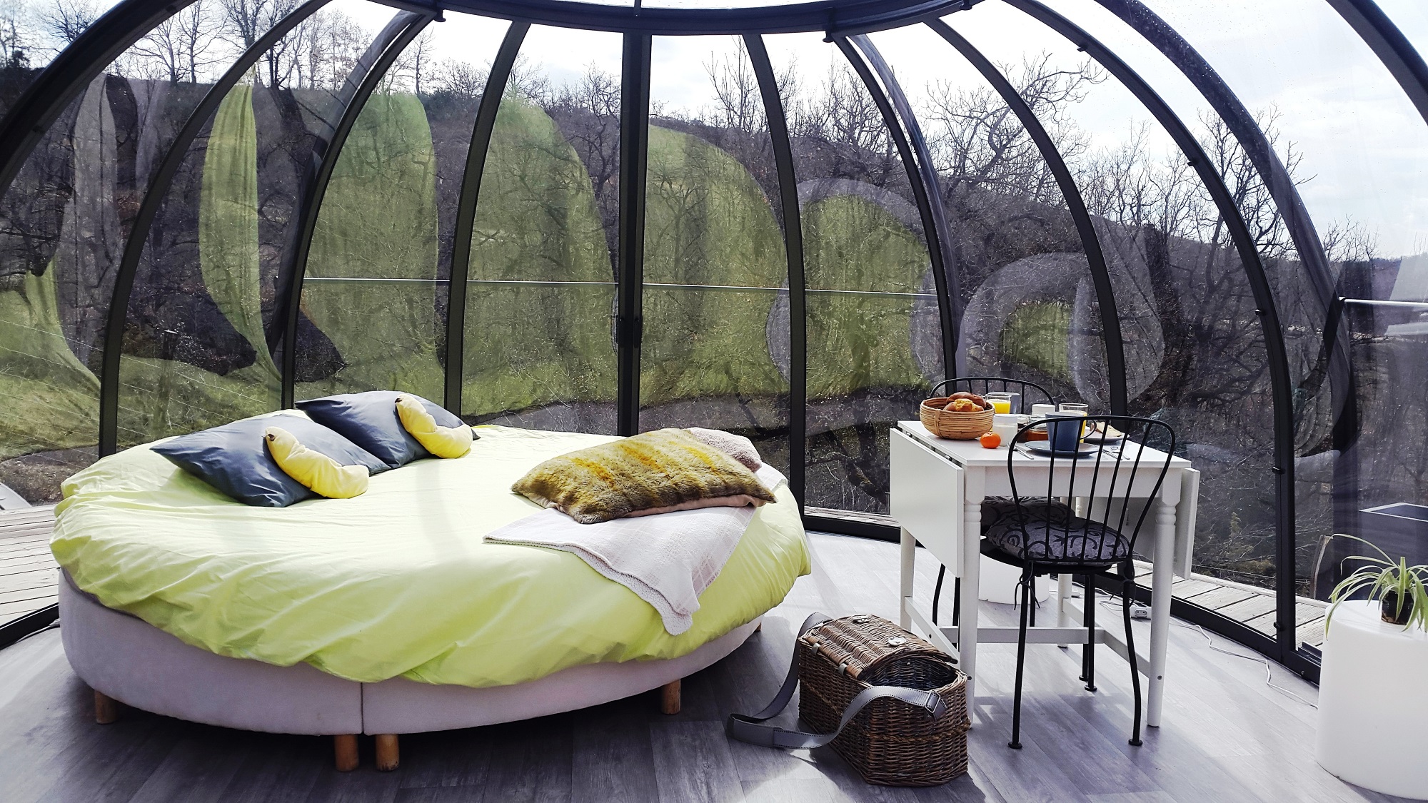 Le dôme Prestige, de forme ovale, est équipé d’un lit rond de 215 cm de diamètre, d’un coin salon et d’une salle de bain privative à l’extérieur du logement. Pour parfaire le séjour, les voyageurs ont un accès illimité au jacuzzi du domaine. Des paniers apéritifs et repas sont proposés à partir de 45 € pour 2 personnes ainsi que des massages à partir de 35 €.