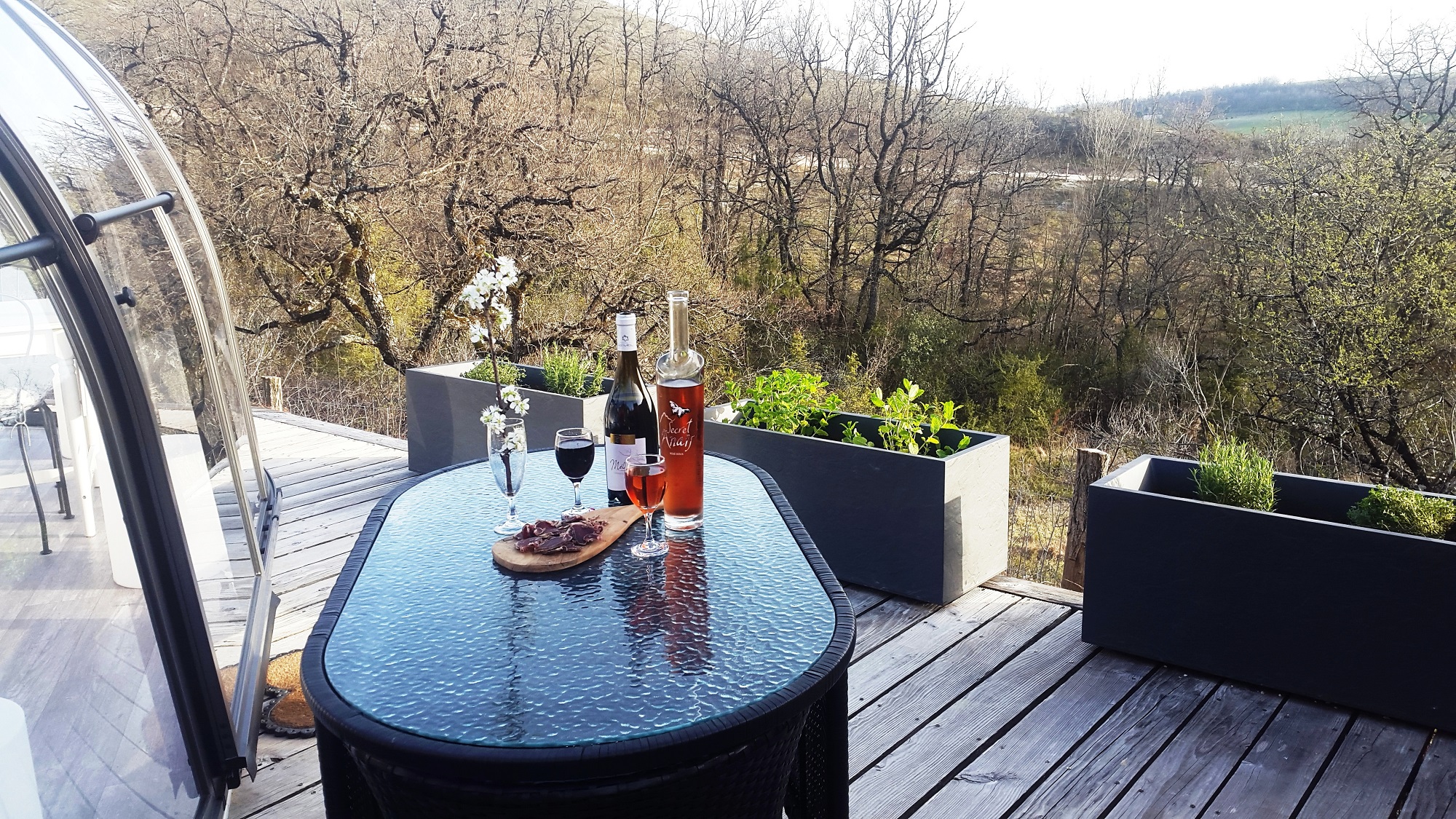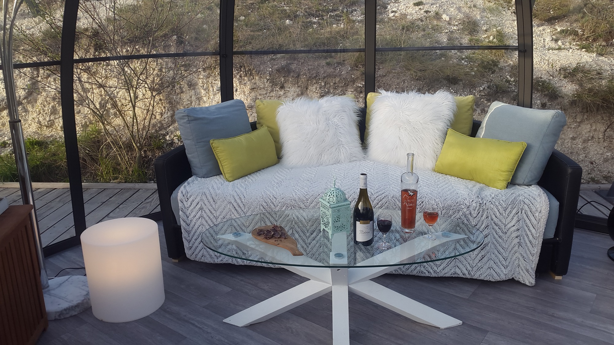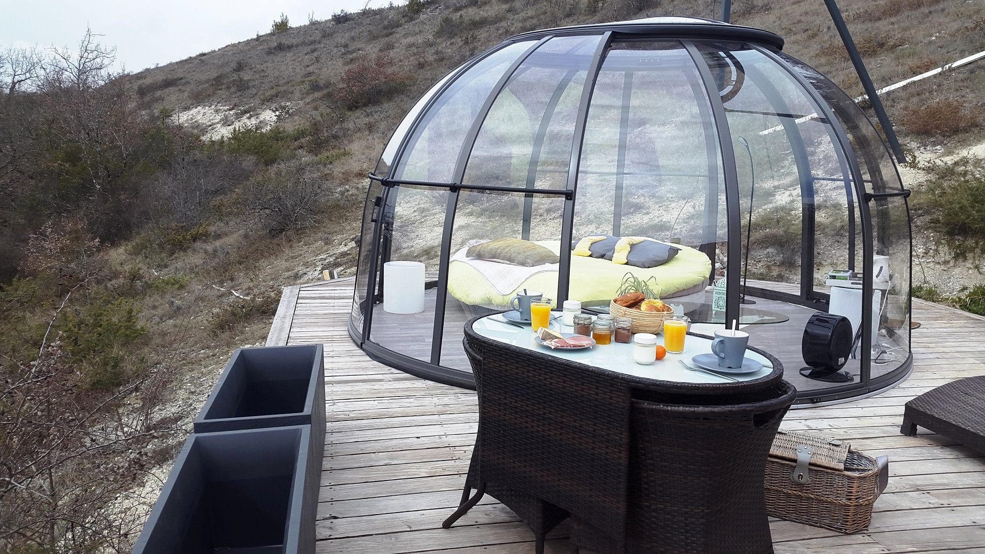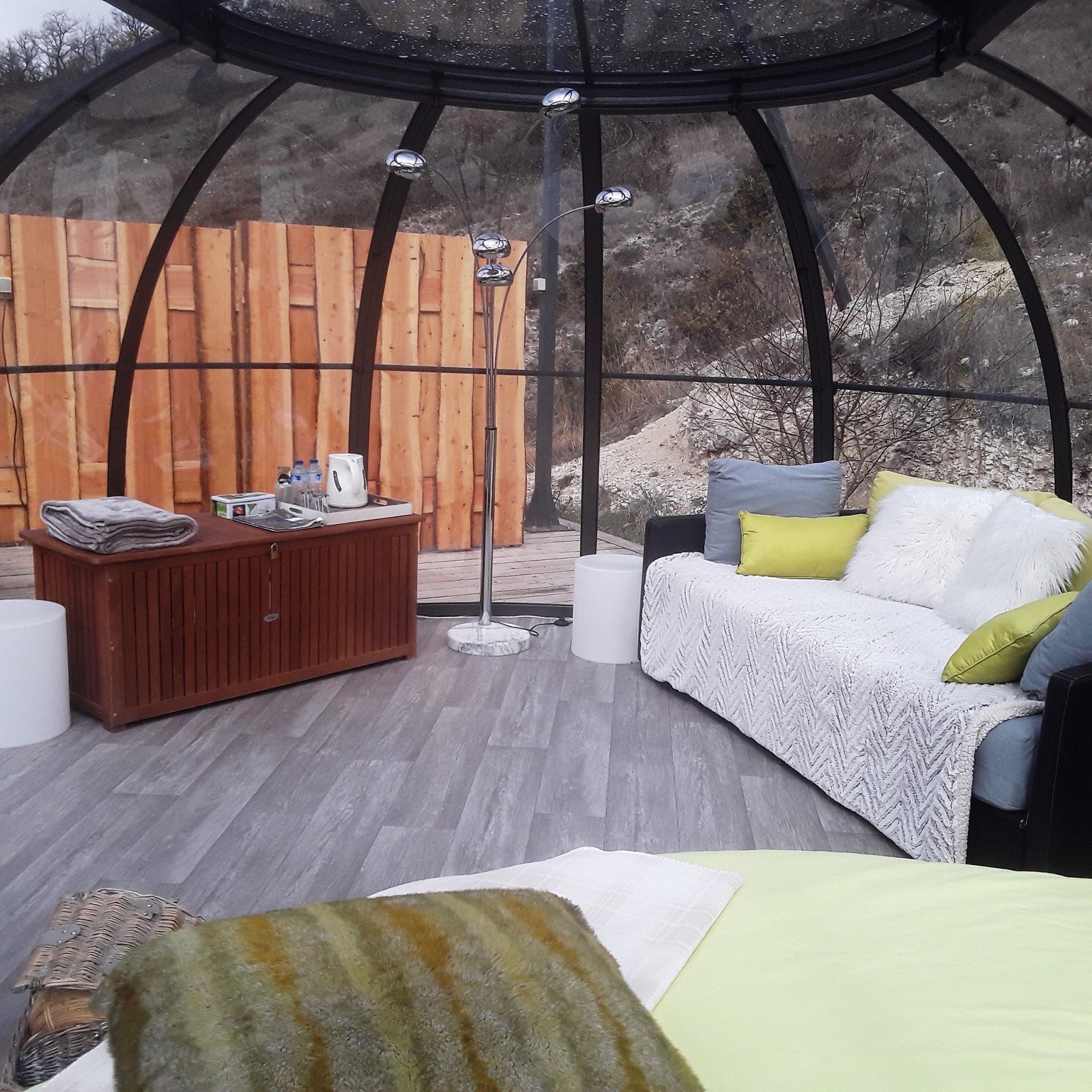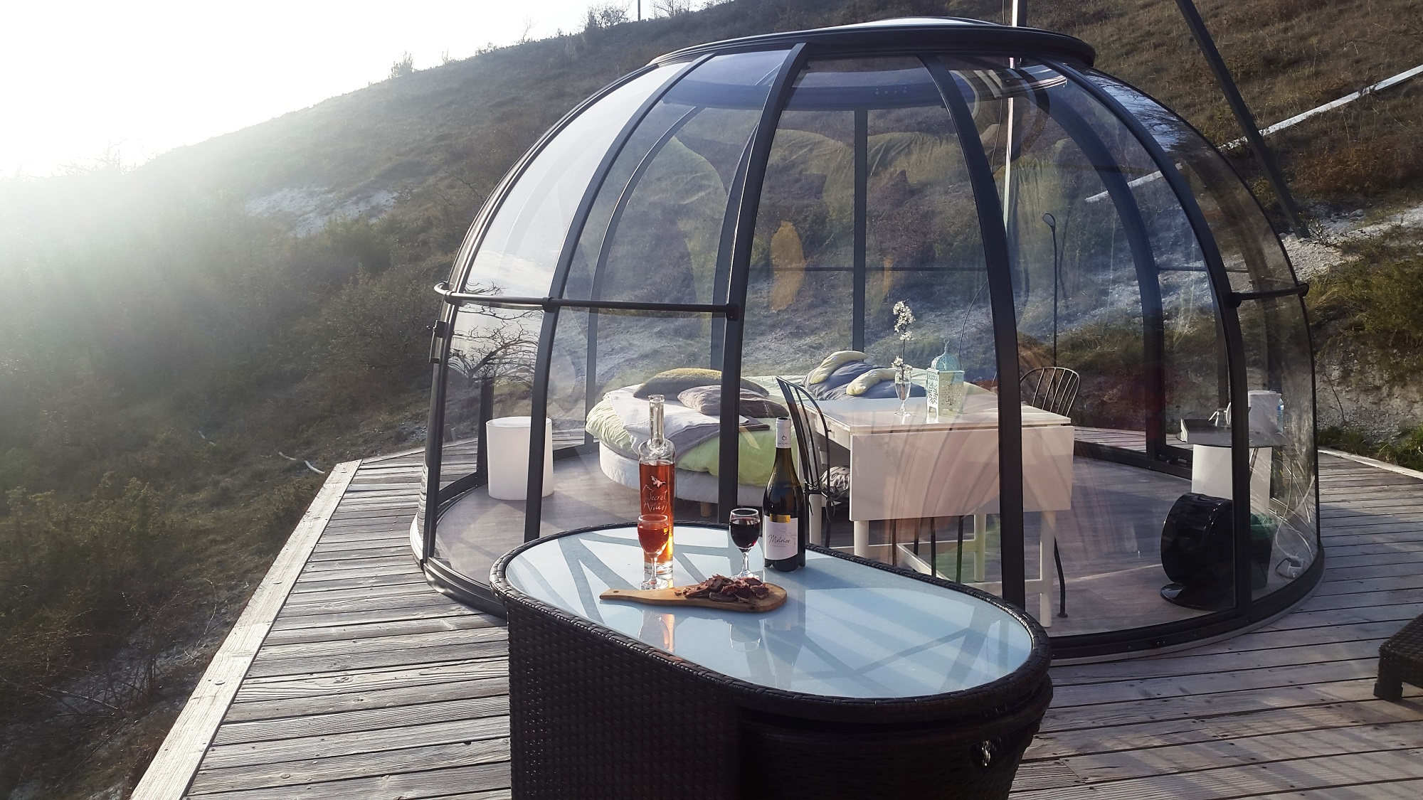 Le dôme Prestige, de forme ovale, est équipé d’un lit rond de 215 cm de diamètre, d’un coin salon et d’une salle de bain privative à l’extérieur du logement. Pour parfaire le séjour, les voyageurs ont un accès illimité au jacuzzi du domaine. Des paniers apéritifs et repas sont proposés à partir de 45 € pour 2 personnes ainsi que des massages à partir de 35 €.