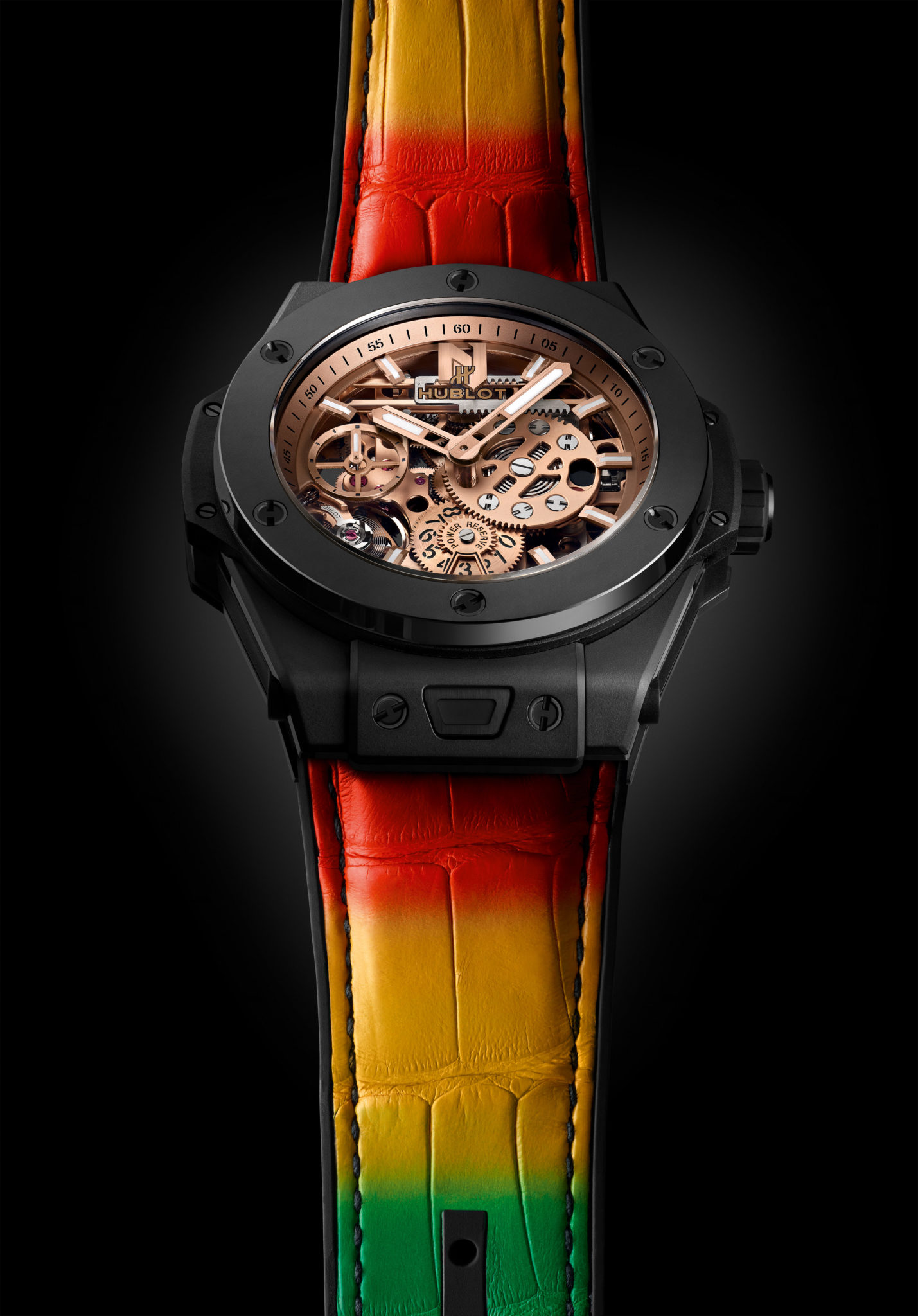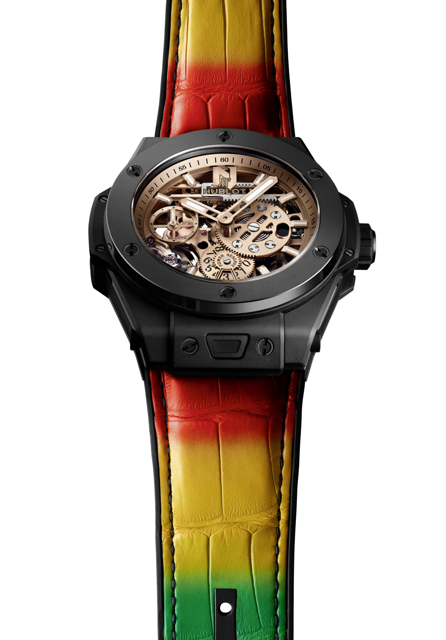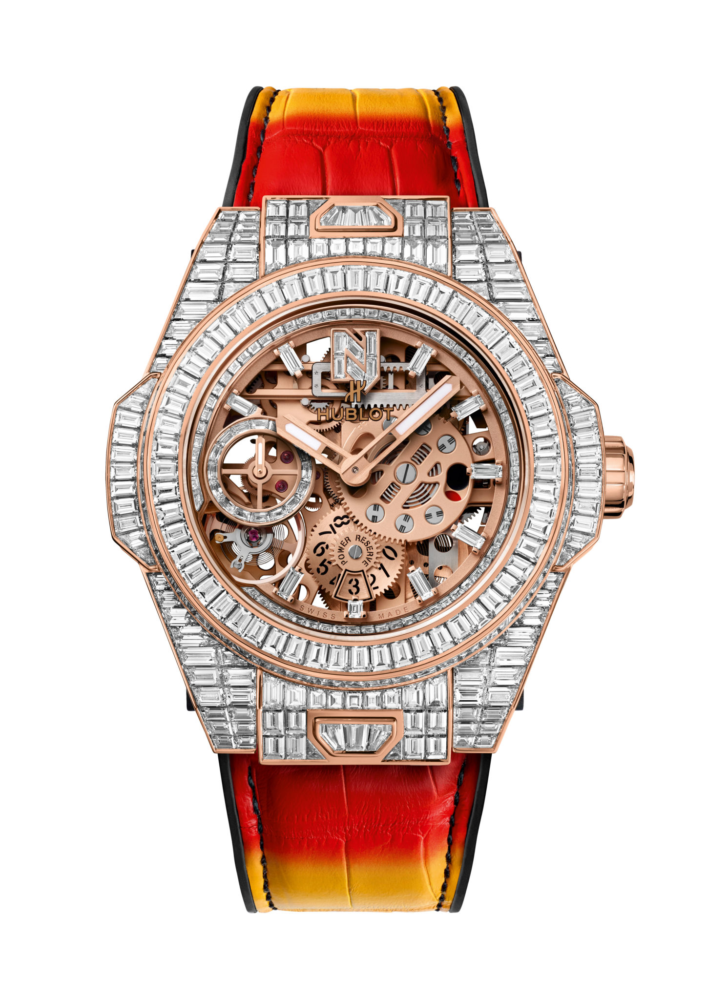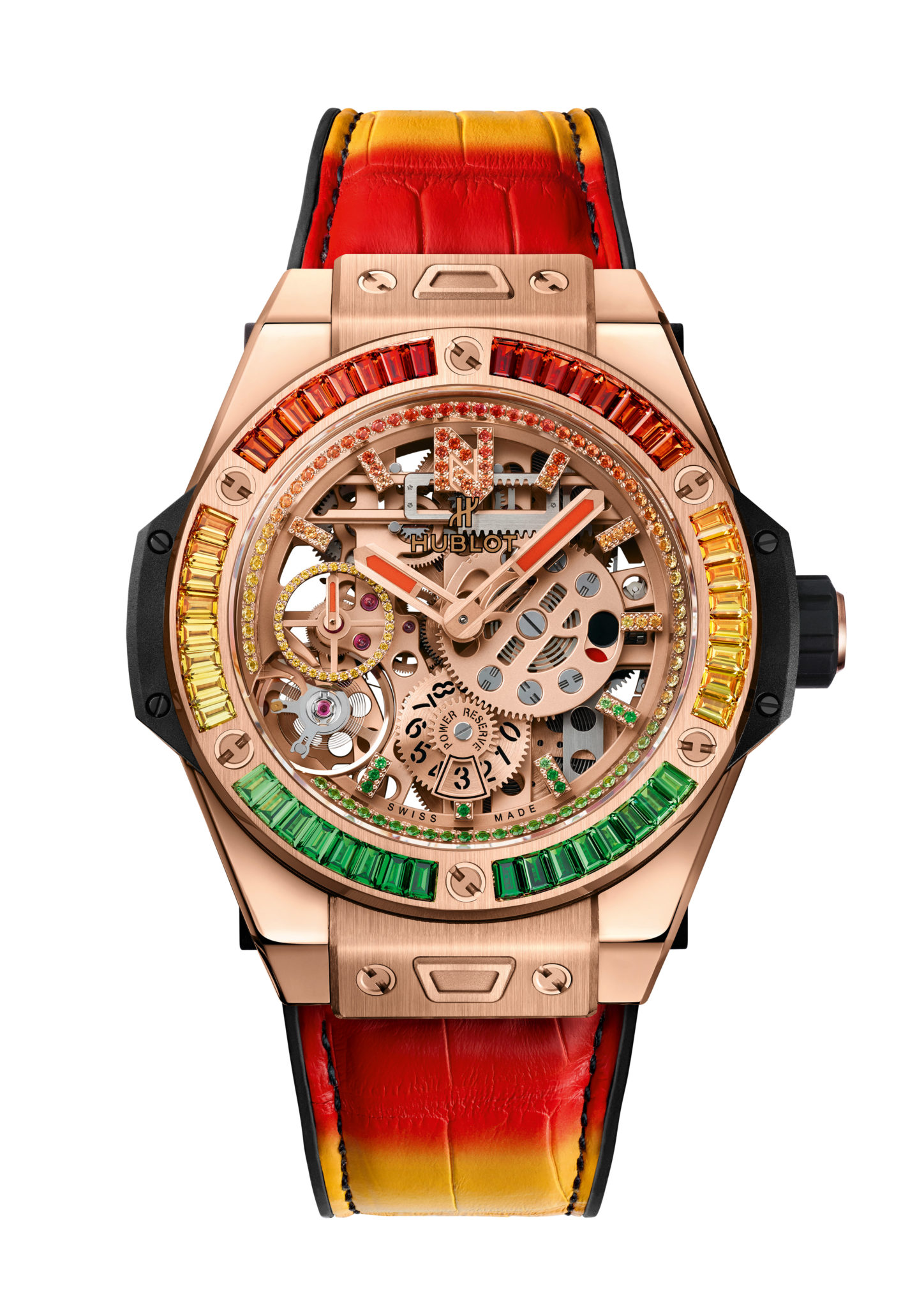 Ces dernières sont proposées en trois versions différentes ayant pour base la fameuse Big Bang, icône de la marque suisse. D’un diamètre de 45mm, elles sont mues par le calibre manufacture HUB1201, dont la construction innovante révèle côté cadran toute l’imbrication originale de sa réserve de marche de 10 jours et ayant donné à ce modèle son nom: Meca-10! Comme le chante Nicky Jam dans l’un de ses tubes: «…sin parar, sin parar! » Pour la première fois, il est ici squeletté et plaqué or, offrant ainsi un tout nouveau look à la pièce. L’art de la fusion dans toute sa splendeur!