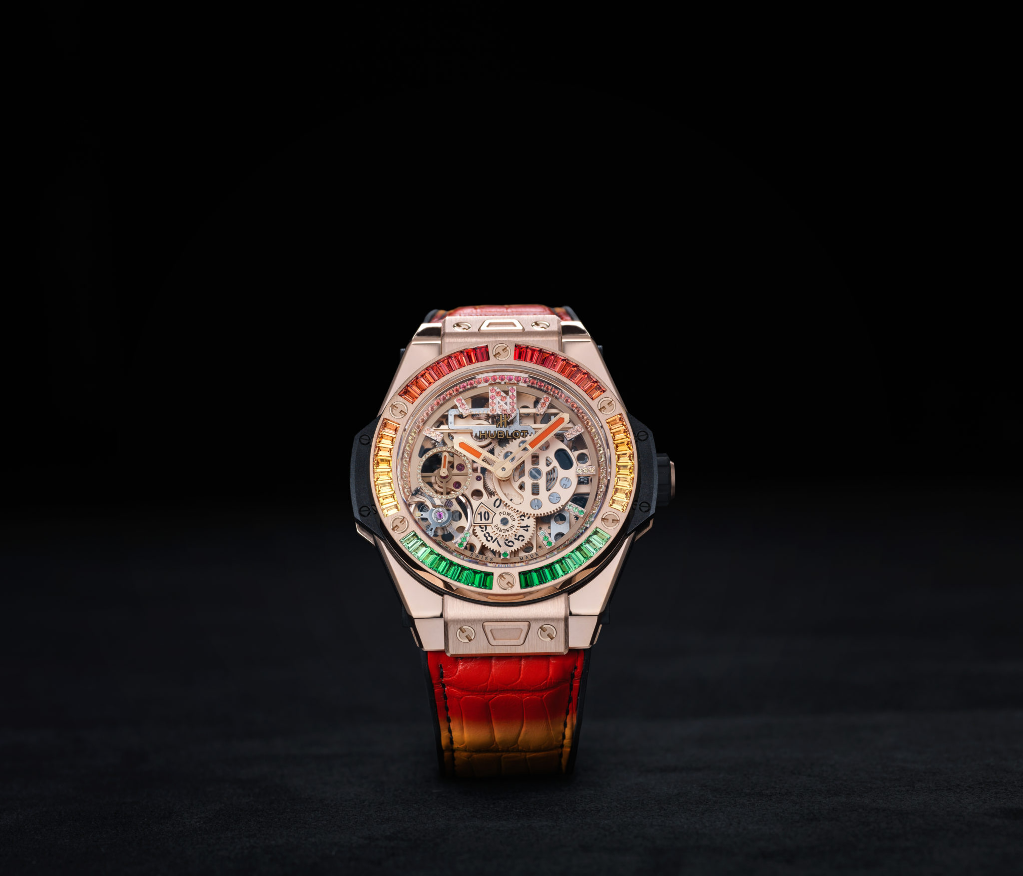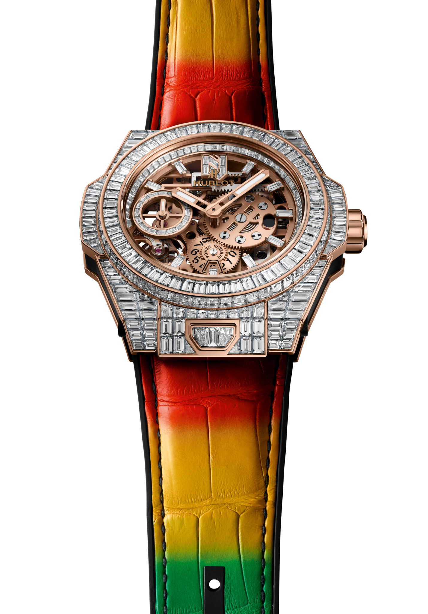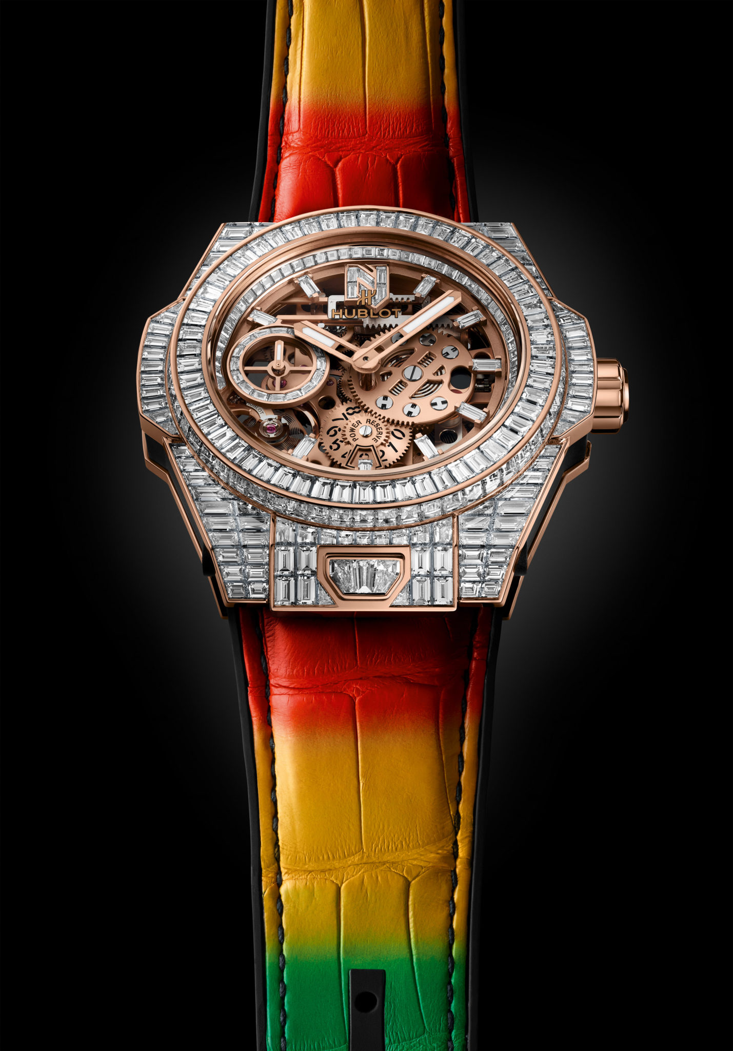 La seconde se pare d’une chaude couleur chère au coeur de Nicky Jam : l’or ! Boîte, lunette et couronne sont usinées en King Gold, un alliage d’or, cuivre et platine mis au point par Hublot. Elle est sertie de pierres semi-précieuses (saphirs jaunes, oranges et tsavorites) reprenant les trois couleurs de base du vidéo-clip du titre « X (Equis) ».