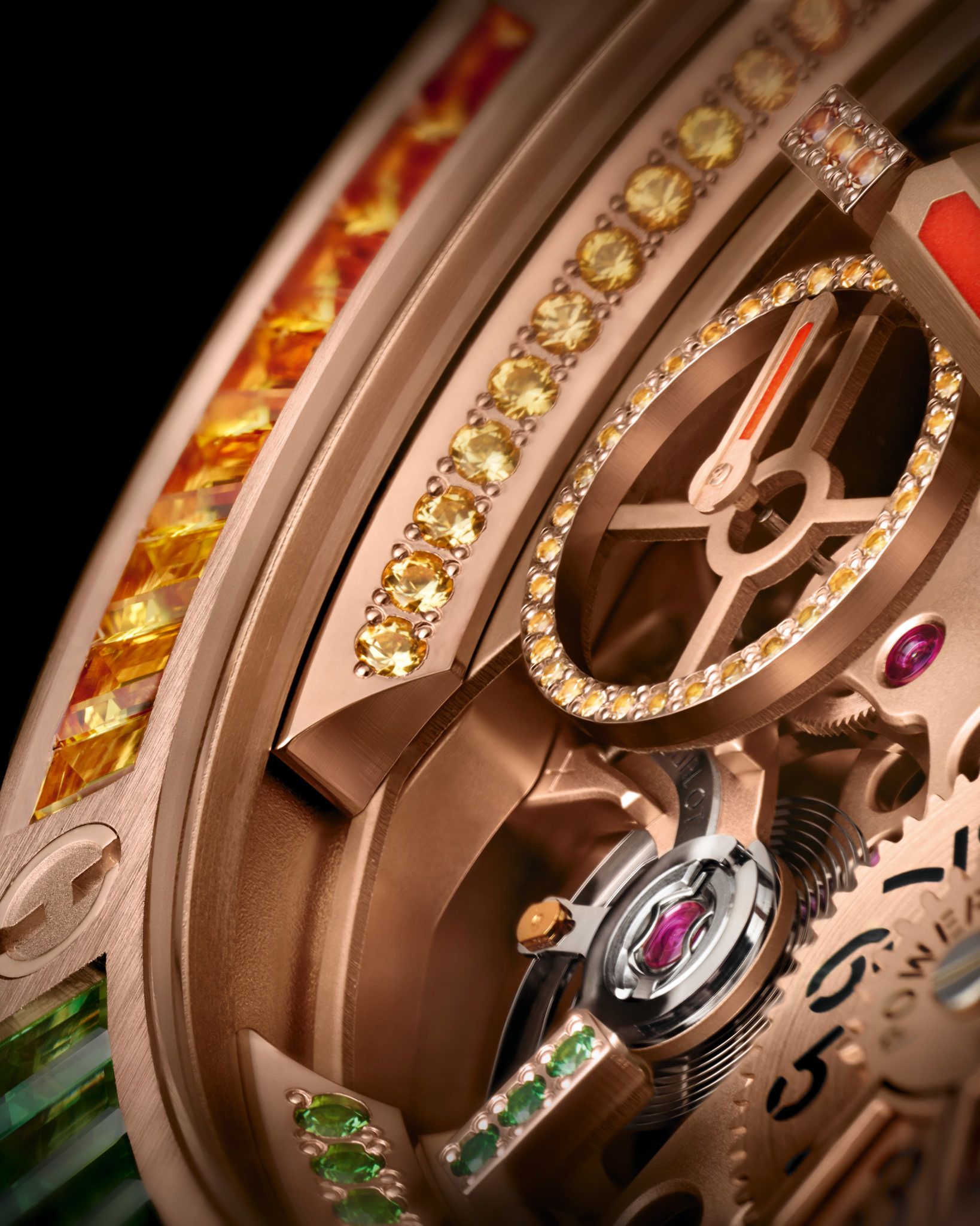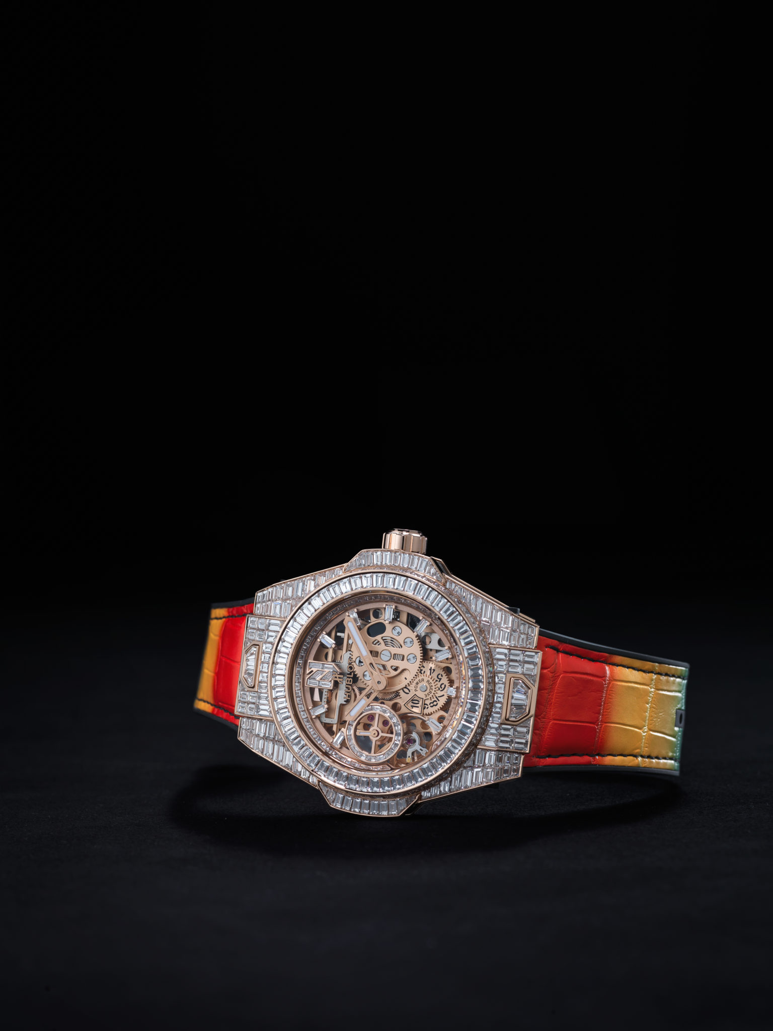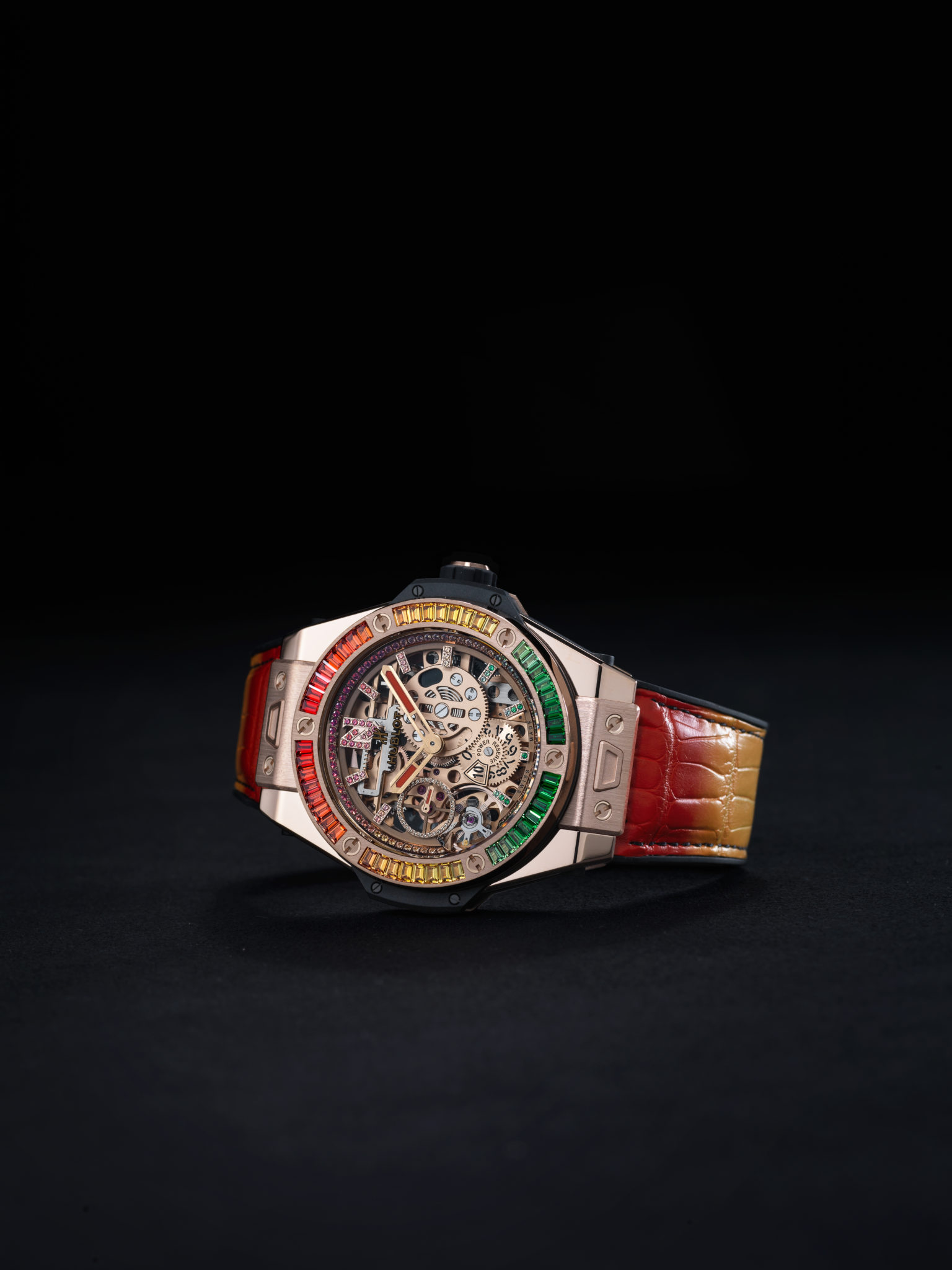 La seconde se pare d’une chaude couleur chère au coeur de Nicky Jam : l’or ! Boîte, lunette et couronne sont usinées en King Gold, un alliage d’or, cuivre et platine mis au point par Hublot. Elle est sertie de pierres semi-précieuses (saphirs jaunes, oranges et tsavorites) reprenant les trois couleurs de base du vidéo-clip du titre « X (Equis) ».