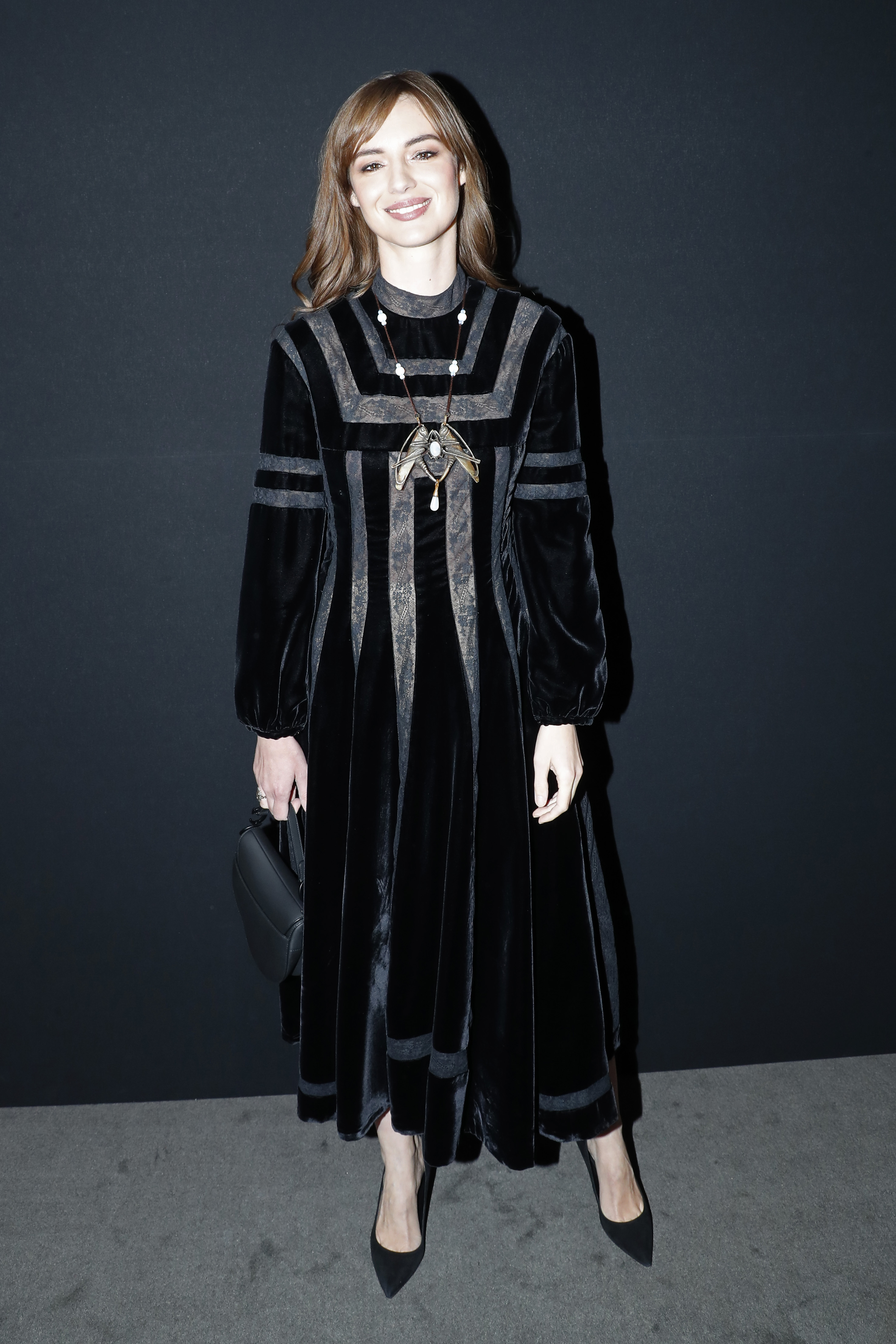 Louise Bourgoin portait une robe en velours noir Dior, collection Automne 2018, un mini sac Saddle en cuir noir Dior et des souliers Dior.