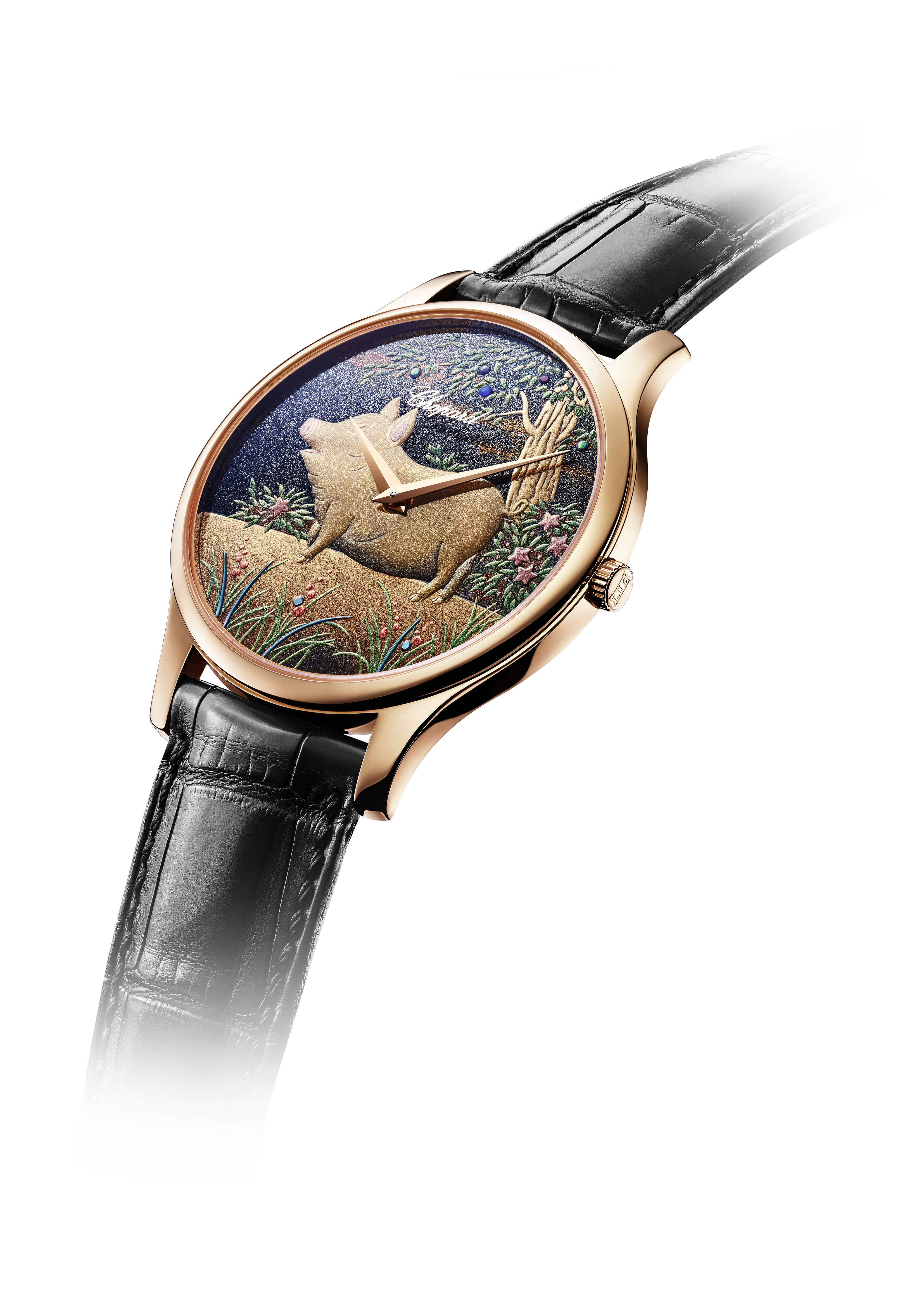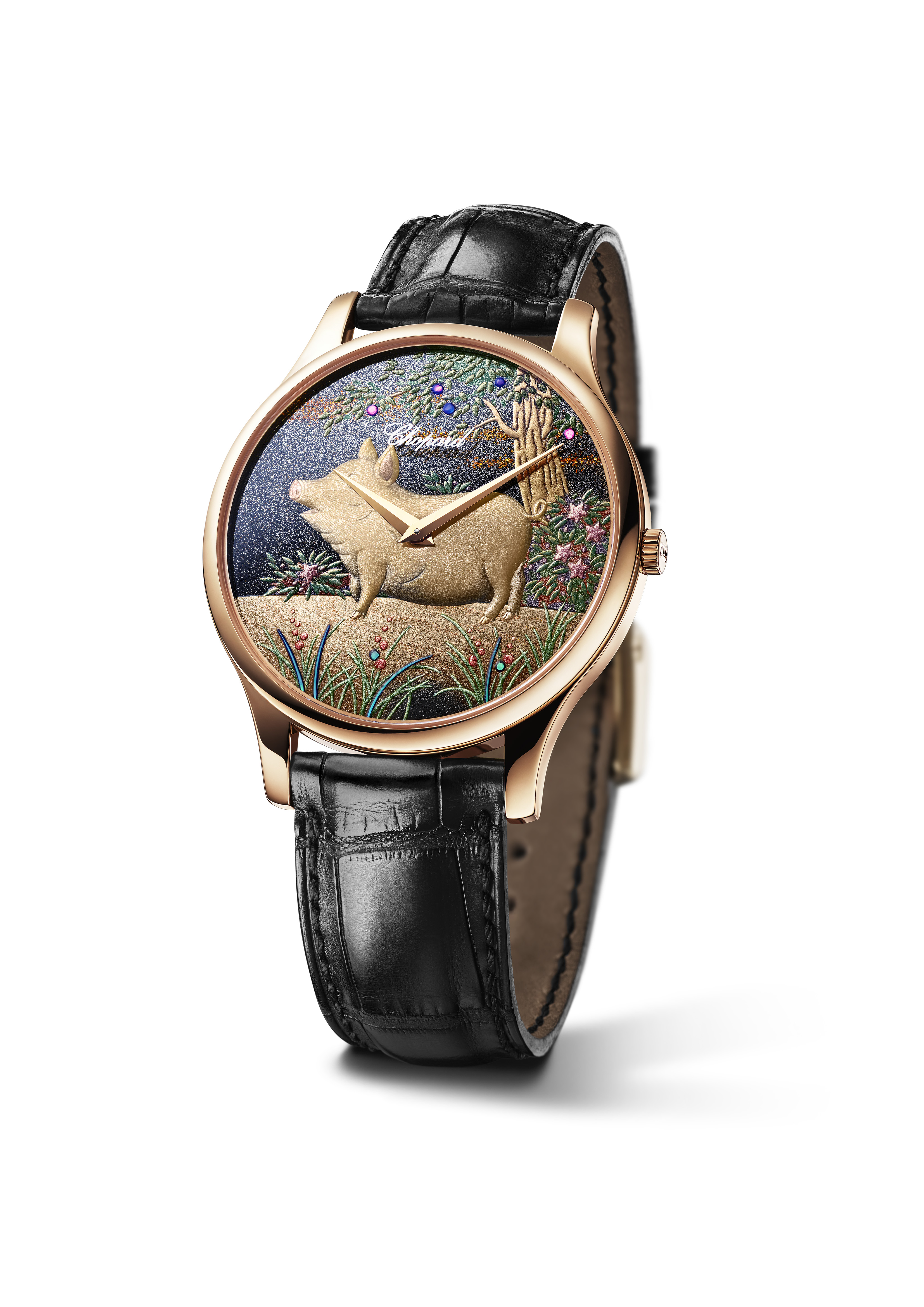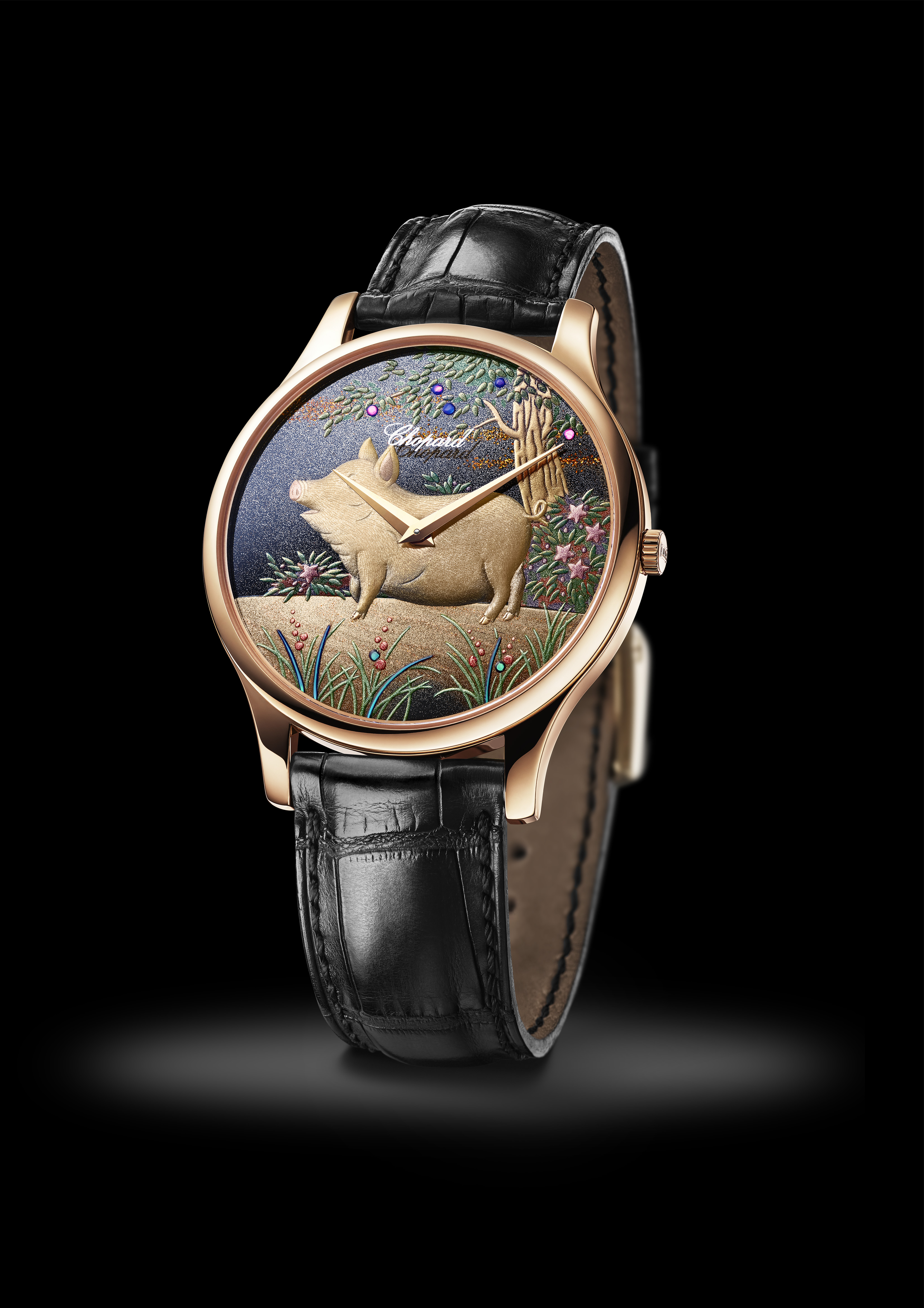 Chopard ajoute une pièce d’exception à sa précieuse collection de garde-temps L.U.C XP Urushi mettant tous les ans à l’honneur l’un des douze signes du zodiaque. L’art ancestral japonais de l’Urushi est ainsi convoqué pour réaliser une montre sur le thème de l’Année du Cochon du calendrier traditionnel chinois. Généreux, perspicace et frivole, l’animal prête son visage jovial à une création au raffinement exceptionnel, animée par un calibre L.U.C extrafin, le mouvement 96.17-L.