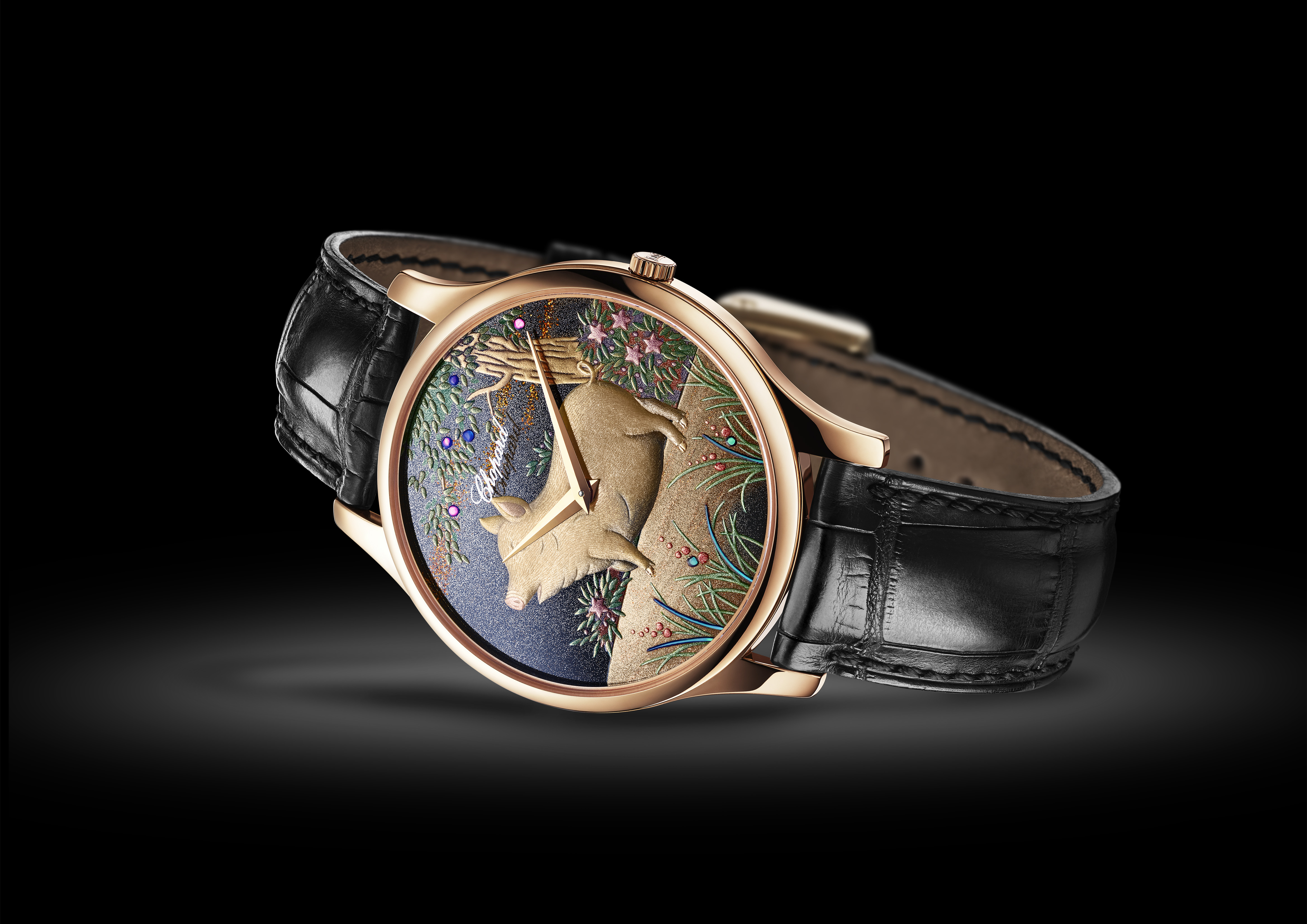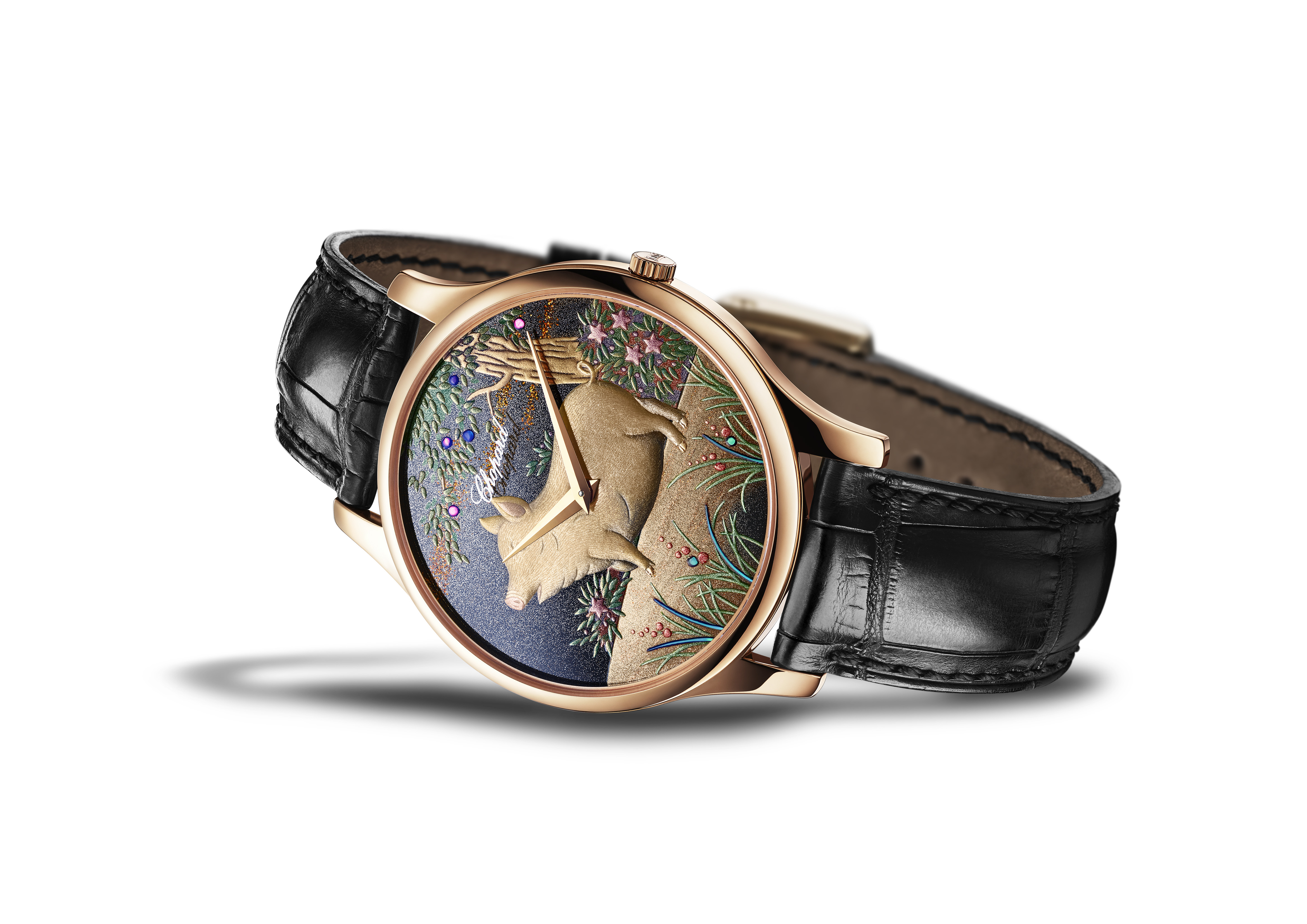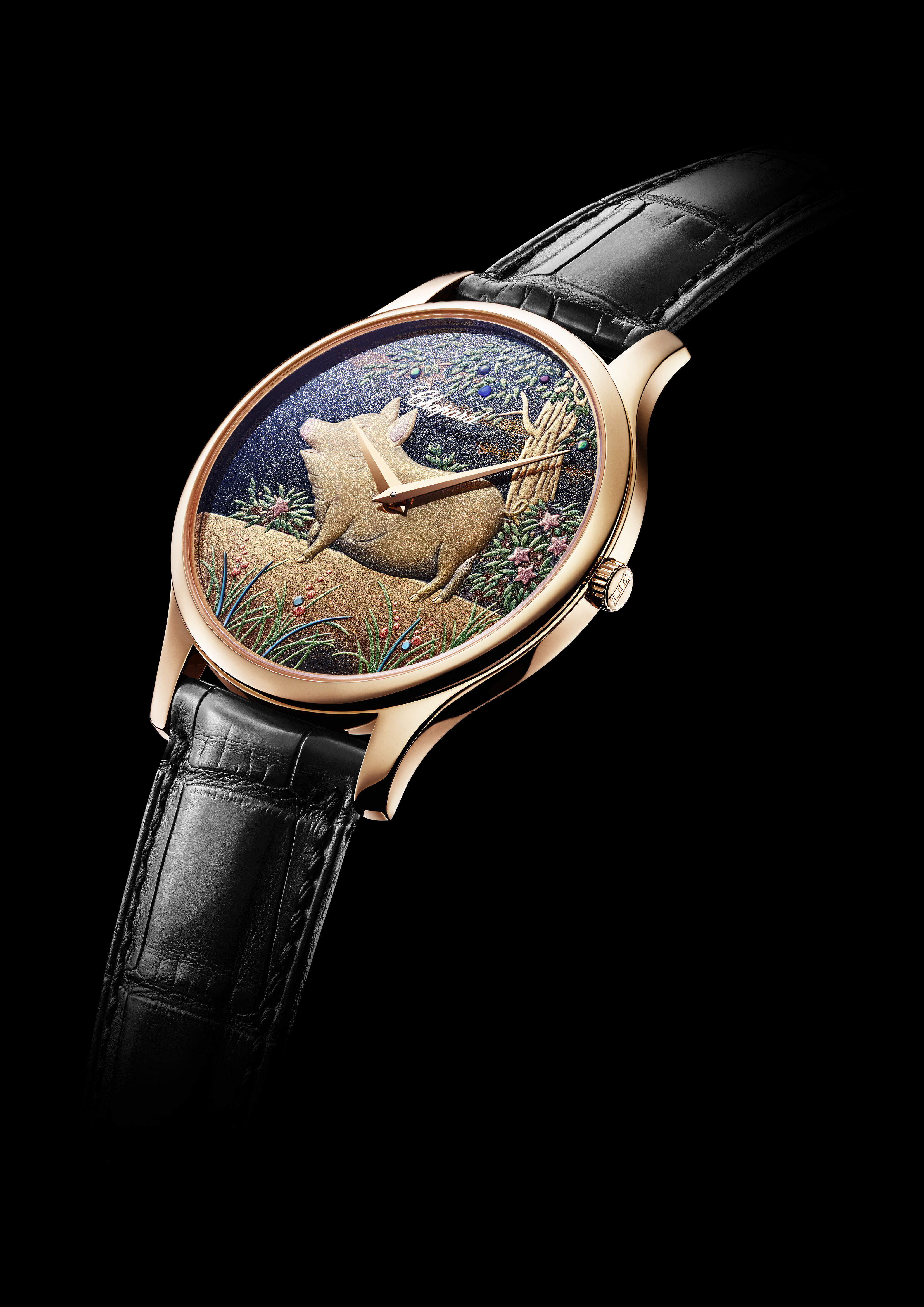 Chopard ajoute une pièce d’exception à sa précieuse collection de garde-temps L.U.C XP Urushi mettant tous les ans à l’honneur l’un des douze signes du zodiaque. L’art ancestral japonais de l’Urushi est ainsi convoqué pour réaliser une montre sur le thème de l’Année du Cochon du calendrier traditionnel chinois. Généreux, perspicace et frivole, l’animal prête son visage jovial à une création au raffinement exceptionnel, animée par un calibre L.U.C extrafin, le mouvement 96.17-L.