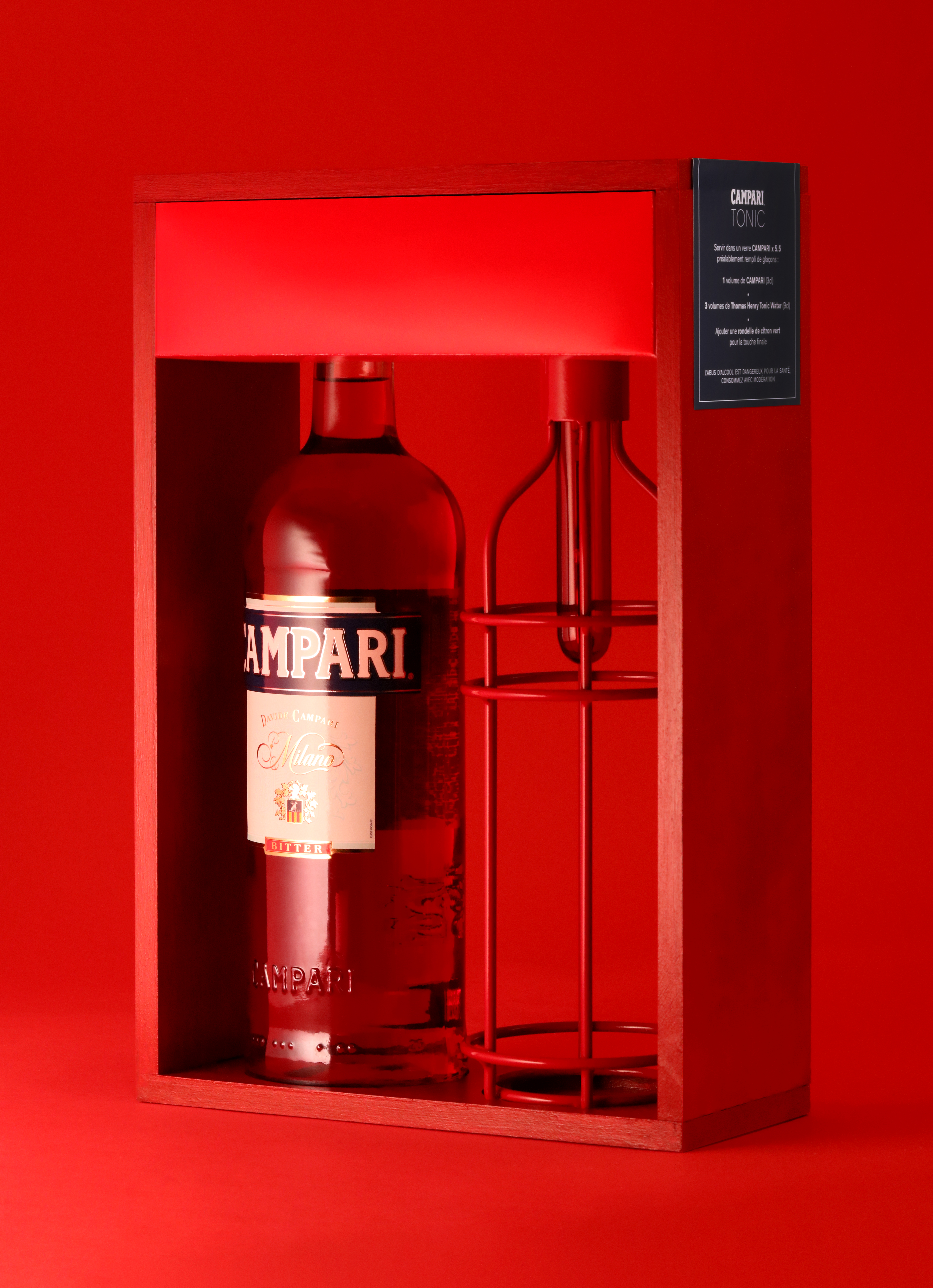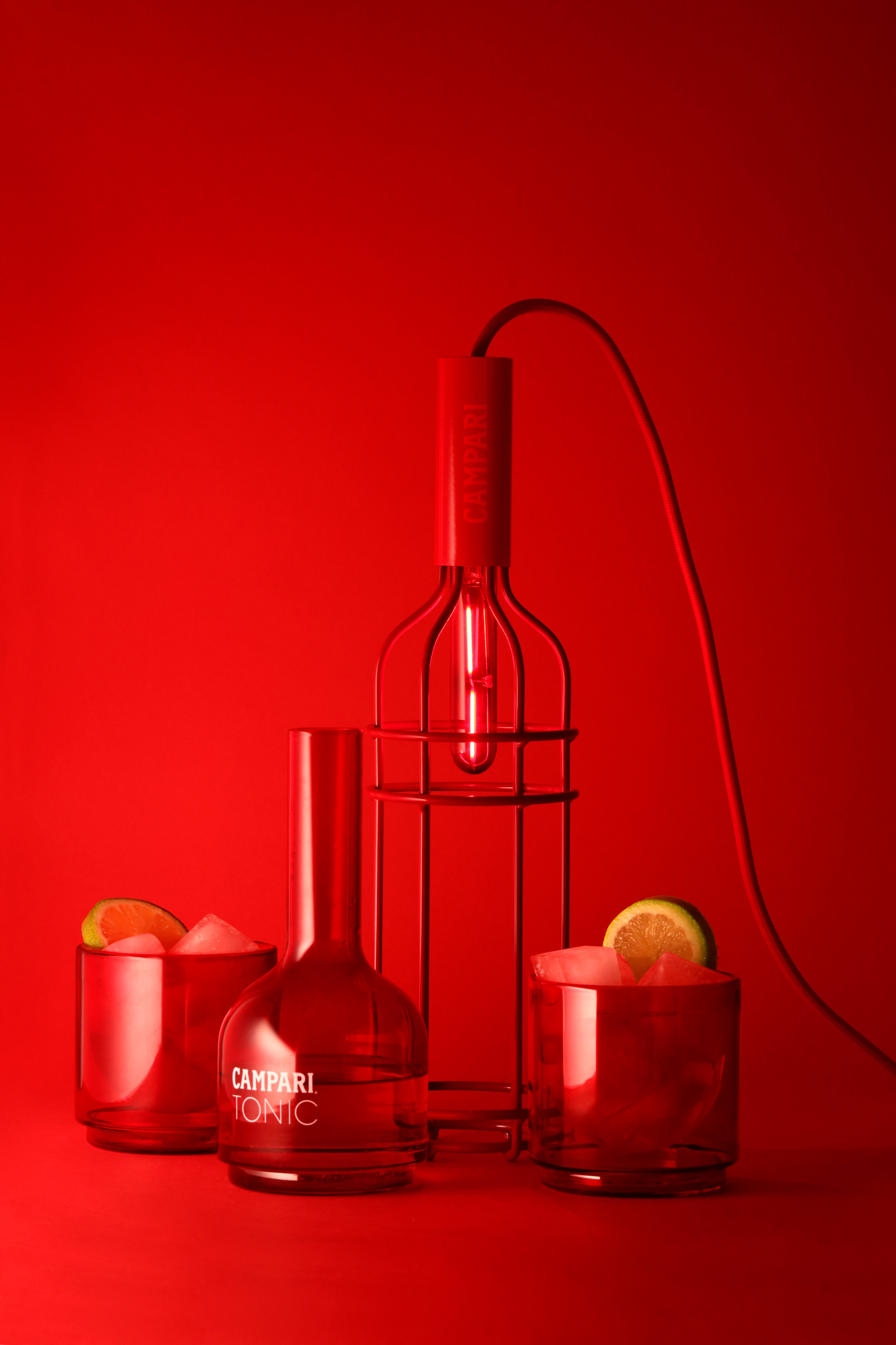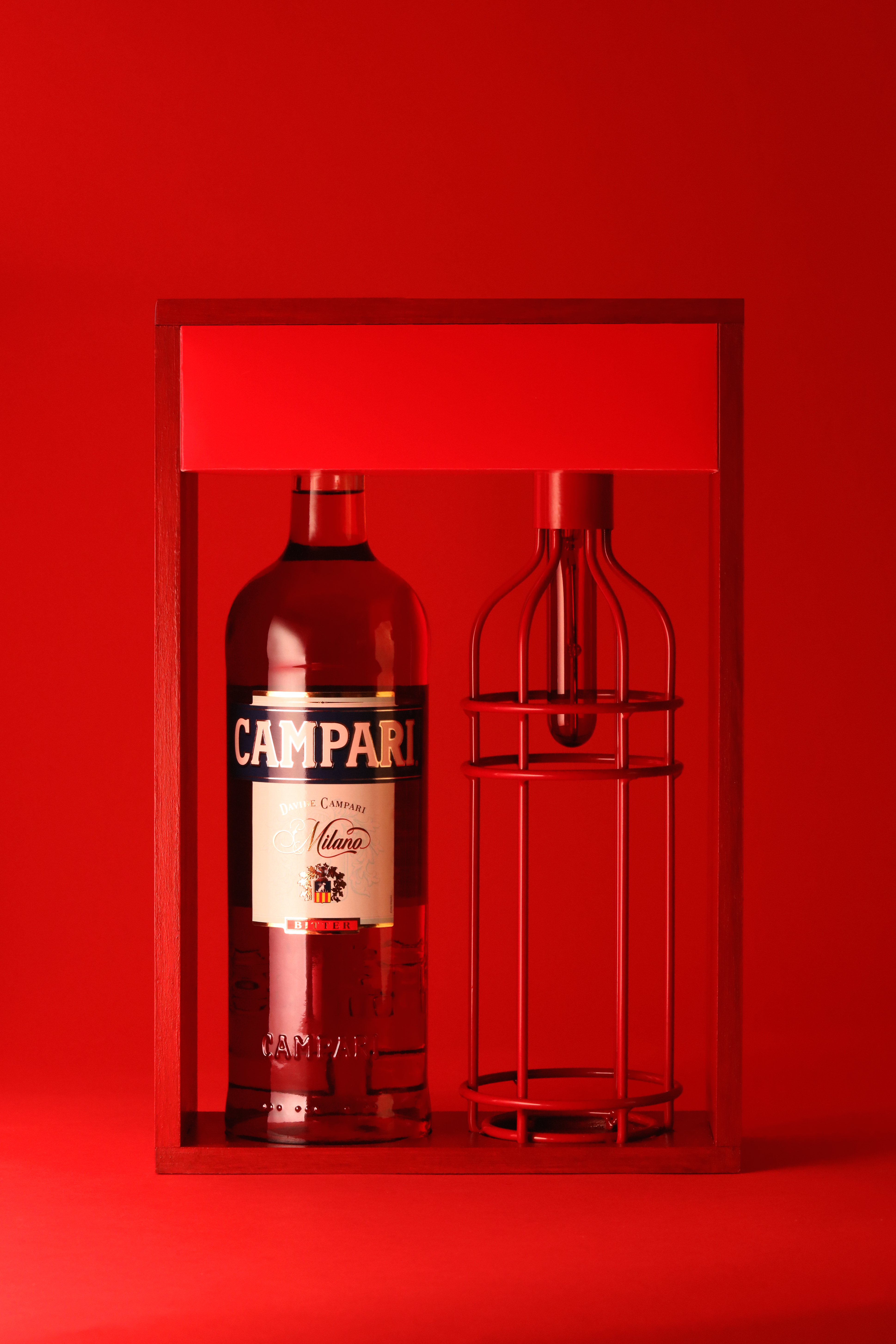 L’histoire commence en 2017, avec une première bouteille réalisée en verre borosilicate « double paroi » qui se décompose pour dévoiler un service de deux verres et d’une carafe idéale pour déguster le Campari Tonic. Plus besoin de plateau pour transporter les verres à table, une seule main suffit ! le premier coffret initié par la France est né et la série de bouteilles détournées enclenchée. En 2018, les 5.5 récidivent dans l’art du détournement avec une seconde édition qui dévoile une lampe, aux lignes graphiques, inspirée de la silhouette de la bouteille CAMPARI. Un objet lumineux, à suspendre ou à poser, qui diffuse une lueur rouge intense, pour une expérience de dégustation en immersion totale dans la couleur iconique du bitter Italien. Cette lampe, déjà collector, est éditée en série limitée et vendue dans un coffret au côté de la bouteille
