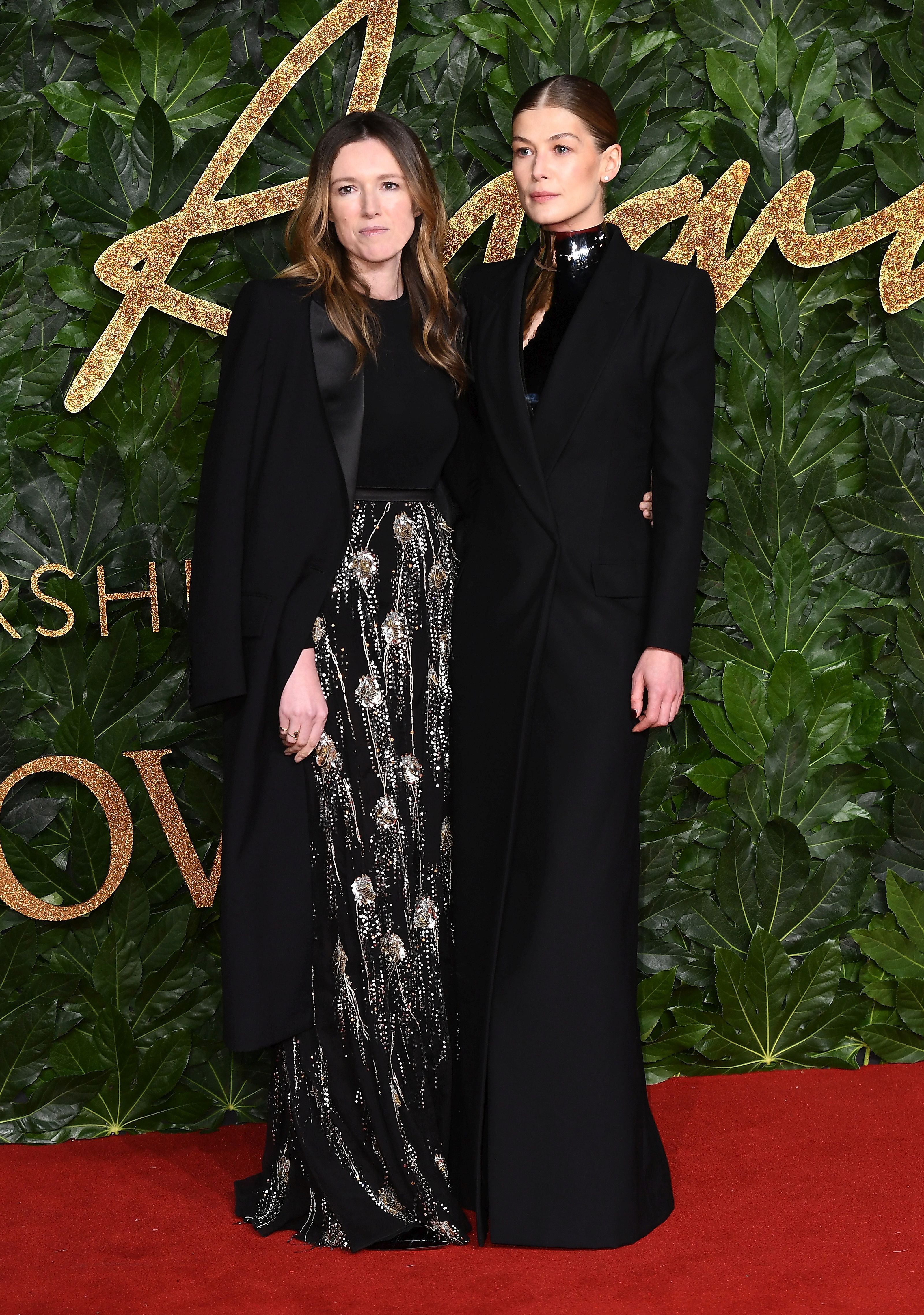 LONDON, ENGLAND – DECEMBER 10: Clare Waight Keller and Rosamund Pike arrive at The Fashion Awards 2018 In Partnership With Swarovski at Royal Albert Hall on December 10, 2018 in London, England. (Photo by Jeff Spicer/BFC/Getty Images for BFC)