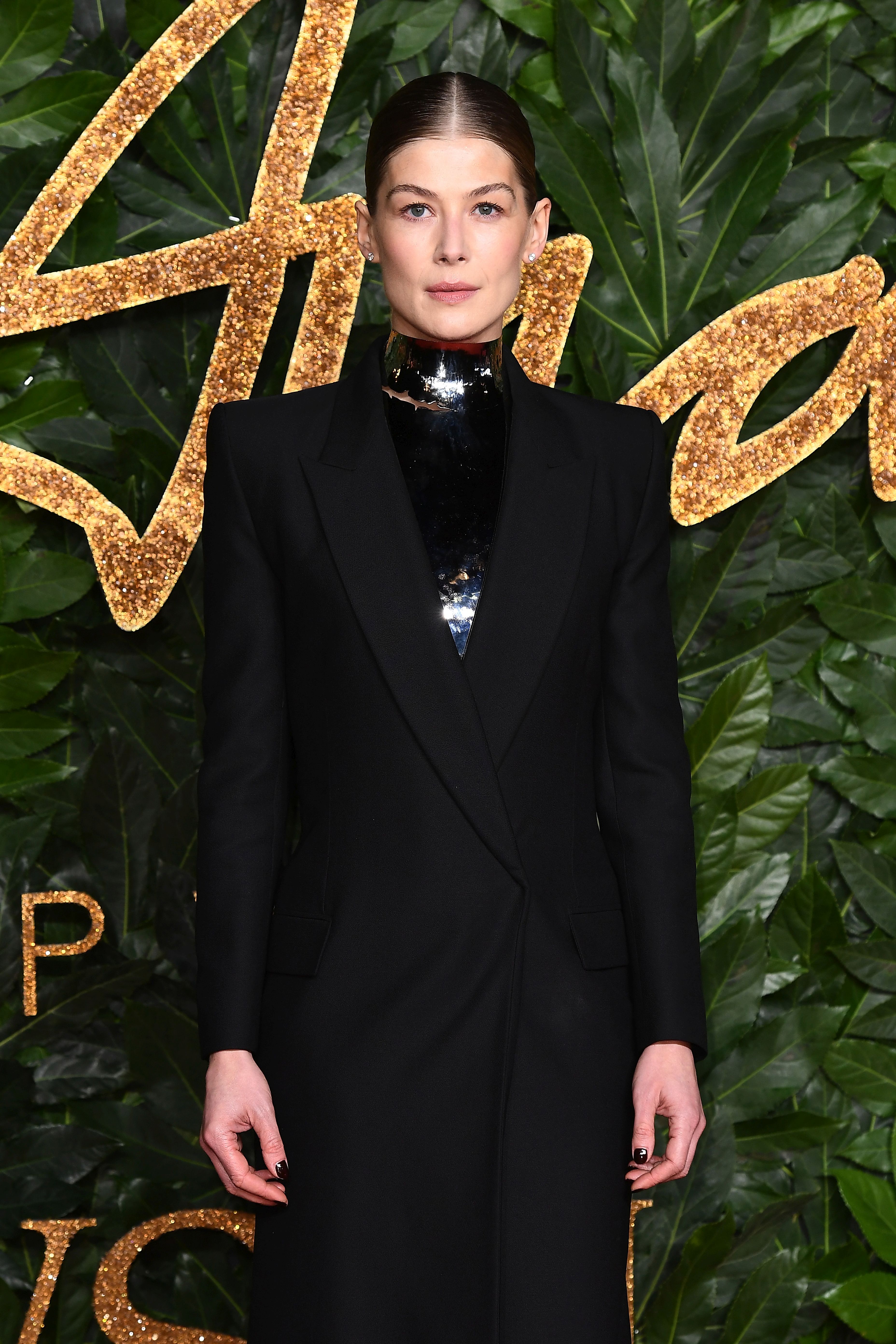 LONDON, ENGLAND – DECEMBER 10: Rosamund Pike arrives at The Fashion Awards 2018 In Partnership With Swarovski at Royal Albert Hall on December 10, 2018 in London, England. (Photo by Jeff Spicer/BFC/Getty Images for BFC)