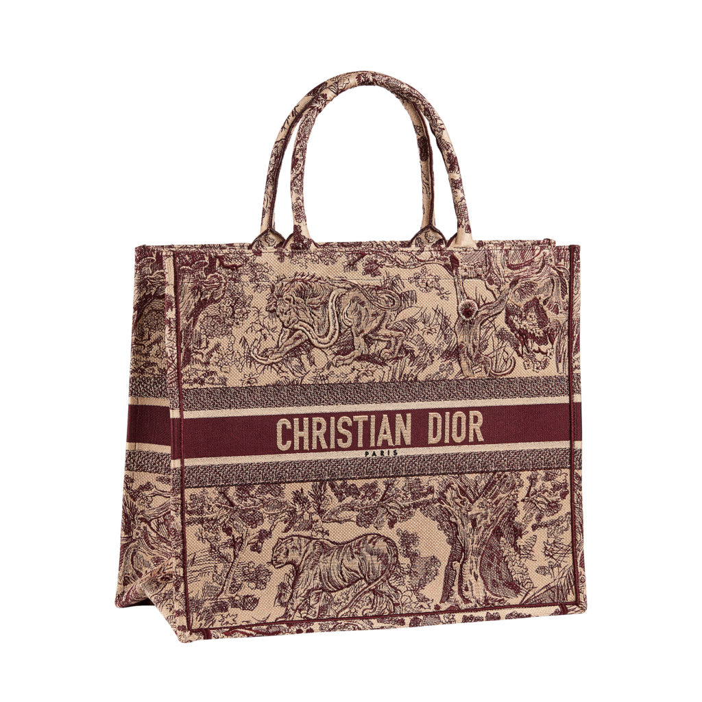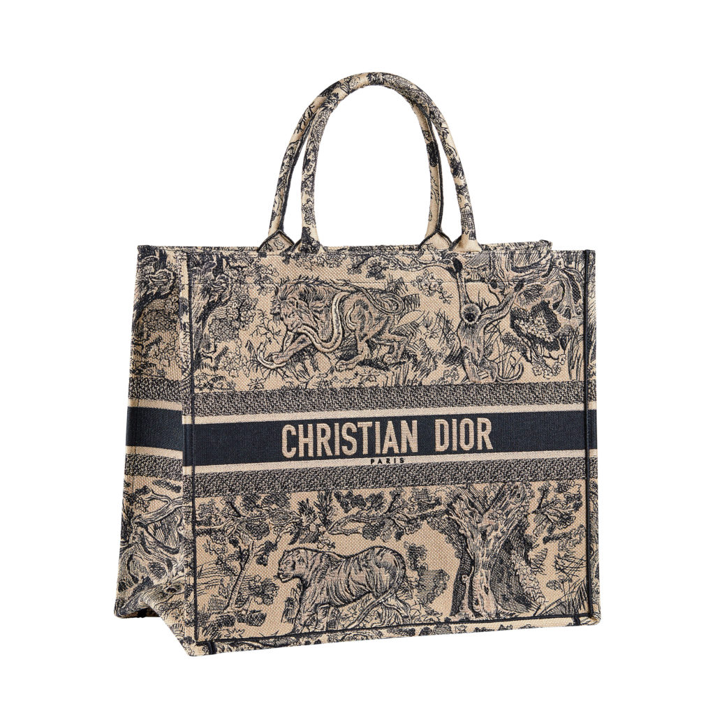 Ce grand classique de la confection française ornait, dès 1947, les murs de la première boutique du couturier-fondateur, baptisée « Colifichets » – au 30, avenue Montaigne – et réalisée avec le décorateur Victor Grandpierre, d’après les conseils de l’artiste Christian Bérard. L’imprimé choisi représente une jeune femme sur une balançoire, dans un univers bucolique fantasmé. S’inspirant précisément de cette toile de Jouy, Maria Grazia Chiuri l’a modernisée pour la collection croisière 2019 en remplaçant les illustrations pastorales traditionnelles par une série d’animaux sauvages, tous dessinés, au préalable, à la main et à la plume. Ils apparaissent brodés ou imprimés sur différents vêtements et accessoires, à l’image du Dior Book Tote, confectionné en Italie. Rendez-vous dans un atelier familial traditionnel italien, pour y suivre la première étape de sa confection : la broderie. A elle seule, cette pièce a exigé plus d’un million six cent mille points de couture, réalisés en quarante-deux heures. Après avoir entièrement brodé un fond beige, les machines à coudre commencent le dessin, sous le regard avisé des artisans. D’abord, les feuillages et les troncs des arbres en bleu, puis on devine les silhouettes des quatre protagonistes : le tigre, le singe, le lion et le serpent. Au fur et à mesure que les bobines de fil diminuent, les détails les plus infimes apparaissent. On distingue le regard malicieux du singe suspendu à une branche, le corps musclé du félin tigré ou encore le duel acharné entre un serpent et un lion. Ces saynètes animalières ont demandé un long travail de recherche en amont ; il a fallu développer des techniques de piqûre en relief pour créer des jeux d’optique uniques et faire ressortir les éléments les plus précis. « J’ai mis au goût du jour les scènes décoratives et je les ai rendues plus dynamiques et surprenantes en représentant des animaux sauvages et exotiques pour l’imaginaire occidental, qui font presque de mes toiles un acte de transgression surréaliste par rapport à la tradition. On découvre cela uniquement en faisant très attention ou en observant de très près le tissu », explique Maria Grazia Chiuri. Enfin, sur le devant du sac, la mention « Christian Dior » a été brodée en beige et « Paris », en noir. Les cinq pièces du Dior Book Tote sont ensuite inspectées et contrôlées, avant d’être envoyées dans les ateliers maroquiniers de la Maison, situés dans l’arrière-pays florentin, pour l’étape du montage. L’artisan commence par les deux anses, cousues avec des renforts sur les pans avant et arrière du sac. Leur longueur permet un porté à la main ou à l’épaule, et leur forme ronde offre un confort absolu. La discrète signature « Christian Dior Paris, made in Italy », marquée à chaud au ruban doré sur un cuir de veau lisse, est ensuite placée à l’intérieur. Puis l’artisan peut assembler entre elles, à la machine à coudre, les parties latérales et centrales du sac. Le Dior Book Tote est prêt, à présent, à devenir le nouvel indispensable de votre garde-robe.