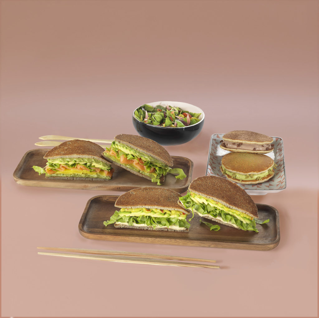 L’histoire de Marxito débute dans les rues de Tokyo. Thierry Marx y découvre au détour d’une boutique une machine fascinante, capable de fabriquer ces fameux doriyaki, crêpes épaisses fourrées de pâte de haricots rouges. Il y voit immédiatement un terrain de jeu propice à de nouvelles créations culinaires. Le Marxito est né. Une galette levée de sarrasin, fourrée d’ingrédients triés sur le volet et déclinée en salées et sucrées, dans un esprit francojaponais, voilà pour le postulat de base. Viennent ensuite les recettes imaginées par Thierry Marx, à 80% végétales : “Aubergines marinées, scarmozza, sauce piquilhos”, “Guacamole, oignons rouge, sésame torréfié, sauce ginger tofu”, “Saumon fumé, avocat, radis japonais, sauce miso persil”, “Pastrami, oignons confits, moutarde coréenne, laitue, cheddar”… Crème mousseuse (nature, matcha, chocolat…) ou confiture artisanale (myrtille, framboise et sudashi ou pomelo, orange, et yuzu) viennent garnir les Marxito sucrés.