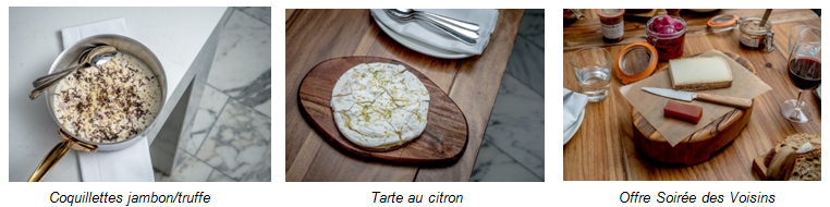 Le lieu est accueillant tout au long de la journée, du petit déjeuner avec son large buffet à l’afterwork grâce à sa conviviale Soirée des Voisins*, en passant par son Déjeuner Comptoir**, assortiment varié de plats cuisinés minute à déguster sur le pouce, notamment les incontournables du restaurant tels que les coquillettes jambon-truffe ou la tarte au citron…