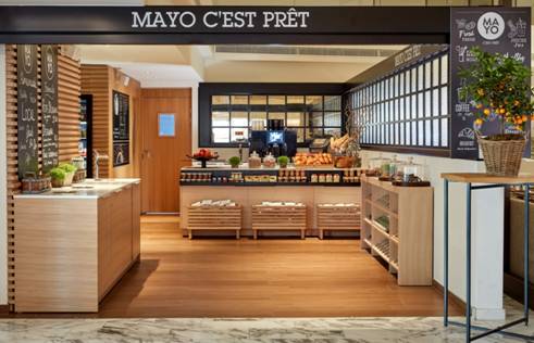 Petit frère du Mayo, Mayo C’est Prêt est un lieu hybride, à la fois corner ‘Grab & Go’, épicerie fine et service de livraison en chambre de l’hôtel.