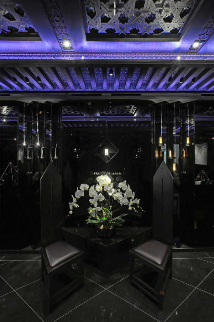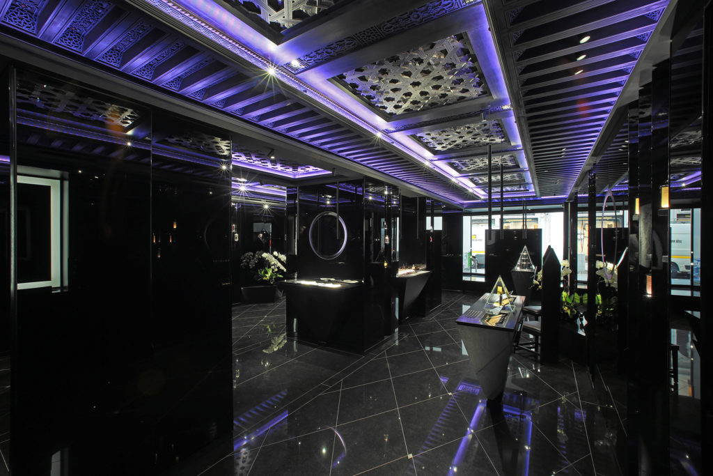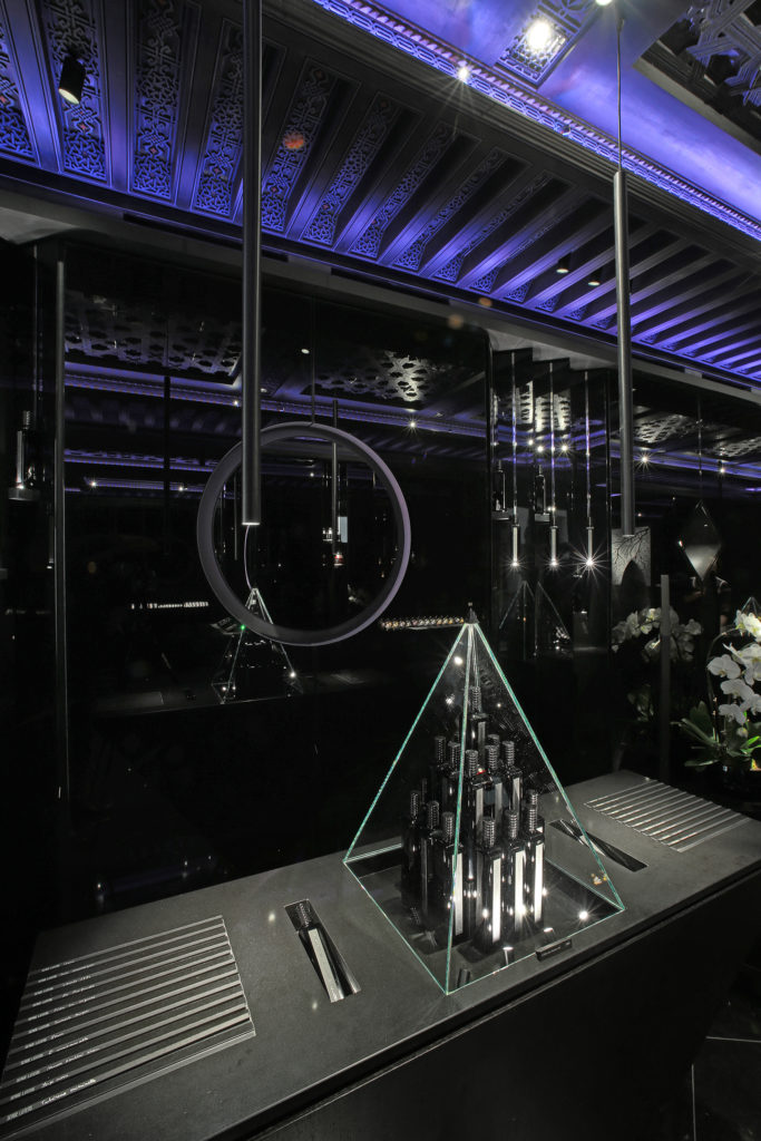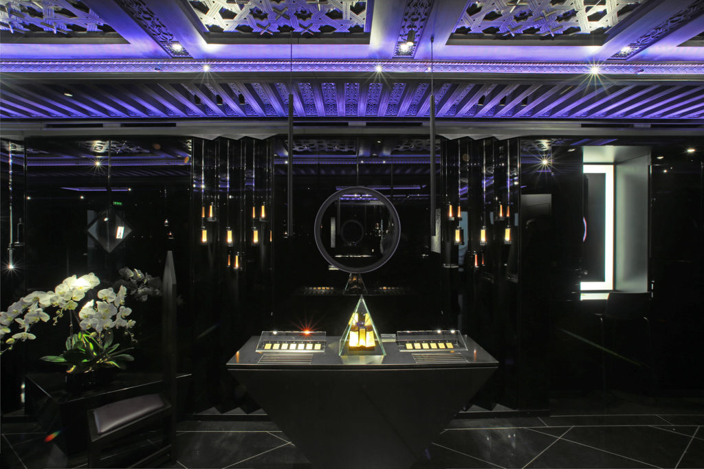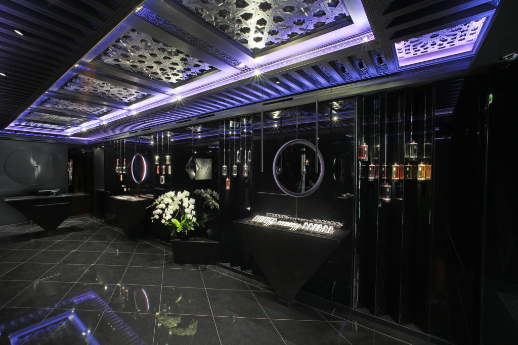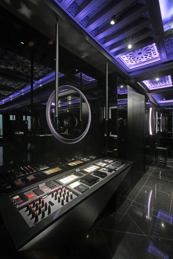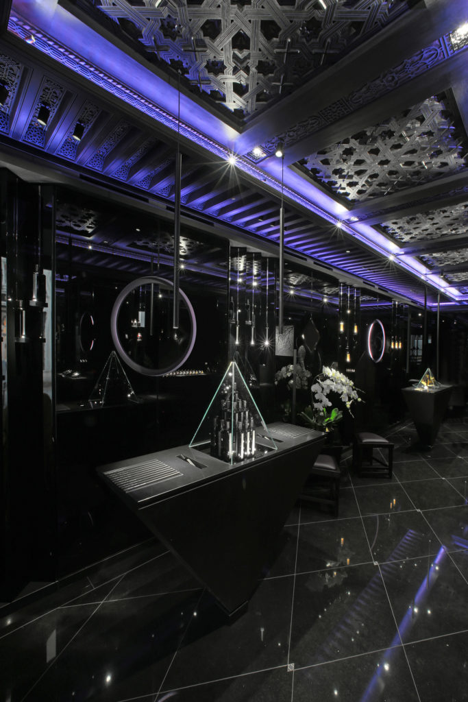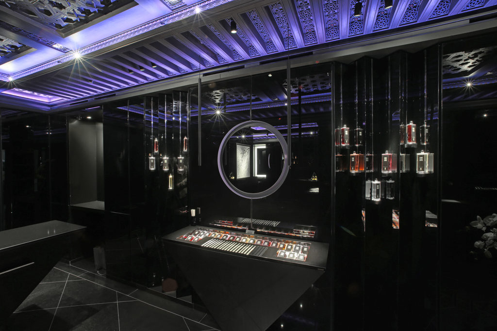 Loin de la confidentialité des arcades du Palais Royal, la marque revendique cette foisci l’ouverture d’une adresse parisienne fréquentée par une clientèle plus cosmopolite. On retrouvera donc en ce lieu les nombreuses influences reçues au cours du parcours de Serge Lutens : de la verve géométrique marocaine présente dans les plafonds de cèdre sculptés, au sens de la perfection japonaise ressentie jusqu’au travail des laques, ici, toute la richesse d’une vie placée aux antipodes géographiques mais, sous le signe de la beauté, déroule sa somptuosité. Un syncrétisme unique et inattendu à la croisée des chemins entre constructivisme et mysticisme. À Serge Lutens, rien d’impossible ! Le rendez-vous offre une plongée et une expérience authentique au plus proche du créateur.