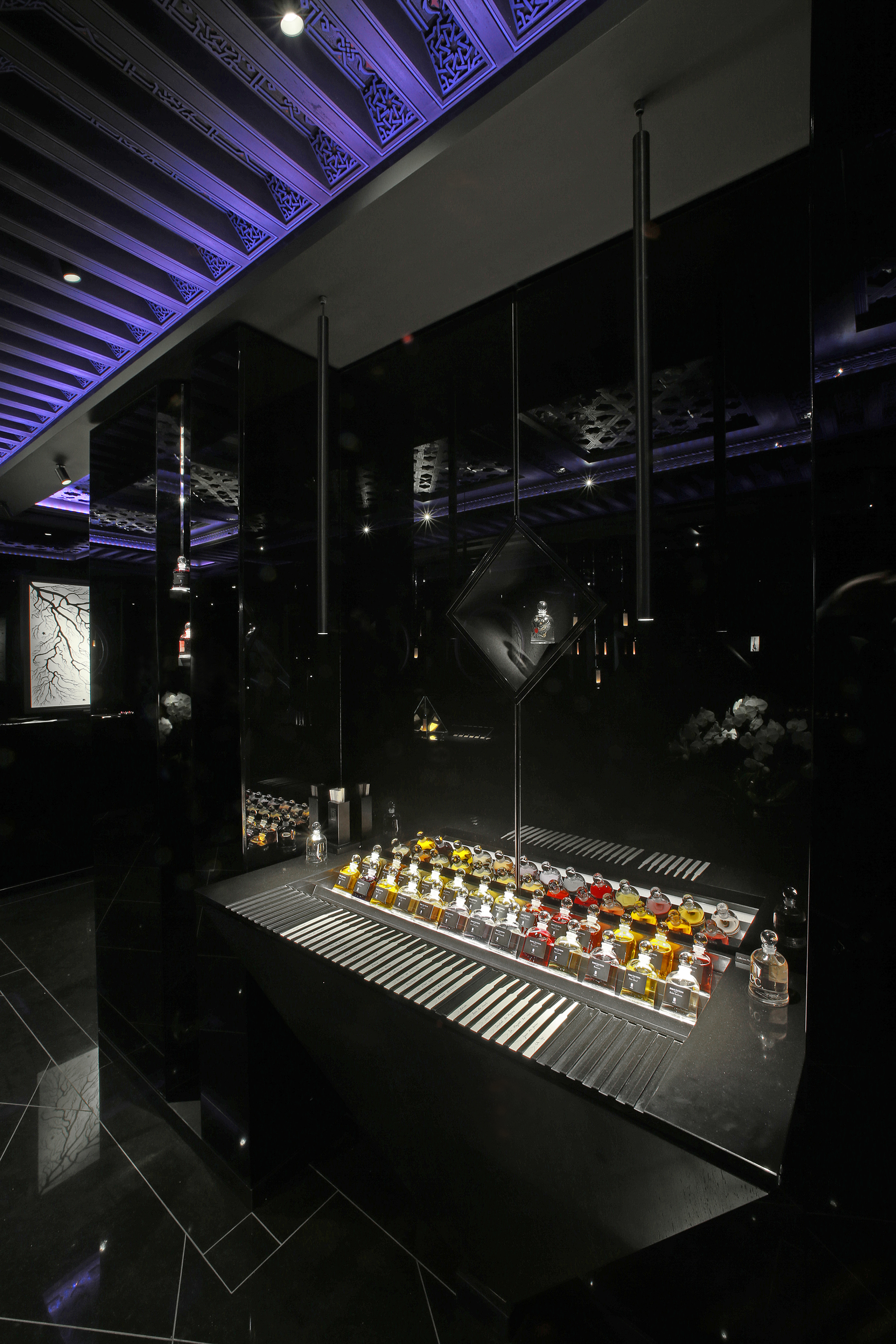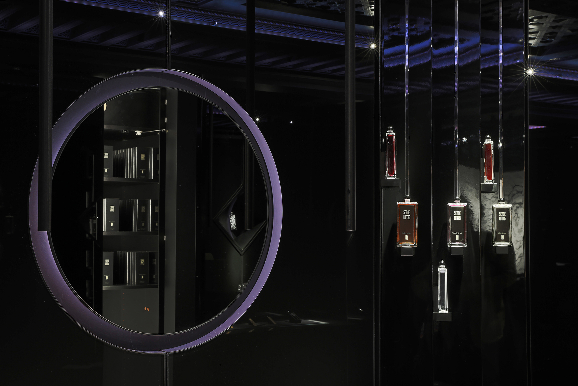 Loin de la confidentialité des arcades du Palais Royal, la marque revendique cette foisci l’ouverture d’une adresse parisienne fréquentée par une clientèle plus cosmopolite. On retrouvera donc en ce lieu les nombreuses influences reçues au cours du parcours de Serge Lutens : de la verve géométrique marocaine présente dans les plafonds de cèdre sculptés, au sens de la perfection japonaise ressentie jusqu’au travail des laques, ici, toute la richesse d’une vie placée aux antipodes géographiques mais, sous le signe de la beauté, déroule sa somptuosité. Un syncrétisme unique et inattendu à la croisée des chemins entre constructivisme et mysticisme. À Serge Lutens, rien d’impossible ! Le rendez-vous offre une plongée et une expérience authentique au plus proche du créateur.