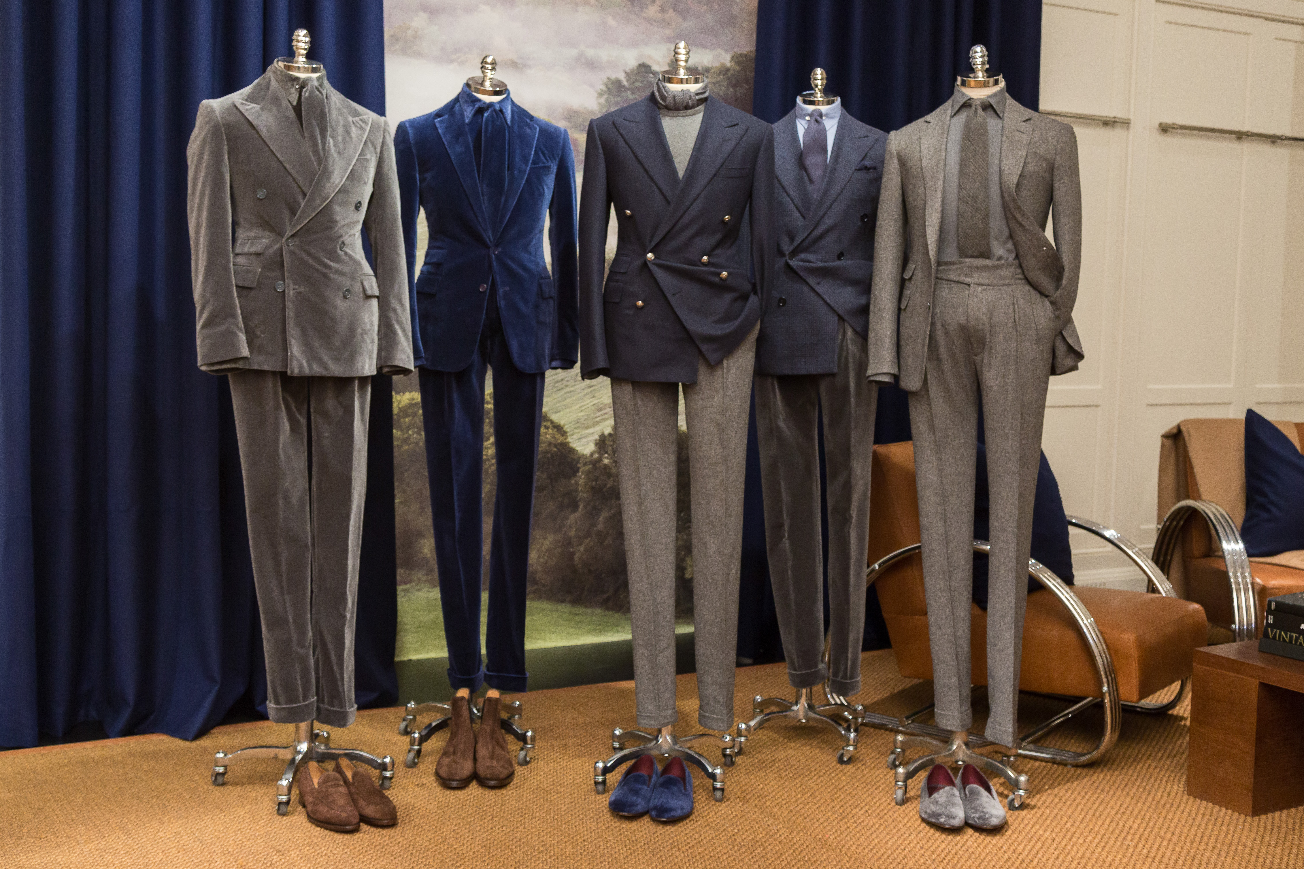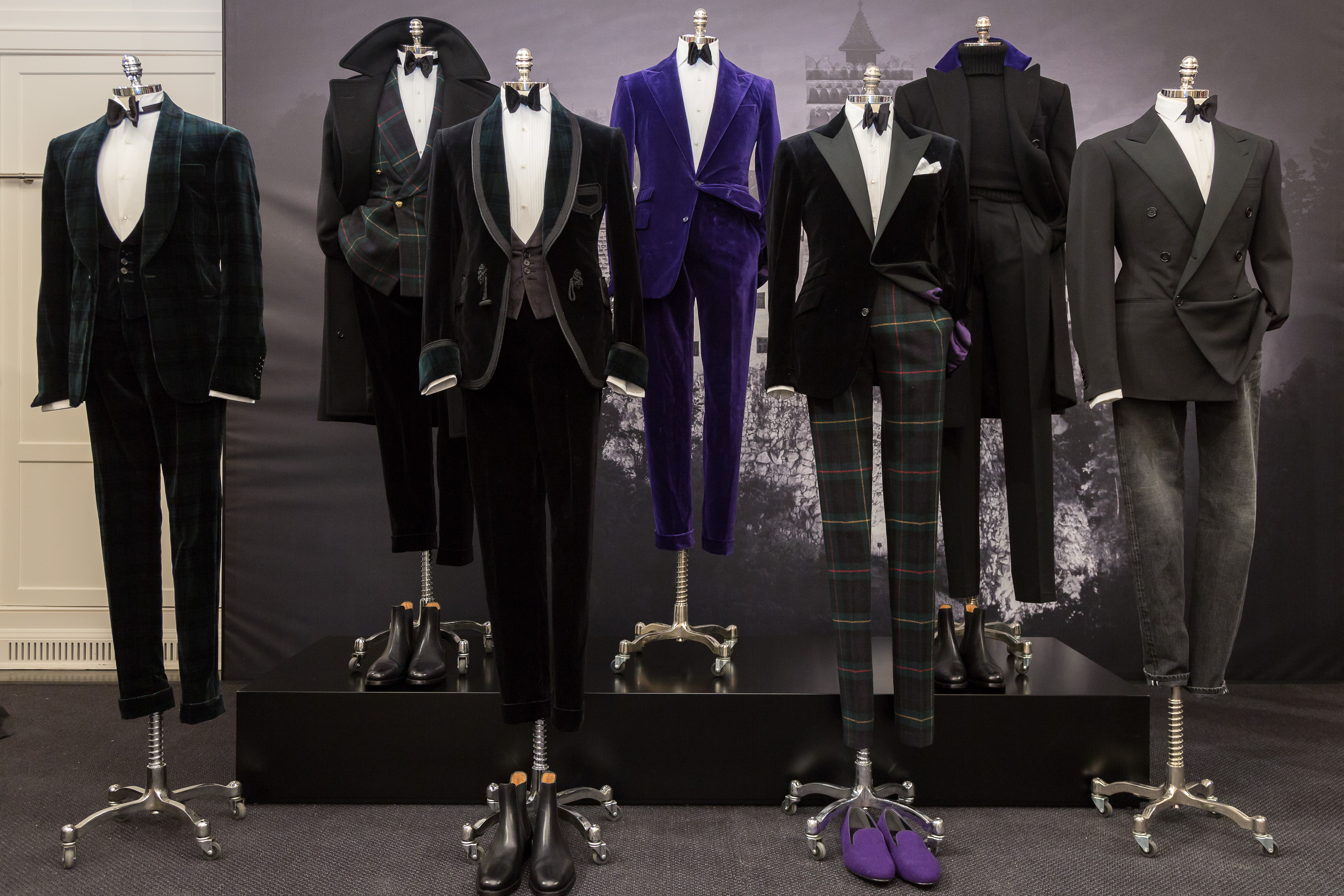 Les tenues du soir décrivent quant à elles un homme romantique et sophistiqué, dans ses costumes en velours à carreaux, ses smokings en velours noir et ses manteaux dont le col est bordé de velours violet.