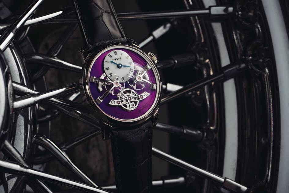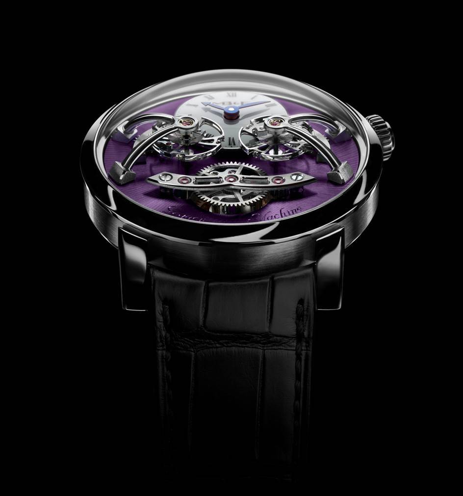 Aujourd’hui ils proposent du violet dans toute sa splendeur: la LM2 White Gold Purple, une nouvelle édition de la Legacy Machine No.2 limitée à 12 pièces. Recouvrant tout le visage de la Machine, la couleur anticonformiste fait écho au mouvement LM2 tout aussi anticonformiste. Conçu par les stars horlogères Jean-François Mojon et Kari Voutilainen, le calibre LM2 comprend deux balanciers volants et échappements totalement indépendants, dont la moyenne de marche est déterminée par un différentiel planétaire central.