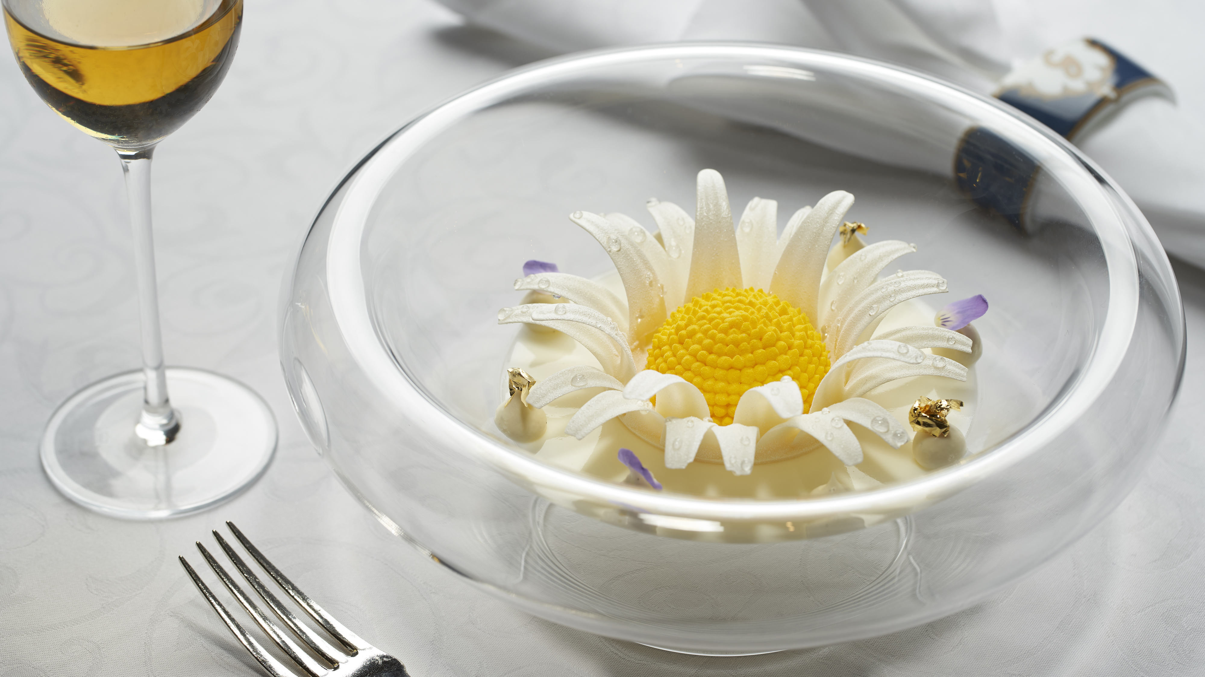 La Marguerite, une crème légère à la mangue avec un sorbet au citron vert et une panna cotta à la vanille fraîche ;