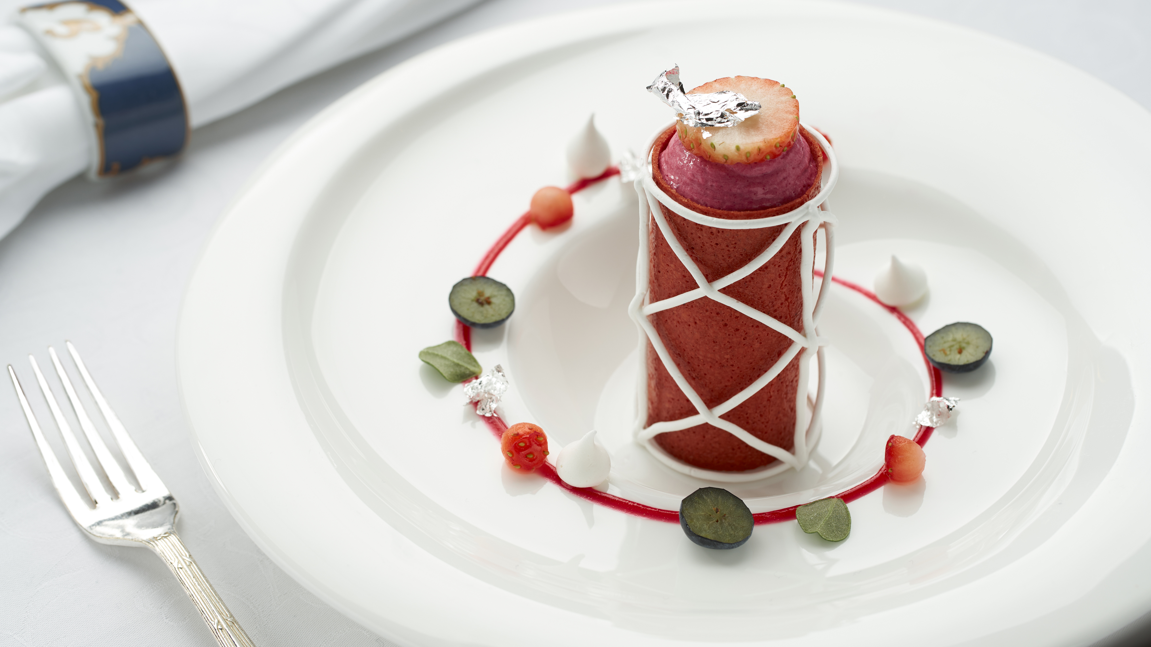 Le Tubemeringué, garni de fraises, d’une crème légère aux fruits rouges et d’un sorbet aux herbes ;