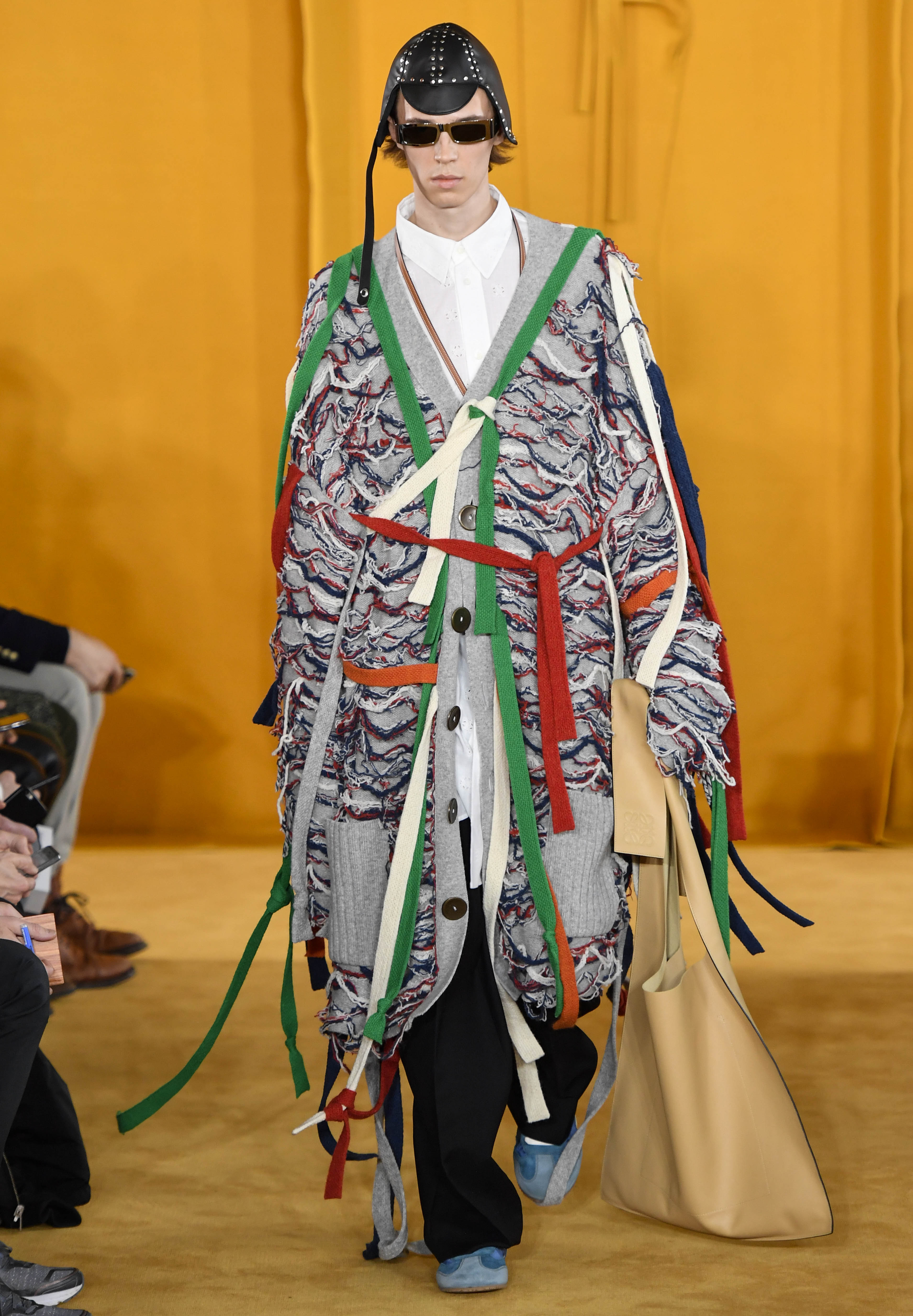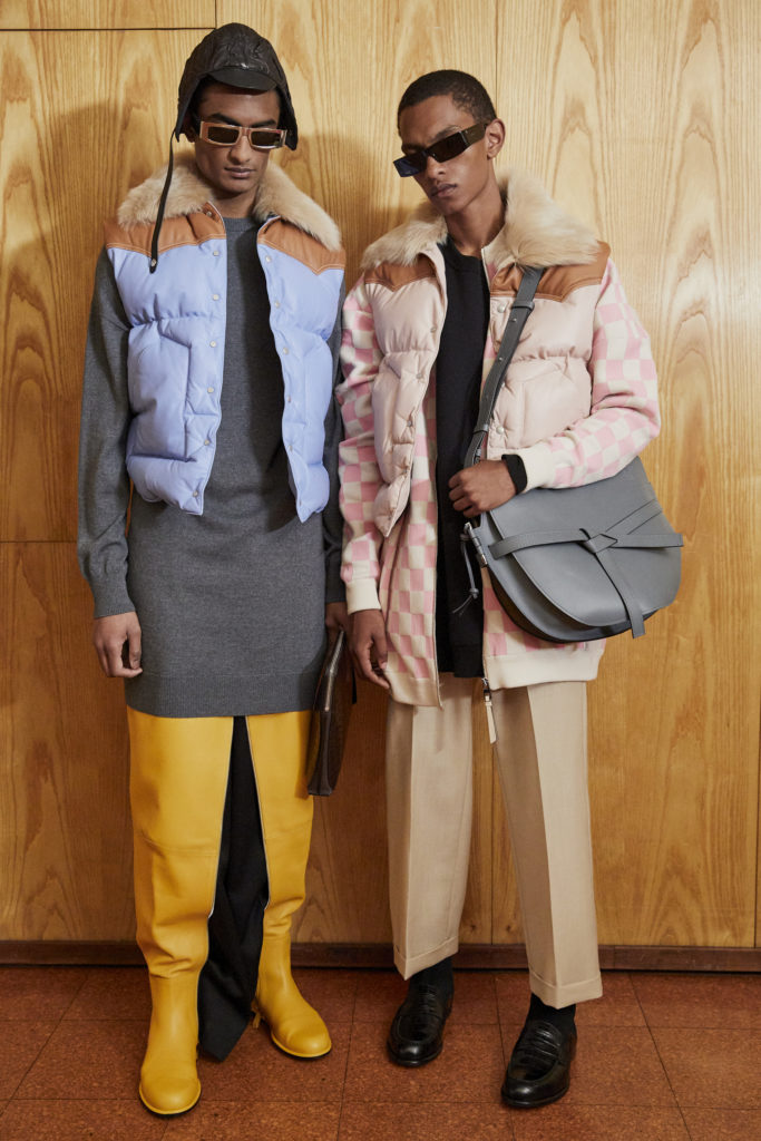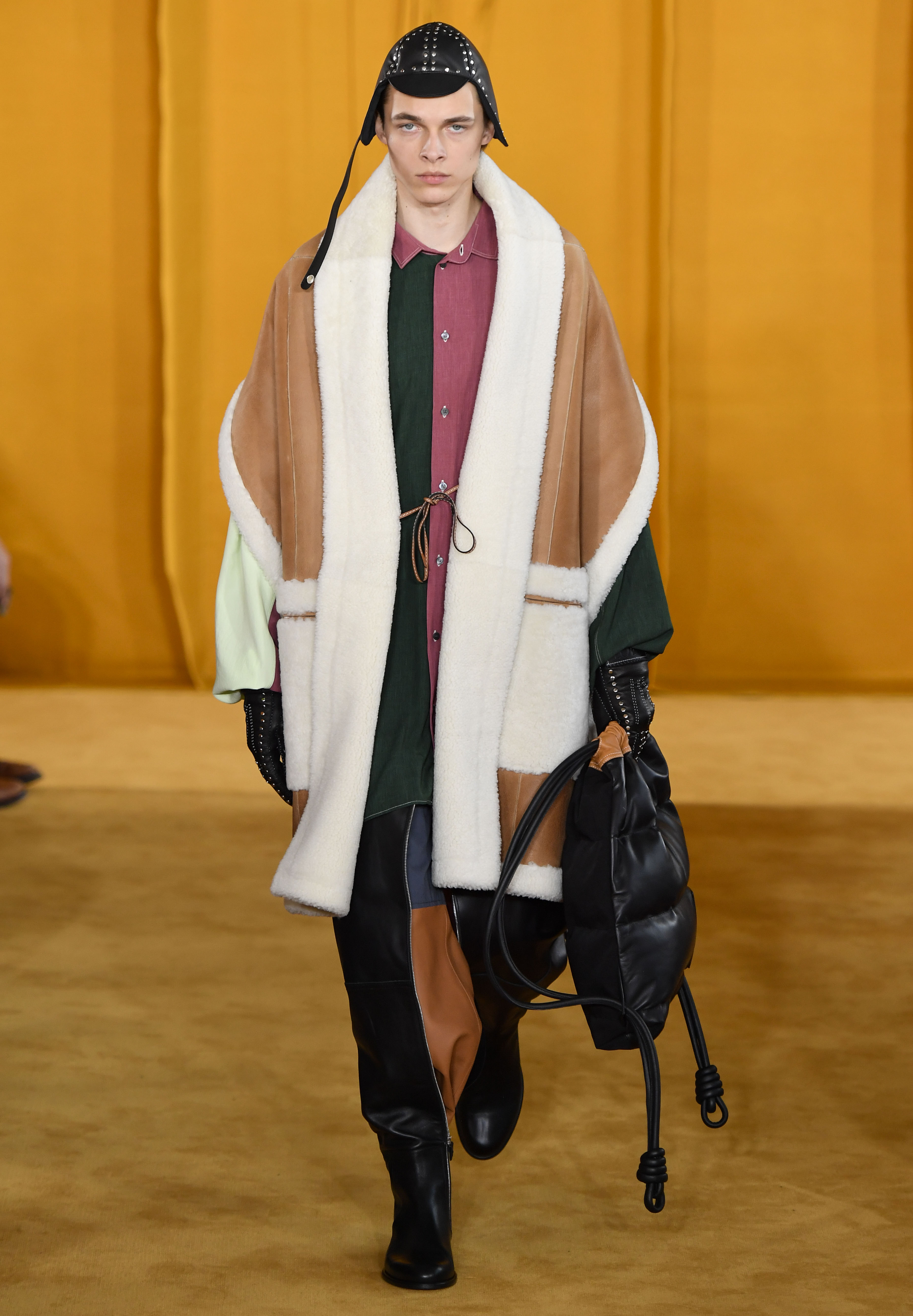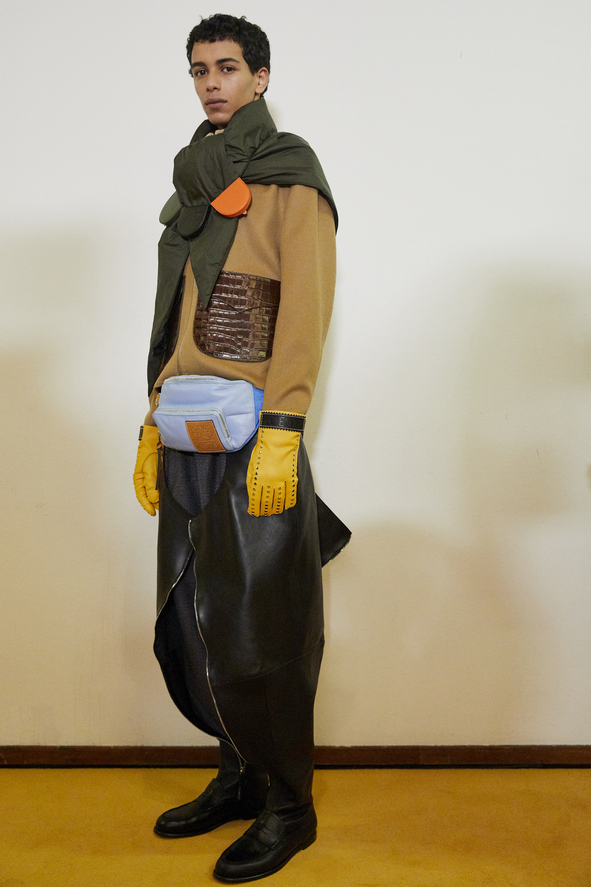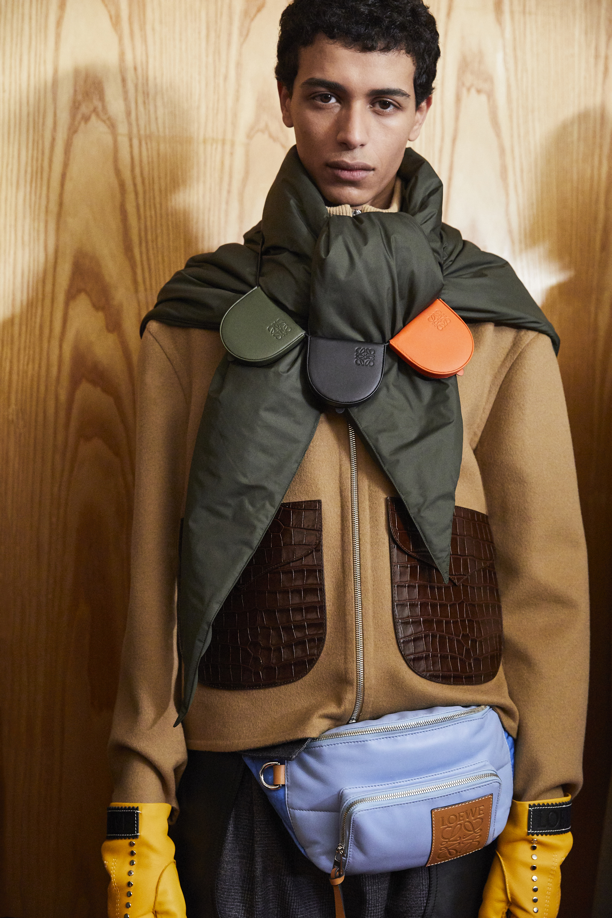 In conversation with the Fall Winter 2019-20 Men’s collection, the work suggests hybrid abstraction at a human scale, where both a garment’s utility and its connotation are called into question. By re-thinking fabrication and scale, LOEWE craftmanship materialises in unexpected ways – uniting incongruous ideals of masculinity where the worlds of sartorial tradition and team sports collide. In shearling and camel cashmere, outerwear pieces elevate the everyday. Trompe l’oeil arrives in tufted shearling and stamped croc, culminating in plush pastel leather quilting or a greatcoat fashioned from fringed cashmere scarves. Above unzipped calfskin waders, distended jerseys and tunics recall trail blankets and rugby stripes. Long knits collect relics: beads like pebbles, and naïve life drawings, whilst bound thread work cardigans evoke raw process. Like Walther’s peeling forms, hyper-extended shirt sleeves peek from beneath the new LOEWE tuxedo – a nipped 2-button suit with asymmetric lapels.