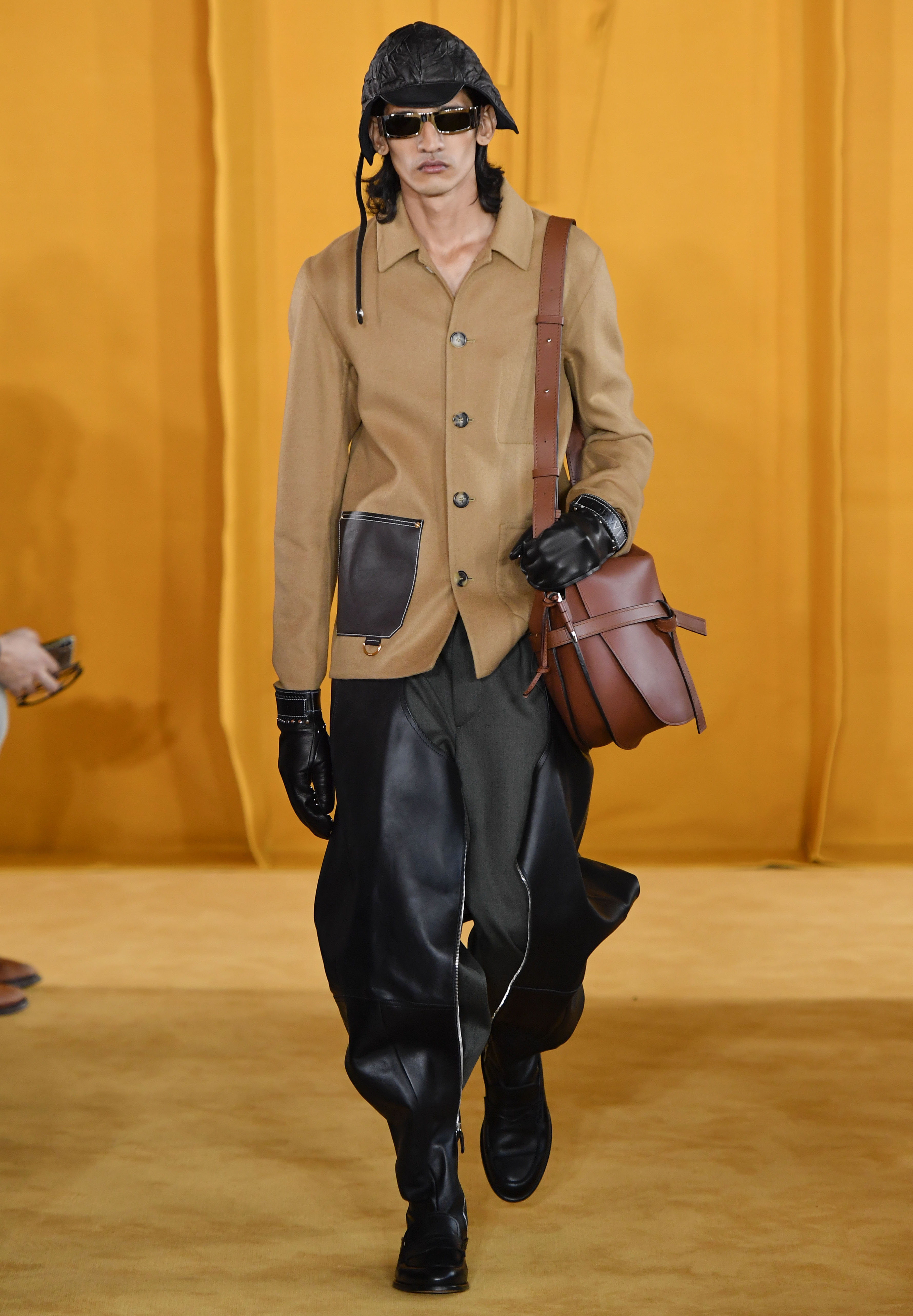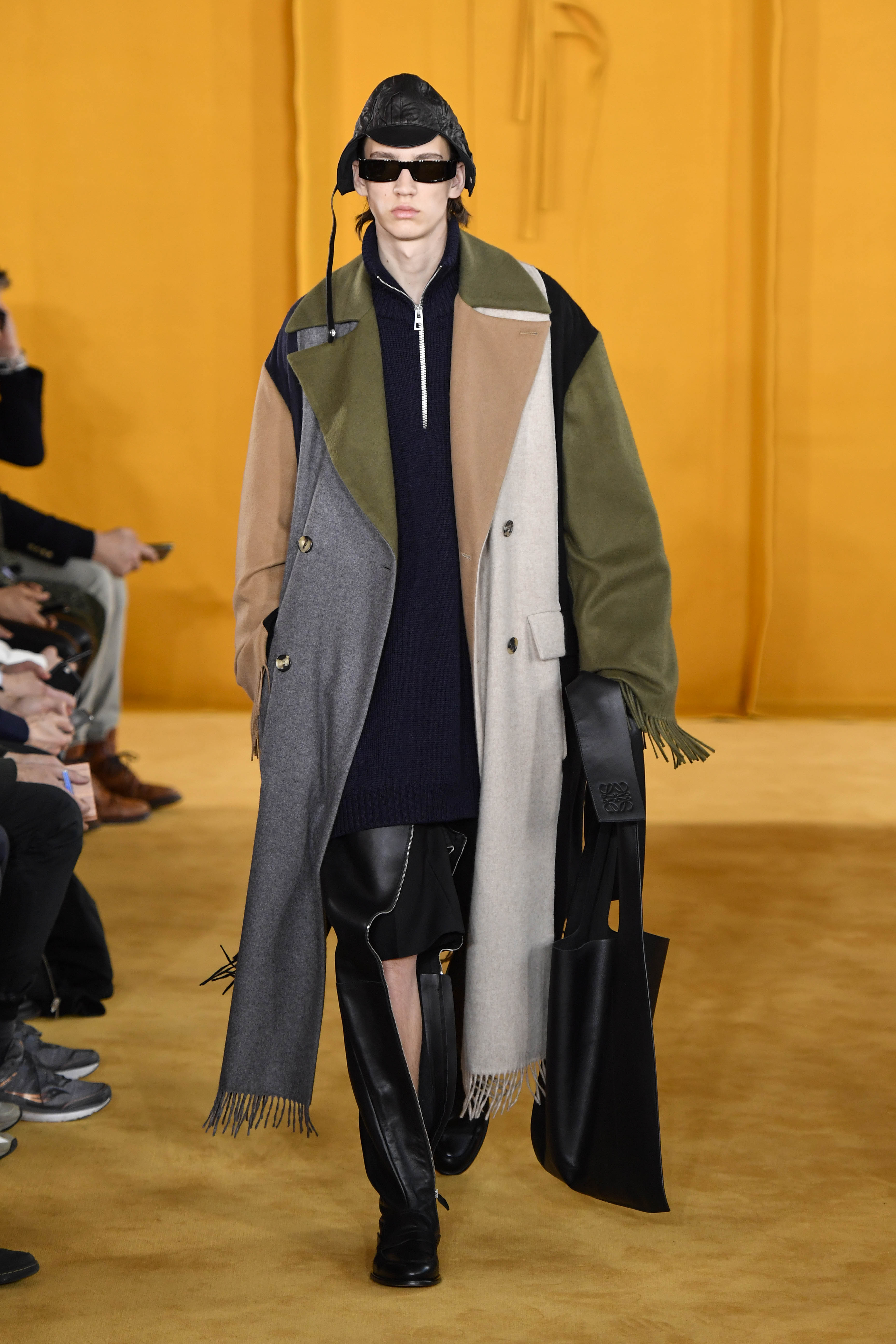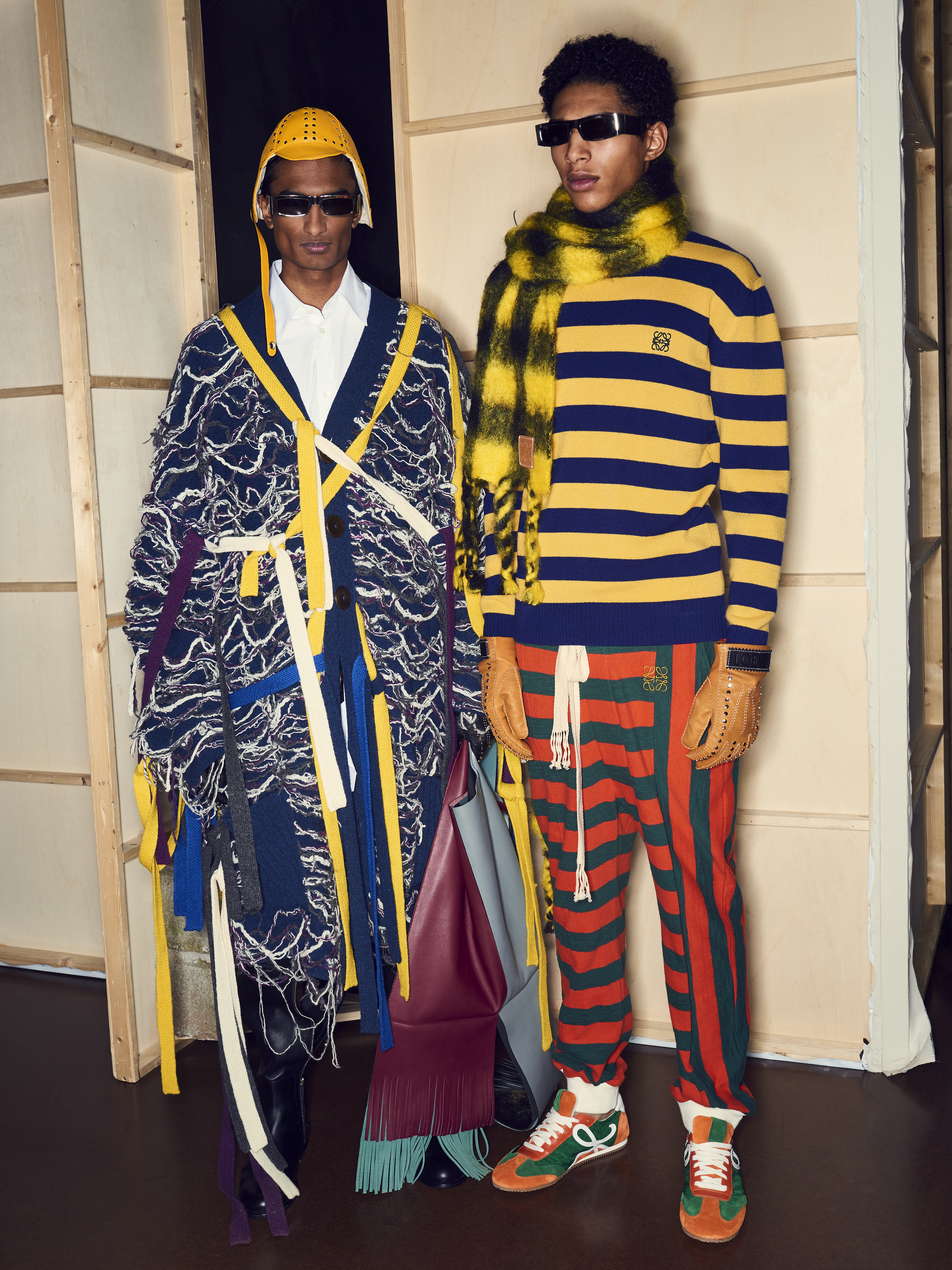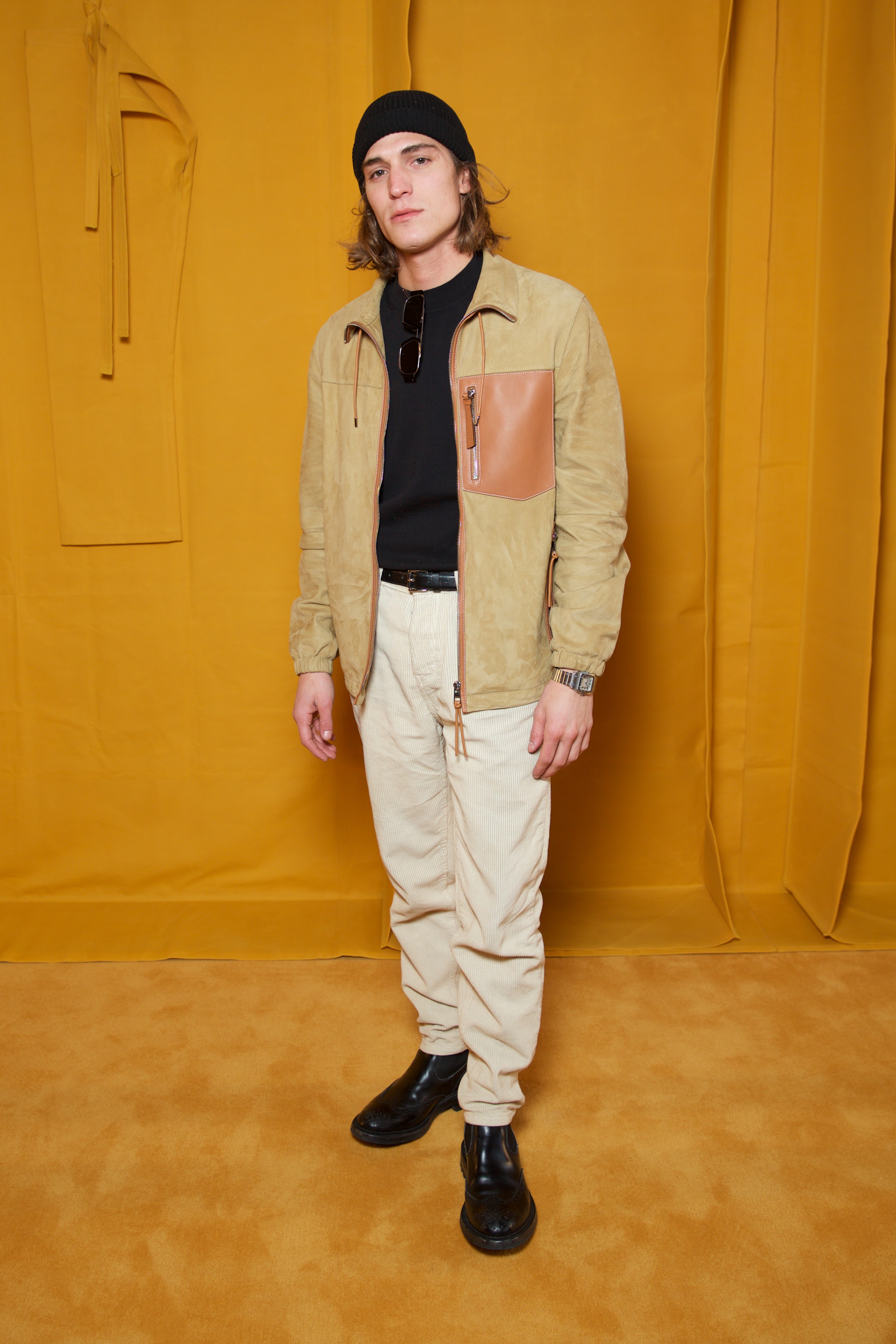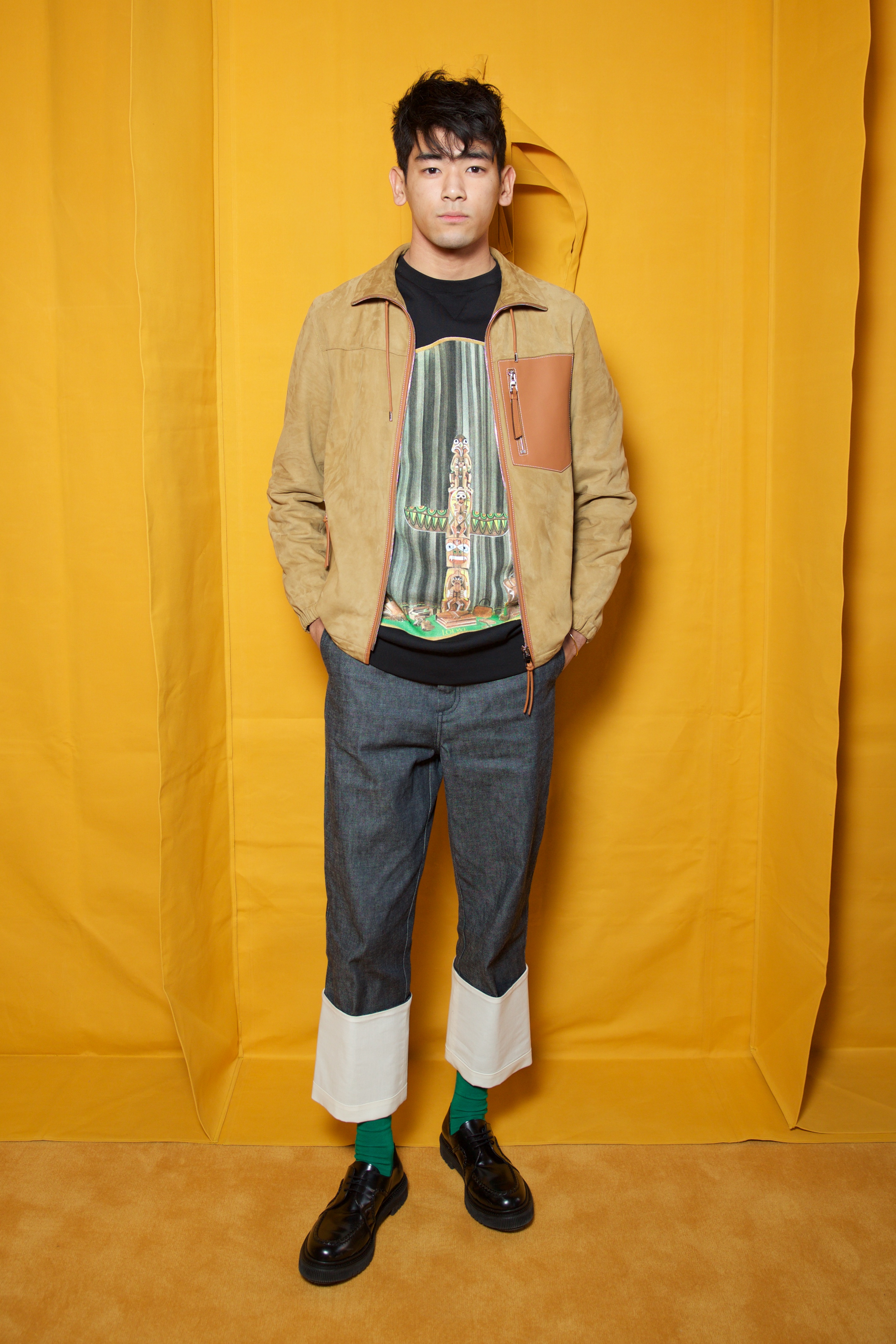 In conversation with the Fall Winter 2019-20 Men’s collection, the work suggests hybrid abstraction at a human scale, where both a garment’s utility and its connotation are called into question. By re-thinking fabrication and scale, LOEWE craftmanship materialises in unexpected ways – uniting incongruous ideals of masculinity where the worlds of sartorial tradition and team sports collide. In shearling and camel cashmere, outerwear pieces elevate the everyday. Trompe l’oeil arrives in tufted shearling and stamped croc, culminating in plush pastel leather quilting or a greatcoat fashioned from fringed cashmere scarves. Above unzipped calfskin waders, distended jerseys and tunics recall trail blankets and rugby stripes. Long knits collect relics: beads like pebbles, and naïve life drawings, whilst bound thread work cardigans evoke raw process. Like Walther’s peeling forms, hyper-extended shirt sleeves peek from beneath the new LOEWE tuxedo – a nipped 2-button suit with asymmetric lapels.
