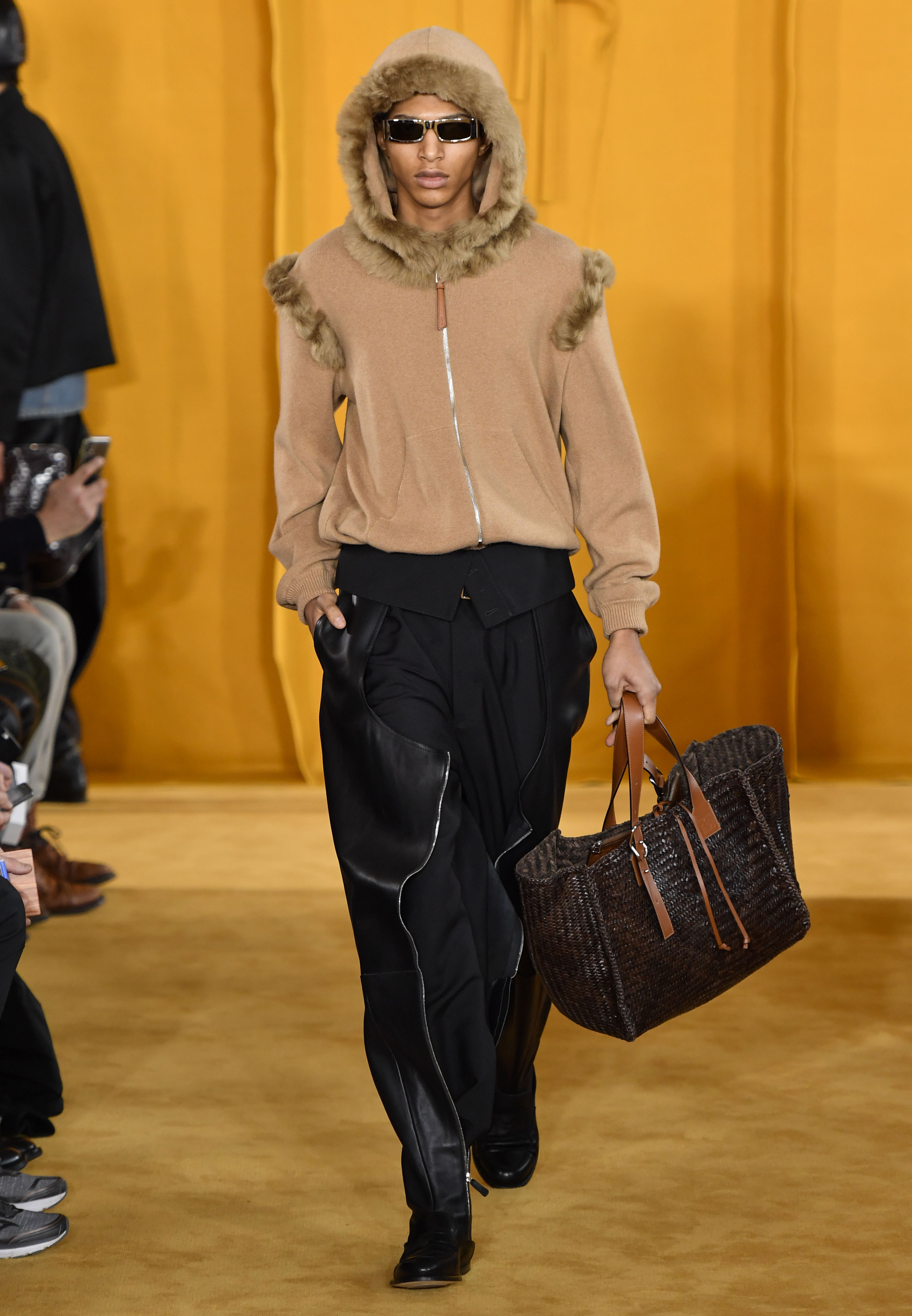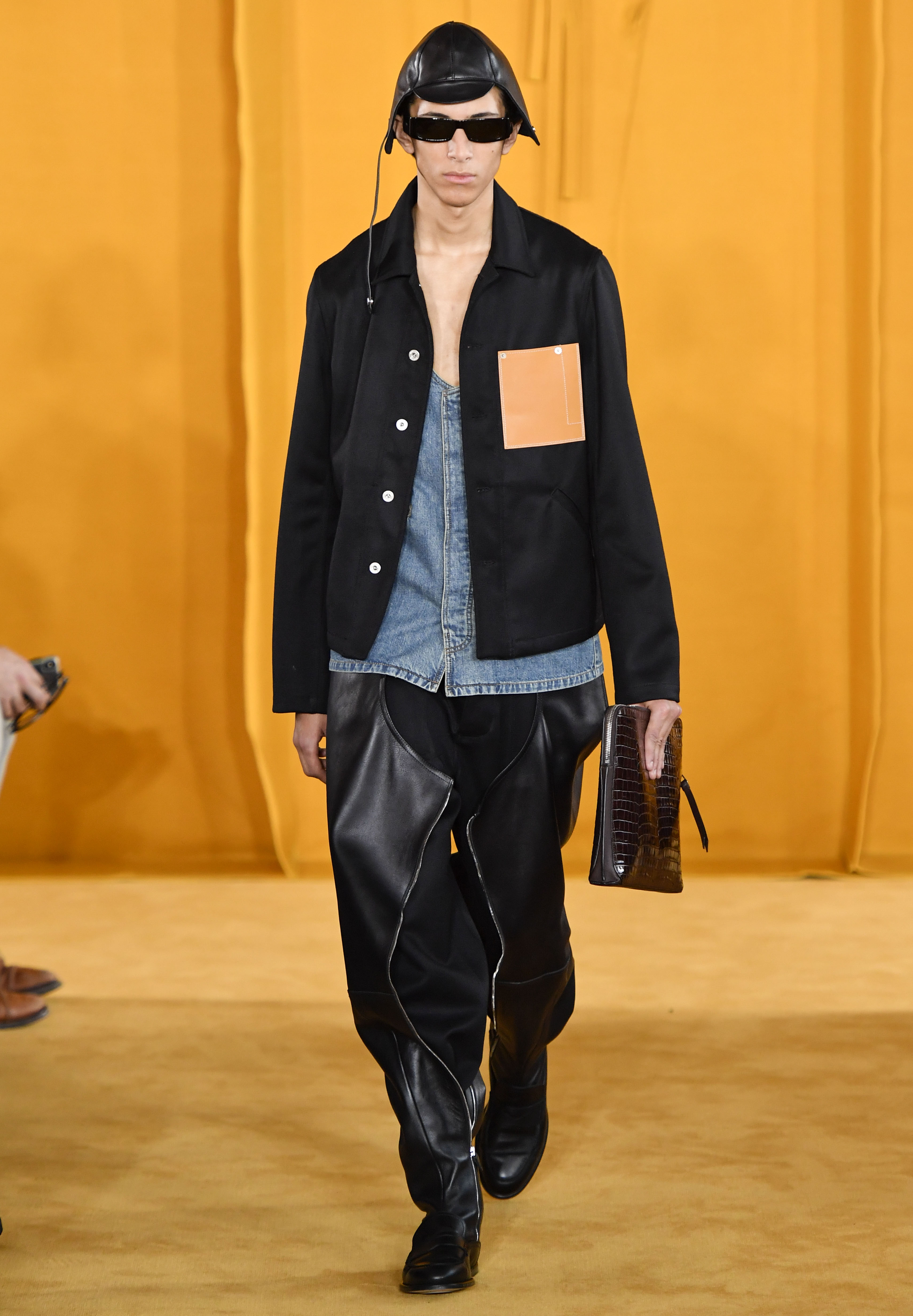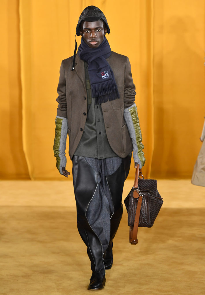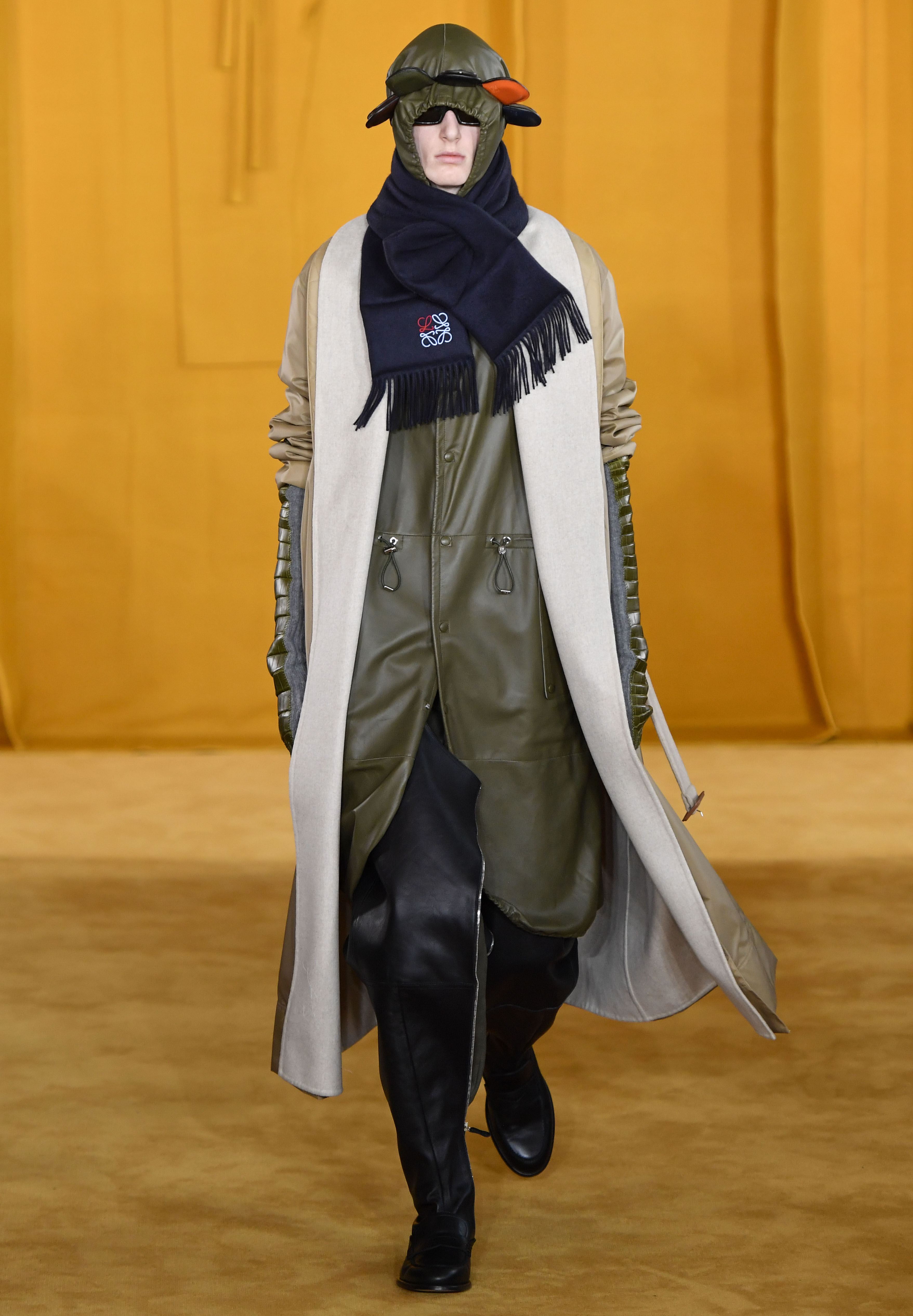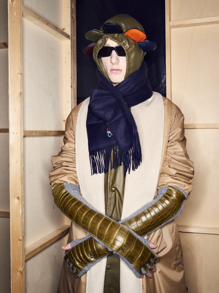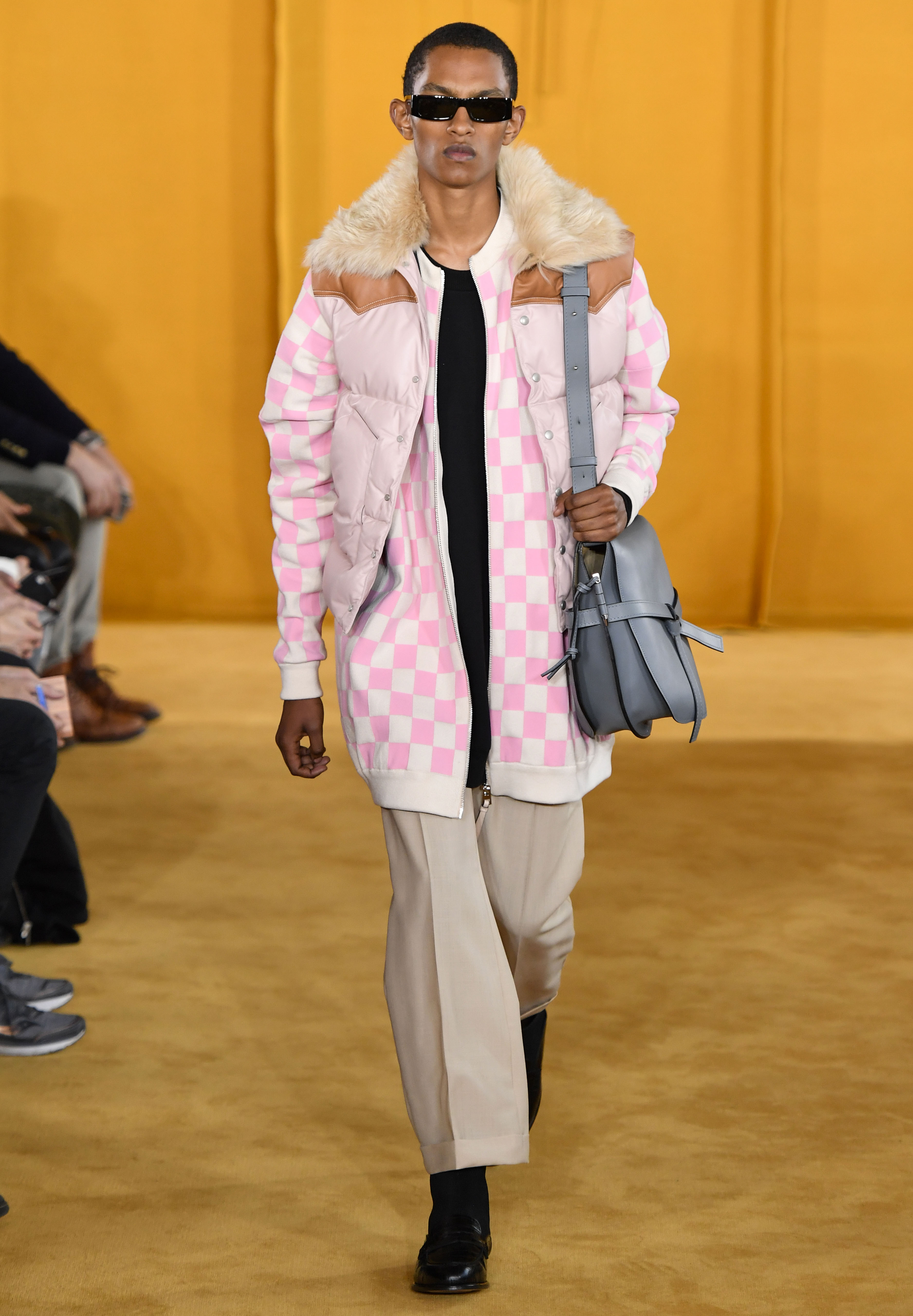 In conversation with the Fall Winter 2019-20 Men’s collection, the work suggests hybrid abstraction at a human scale, where both a garment’s utility and its connotation are called into question. By re-thinking fabrication and scale, LOEWE craftmanship materialises in unexpected ways – uniting incongruous ideals of masculinity where the worlds of sartorial tradition and team sports collide. In shearling and camel cashmere, outerwear pieces elevate the everyday. Trompe l’oeil arrives in tufted shearling and stamped croc, culminating in plush pastel leather quilting or a greatcoat fashioned from fringed cashmere scarves. Above unzipped calfskin waders, distended jerseys and tunics recall trail blankets and rugby stripes. Long knits collect relics: beads like pebbles, and naïve life drawings, whilst bound thread work cardigans evoke raw process. Like Walther’s peeling forms, hyper-extended shirt sleeves peek from beneath the new LOEWE tuxedo – a nipped 2-button suit with asymmetric lapels.