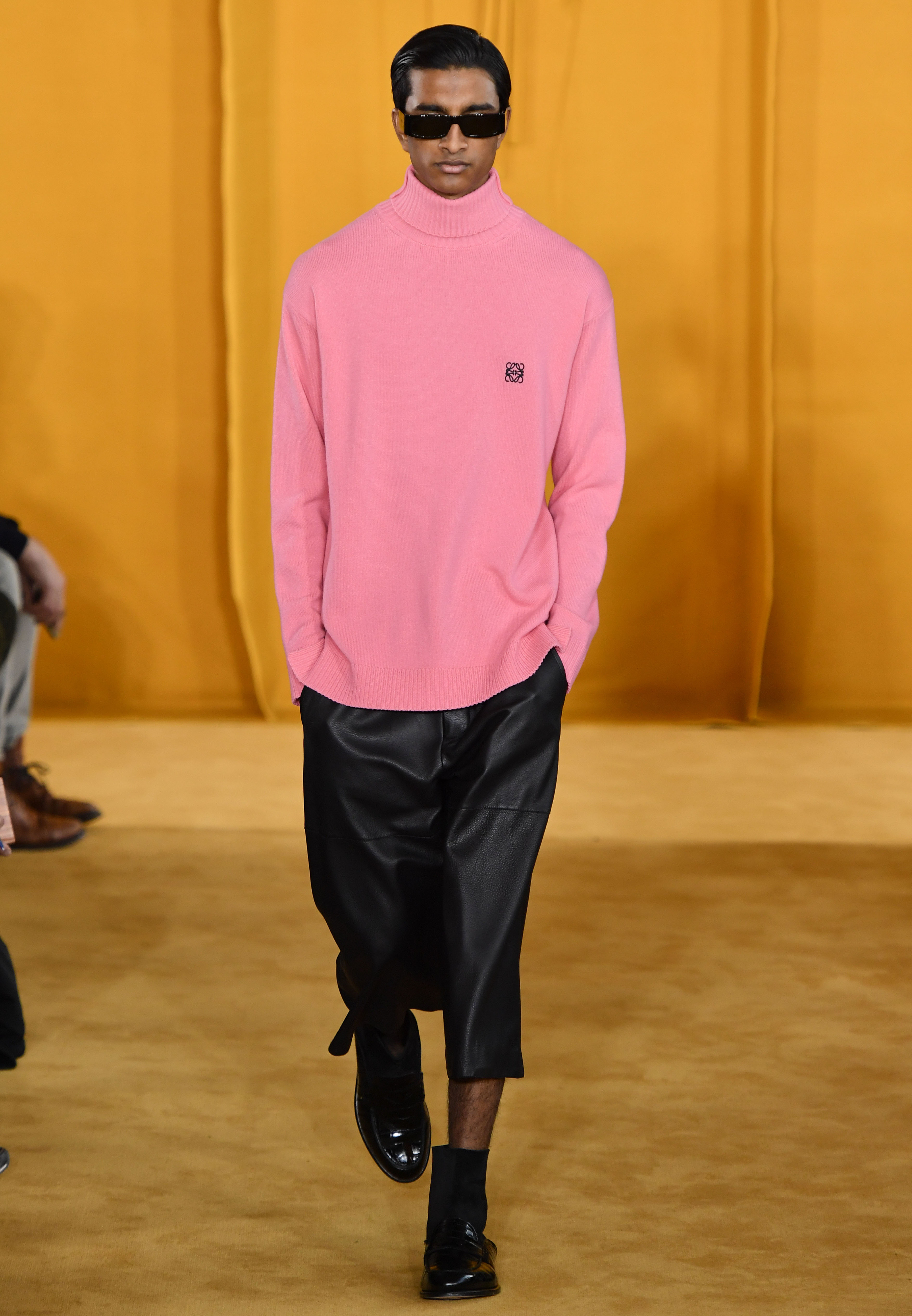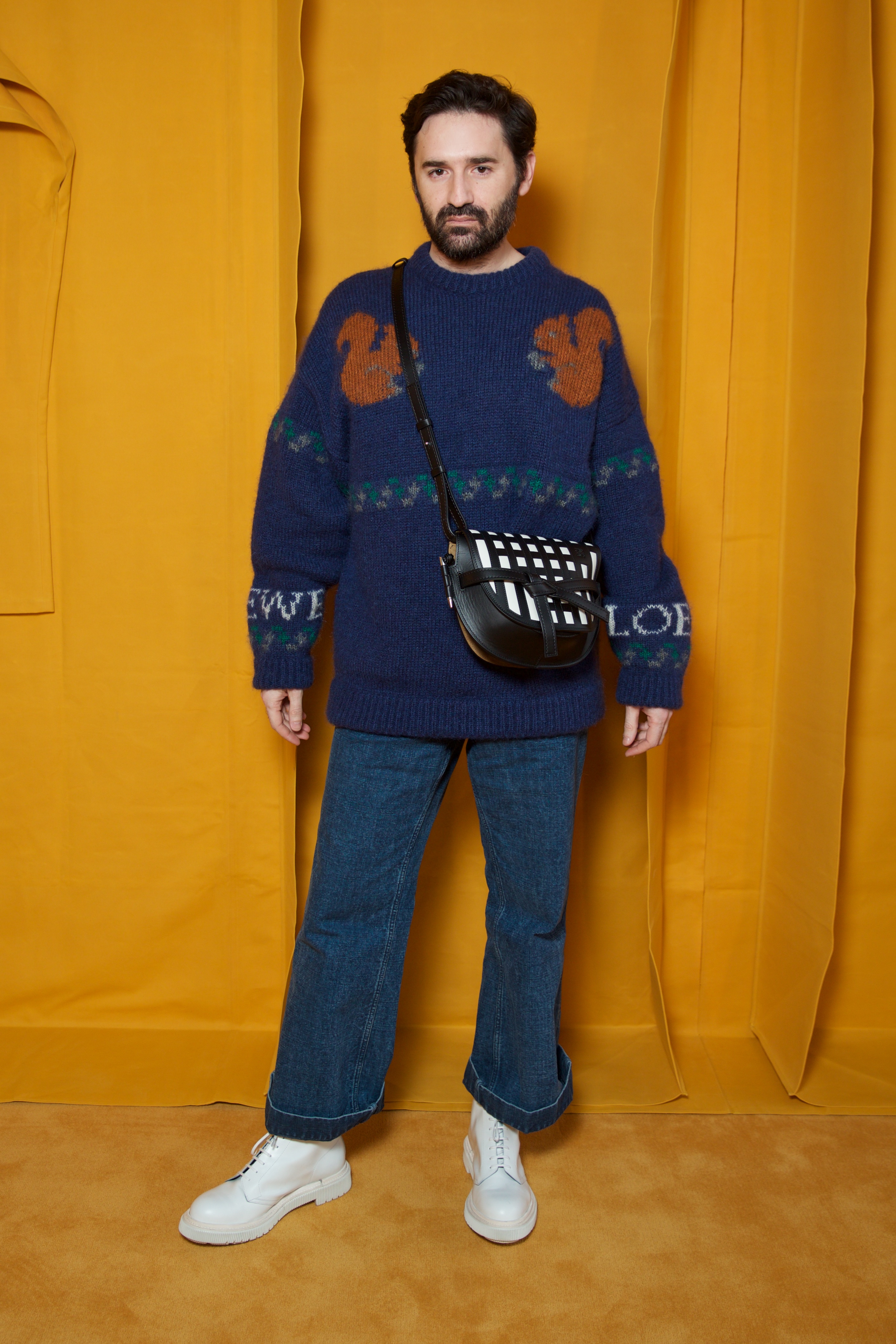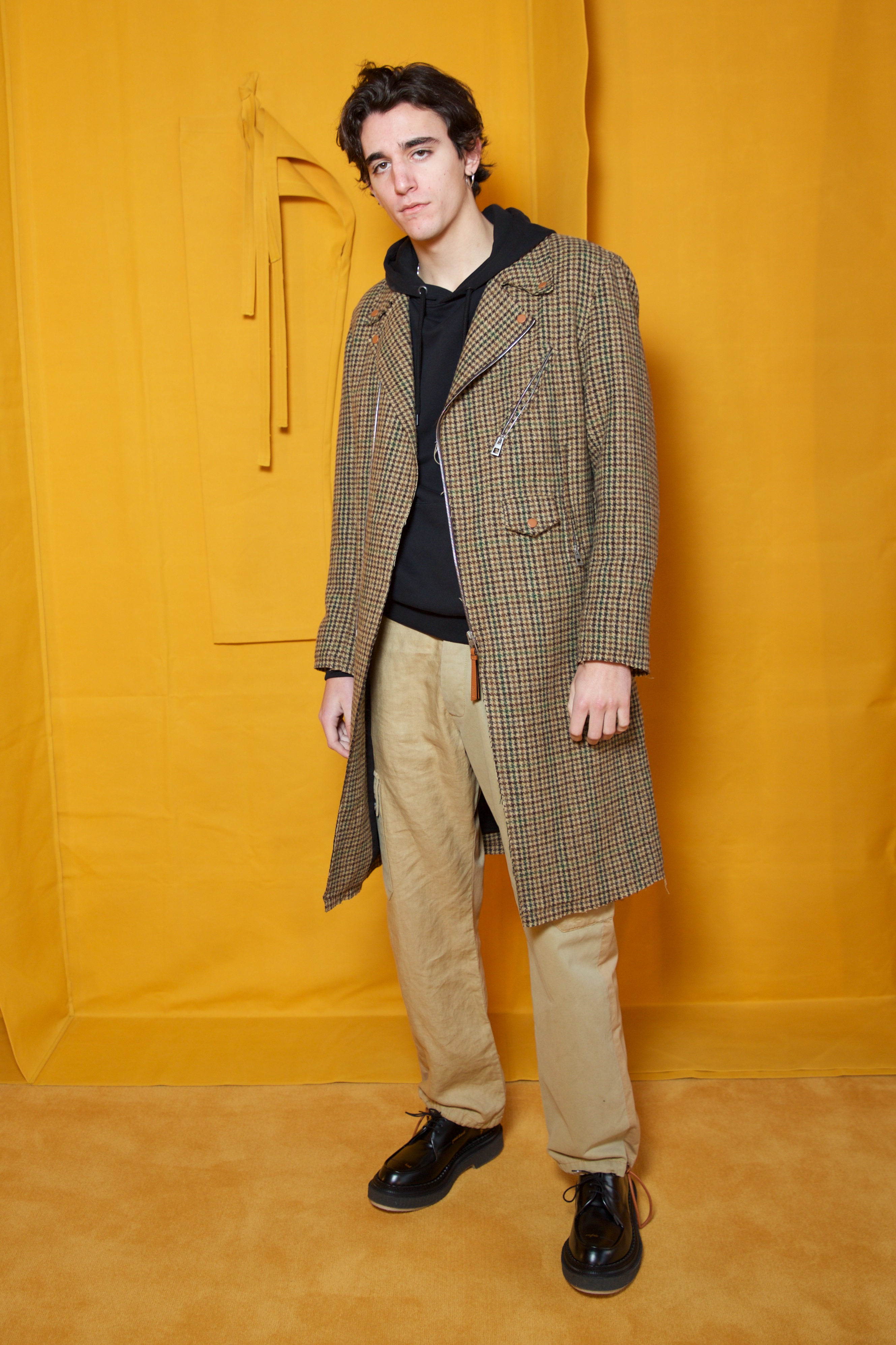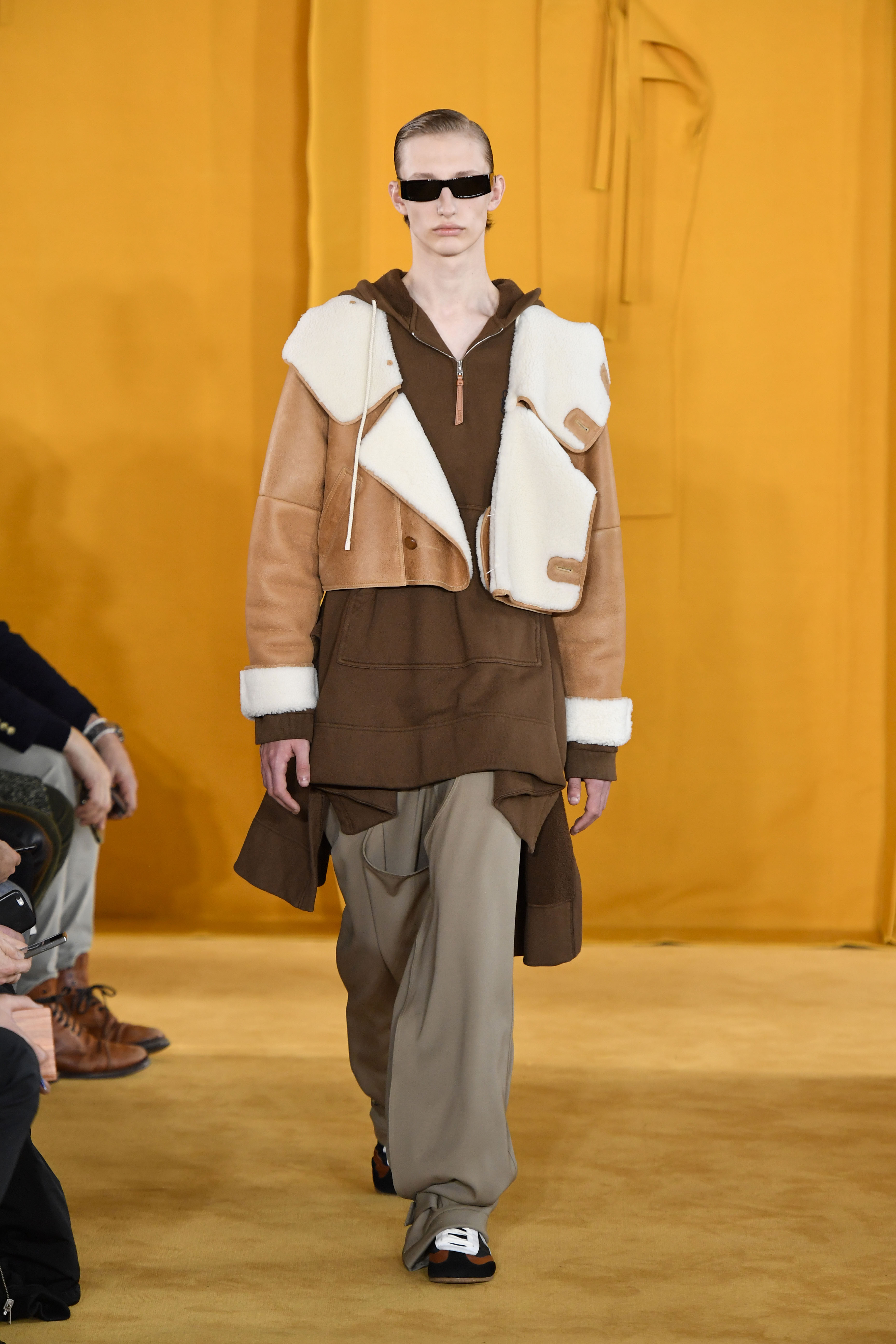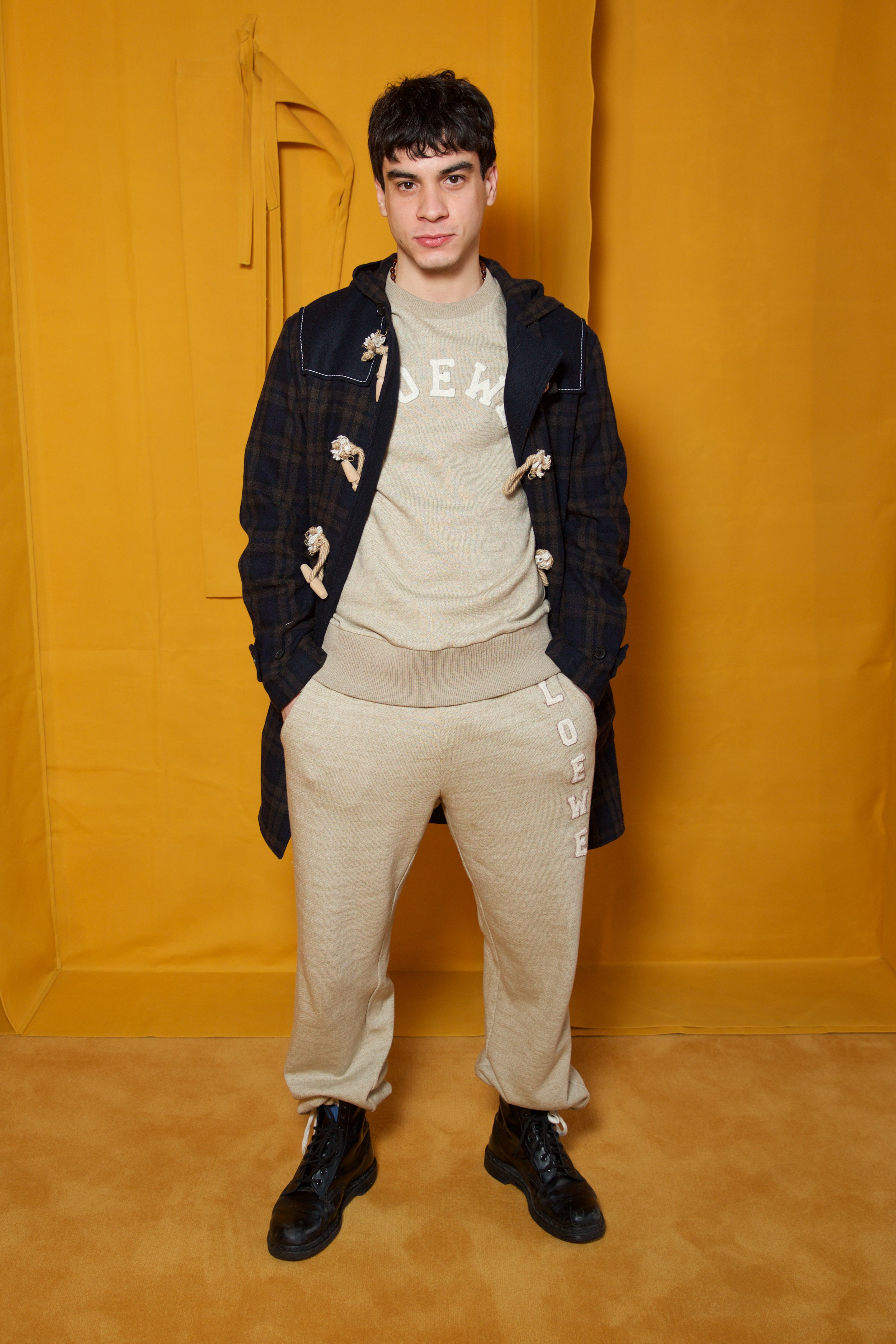 In conversation with the Fall Winter 2019-20 Men’s collection, the work suggests hybrid abstraction at a human scale, where both a garment’s utility and its connotation are called into question. By re-thinking fabrication and scale, LOEWE craftmanship materialises in unexpected ways – uniting incongruous ideals of masculinity where the worlds of sartorial tradition and team sports collide. In shearling and camel cashmere, outerwear pieces elevate the everyday. Trompe l’oeil arrives in tufted shearling and stamped croc, culminating in plush pastel leather quilting or a greatcoat fashioned from fringed cashmere scarves. Above unzipped calfskin waders, distended jerseys and tunics recall trail blankets and rugby stripes. Long knits collect relics: beads like pebbles, and naïve life drawings, whilst bound thread work cardigans evoke raw process. Like Walther’s peeling forms, hyper-extended shirt sleeves peek from beneath the new LOEWE tuxedo – a nipped 2-button suit with asymmetric lapels.