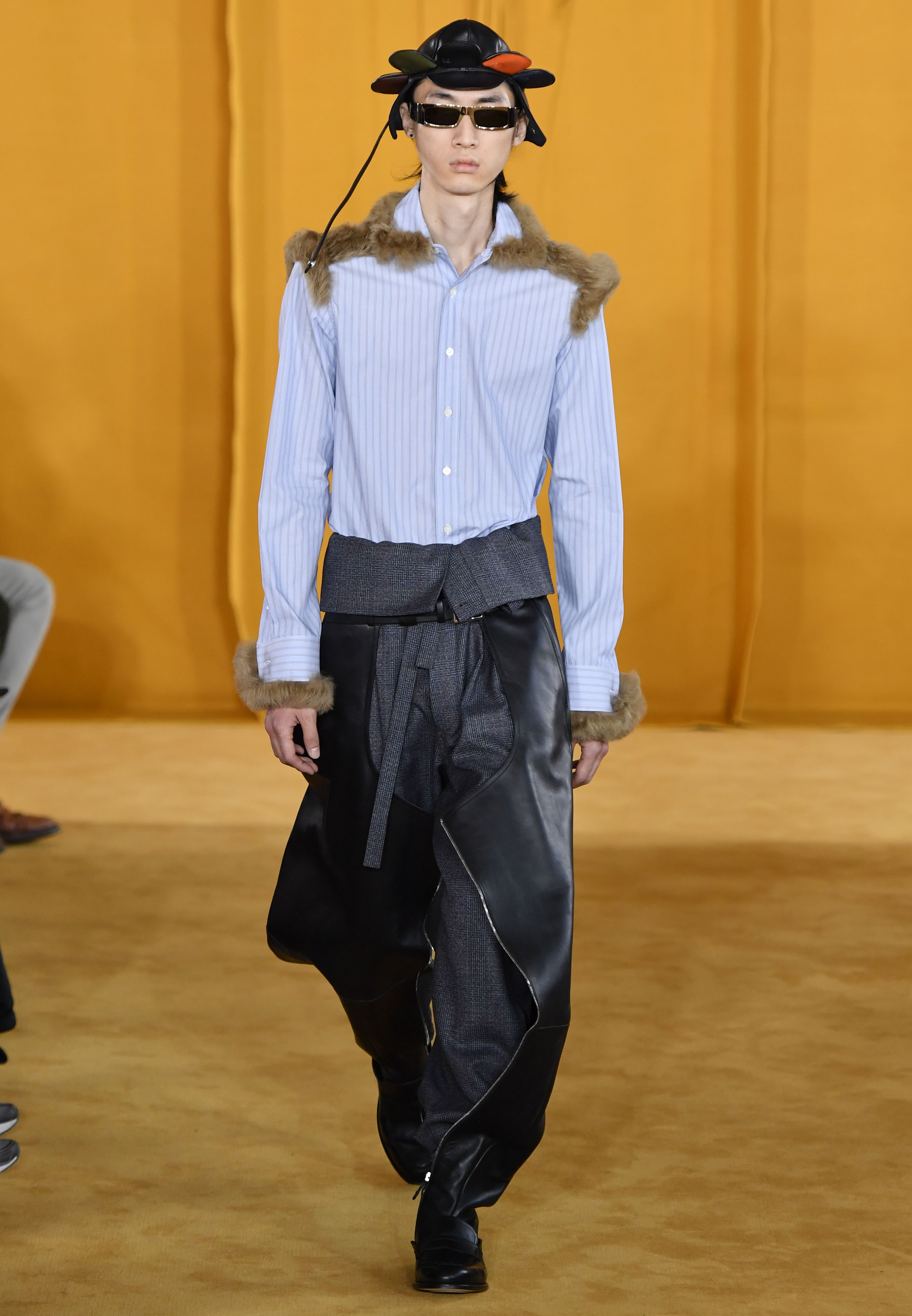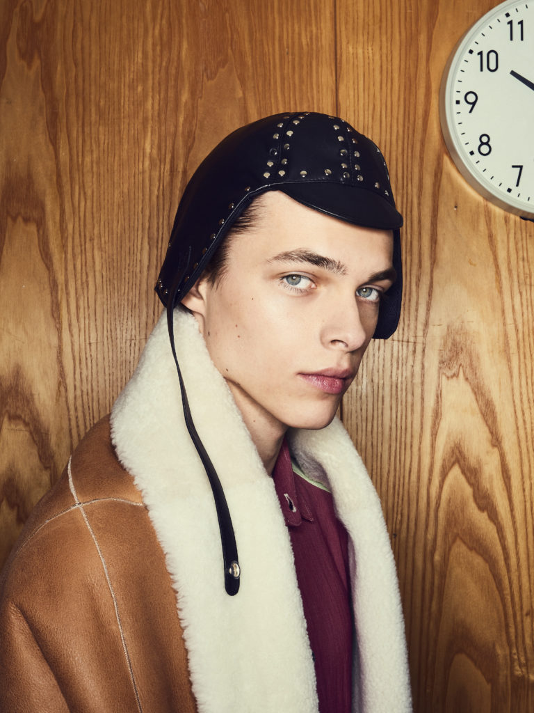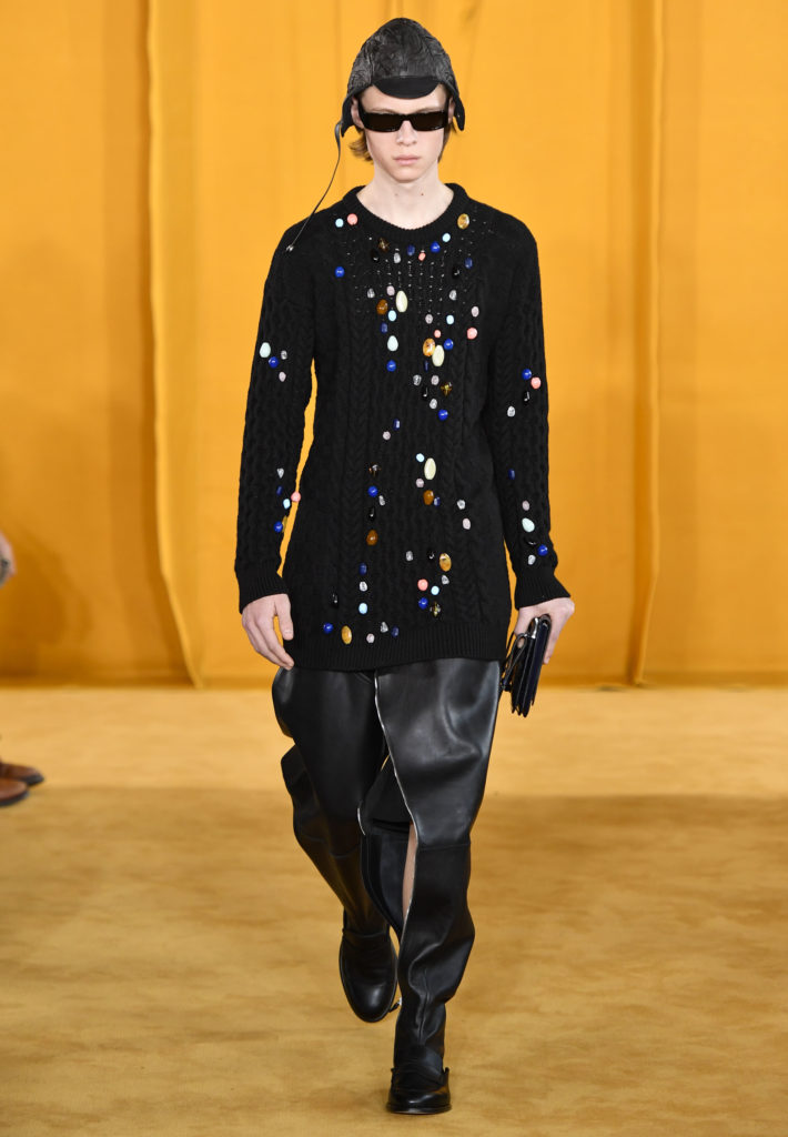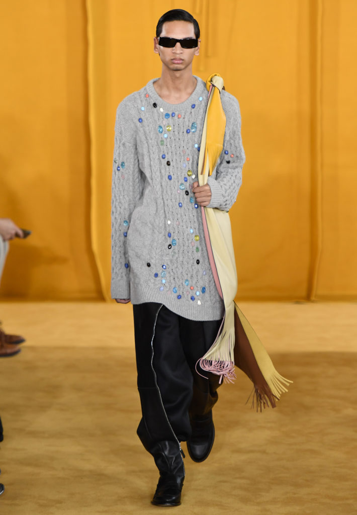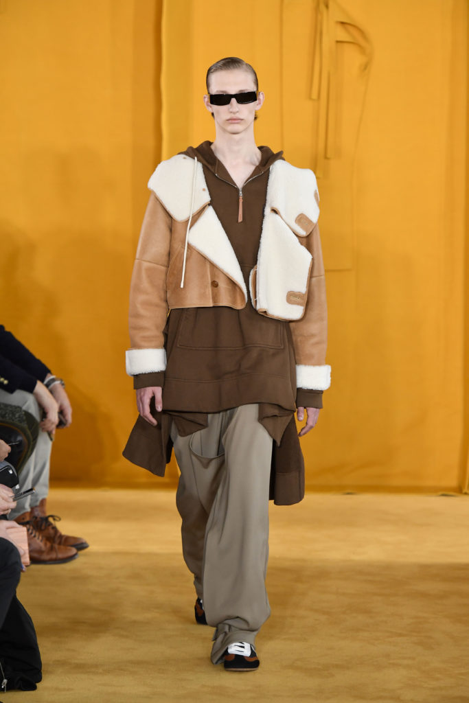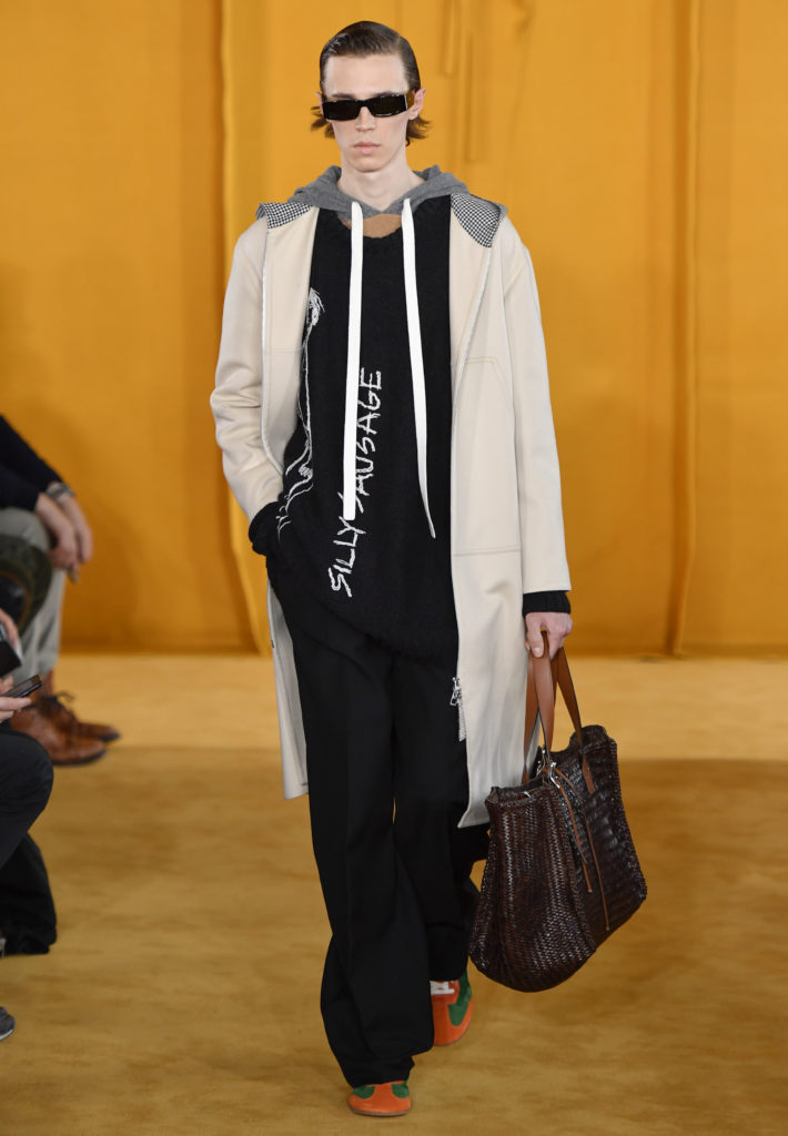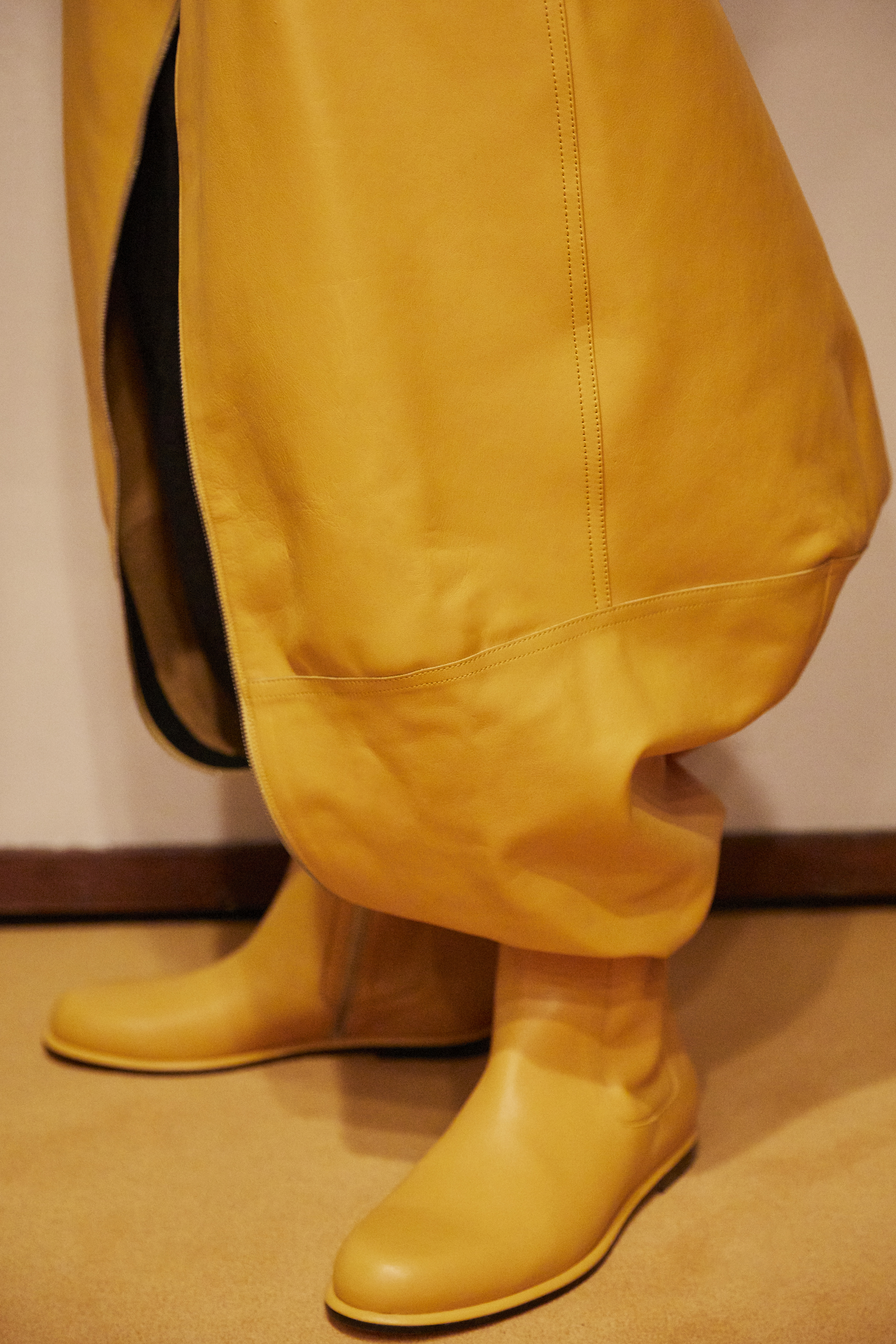 In conversation with the Fall Winter 2019-20 Men’s collection, the work suggests hybrid abstraction at a human scale, where both a garment’s utility and its connotation are called into question. By re-thinking fabrication and scale, LOEWE craftmanship materialises in unexpected ways – uniting incongruous ideals of masculinity where the worlds of sartorial tradition and team sports collide. In shearling and camel cashmere, outerwear pieces elevate the everyday. Trompe l’oeil arrives in tufted shearling and stamped croc, culminating in plush pastel leather quilting or a greatcoat fashioned from fringed cashmere scarves. Above unzipped calfskin waders, distended jerseys and tunics recall trail blankets and rugby stripes. Long knits collect relics: beads like pebbles, and naïve life drawings, whilst bound thread work cardigans evoke raw process. Like Walther’s peeling forms, hyper-extended shirt sleeves peek from beneath the new LOEWE tuxedo – a nipped 2-button suit with asymmetric lapels.