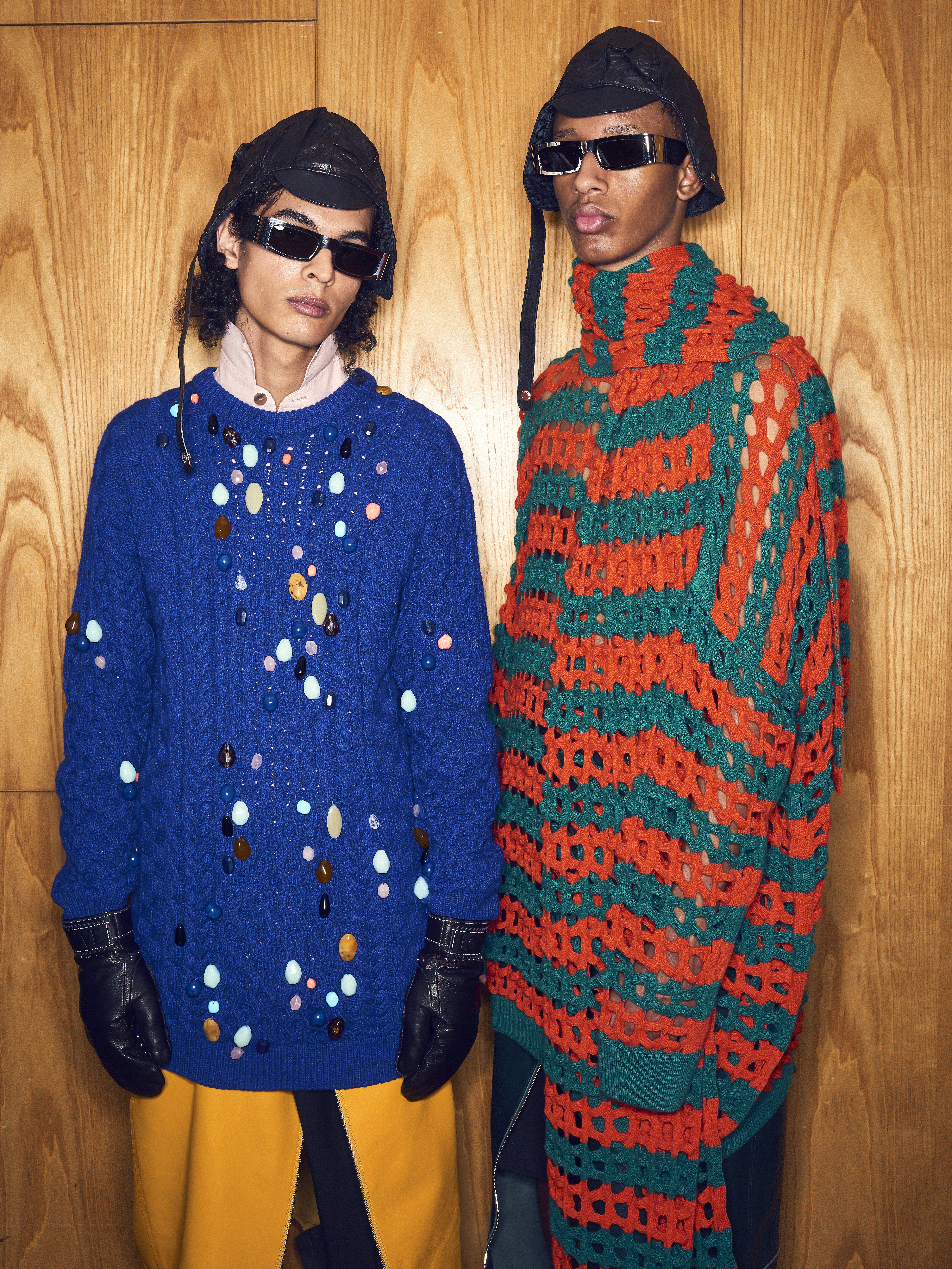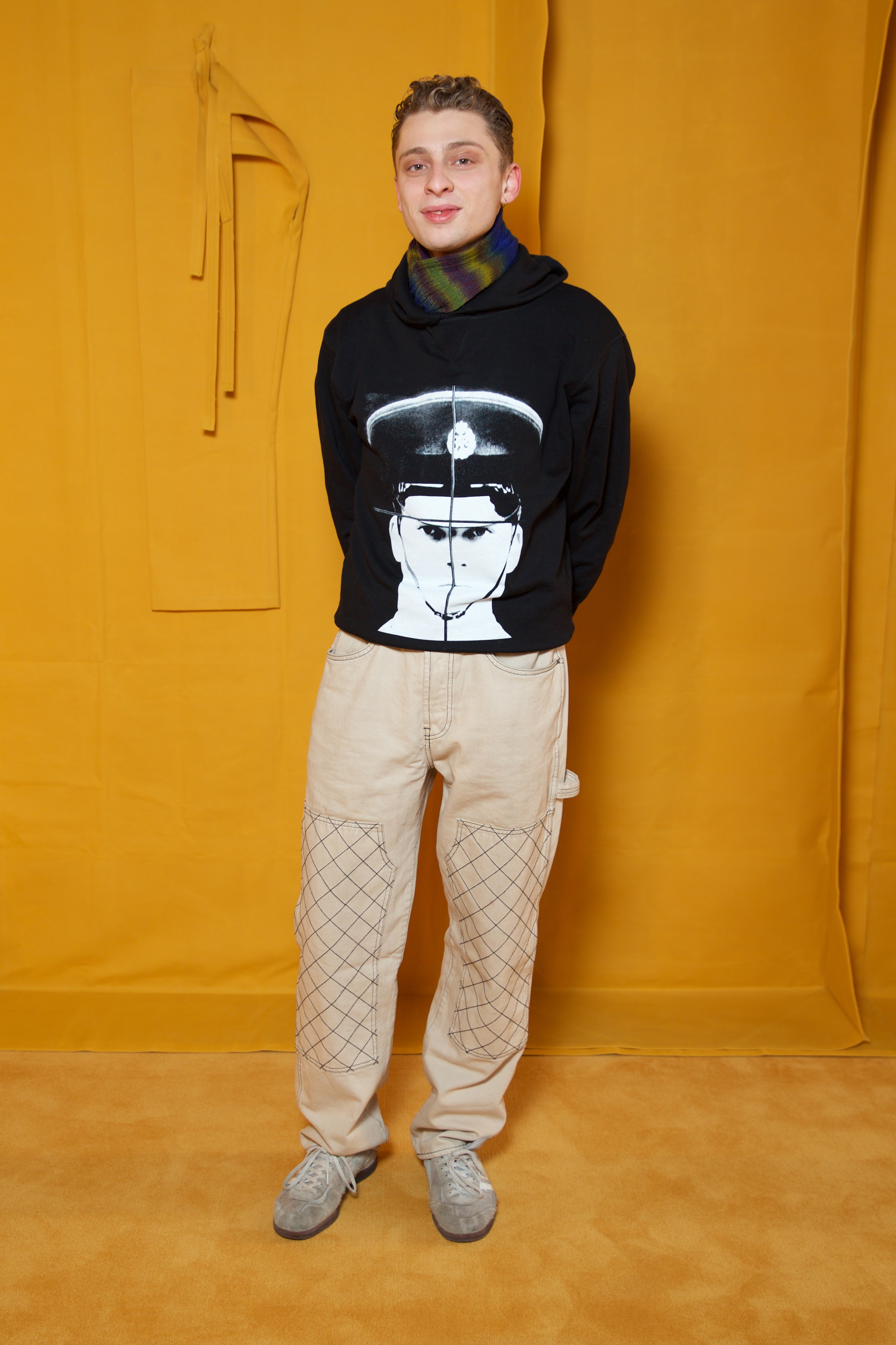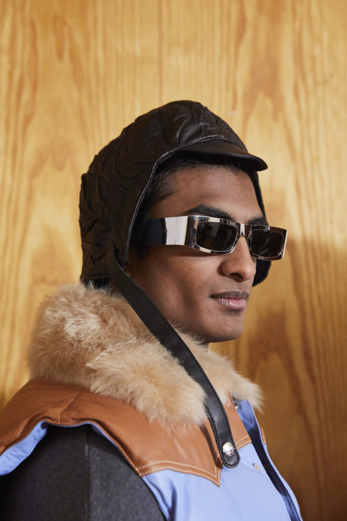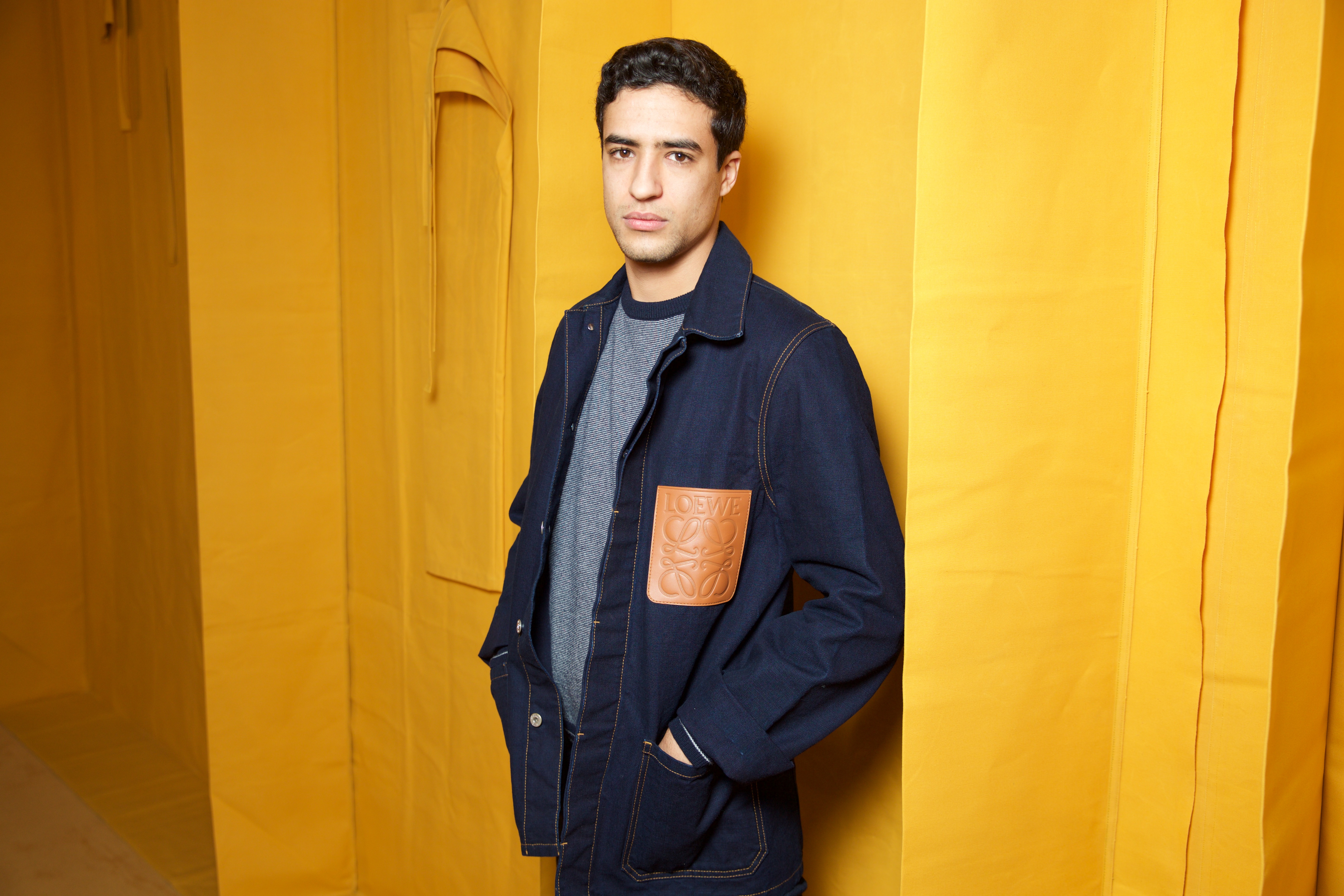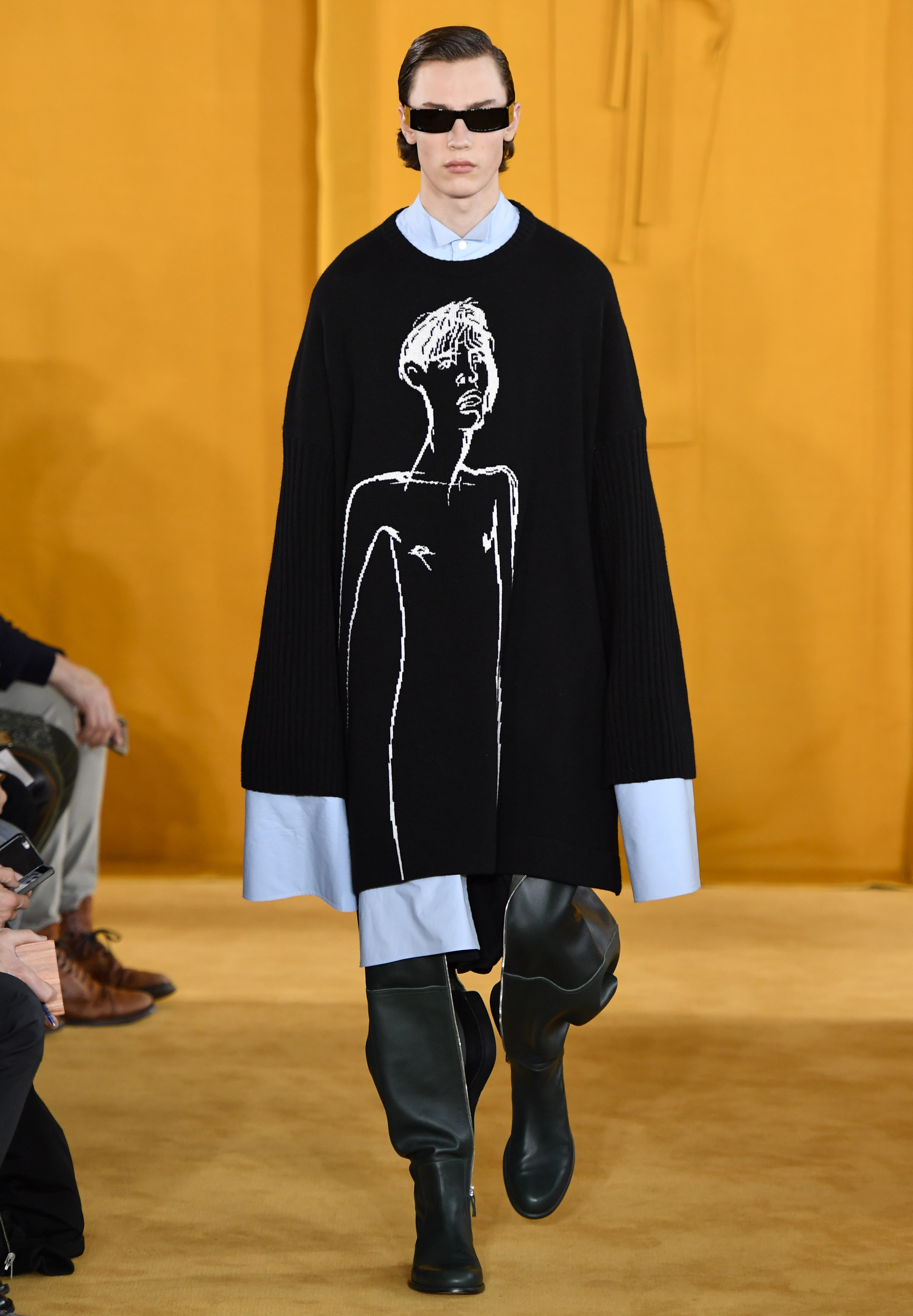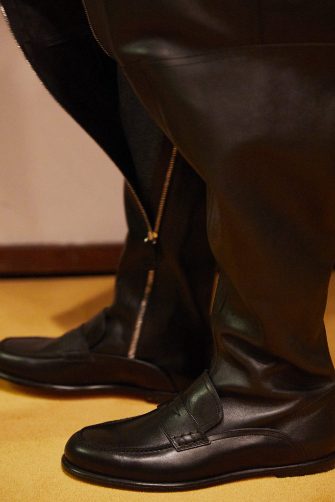 In conversation with the Fall Winter 2019-20 Men’s collection, the work suggests hybrid abstraction at a human scale, where both a garment’s utility and its connotation are called into question. By re-thinking fabrication and scale, LOEWE craftmanship materialises in unexpected ways – uniting incongruous ideals of masculinity where the worlds of sartorial tradition and team sports collide. In shearling and camel cashmere, outerwear pieces elevate the everyday. Trompe l’oeil arrives in tufted shearling and stamped croc, culminating in plush pastel leather quilting or a greatcoat fashioned from fringed cashmere scarves. Above unzipped calfskin waders, distended jerseys and tunics recall trail blankets and rugby stripes. Long knits collect relics: beads like pebbles, and naïve life drawings, whilst bound thread work cardigans evoke raw process. Like Walther’s peeling forms, hyper-extended shirt sleeves peek from beneath the new LOEWE tuxedo – a nipped 2-button suit with asymmetric lapels.