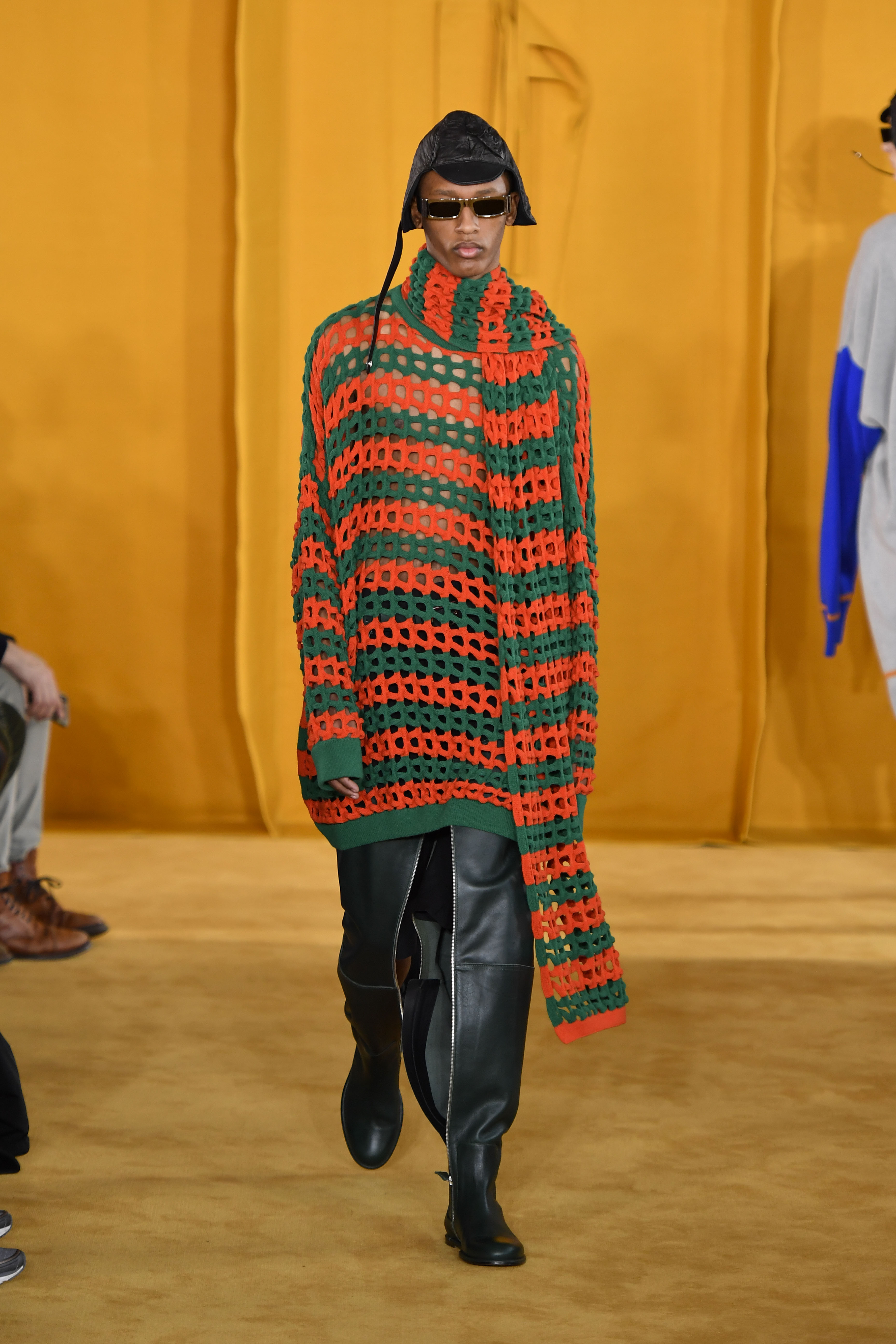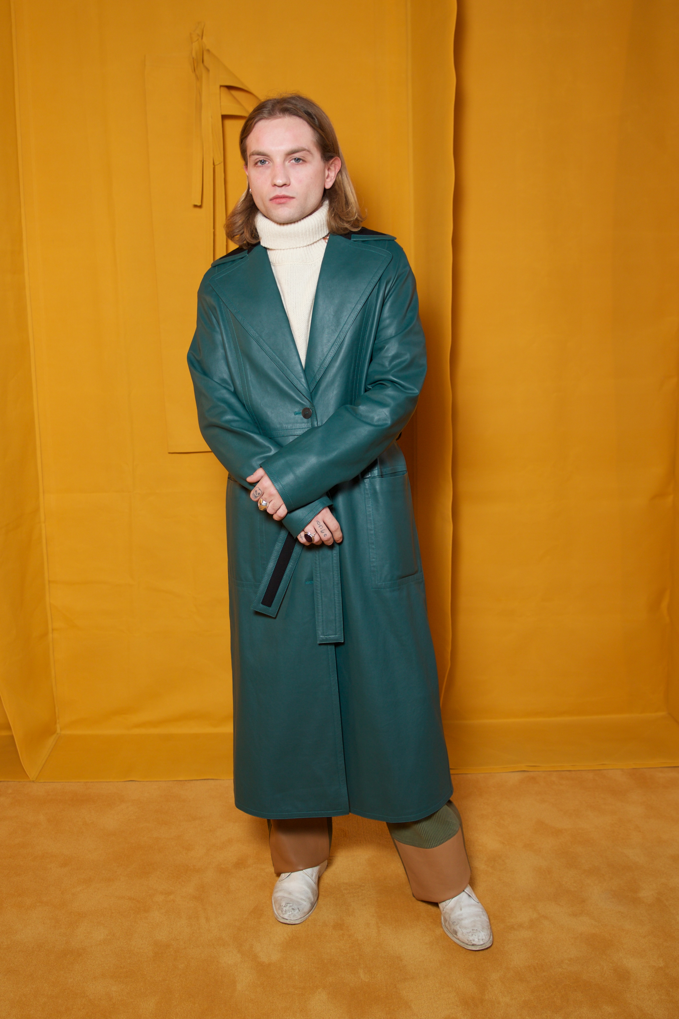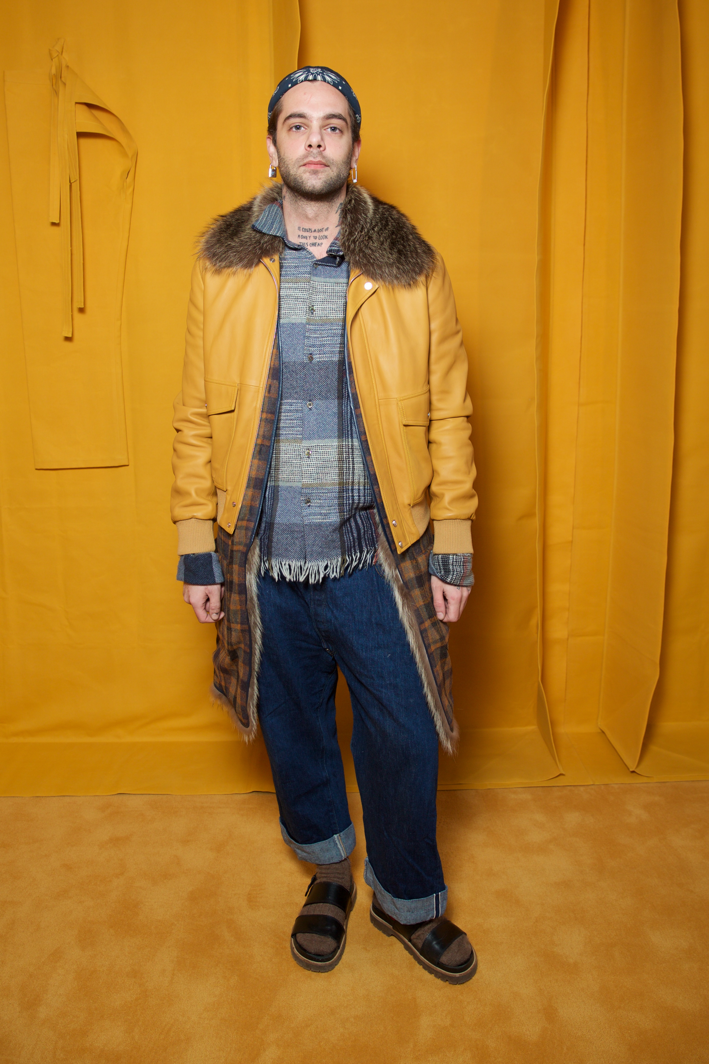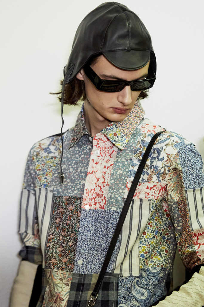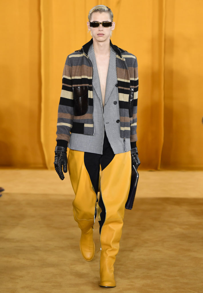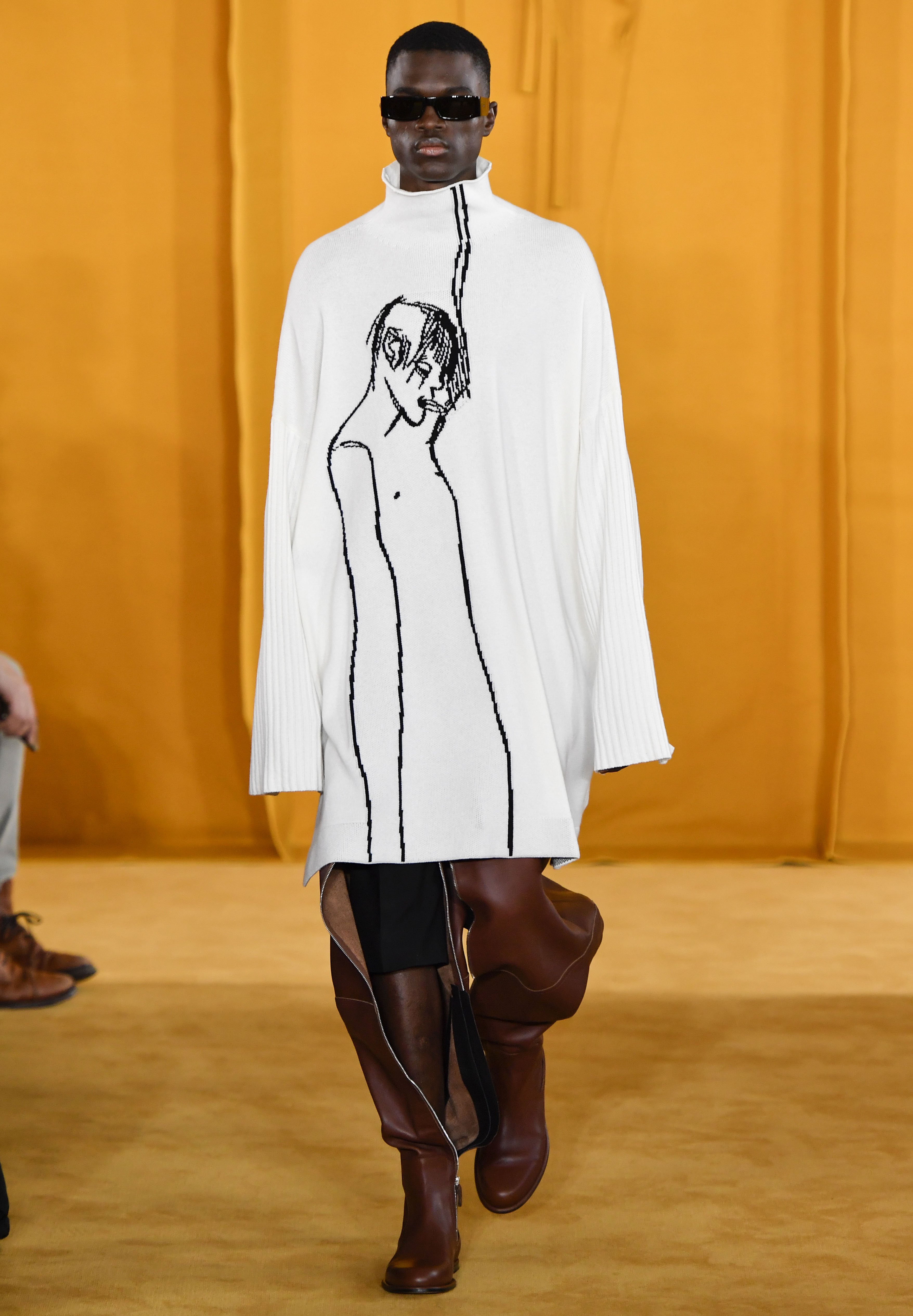 In conversation with the Fall Winter 2019-20 Men’s collection, the work suggests hybrid abstraction at a human scale, where both a garment’s utility and its connotation are called into question. By re-thinking fabrication and scale, LOEWE craftmanship materialises in unexpected ways – uniting incongruous ideals of masculinity where the worlds of sartorial tradition and team sports collide. In shearling and camel cashmere, outerwear pieces elevate the everyday. Trompe l’oeil arrives in tufted shearling and stamped croc, culminating in plush pastel leather quilting or a greatcoat fashioned from fringed cashmere scarves. Above unzipped calfskin waders, distended jerseys and tunics recall trail blankets and rugby stripes. Long knits collect relics: beads like pebbles, and naïve life drawings, whilst bound thread work cardigans evoke raw process. Like Walther’s peeling forms, hyper-extended shirt sleeves peek from beneath the new LOEWE tuxedo – a nipped 2-button suit with asymmetric lapels.