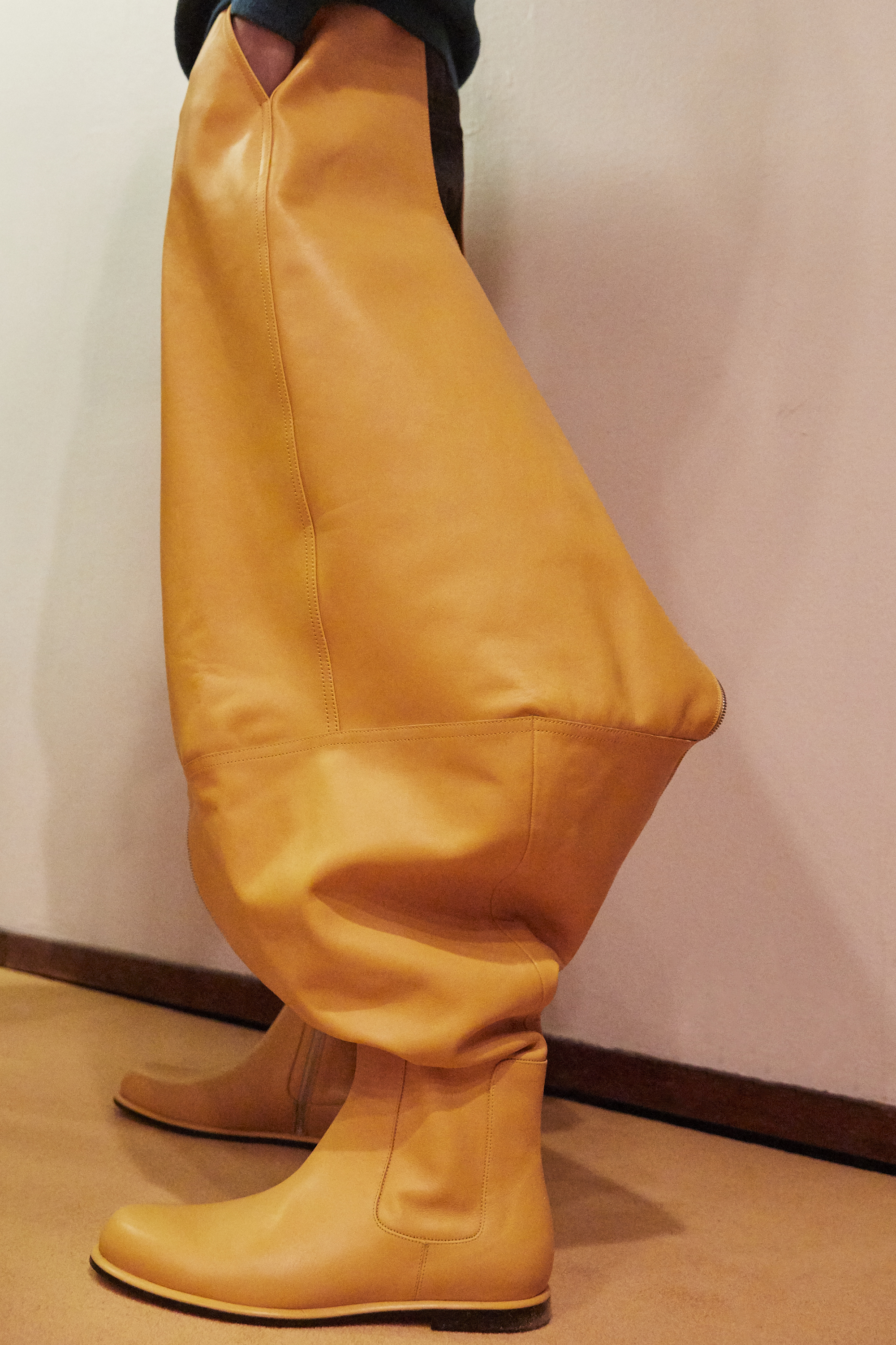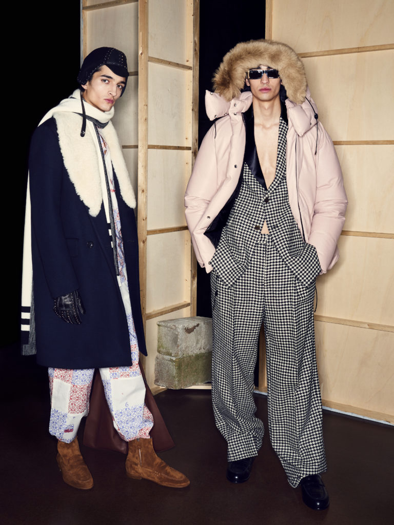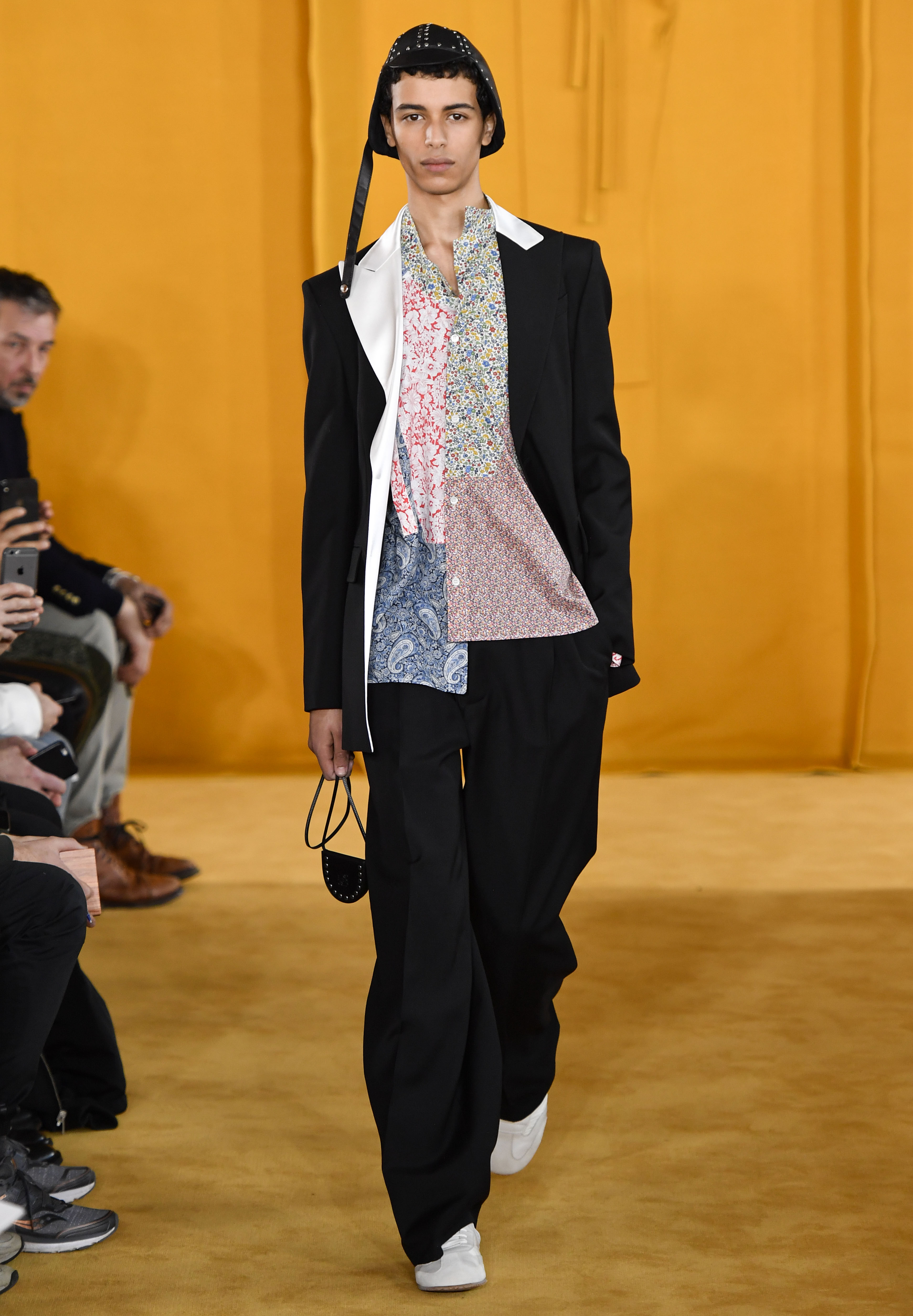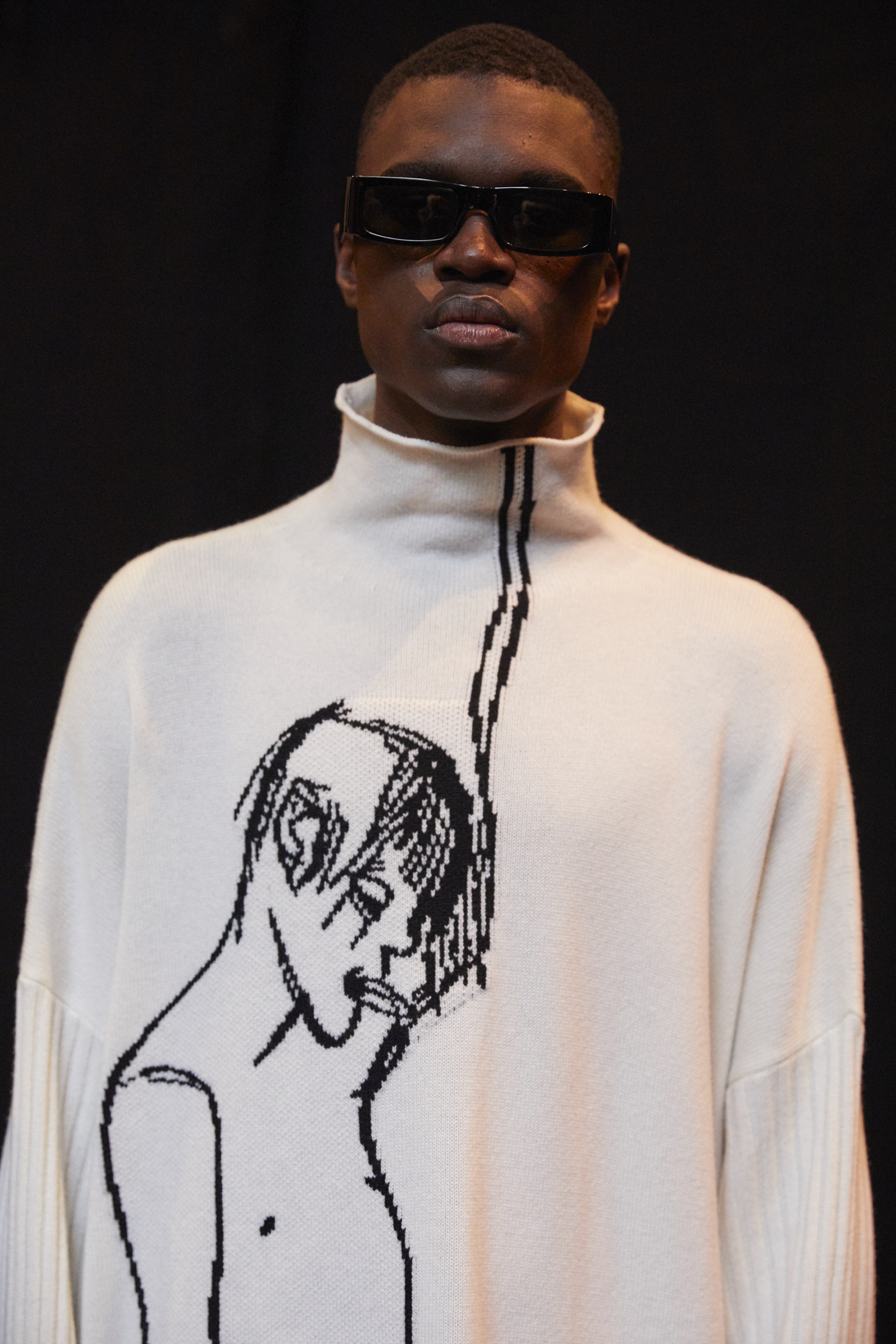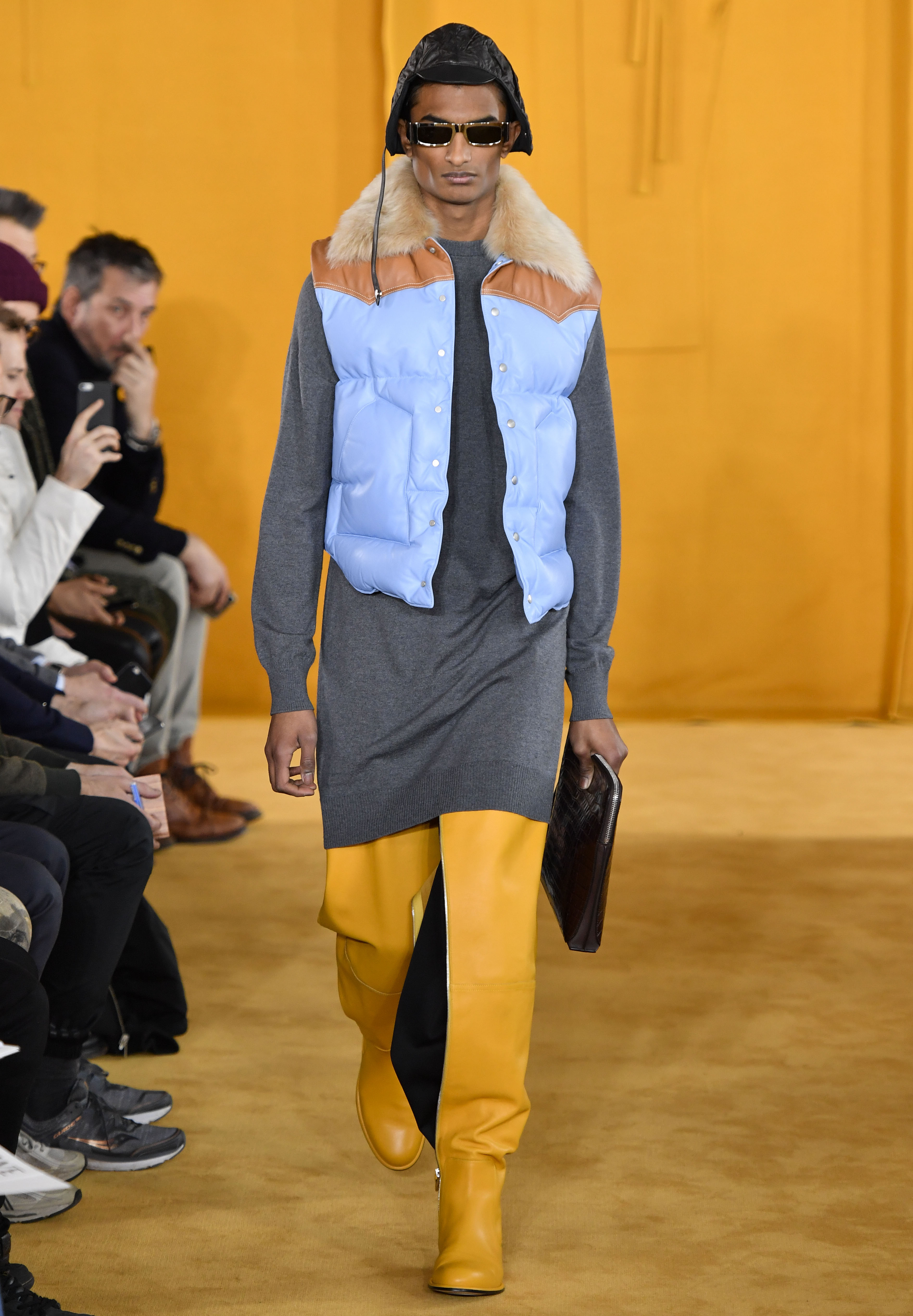 In conversation with the Fall Winter 2019-20 Men’s collection, the work suggests hybrid abstraction at a human scale, where both a garment’s utility and its connotation are called into question. By re-thinking fabrication and scale, LOEWE craftmanship materialises in unexpected ways – uniting incongruous ideals of masculinity where the worlds of sartorial tradition and team sports collide. In shearling and camel cashmere, outerwear pieces elevate the everyday. Trompe l’oeil arrives in tufted shearling and stamped croc, culminating in plush pastel leather quilting or a greatcoat fashioned from fringed cashmere scarves. Above unzipped calfskin waders, distended jerseys and tunics recall trail blankets and rugby stripes. Long knits collect relics: beads like pebbles, and naïve life drawings, whilst bound thread work cardigans evoke raw process. Like Walther’s peeling forms, hyper-extended shirt sleeves peek from beneath the new LOEWE tuxedo – a nipped 2-button suit with asymmetric lapels.