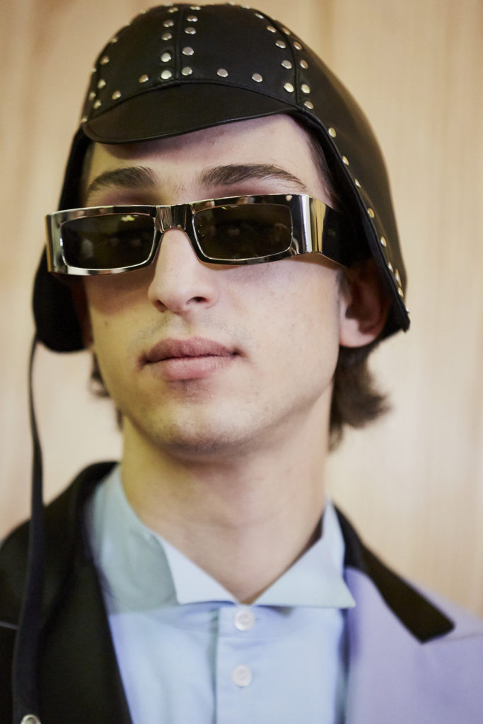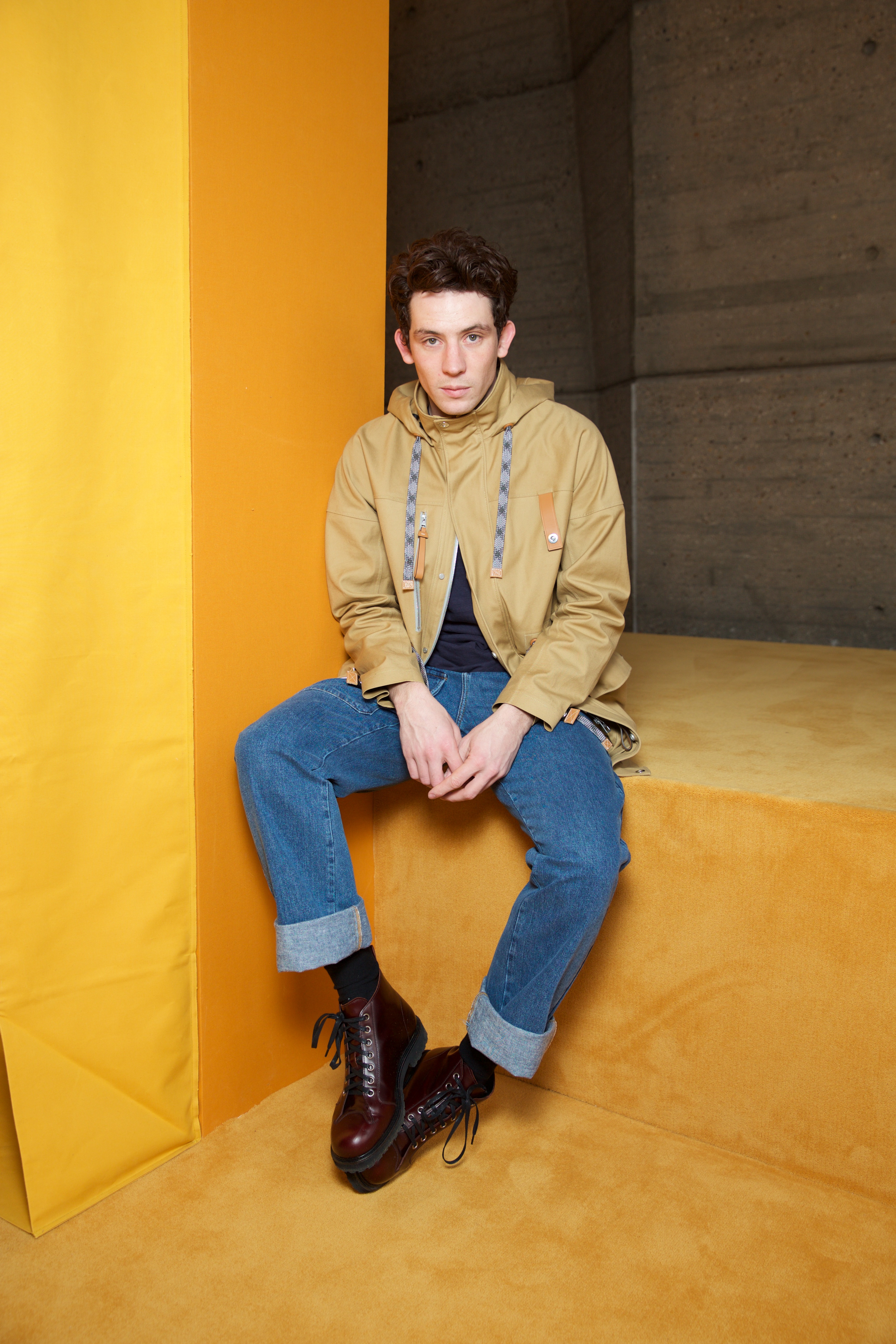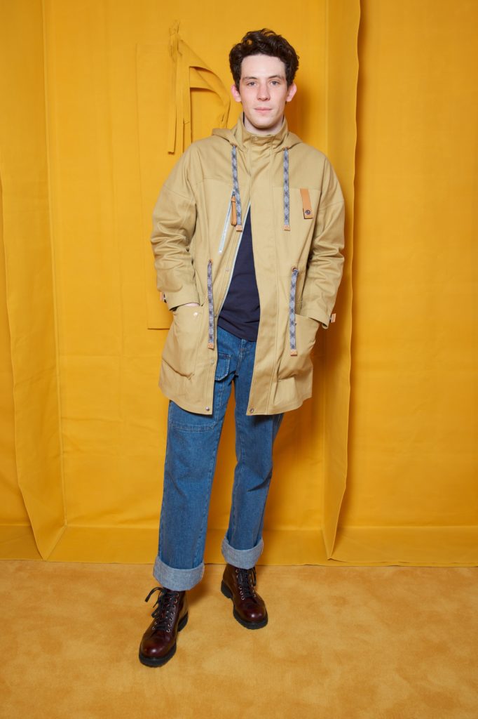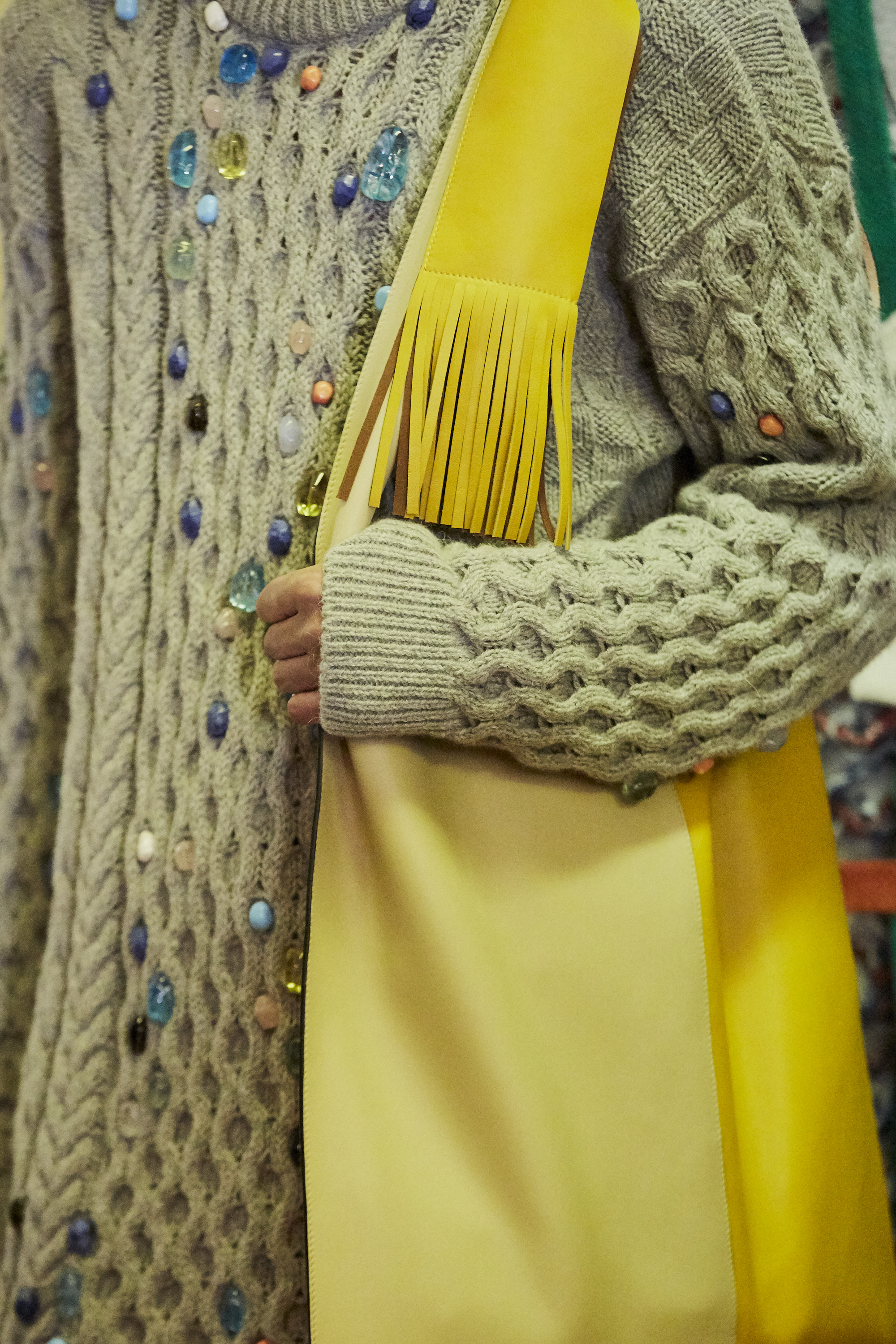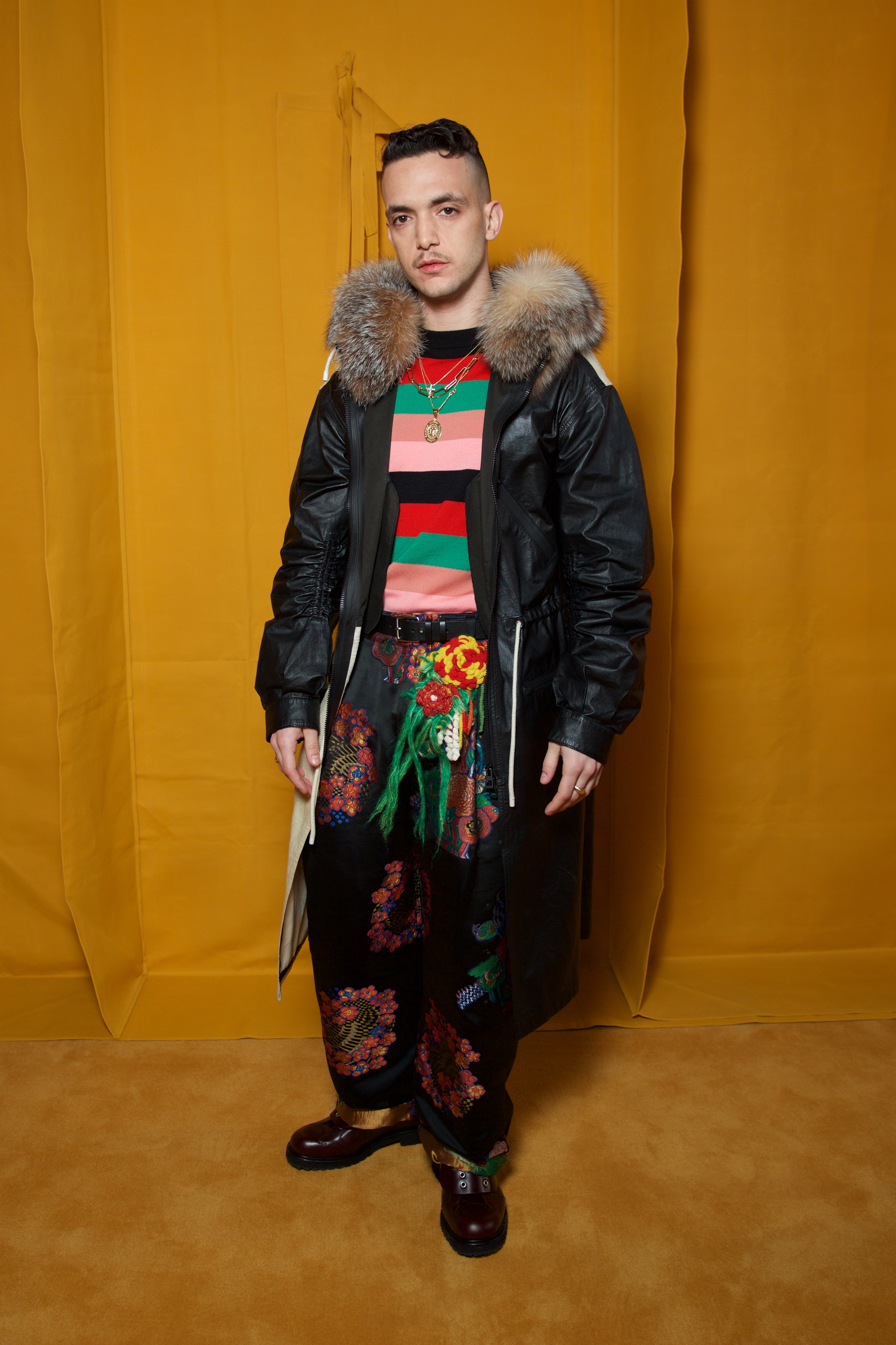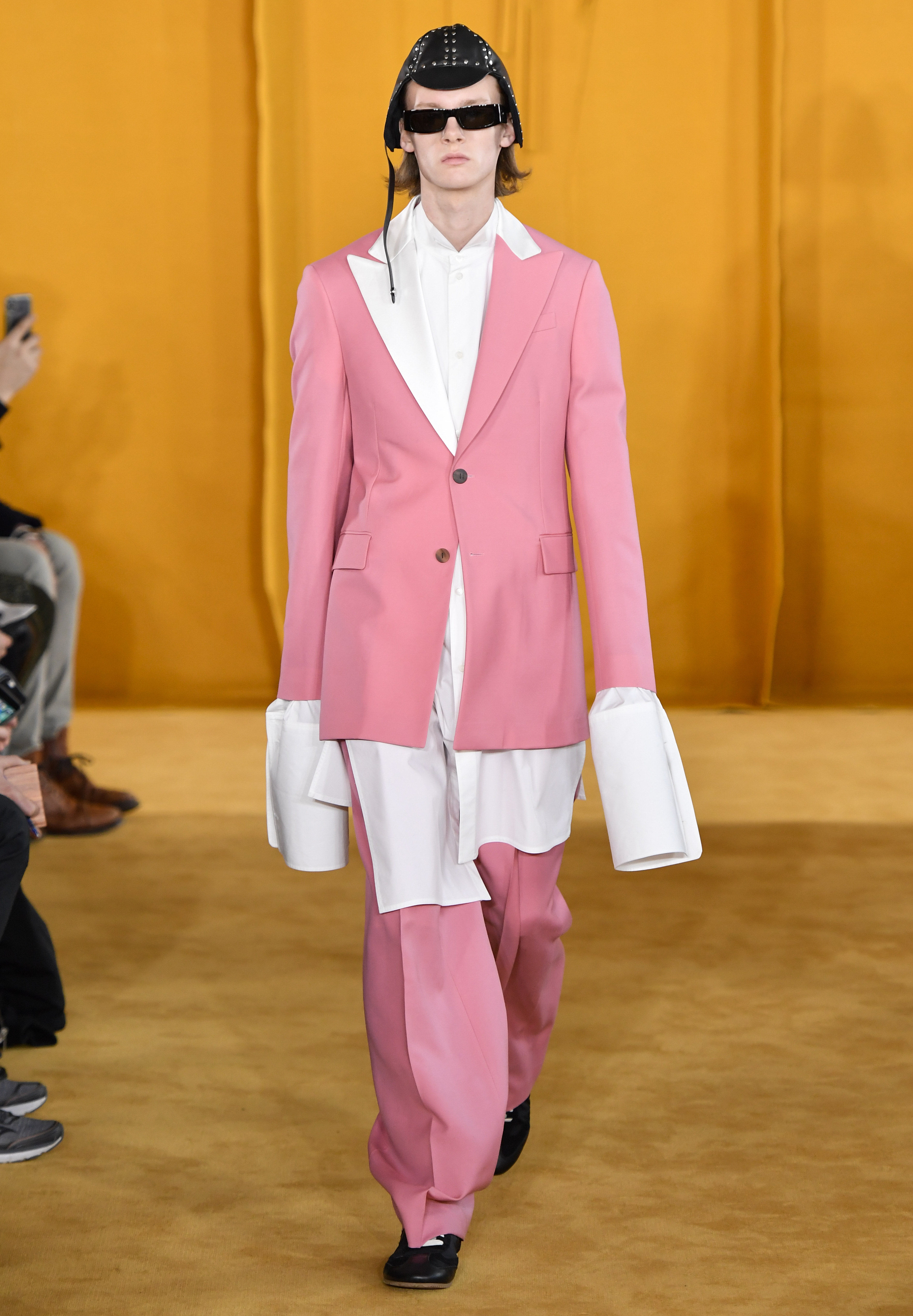 In conversation with the Fall Winter 2019-20 Men’s collection, the work suggests hybrid abstraction at a human scale, where both a garment’s utility and its connotation are called into question. By re-thinking fabrication and scale, LOEWE craftmanship materialises in unexpected ways – uniting incongruous ideals of masculinity where the worlds of sartorial tradition and team sports collide. In shearling and camel cashmere, outerwear pieces elevate the everyday. Trompe l’oeil arrives in tufted shearling and stamped croc, culminating in plush pastel leather quilting or a greatcoat fashioned from fringed cashmere scarves. Above unzipped calfskin waders, distended jerseys and tunics recall trail blankets and rugby stripes. Long knits collect relics: beads like pebbles, and naïve life drawings, whilst bound thread work cardigans evoke raw process. Like Walther’s peeling forms, hyper-extended shirt sleeves peek from beneath the new LOEWE tuxedo – a nipped 2-button suit with asymmetric lapels.