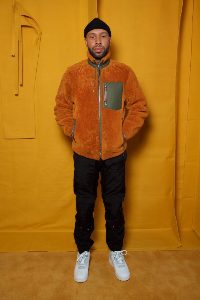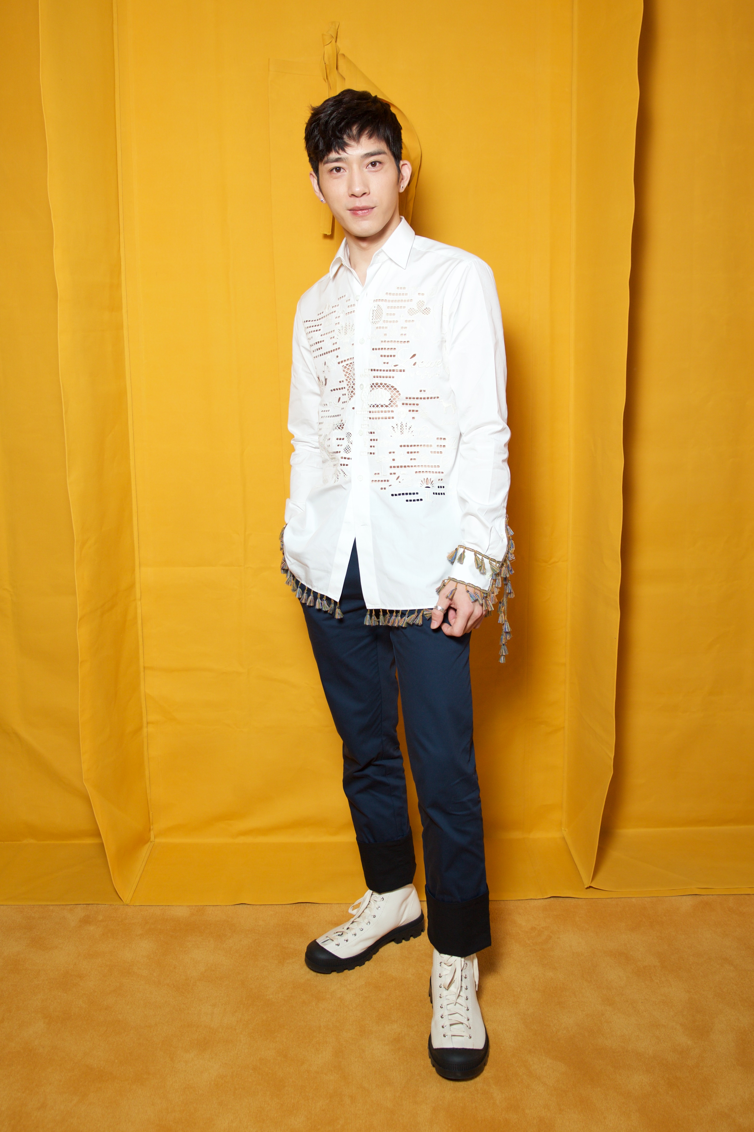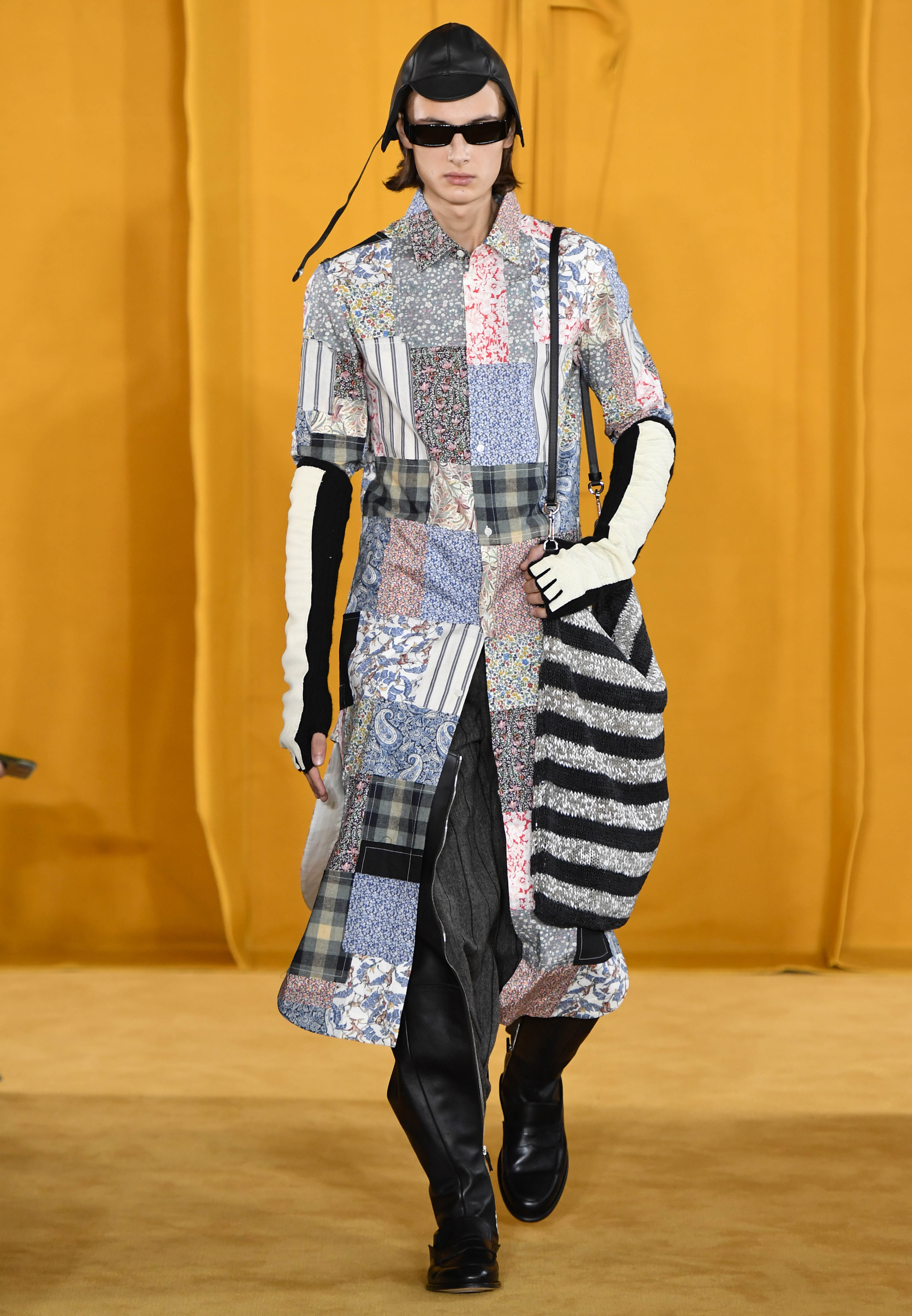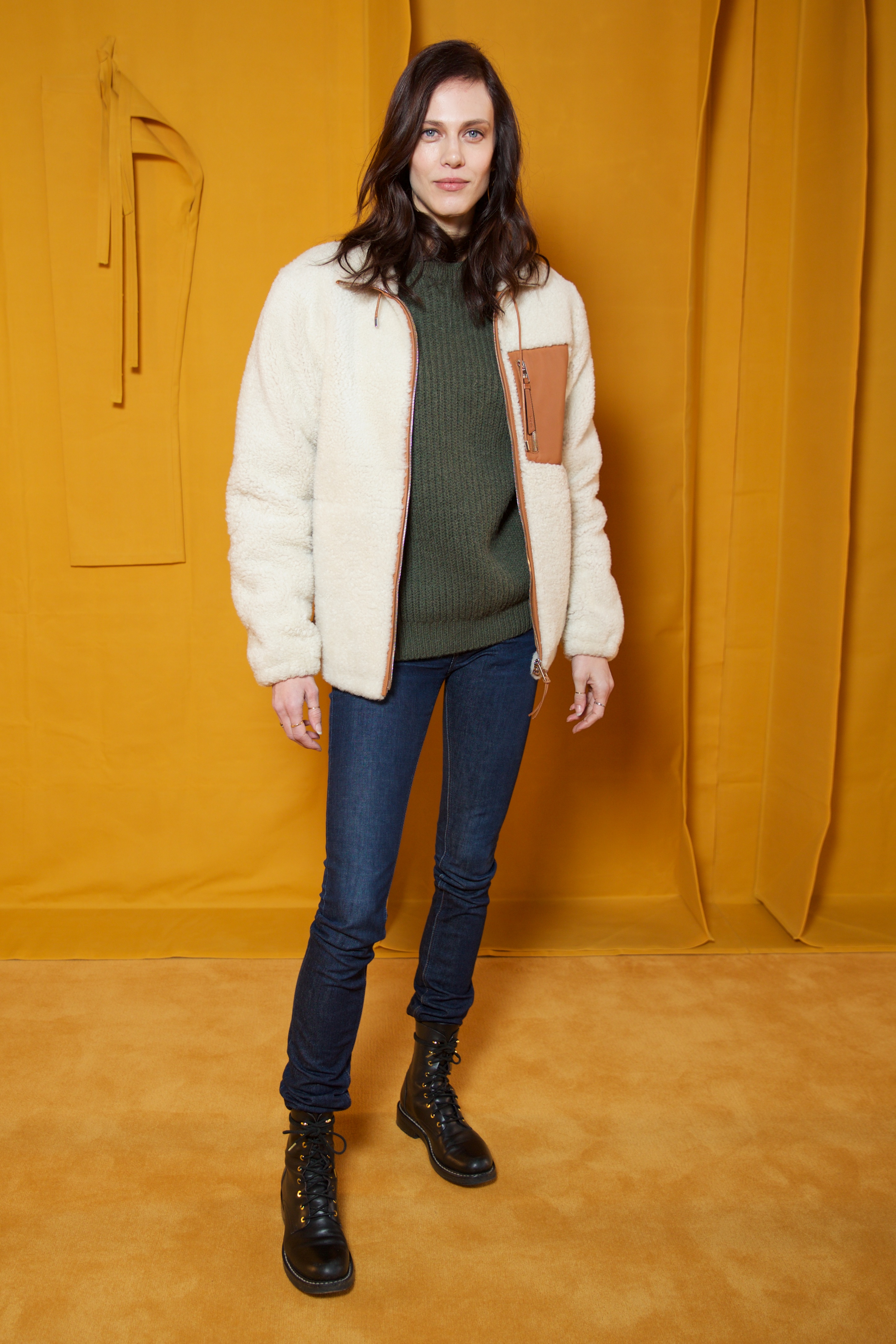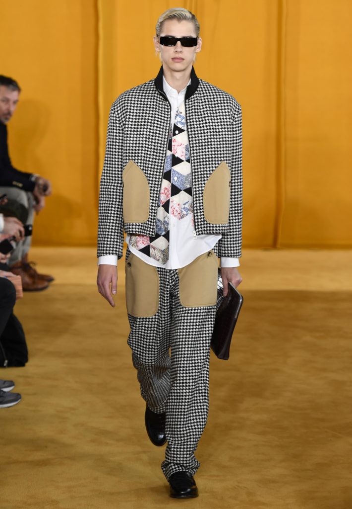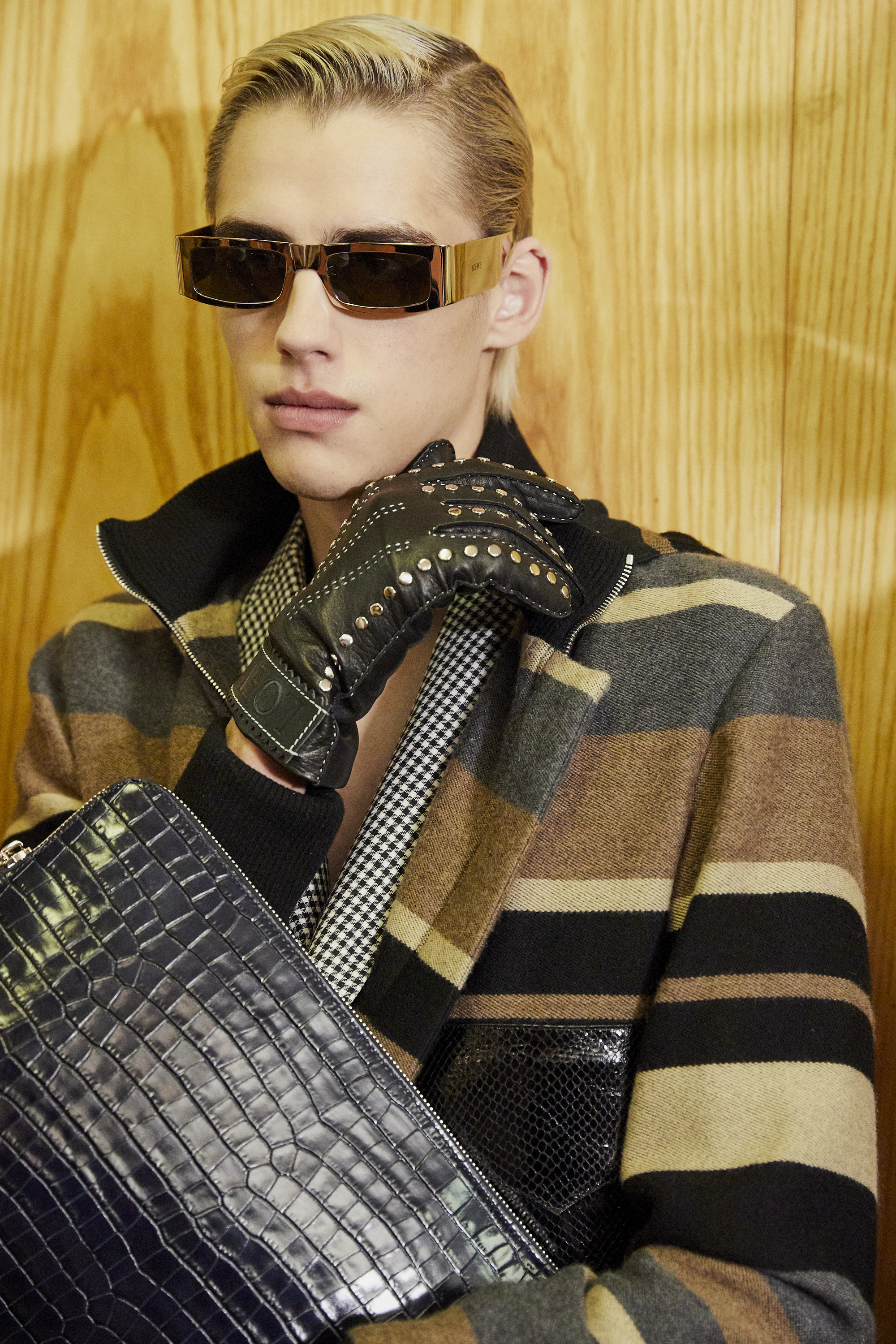 In conversation with the Fall Winter 2019-20 Men’s collection, the work suggests hybrid abstraction at a human scale, where both a garment’s utility and its connotation are called into question. By re-thinking fabrication and scale, LOEWE craftmanship materialises in unexpected ways – uniting incongruous ideals of masculinity where the worlds of sartorial tradition and team sports collide. In shearling and camel cashmere, outerwear pieces elevate the everyday. Trompe l’oeil arrives in tufted shearling and stamped croc, culminating in plush pastel leather quilting or a greatcoat fashioned from fringed cashmere scarves. Above unzipped calfskin waders, distended jerseys and tunics recall trail blankets and rugby stripes. Long knits collect relics: beads like pebbles, and naïve life drawings, whilst bound thread work cardigans evoke raw process. Like Walther’s peeling forms, hyper-extended shirt sleeves peek from beneath the new LOEWE tuxedo – a nipped 2-button suit with asymmetric lapels.