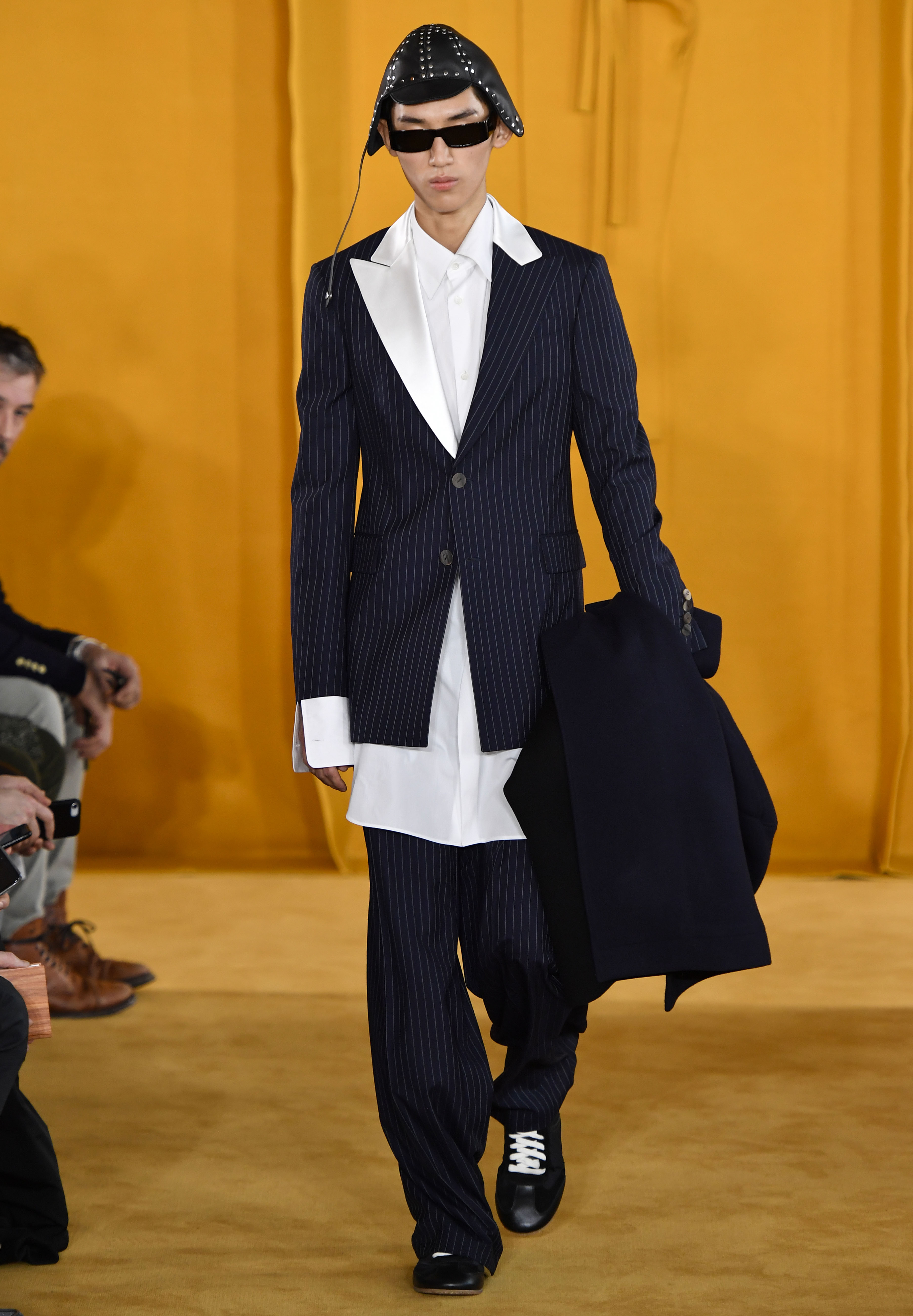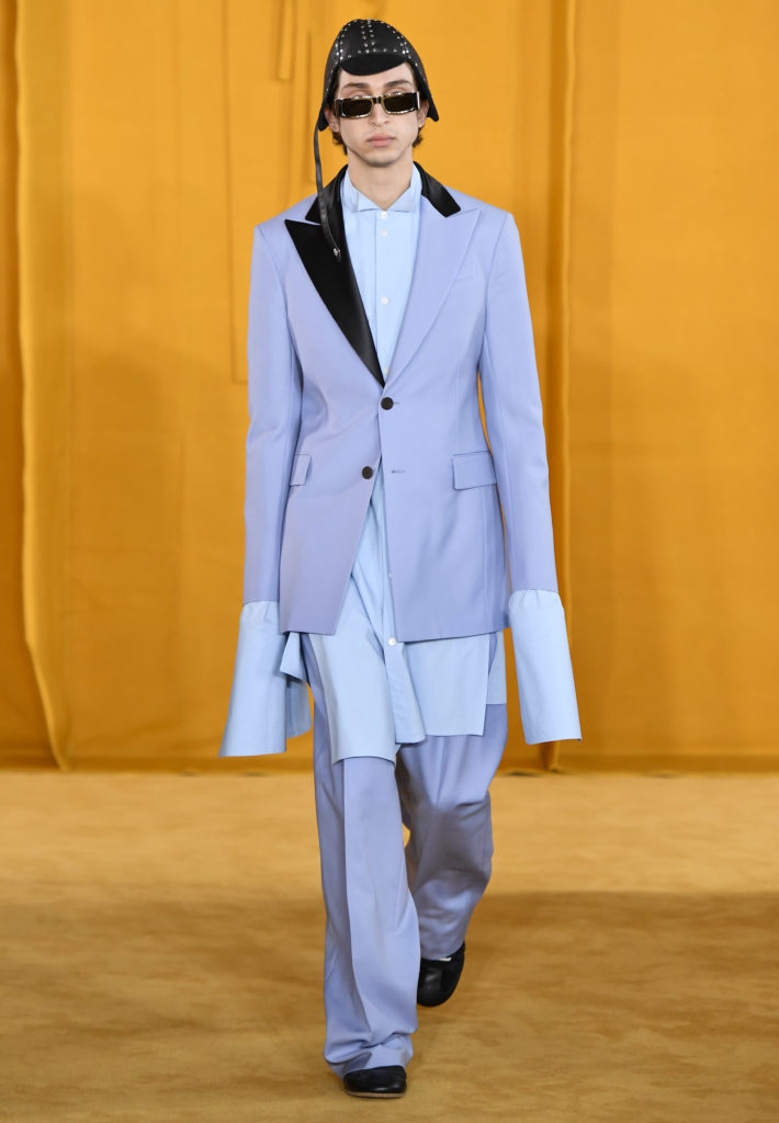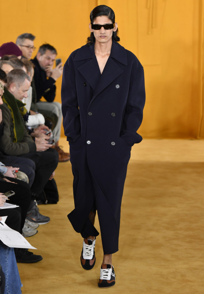 A luminous cotton sculpture by the German artist Franz Erhard Walther occupies the LOEWE show space inside Maison de l’UNESCO, as the focal point of the first-ever men’s LOEWE runway show by Creative Director Jonathan Anderson. Entitled Gelbe Modellierung (1985), the sliced and segmented canvas ‘wall formation’ work stems from the artist’s performative practice, encouraging the viewer to interact with its wardrobing elements: in this case, two jackets and two trouser legs joined to its compartmentalised yellow surface.