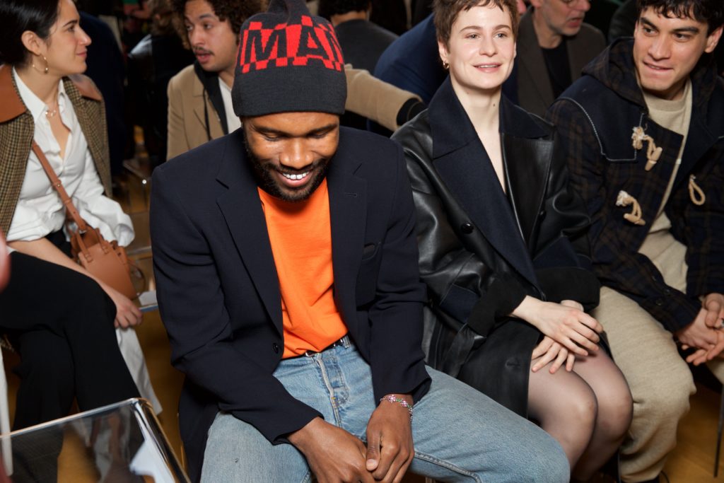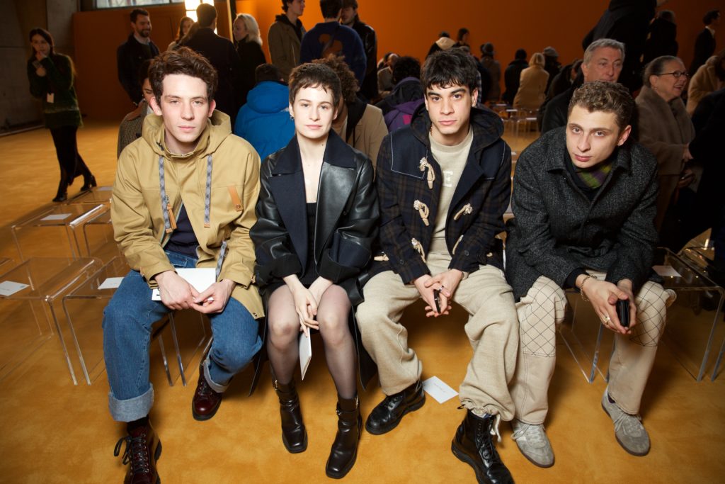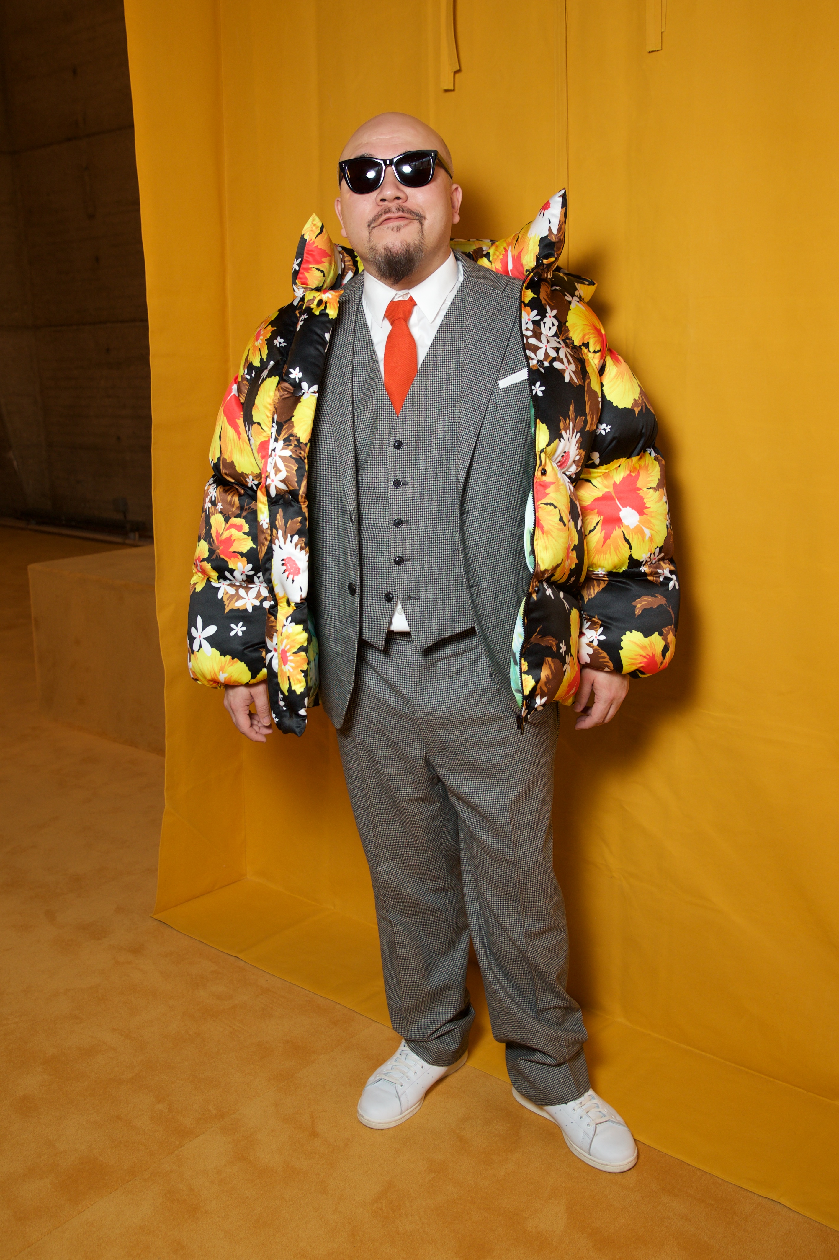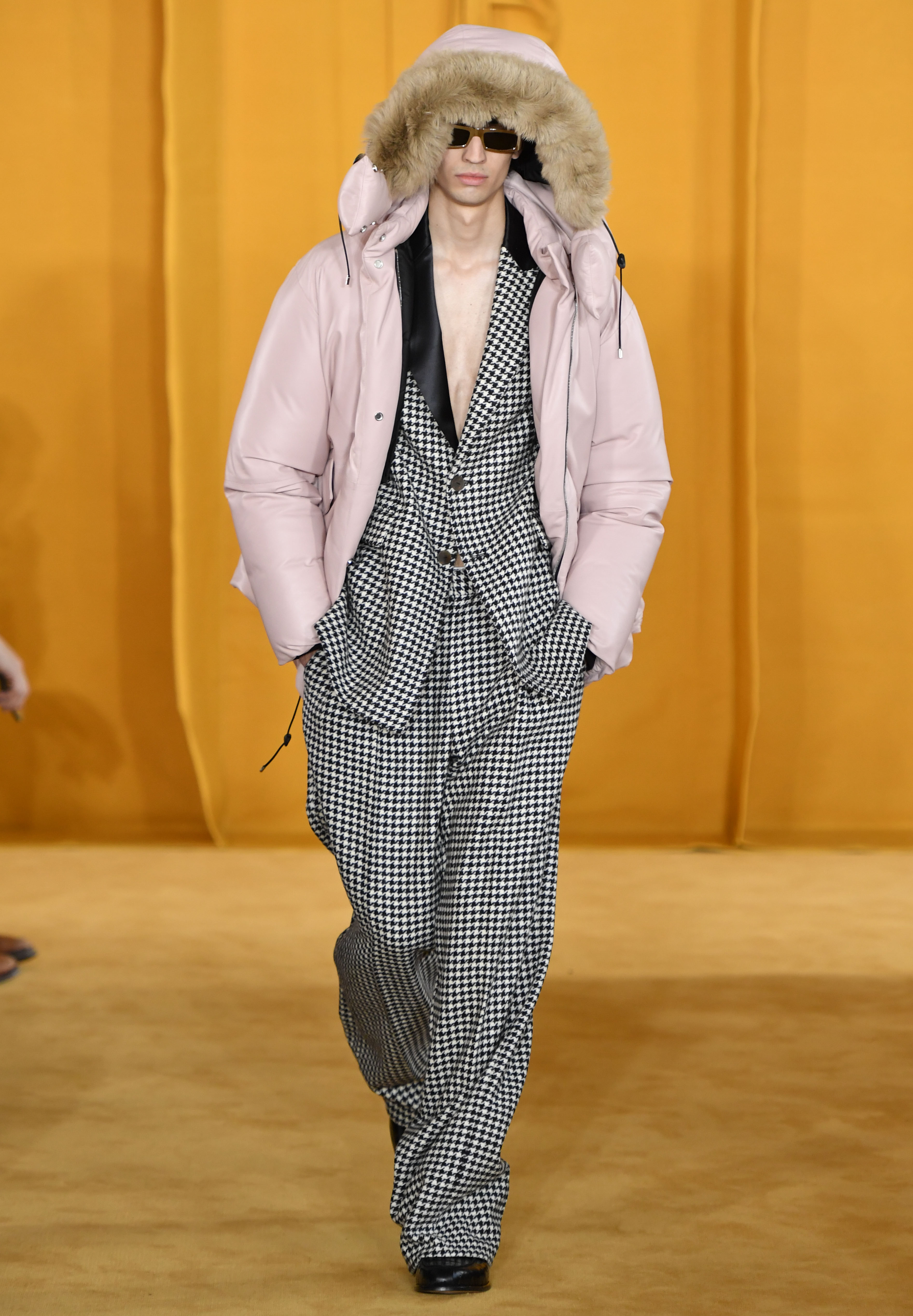 A luminous cotton sculpture by the German artist Franz Erhard Walther occupies the LOEWE show space inside Maison de l’UNESCO, as the focal point of the first-ever men’s LOEWE runway show by Creative Director Jonathan Anderson. Entitled Gelbe Modellierung (1985), the sliced and segmented canvas ‘wall formation’ work stems from the artist’s performative practice, encouraging the viewer to interact with its wardrobing elements: in this case, two jackets and two trouser legs joined to its compartmentalised yellow surface.