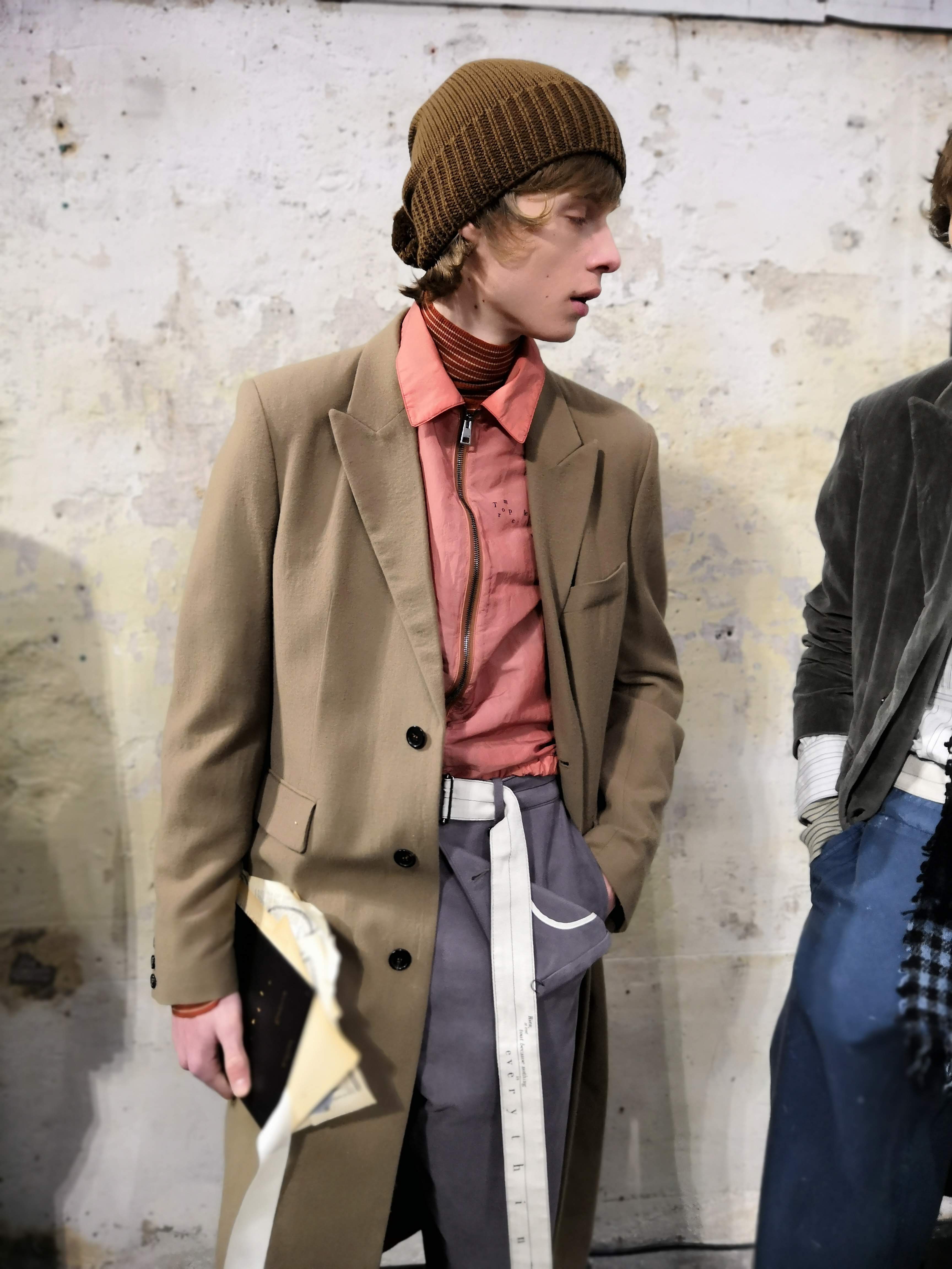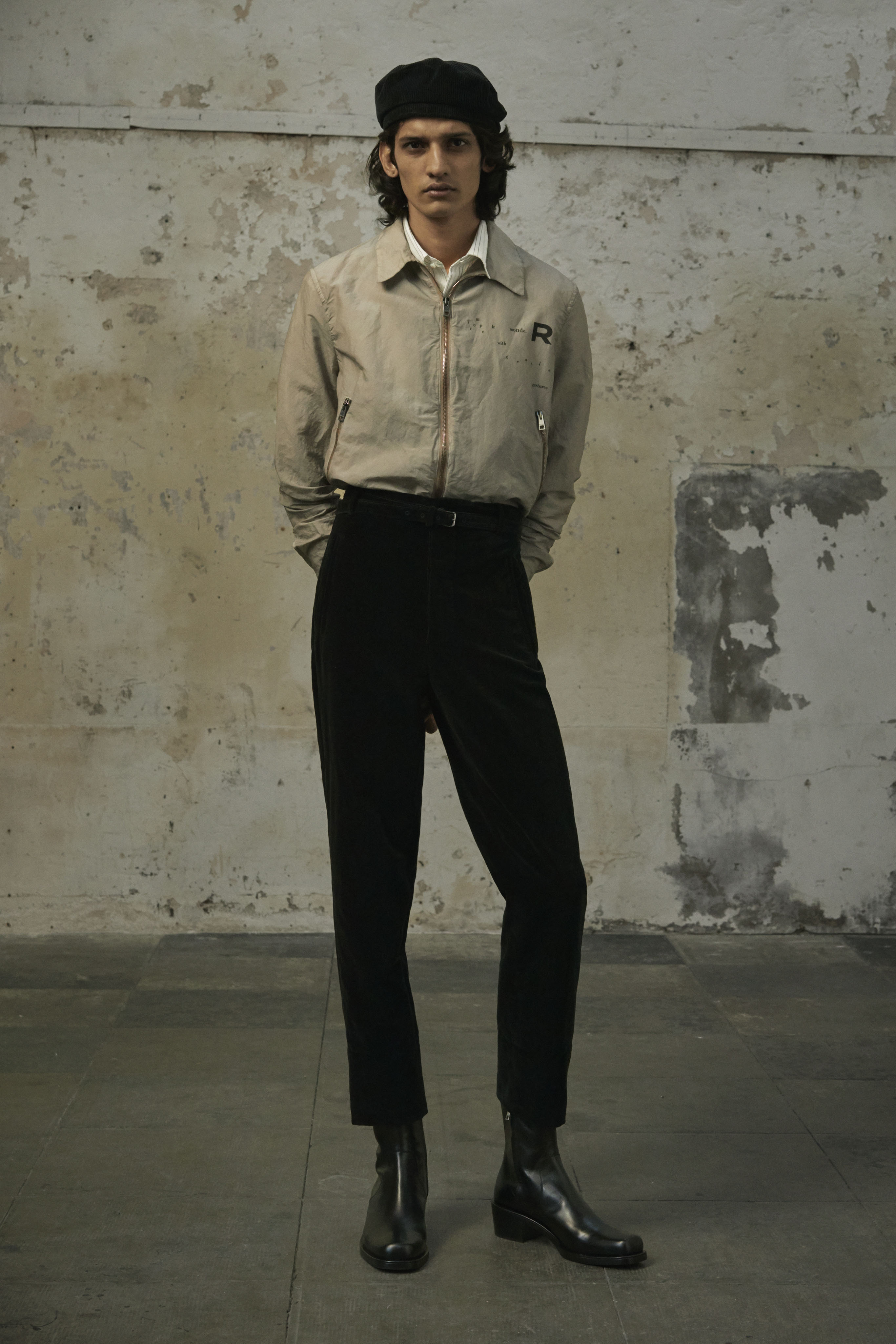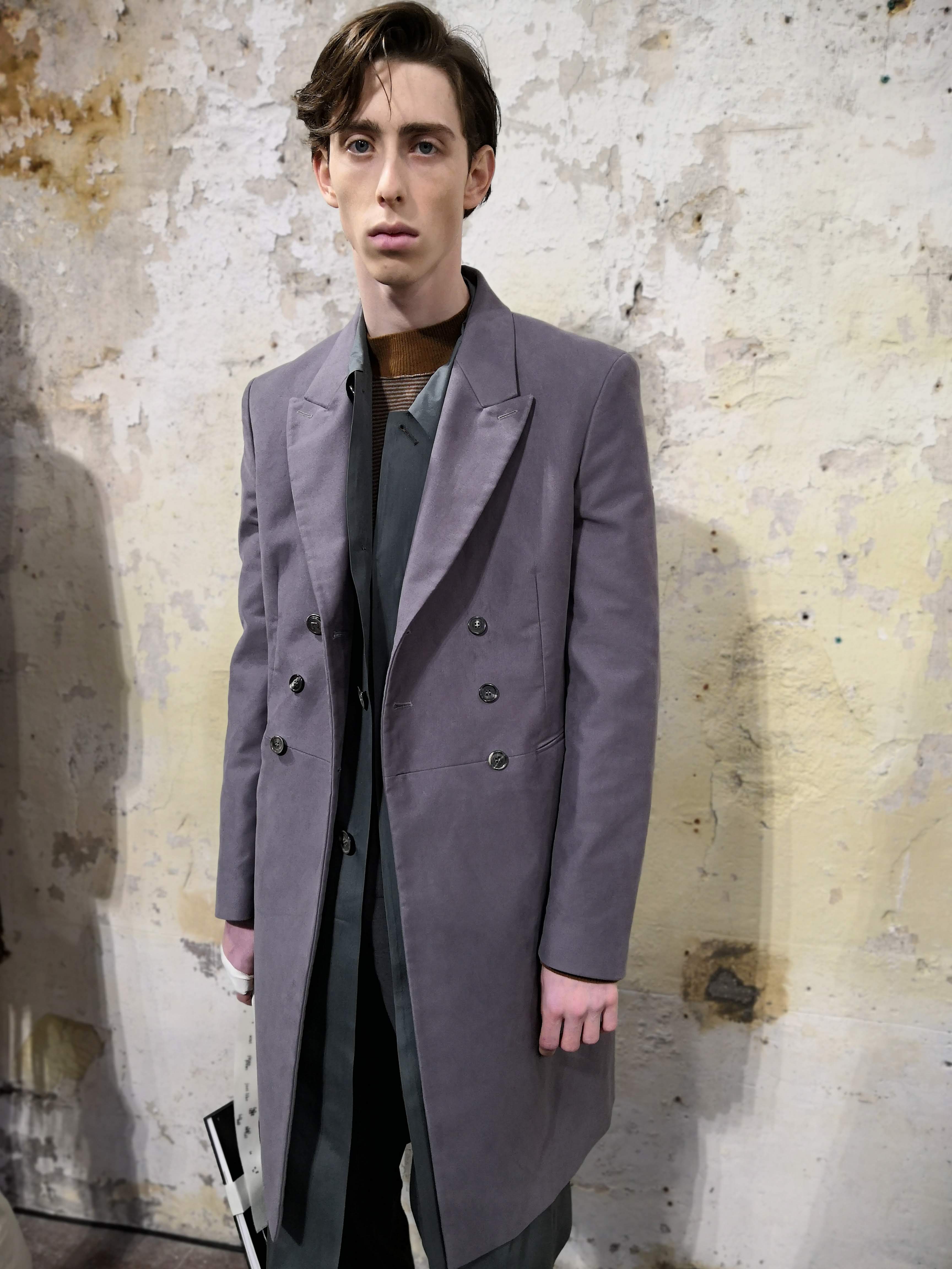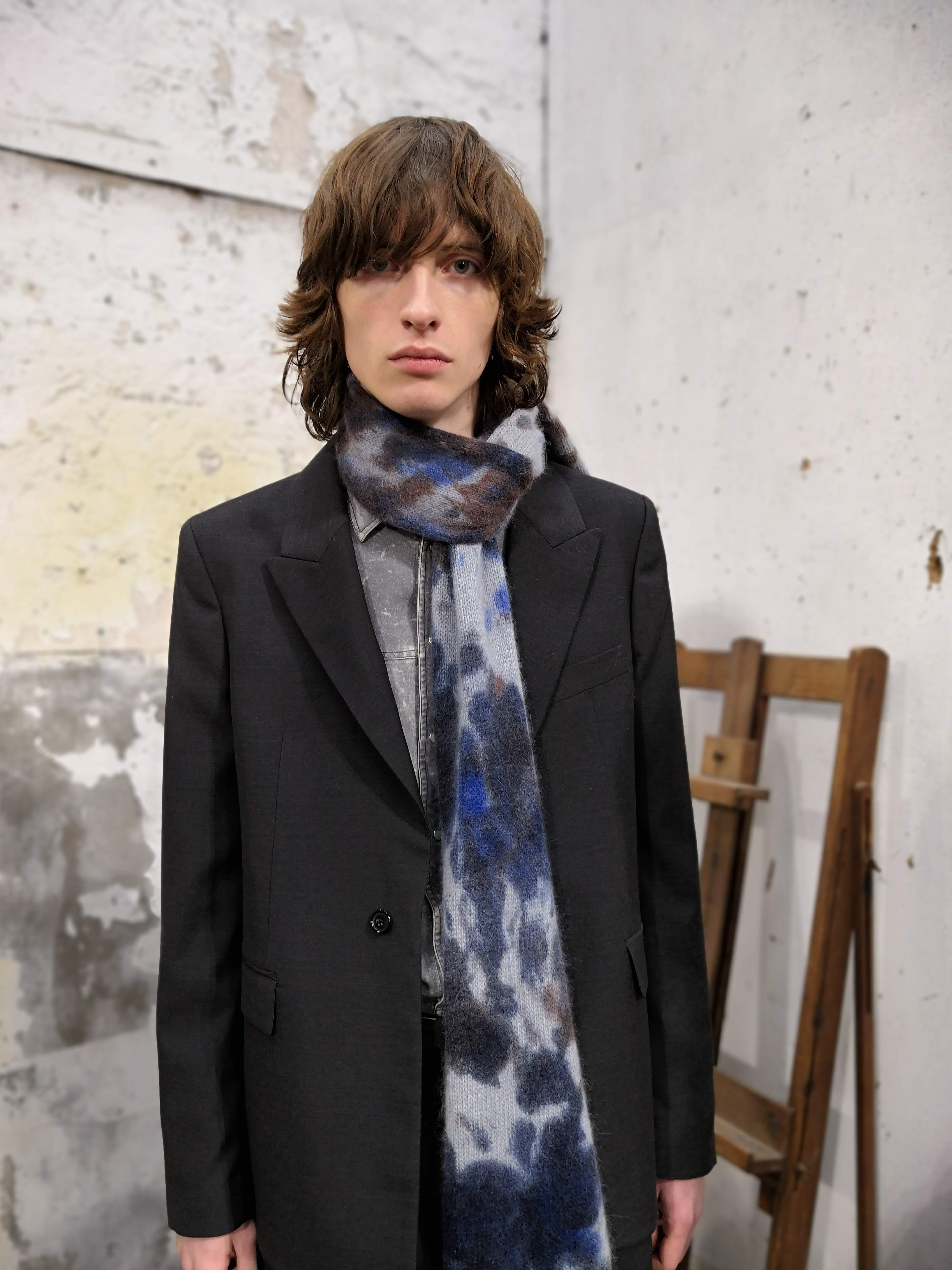 J’ai essayé de toucher tout ce dont un homme a besoin, afin de lui en offrir une interprétation Rochas. Les coupes sont légères et empreintes de dignité, les chemises sont souples, les mailles sont chaleureuses, les manteaux protègent tout en délicatesse. Quelques ruchés épars contrastent harmonieusement avec les clins d’œil au costume de bureau, tandis que des coupe-vent sont confectionnés en soie enduite, dans un bouleversement des codes que je trouve stimulant. Je suis attiré par les fibres naturelles et nobles en raison de leur souplesse, qui ne nuit pas à l’environnement, et parce qu’elles confèrent aux couleurs une patine délavée, picturale.
