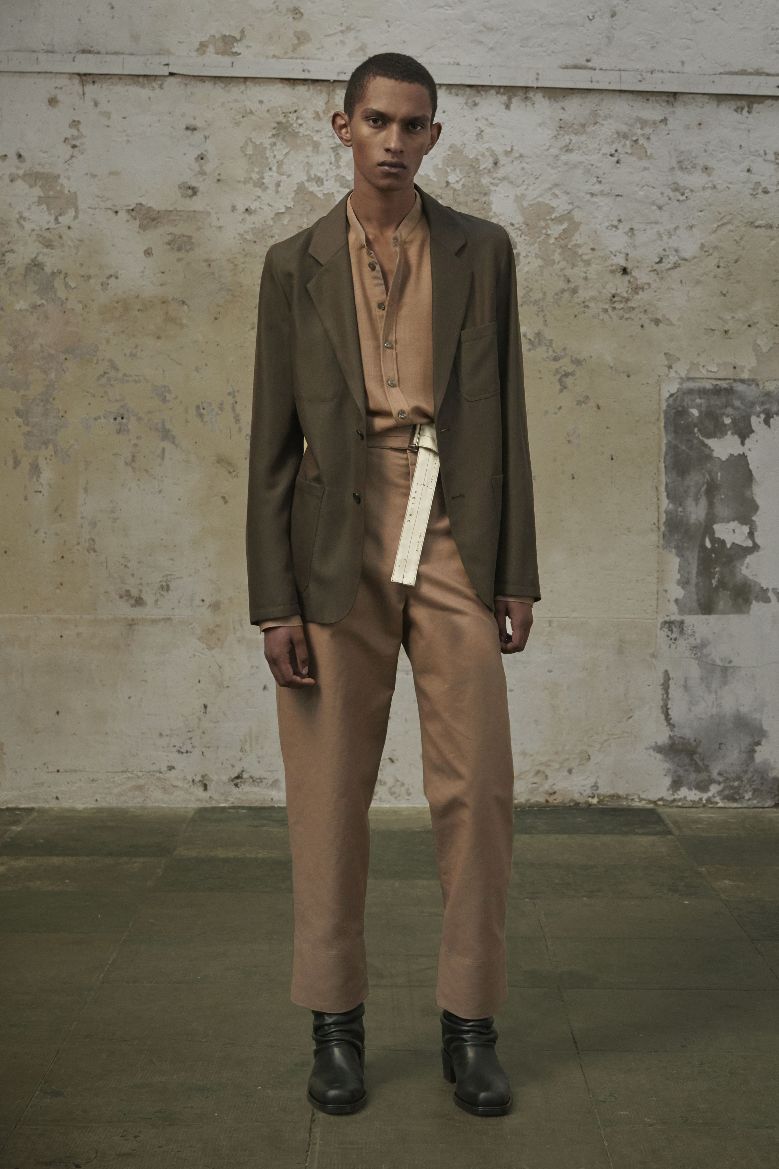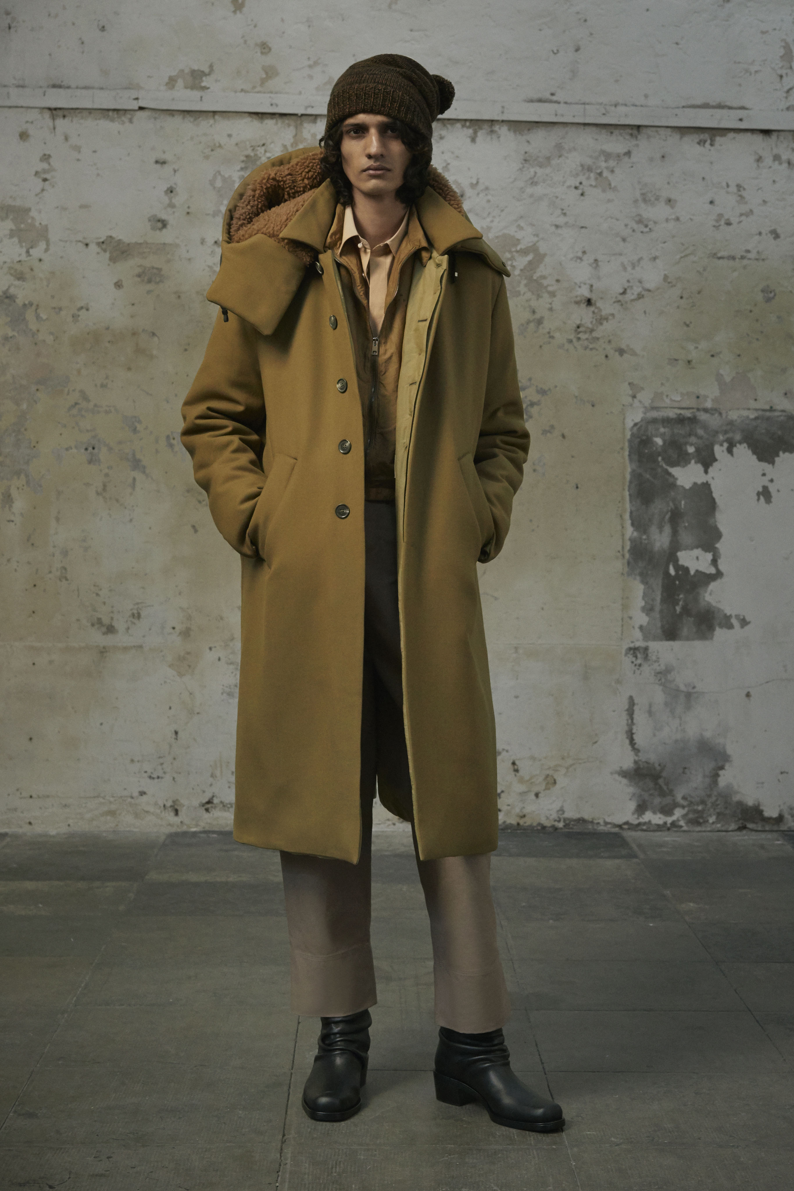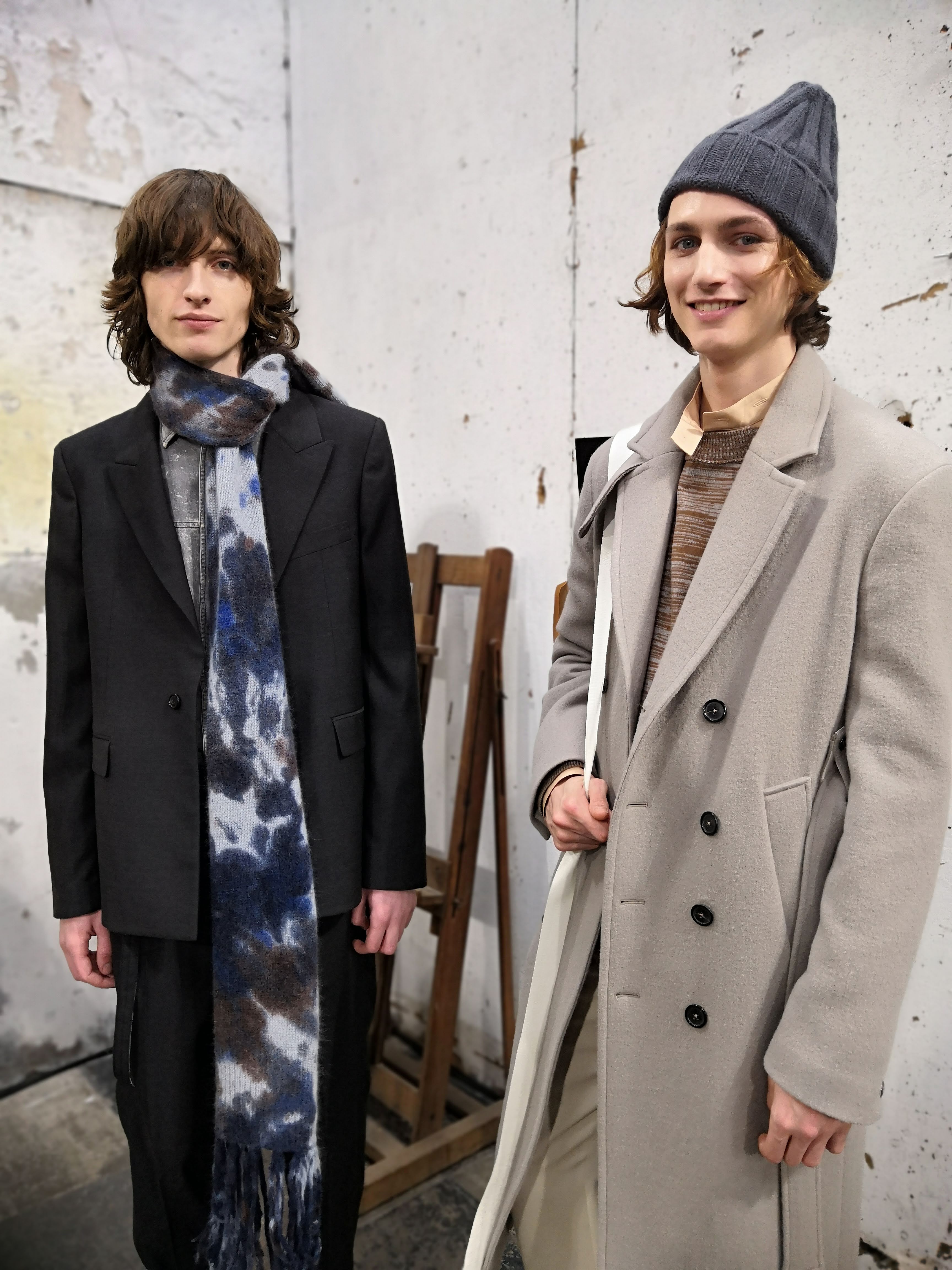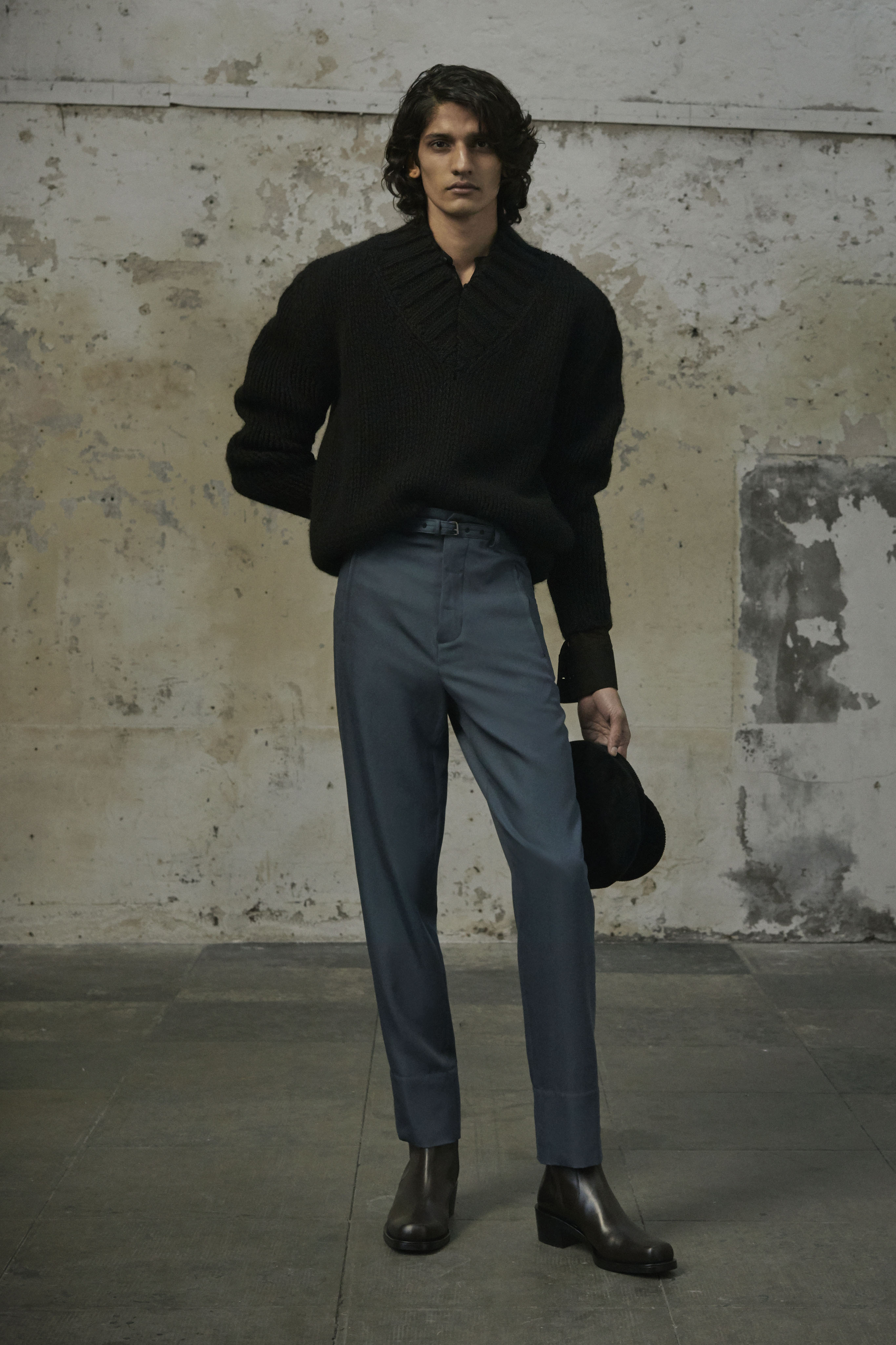 J’ai essayé de toucher tout ce dont un homme a besoin, afin de lui en offrir une interprétation Rochas. Les coupes sont légères et empreintes de dignité, les chemises sont souples, les mailles sont chaleureuses, les manteaux protègent tout en délicatesse. Quelques ruchés épars contrastent harmonieusement avec les clins d’œil au costume de bureau, tandis que des coupe-vent sont confectionnés en soie enduite, dans un bouleversement des codes que je trouve stimulant. Je suis attiré par les fibres naturelles et nobles en raison de leur souplesse, qui ne nuit pas à l’environnement, et parce qu’elles confèrent aux couleurs une patine délavée, picturale.