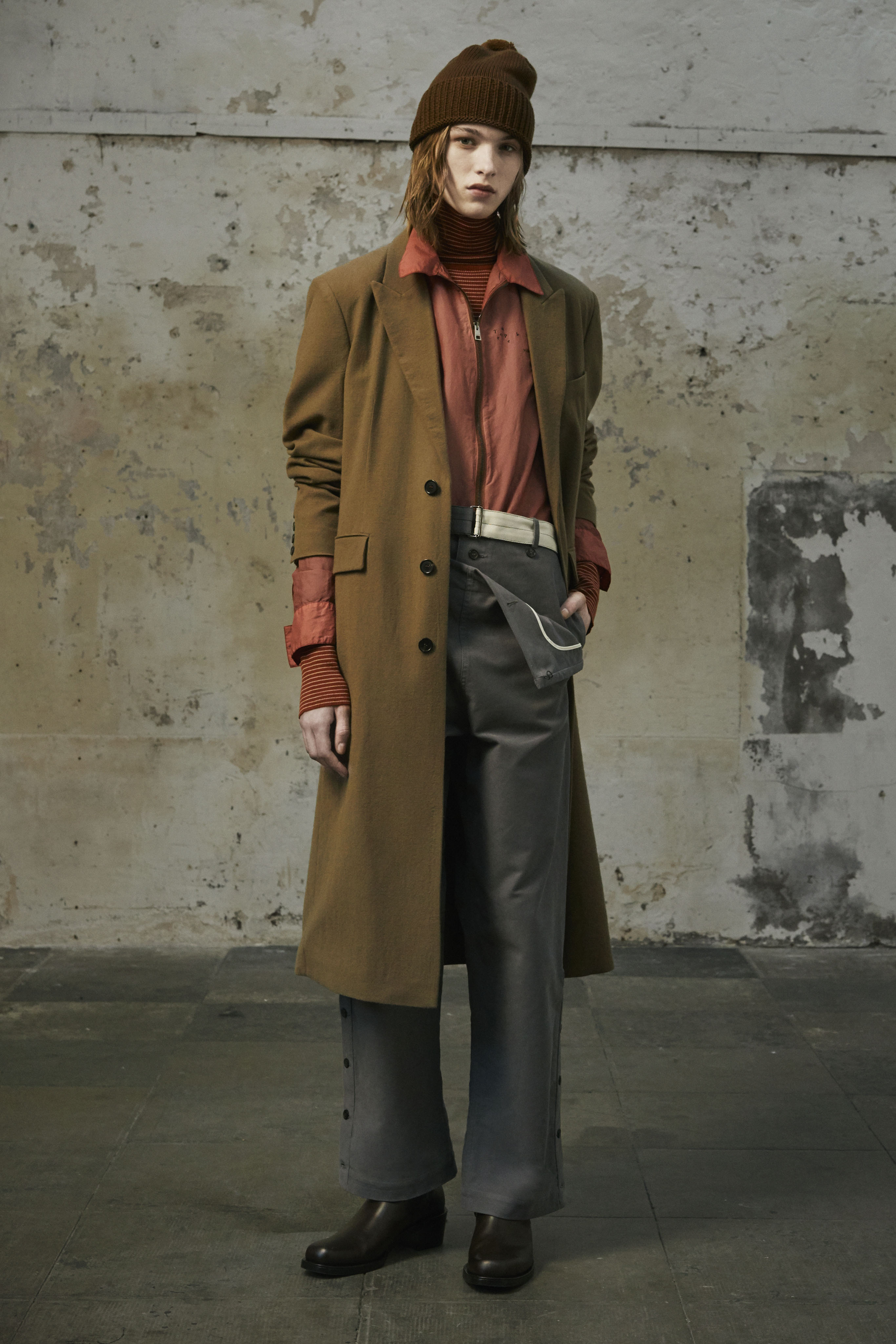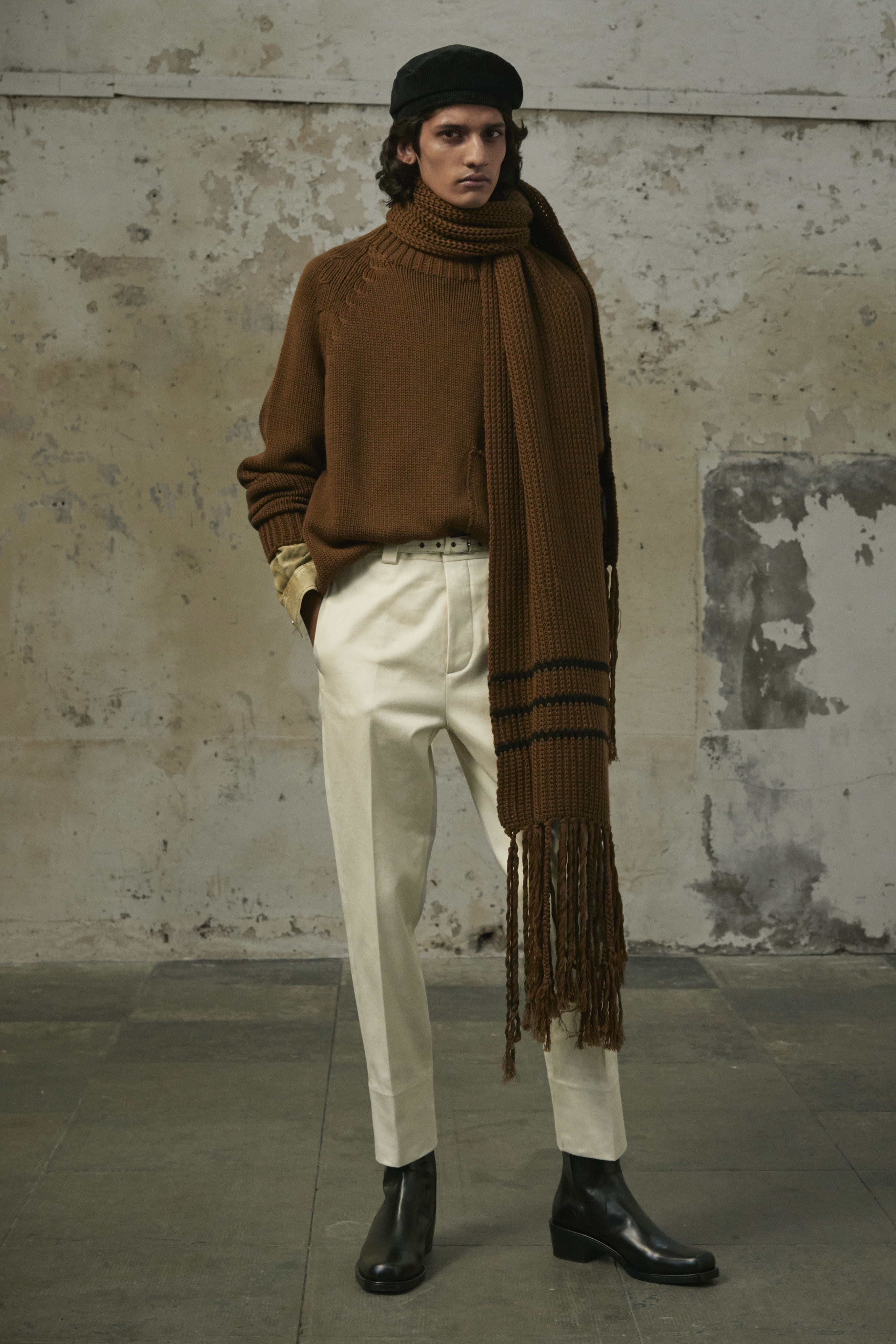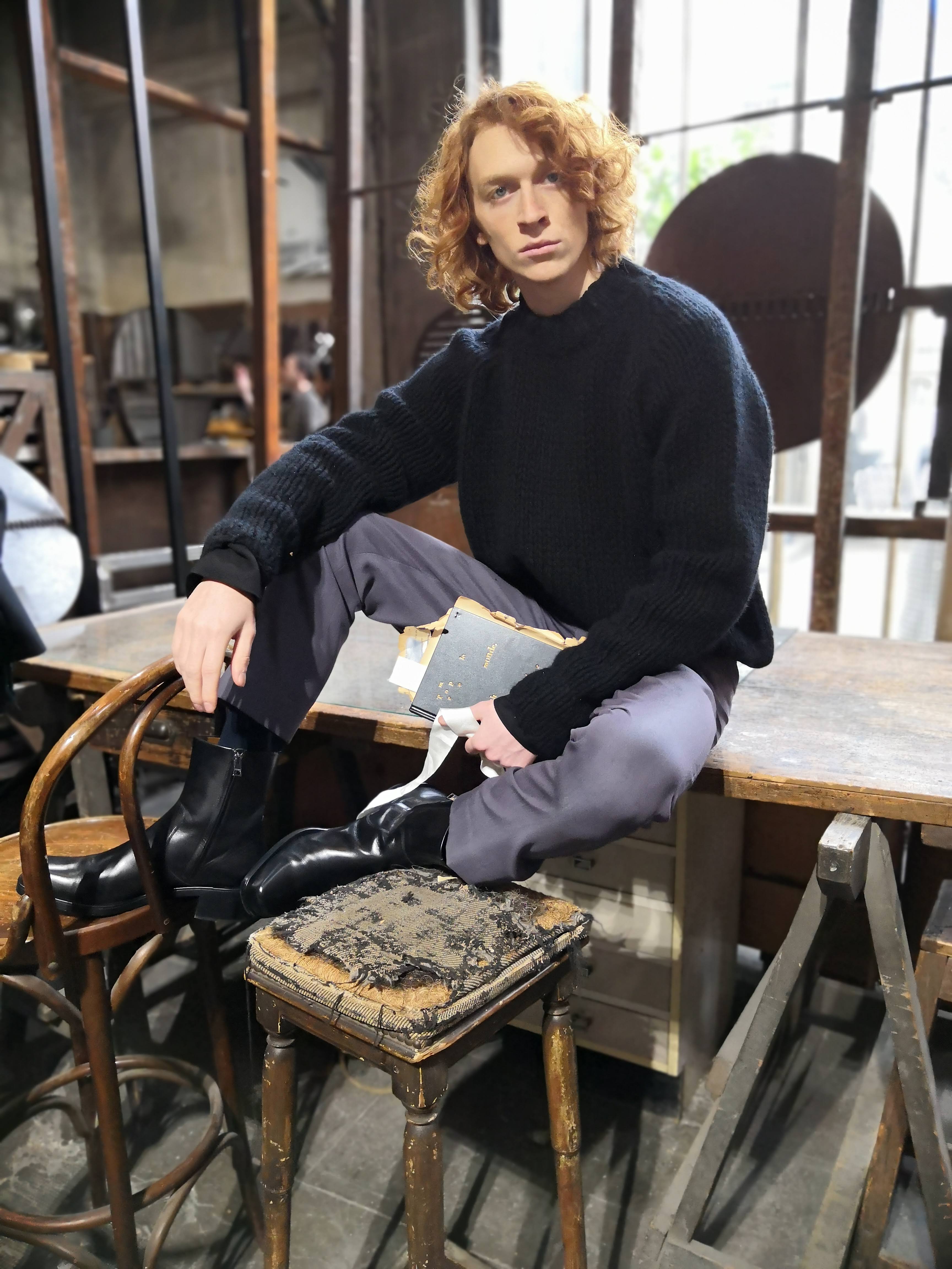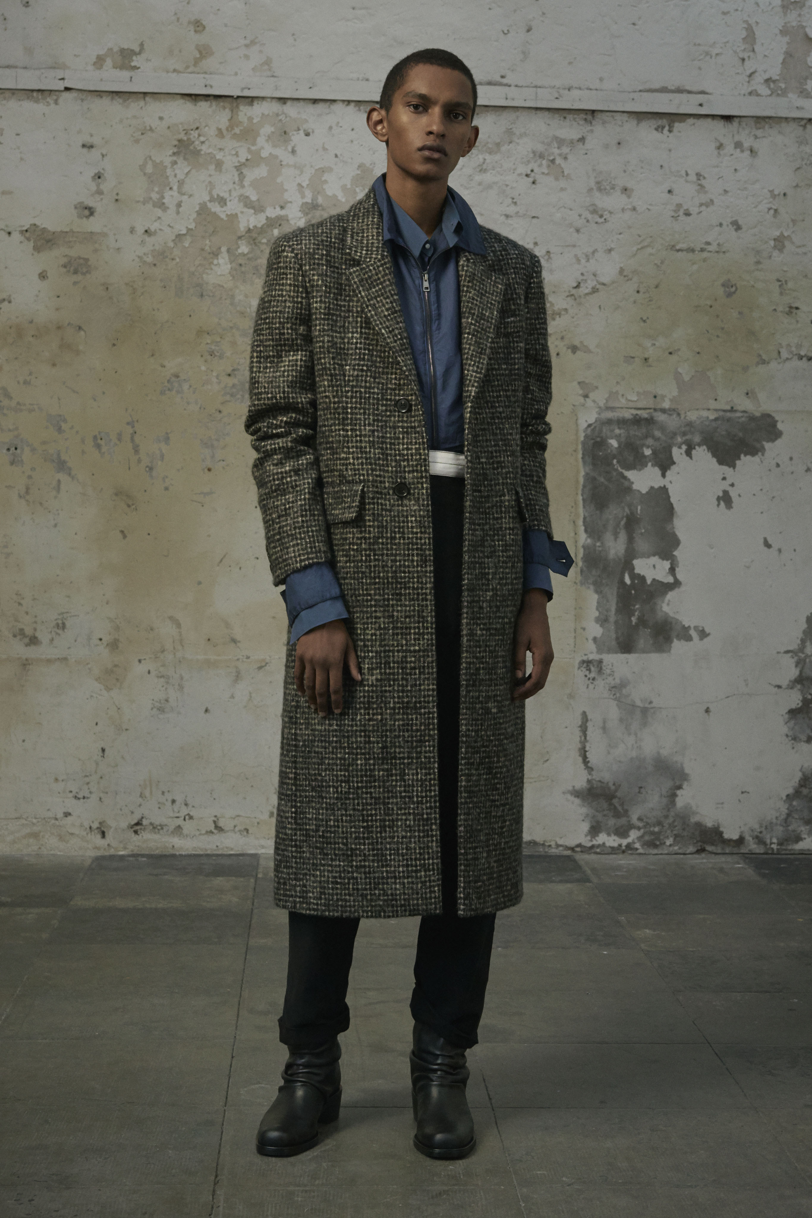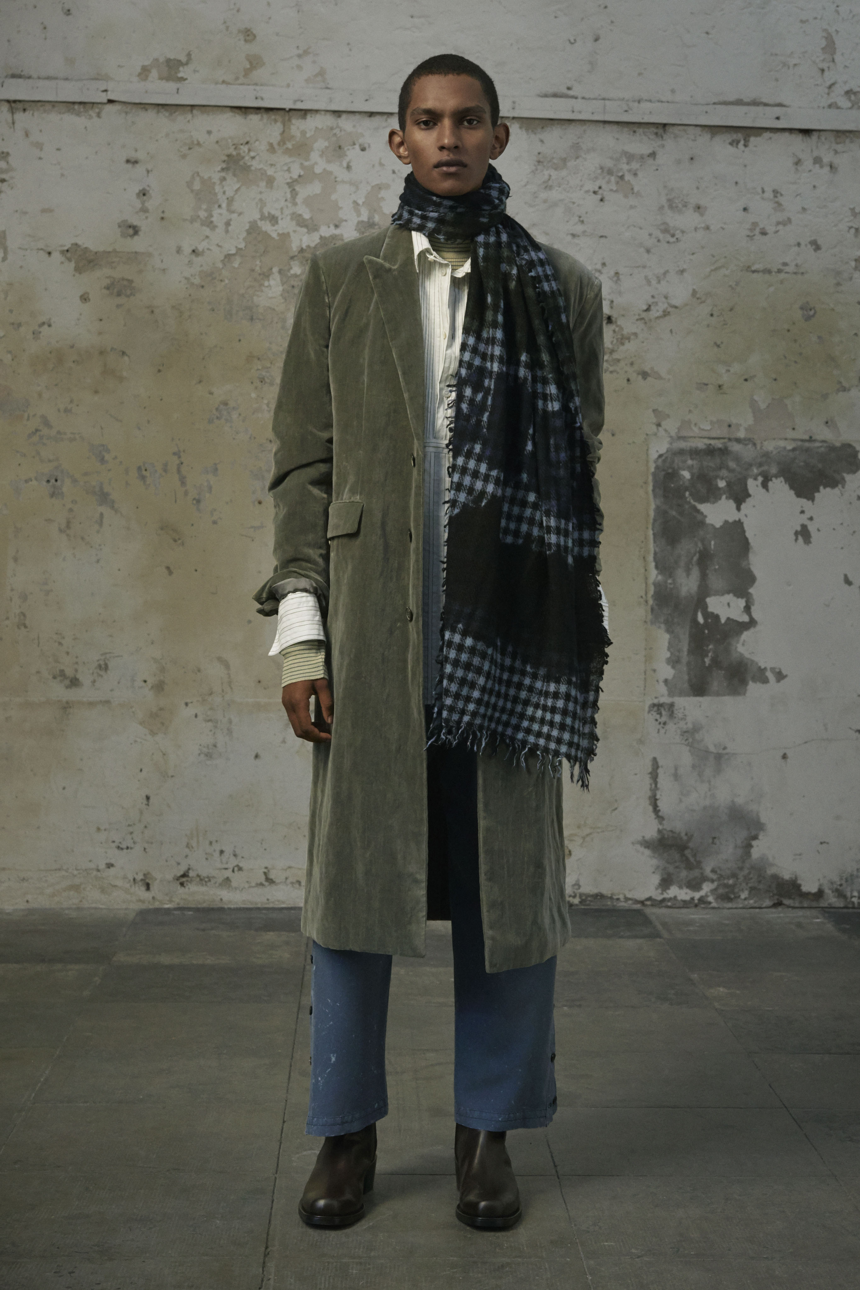 J’ai essayé de toucher tout ce dont un homme a besoin, afin de lui en offrir une interprétation Rochas. Les coupes sont légères et empreintes de dignité, les chemises sont souples, les mailles sont chaleureuses, les manteaux protègent tout en délicatesse. Quelques ruchés épars contrastent harmonieusement avec les clins d’œil au costume de bureau, tandis que des coupe-vent sont confectionnés en soie enduite, dans un bouleversement des codes que je trouve stimulant. Je suis attiré par les fibres naturelles et nobles en raison de leur souplesse, qui ne nuit pas à l’environnement, et parce qu’elles confèrent aux couleurs une patine délavée, picturale.
