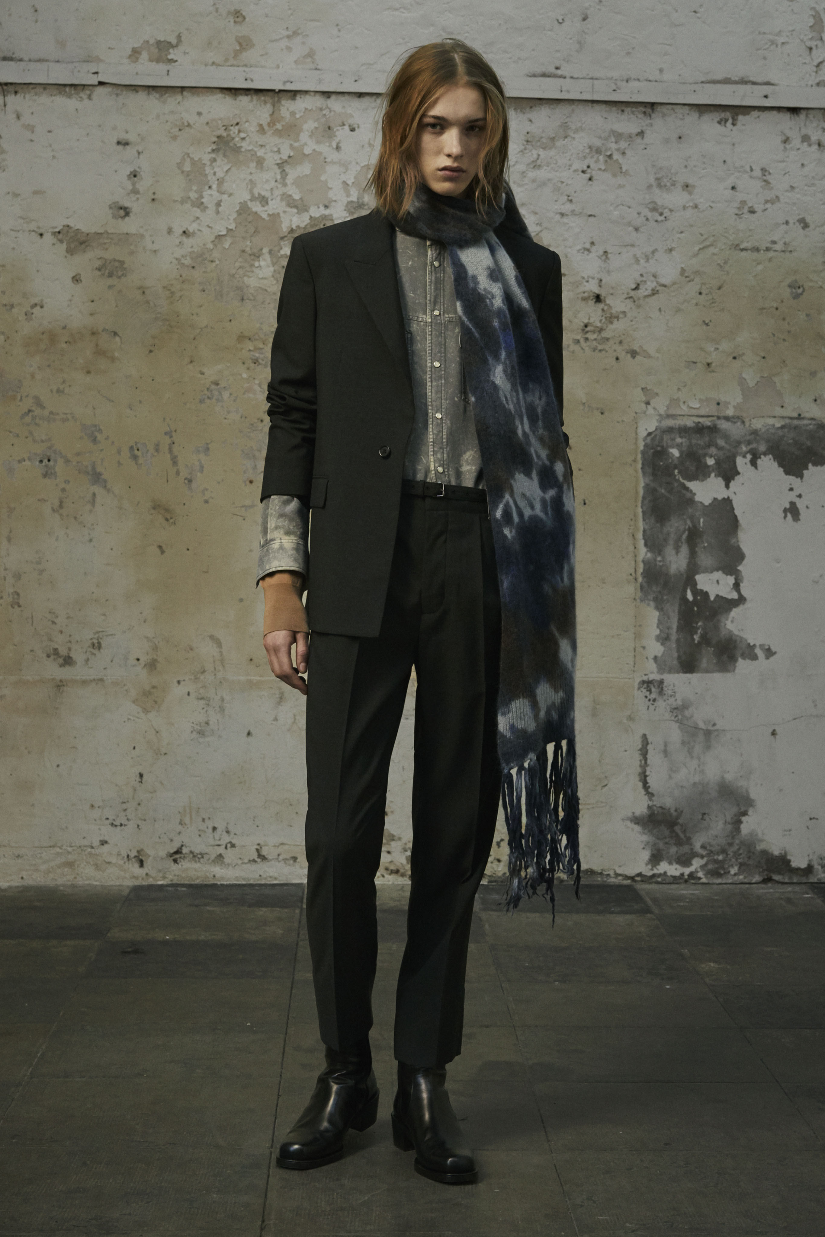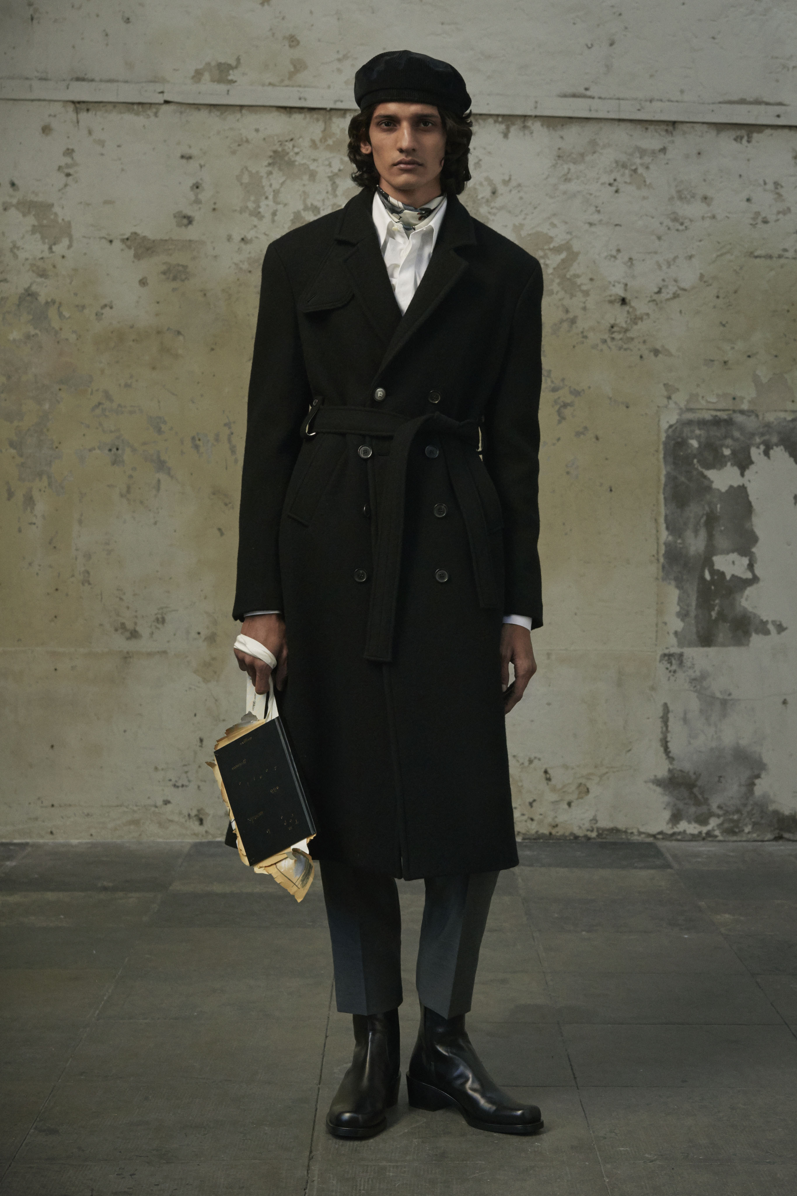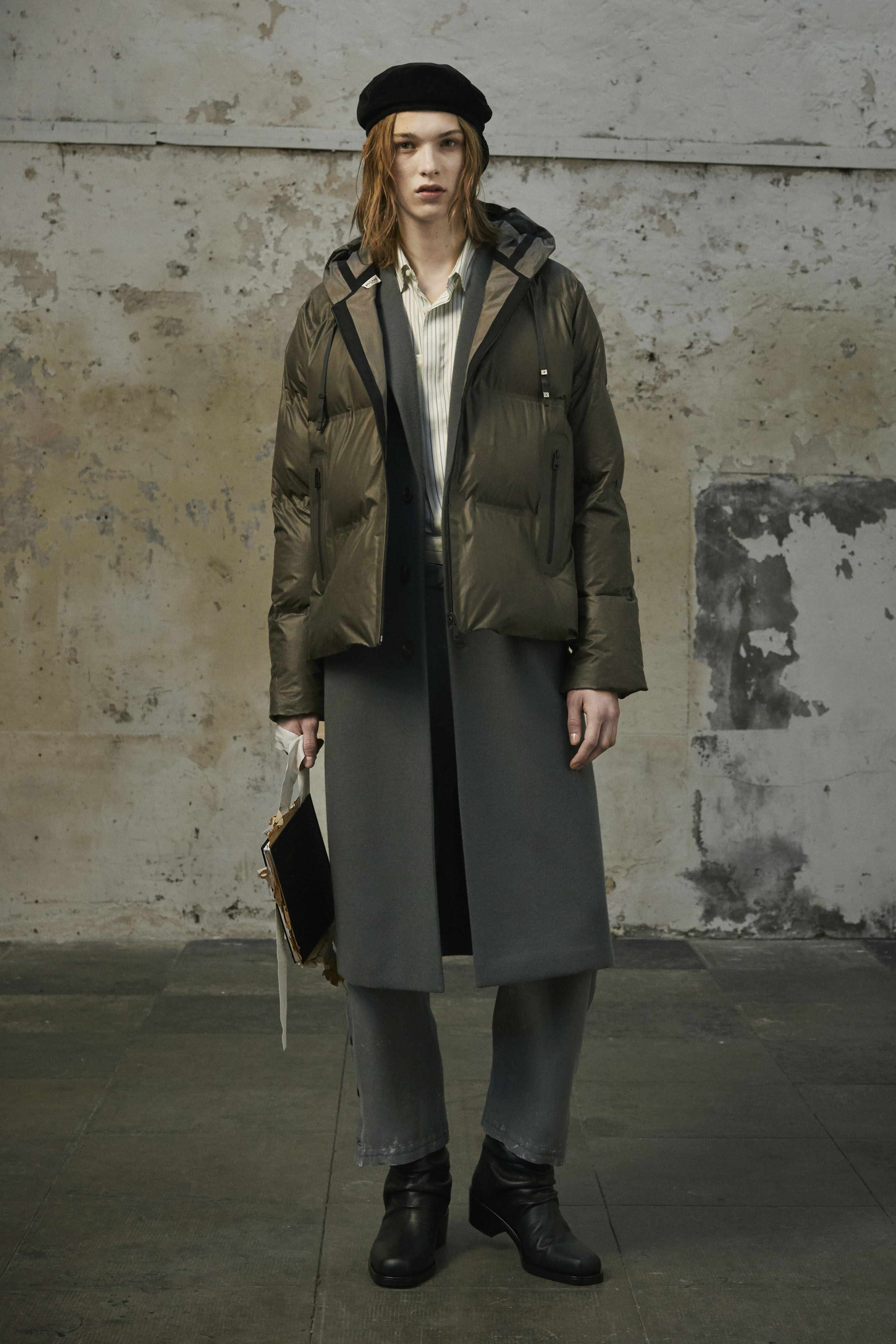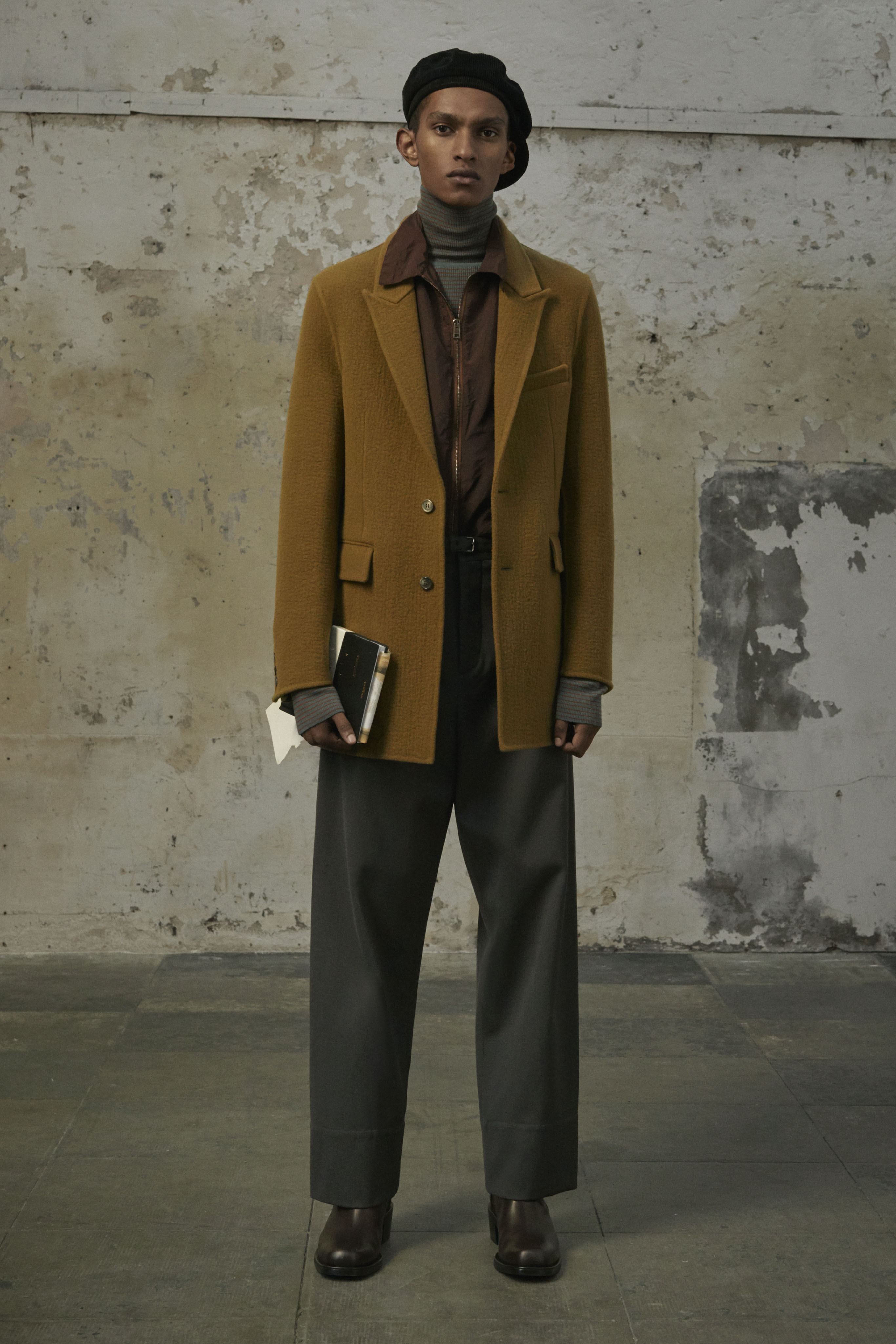J’ai essayé de toucher tout ce dont un homme a besoin, afin de lui en offrir une interprétation Rochas. Les coupes sont légères et empreintes de dignité, les chemises sont souples, les mailles sont chaleureuses, les manteaux protègent tout en délicatesse. Quelques ruchés épars contrastent harmonieusement avec les clins d’œil au costume de bureau, tandis que des coupe-vent sont confectionnés en soie enduite, dans un bouleversement des codes que je trouve stimulant. Je suis attiré par les fibres naturelles et nobles en raison de leur souplesse, qui ne nuit pas à l’environnement, et parce qu’elles confèrent aux couleurs une patine délavée, picturale.