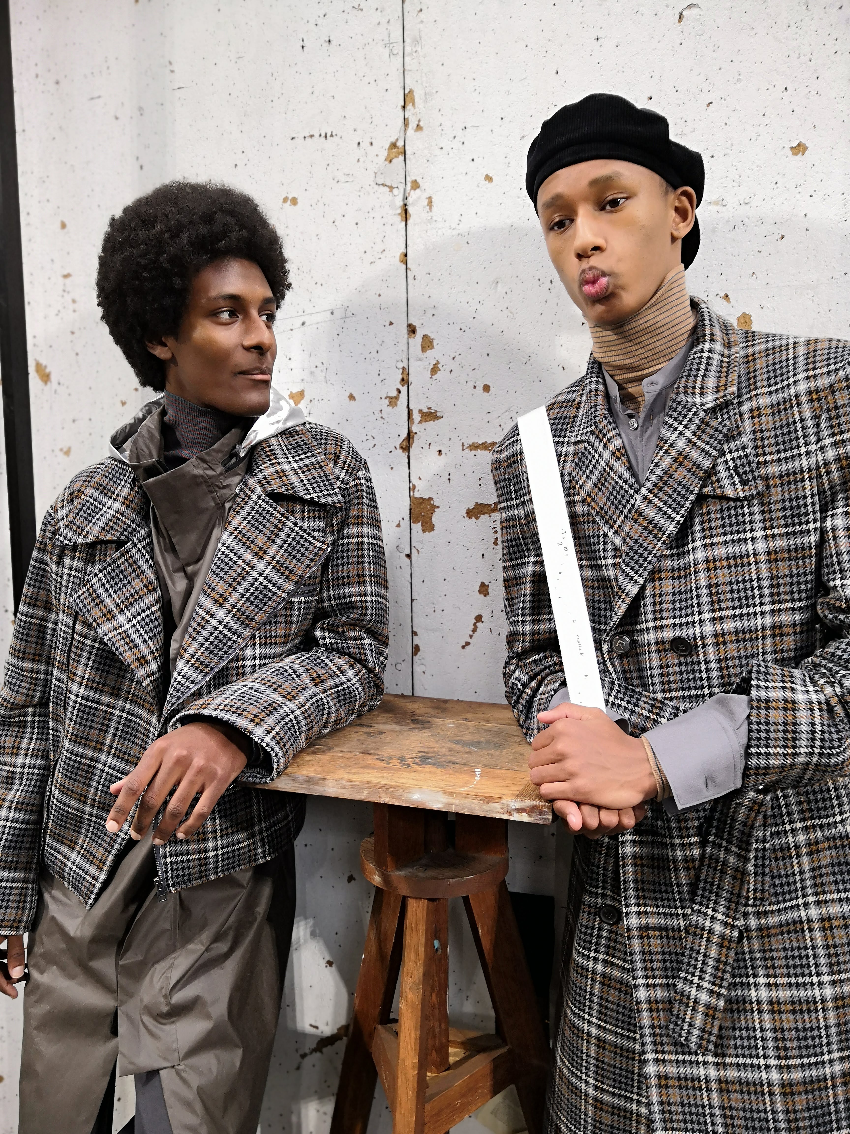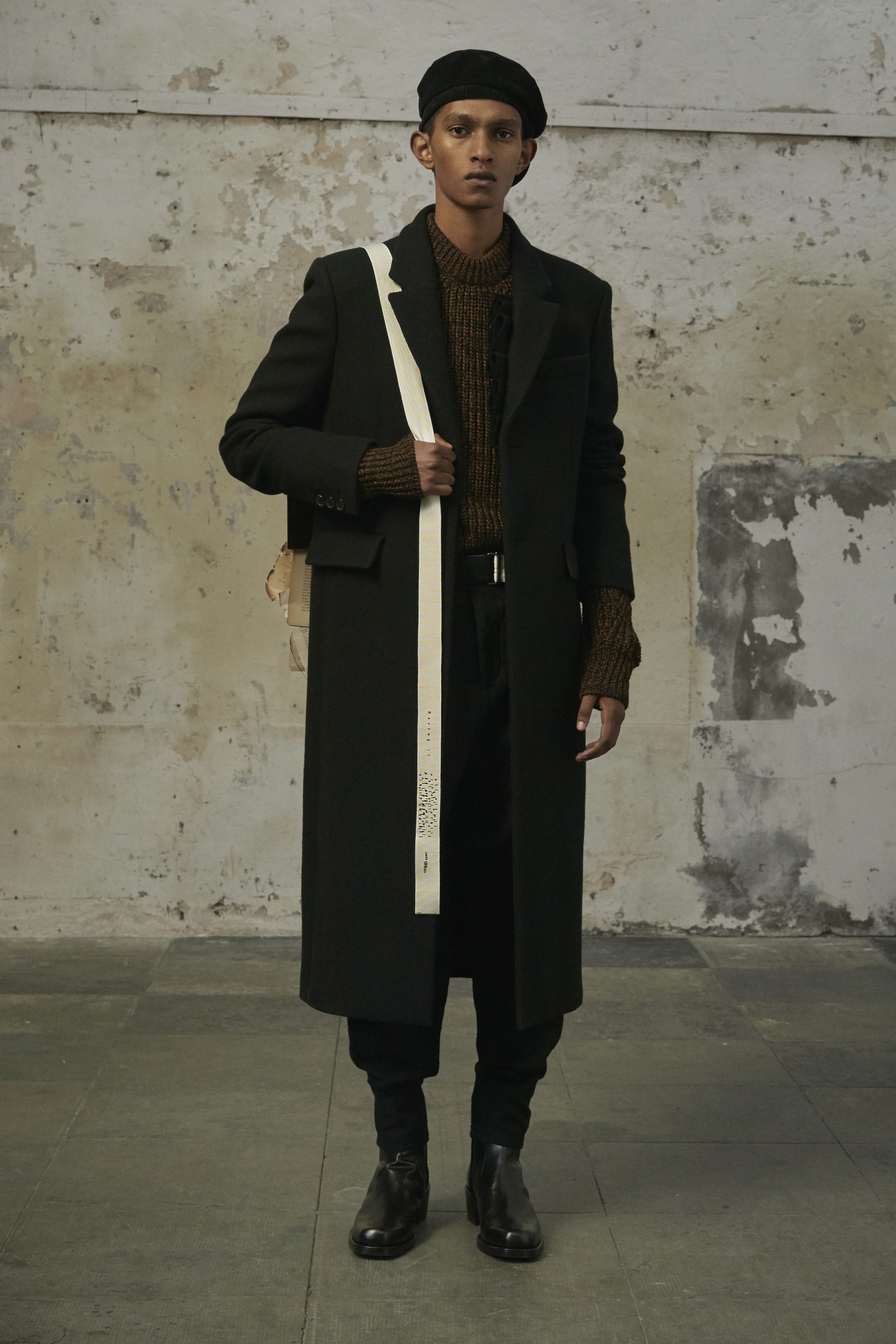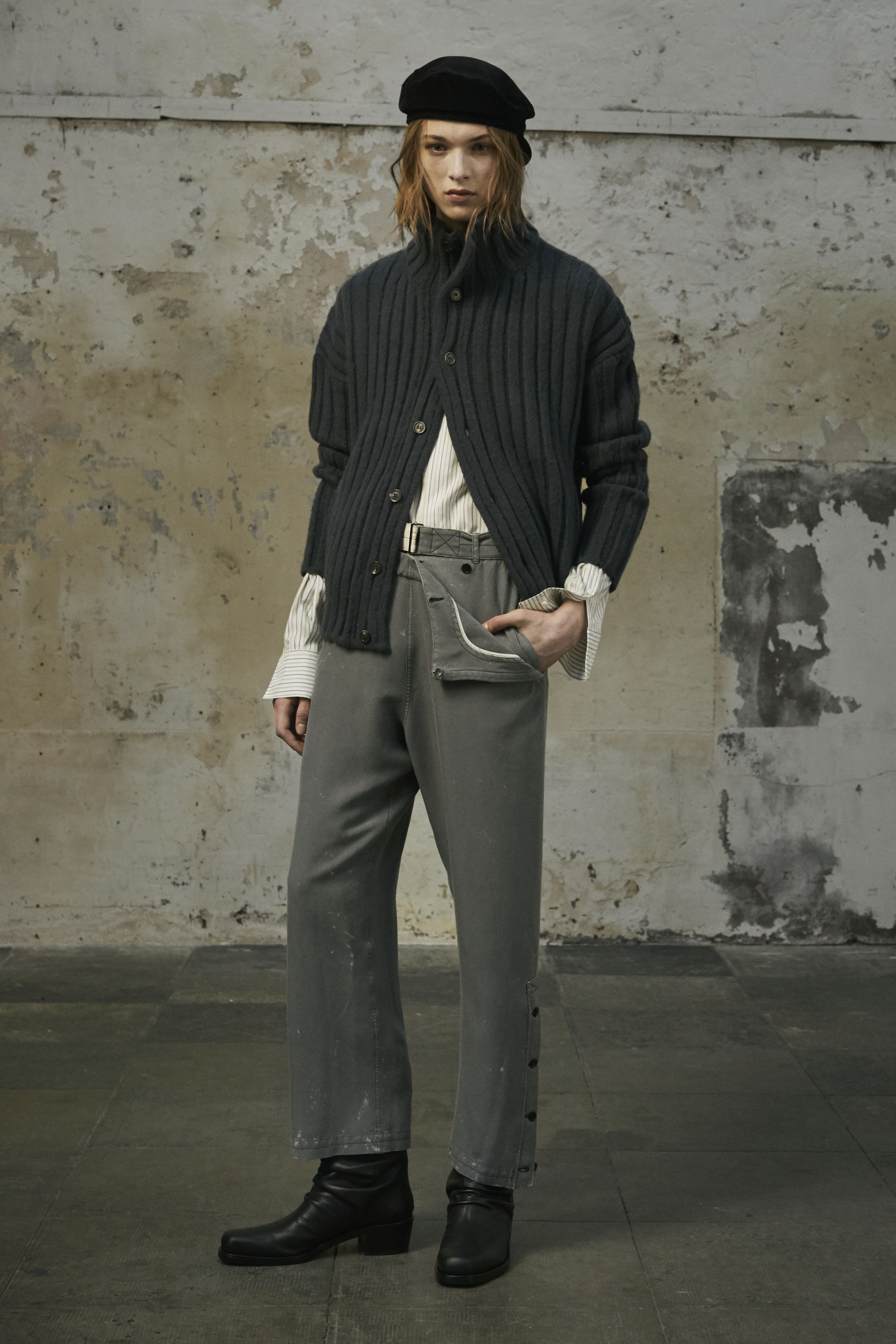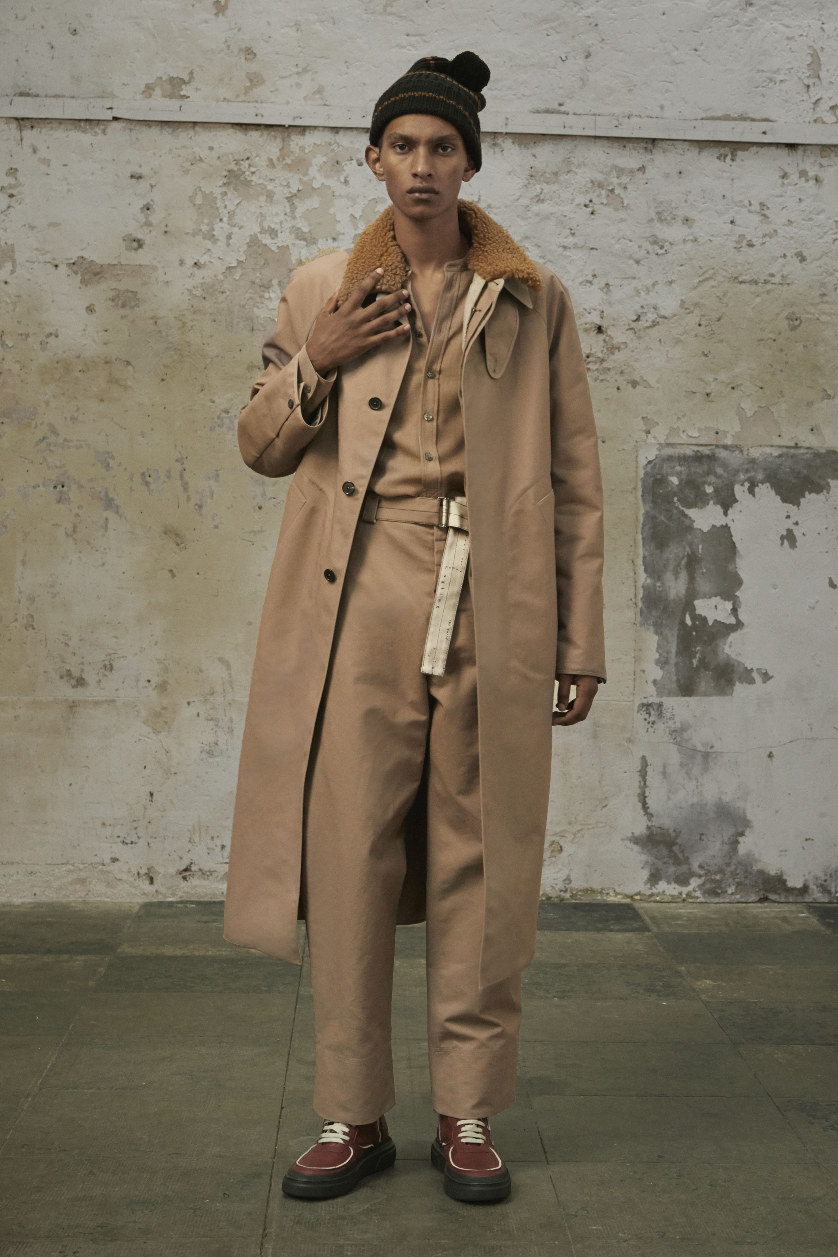 J’ai essayé de toucher tout ce dont un homme a besoin, afin de lui en offrir une interprétation Rochas. Les coupes sont légères et empreintes de dignité, les chemises sont souples, les mailles sont chaleureuses, les manteaux protègent tout en délicatesse. Quelques ruchés épars contrastent harmonieusement avec les clins d’œil au costume de bureau, tandis que des coupe-vent sont confectionnés en soie enduite, dans un bouleversement des codes que je trouve stimulant. Je suis attiré par les fibres naturelles et nobles en raison de leur souplesse, qui ne nuit pas à l’environnement, et parce qu’elles confèrent aux couleurs une patine délavée, picturale.