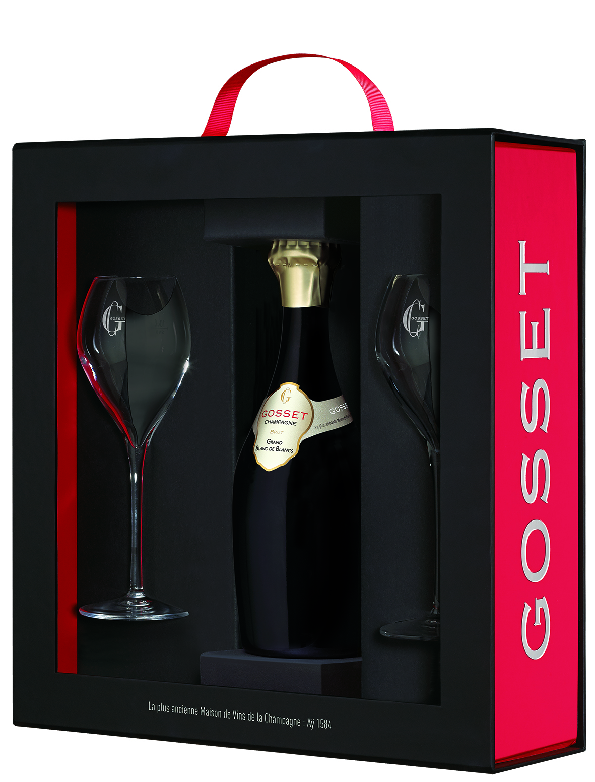Le Coffret Saint-Valentin Champagne GOSSET, comprenant une demi-bouteille de Grand Blanc de Blancs (37,5 cl) et deux verres à dégustation(18 cl), est proposé au prix public conseillé de 50 € TTC. Il est disponible chez tous les bons cavistes et en vente directe au 03 26 56 99 56 ou sur :