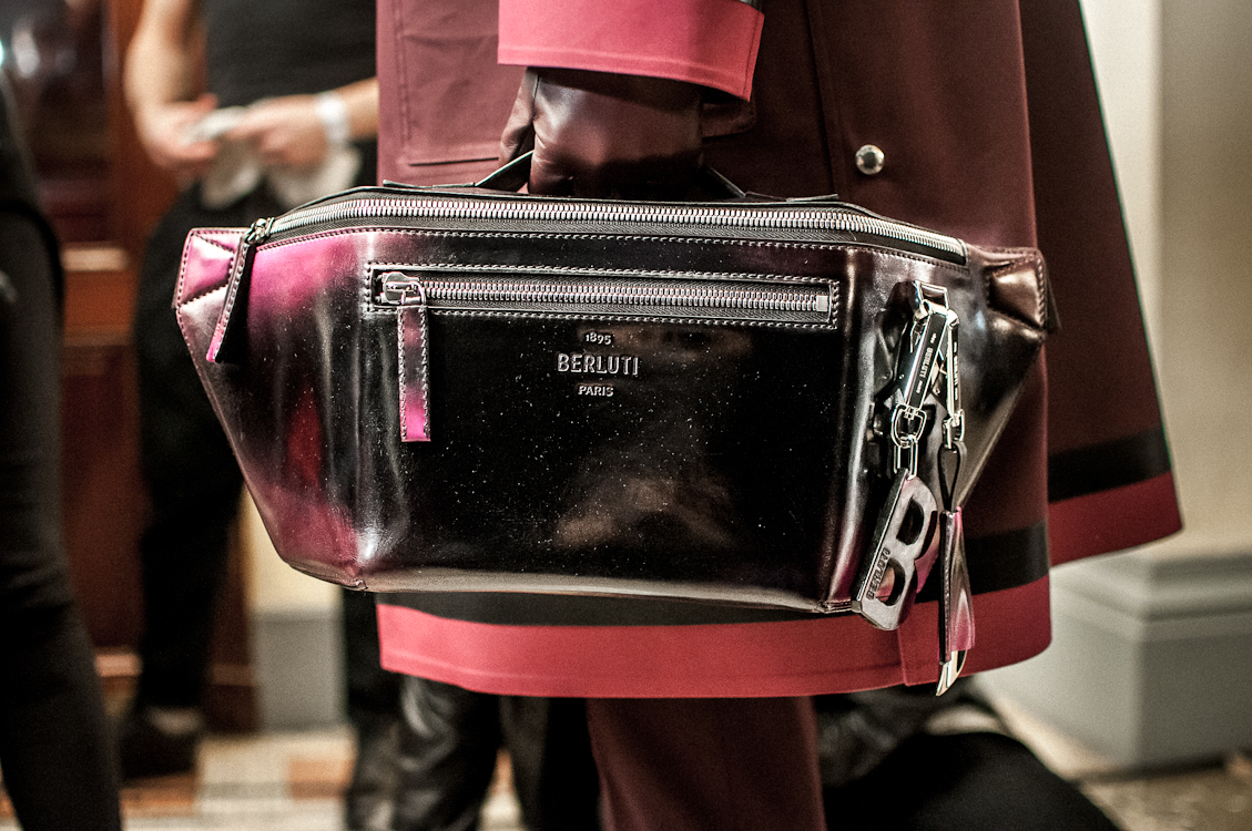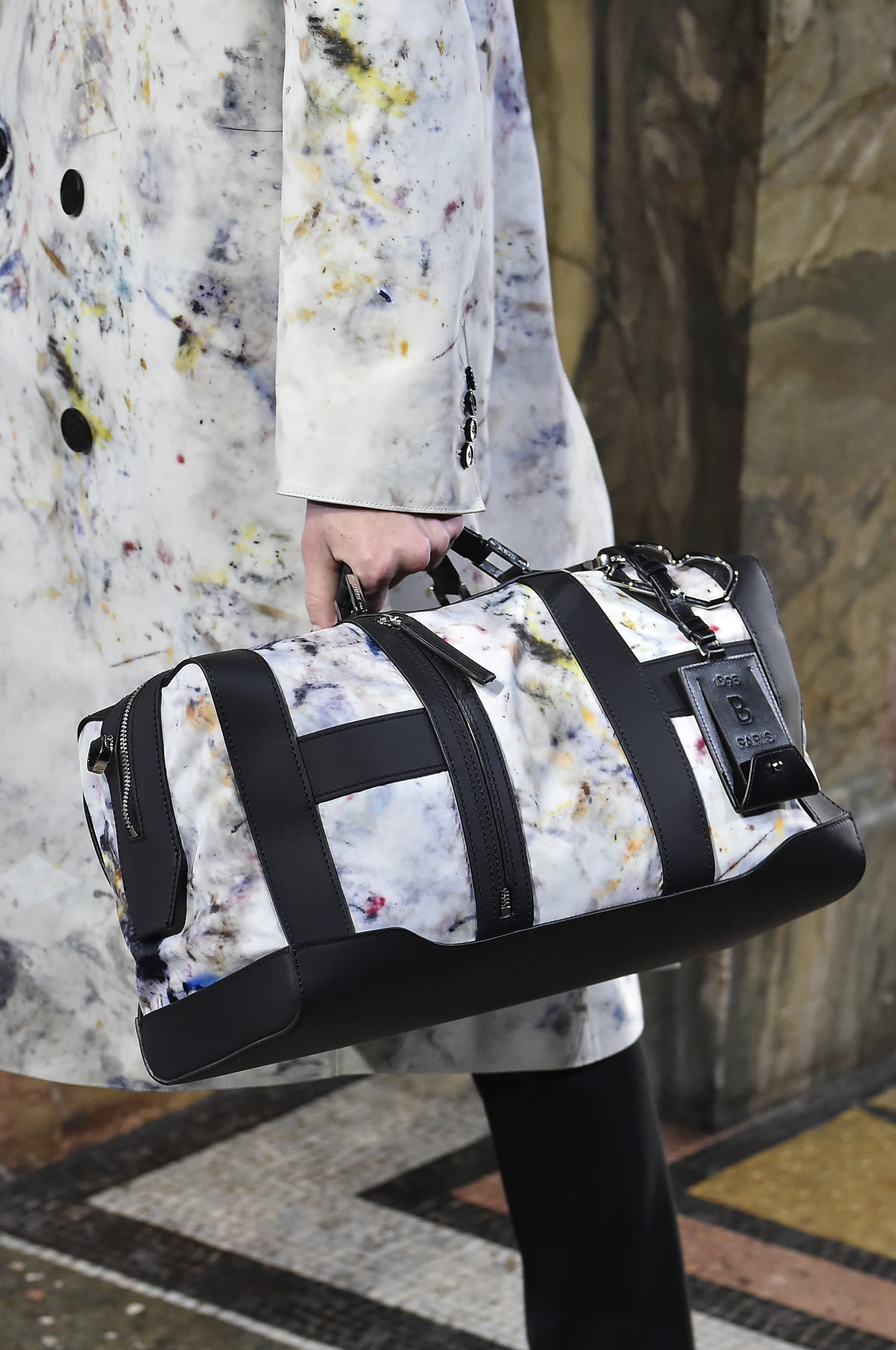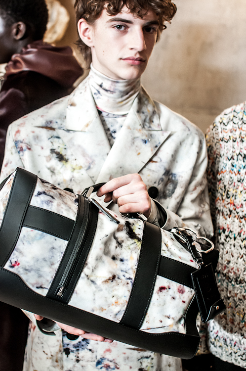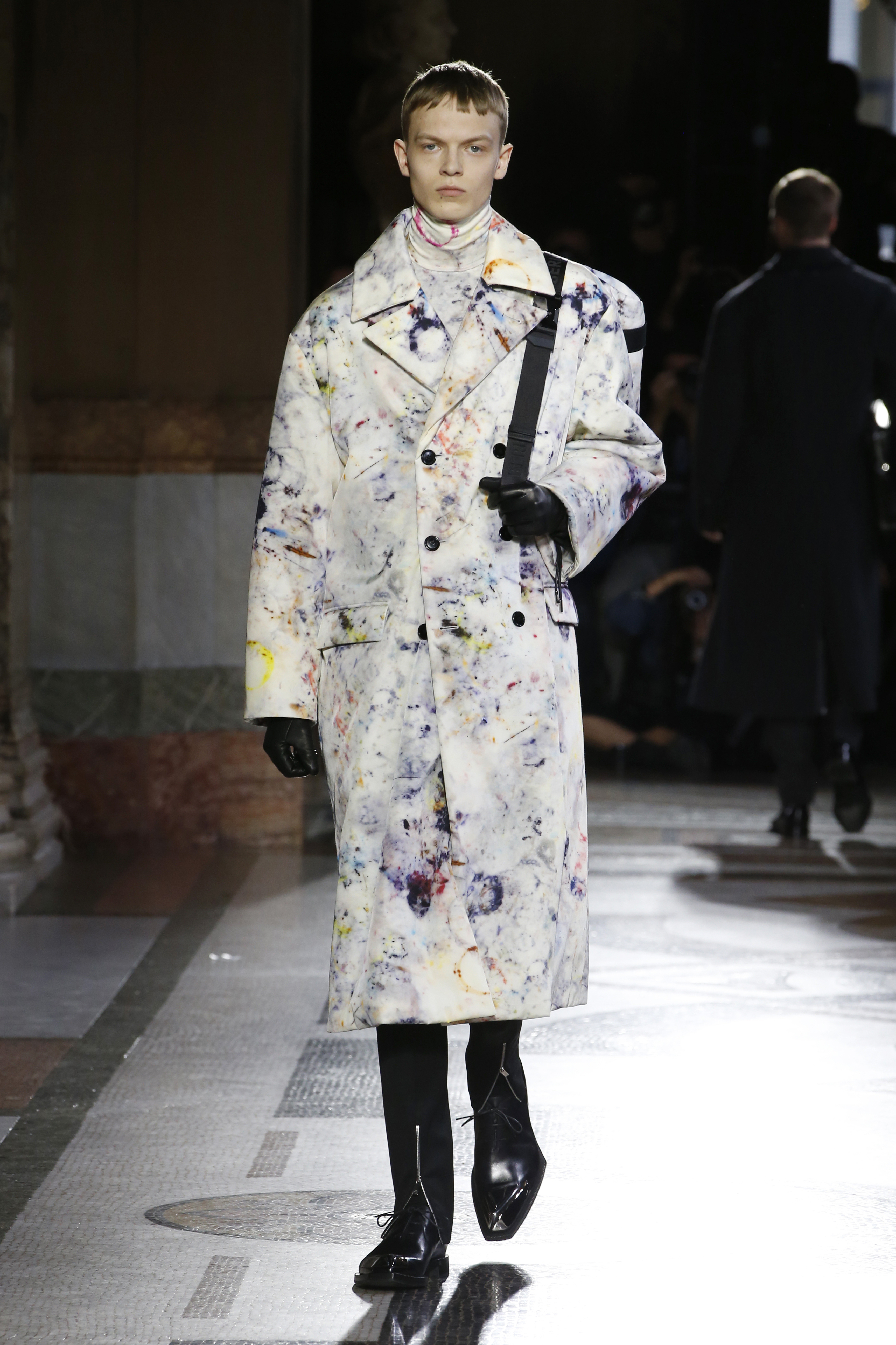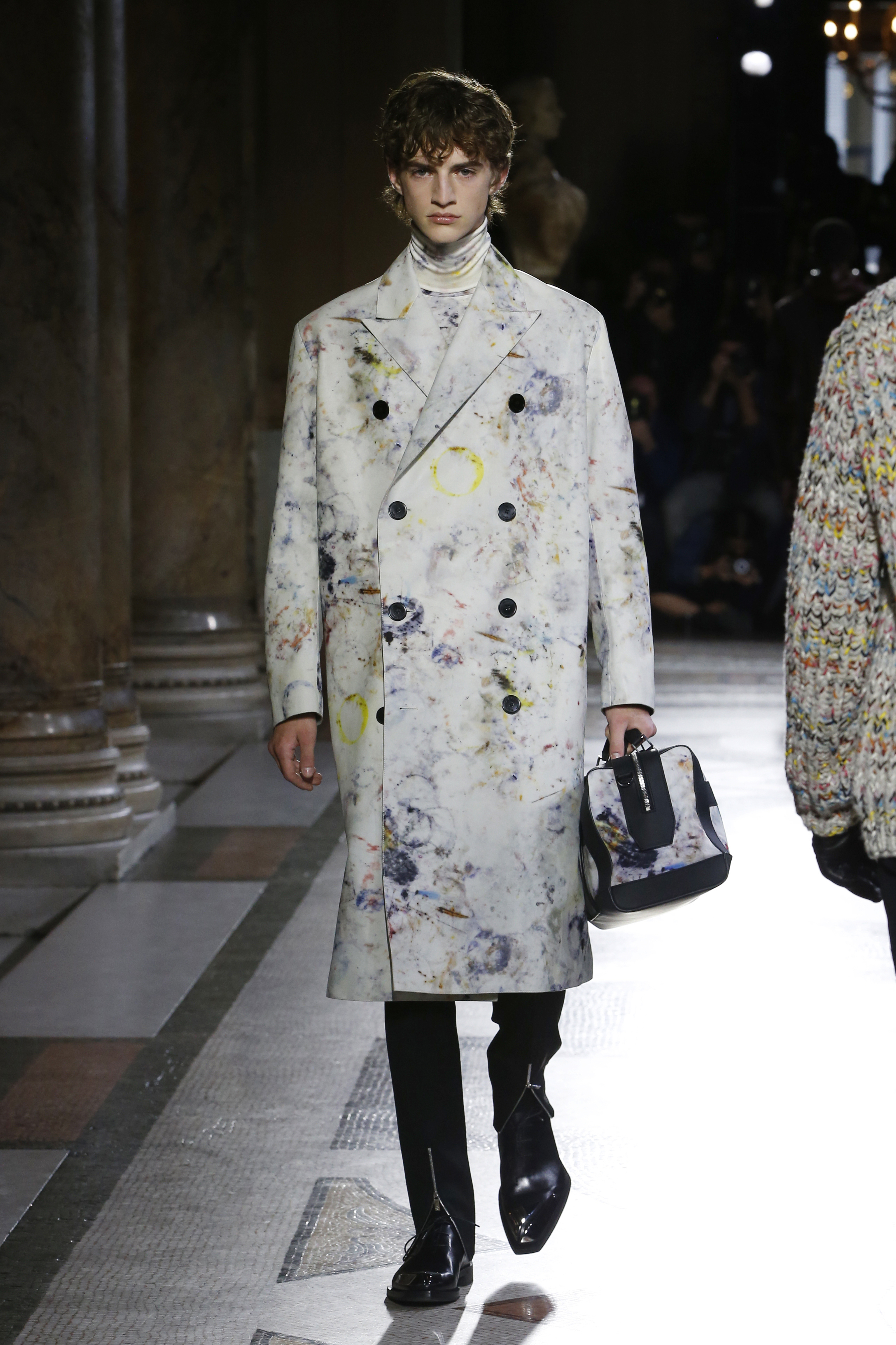The collection serves as a meta take on Berluti itself: patina, the signature colouration of the maison’s classic leather shoes is illuminated in new light. Captivated by the old marble tables at which craftsmen hand-dye the patina of shoes in Berluti’s manufattura in Ferrera, Kris Van Assche paints his collection in the multi-hued stains of their surfaces. A wealth of reds, yellows, blues, and greens saturates garments in rich colour, no two the same. The dye-splattered marble is further interpreted in print on silk shirts and nylon bags structured in exotic leather.