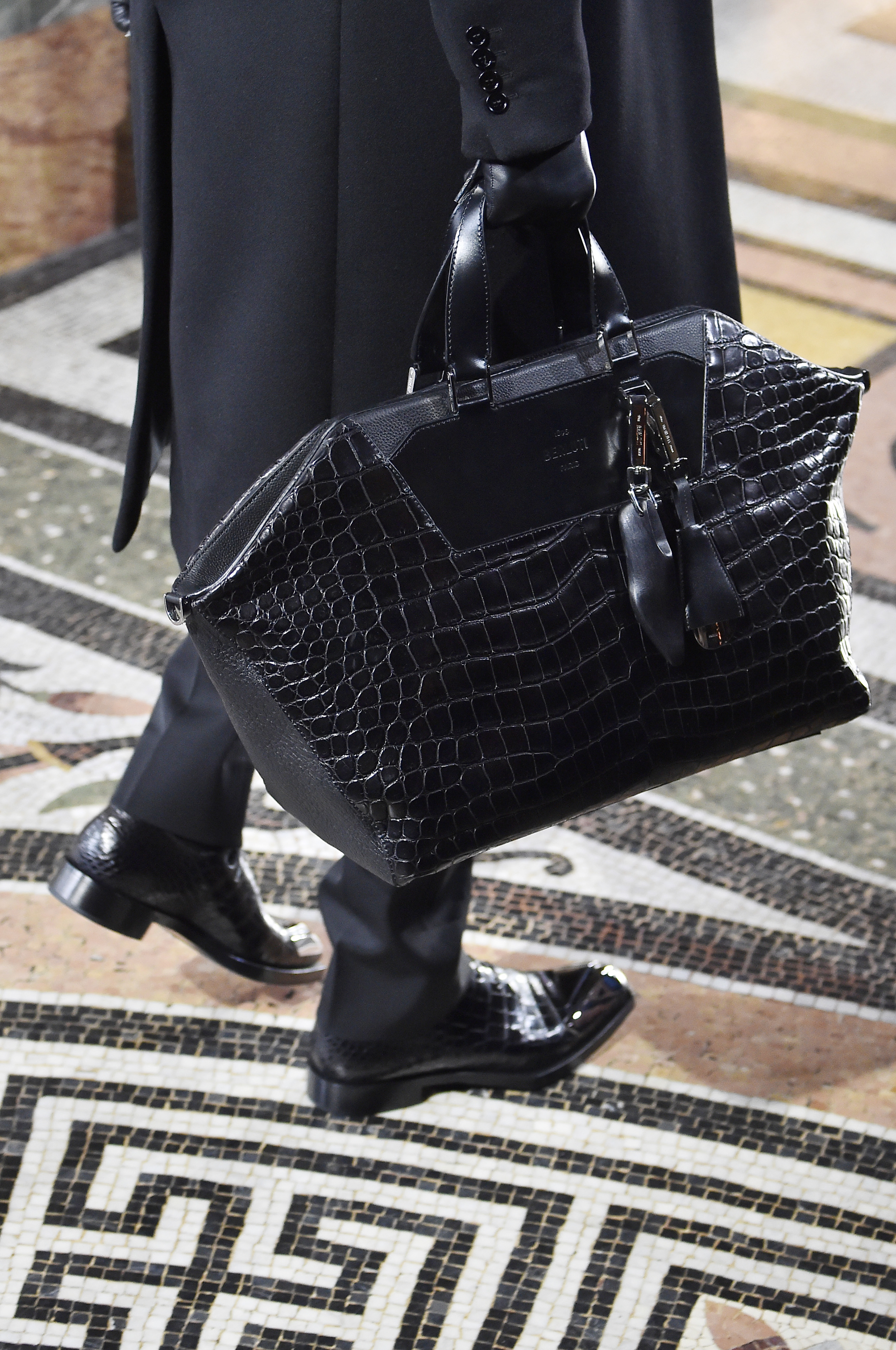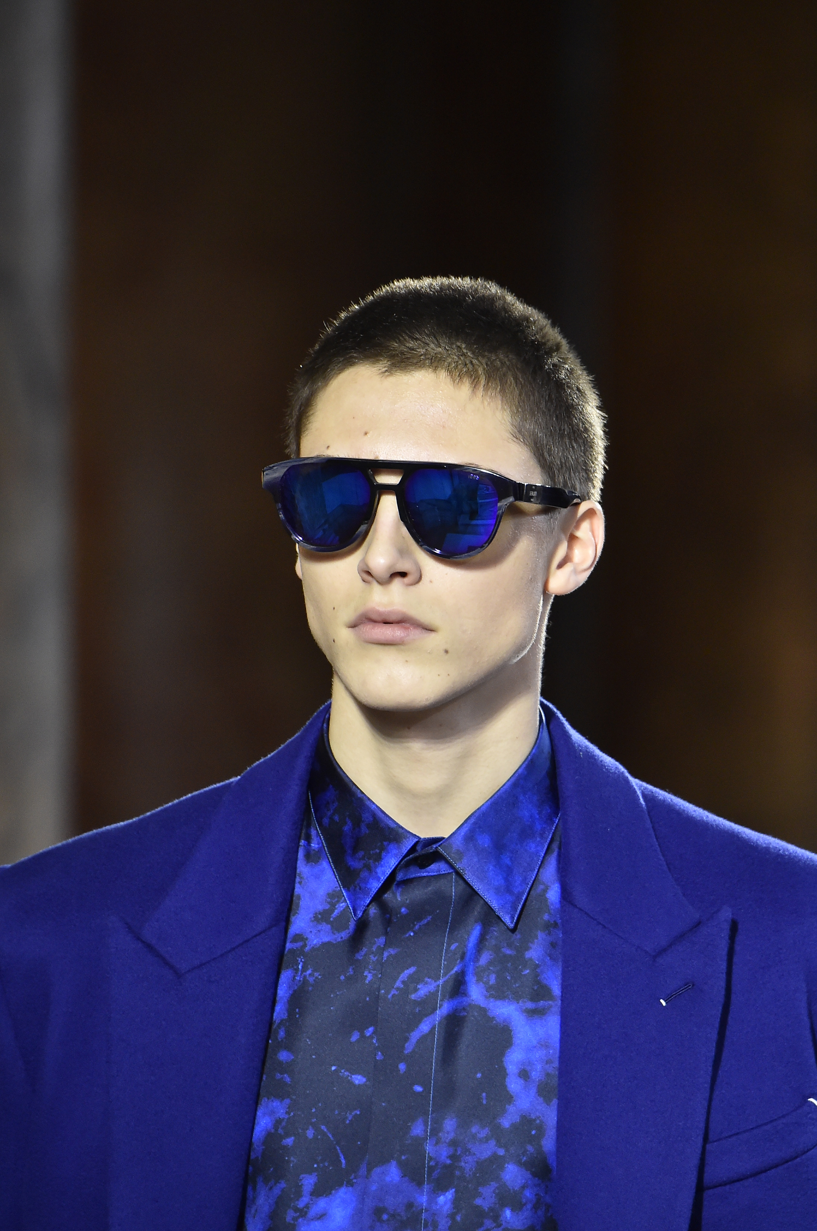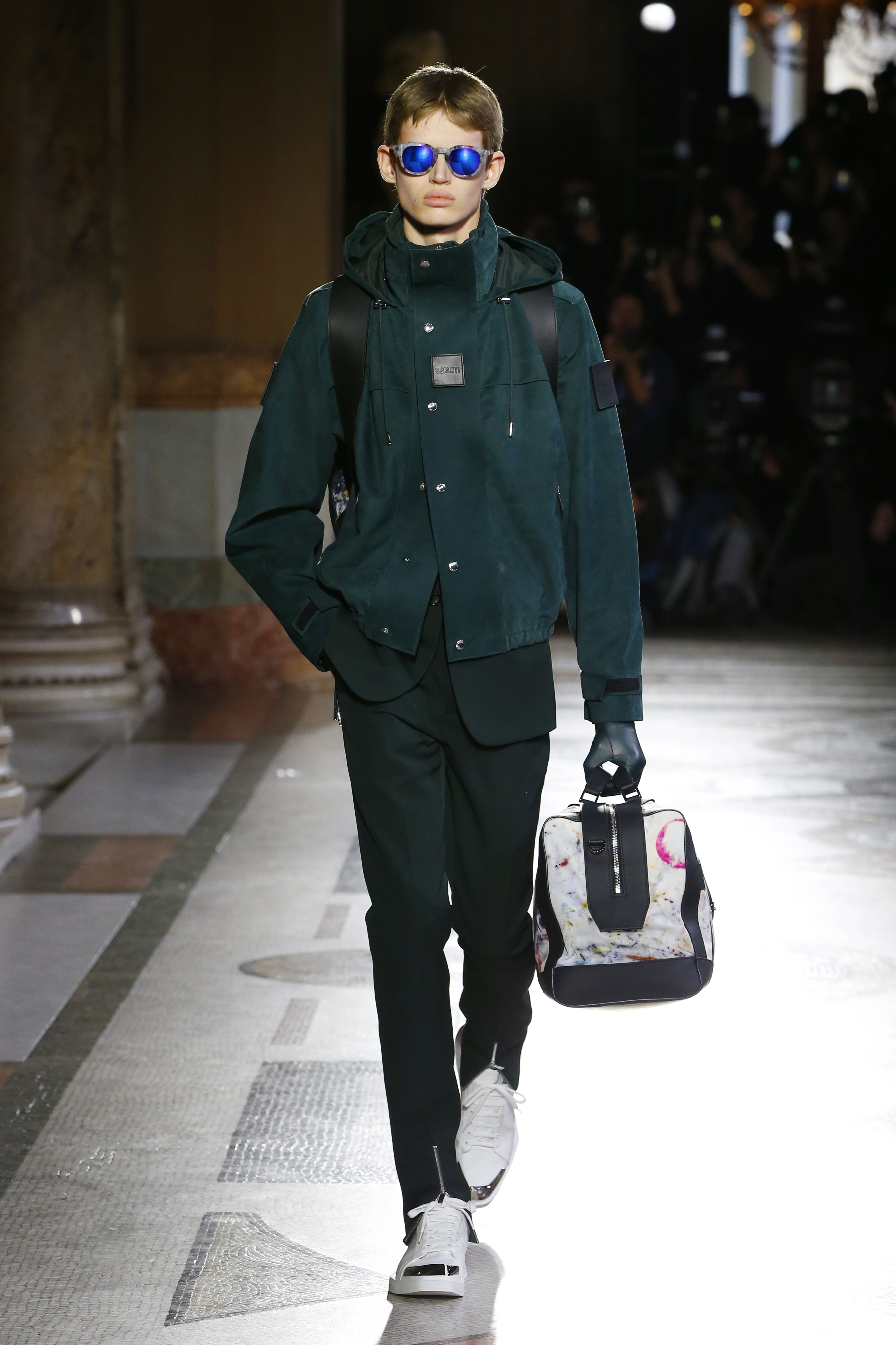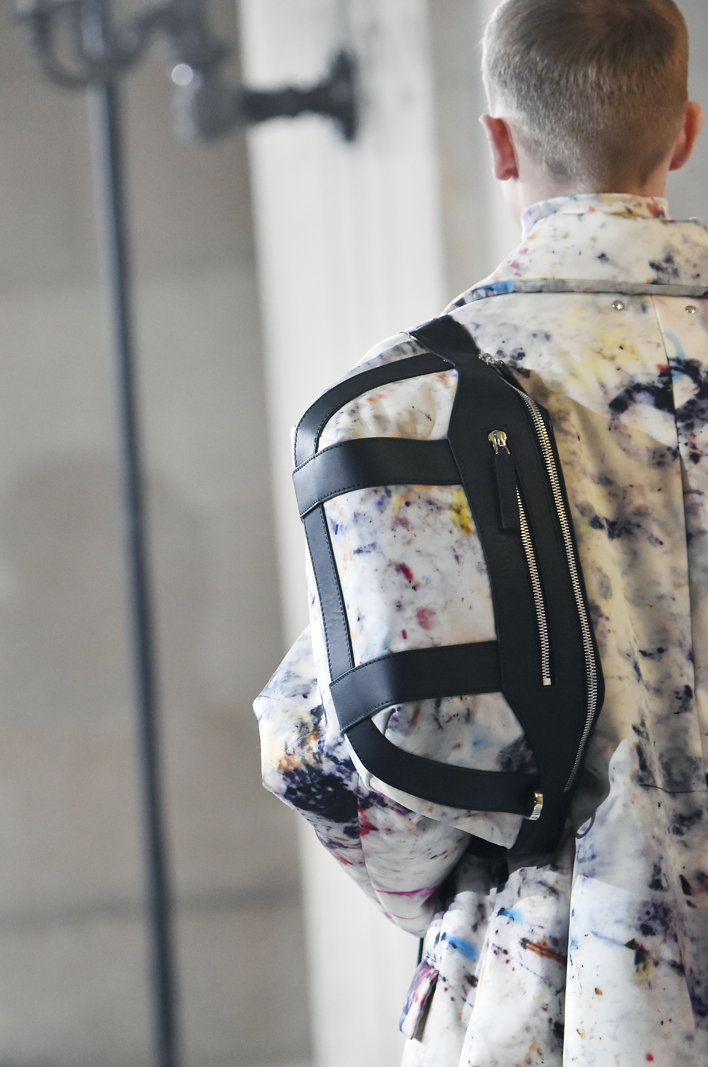 The collection serves as a meta take on Berluti itself: patina, the signature colouration of the maison’s classic leather shoes is illuminated in new light. Captivated by the old marble tables at which craftsmen hand-dye the patina of shoes in Berluti’s manufattura in Ferrera, Kris Van Assche paints his collection in the multi-hued stains of their surfaces. A wealth of reds, yellows, blues, and greens saturates garments in rich colour, no two the same. The dye-splattered marble is further interpreted in print on silk shirts and nylon bags structured in exotic leather.