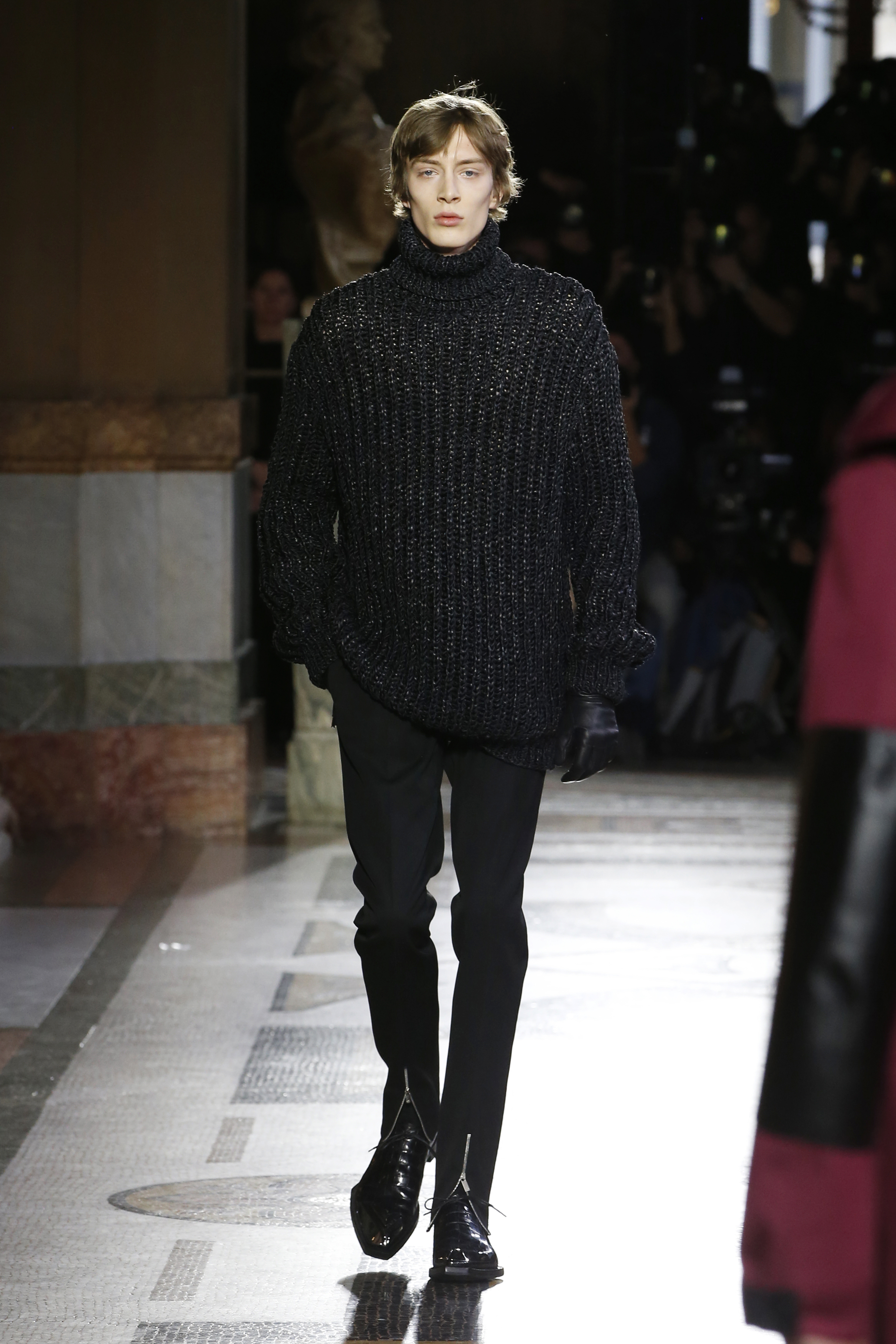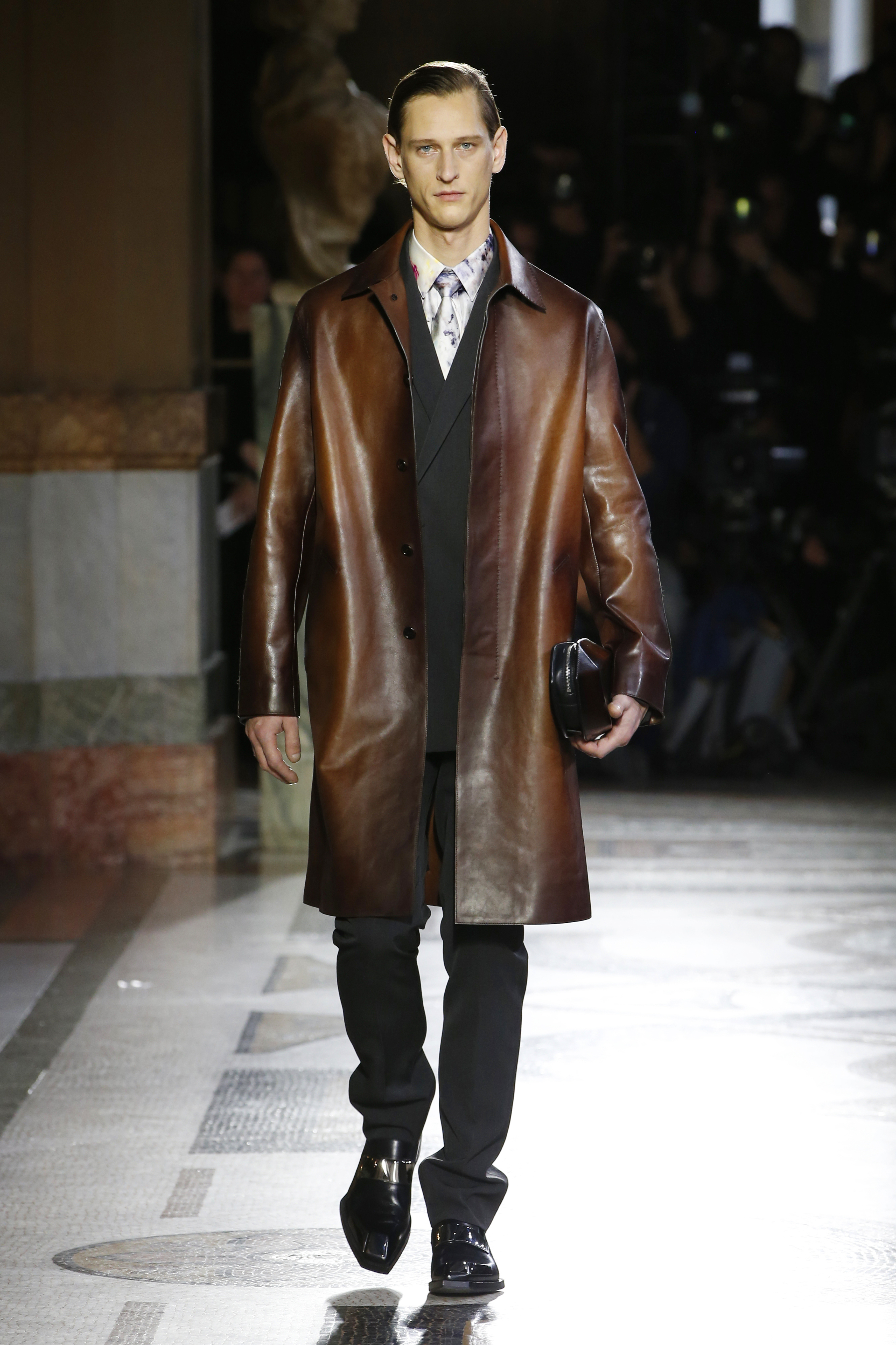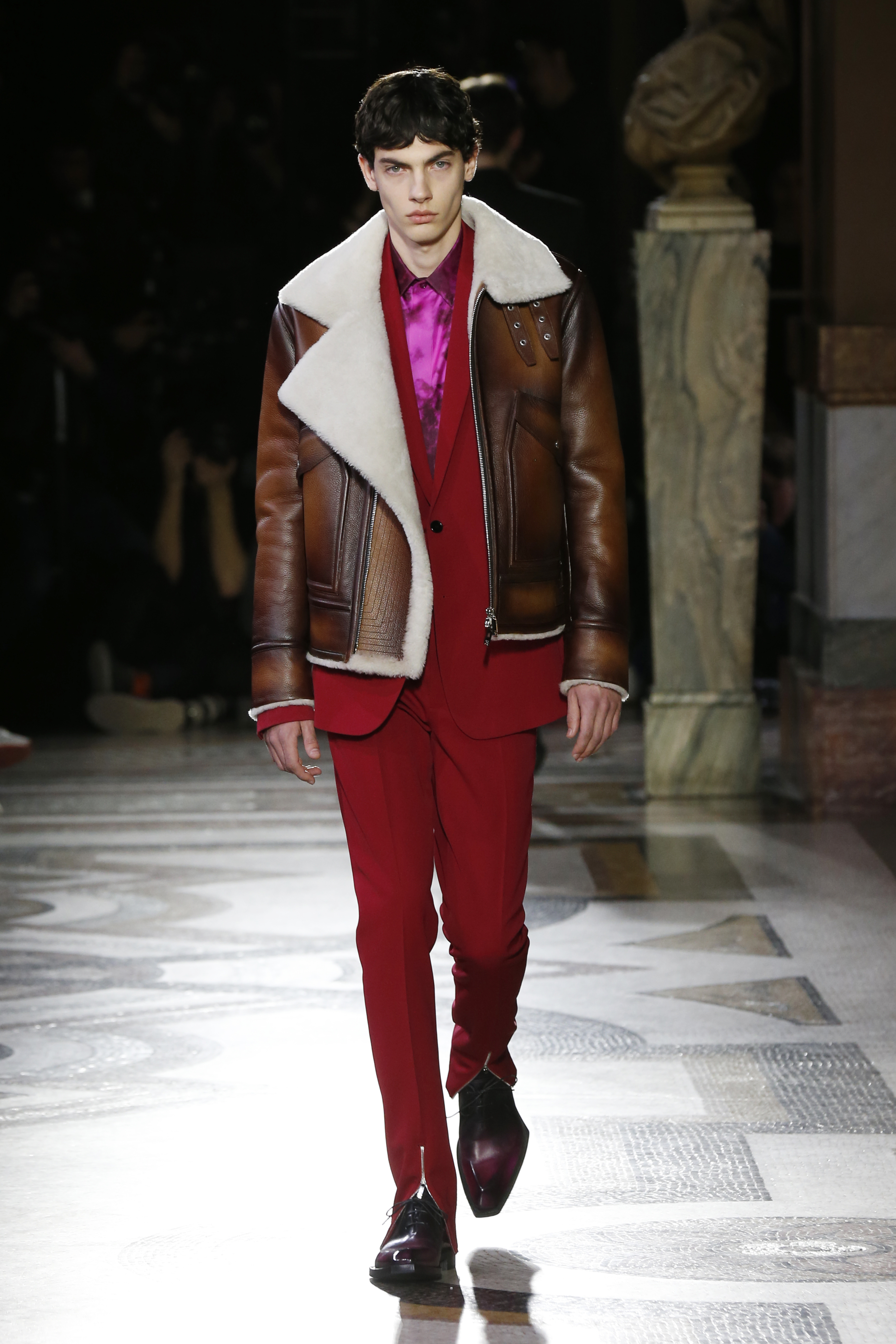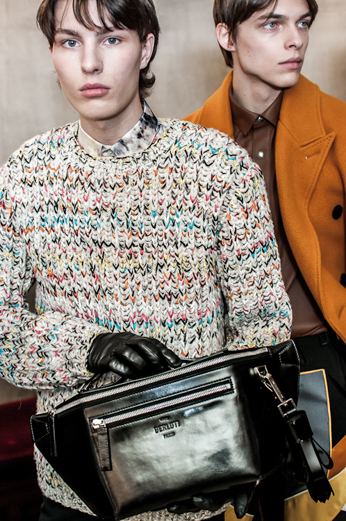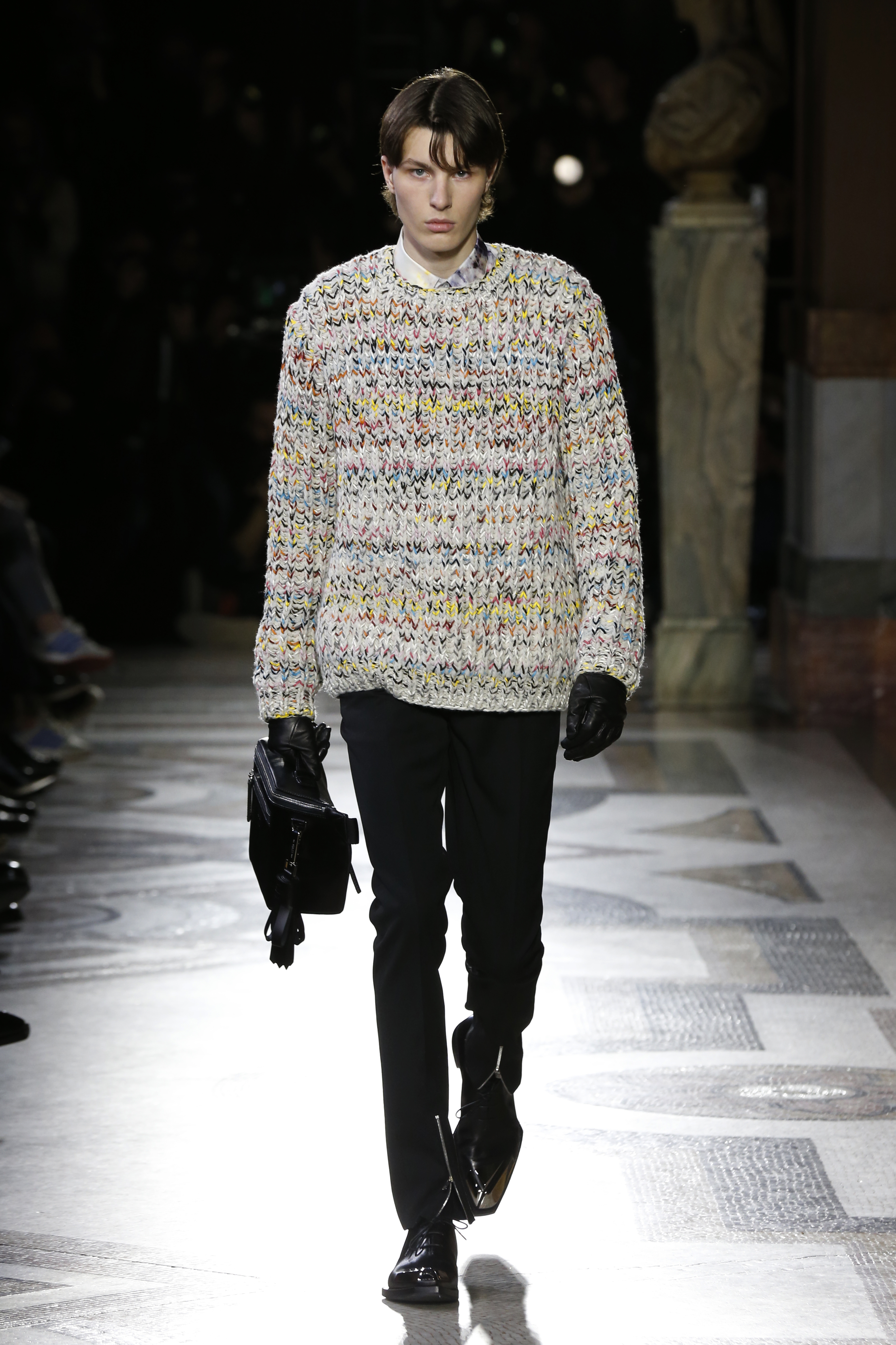 Interpreted in tailoring, the impression of patina is evoked in calfskin and jacquard suiting, expanding the artisanal core of Berluti into a broader identity. The silhouette is defined, the shoulder seater but never too controlled. It paves the way for an exuberant approach to dress where formal tailoring features side-by-side with trousers native to motocross. The idea of recalling patina, a grey shearling coat reminiscent of astrakhan, or a sweater knitted from a thousand metres of multi-coloured leather strings, which reads like yarn.