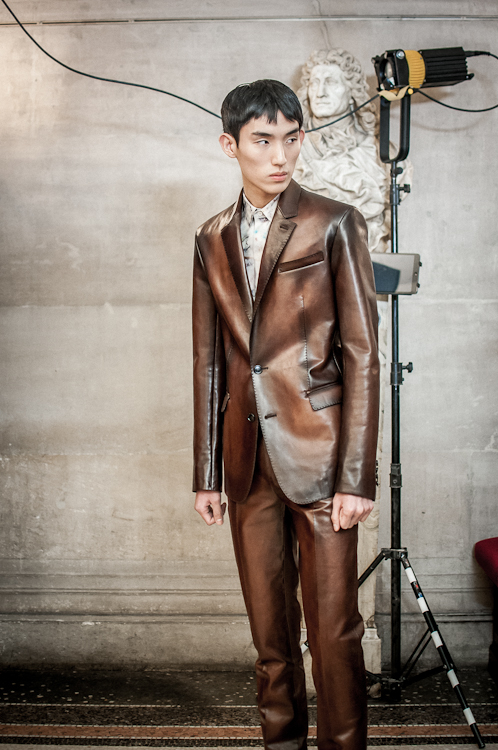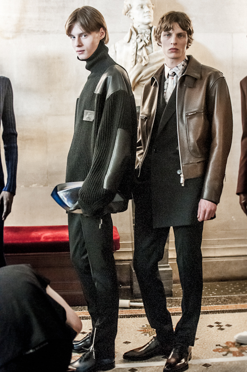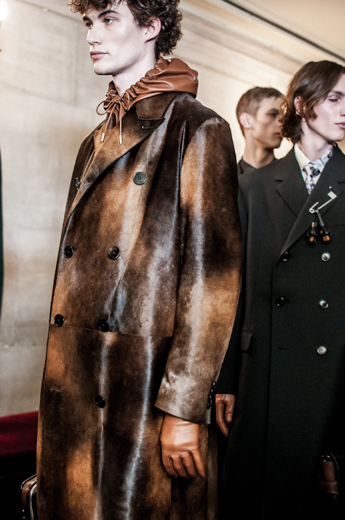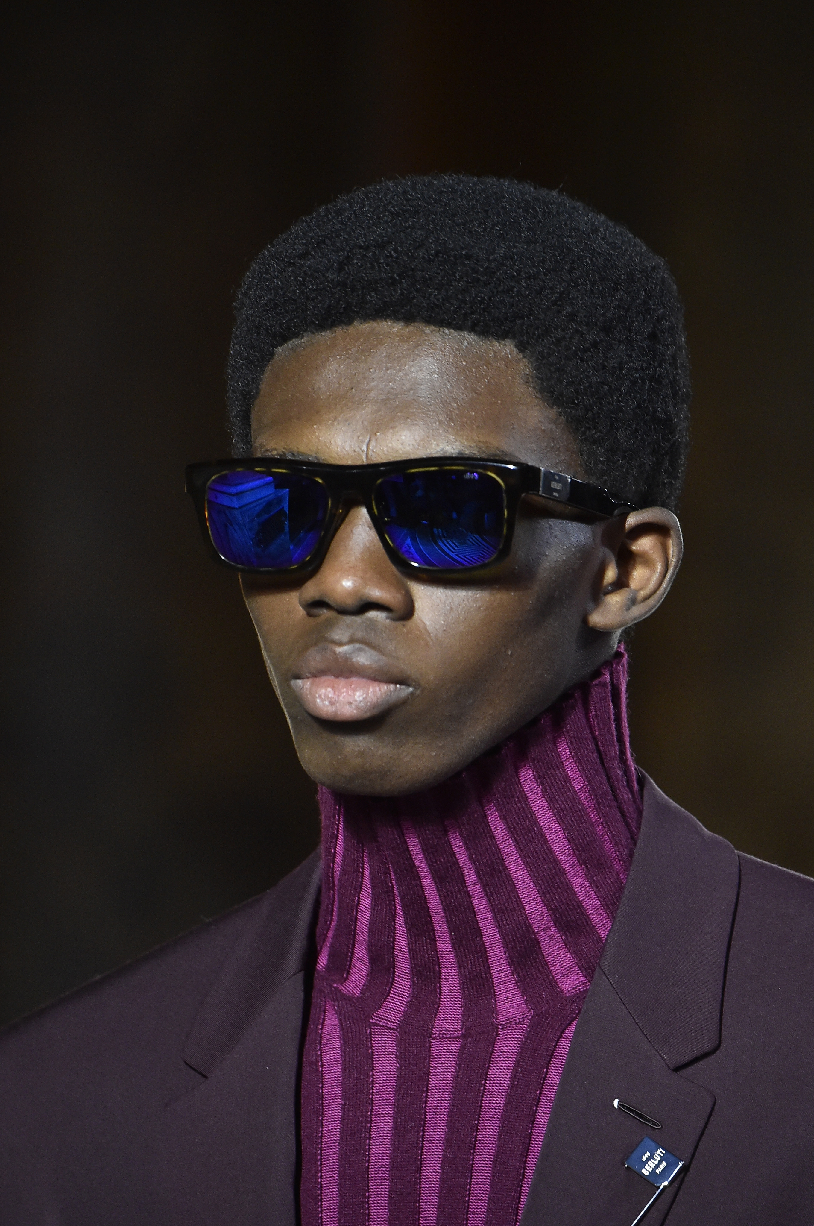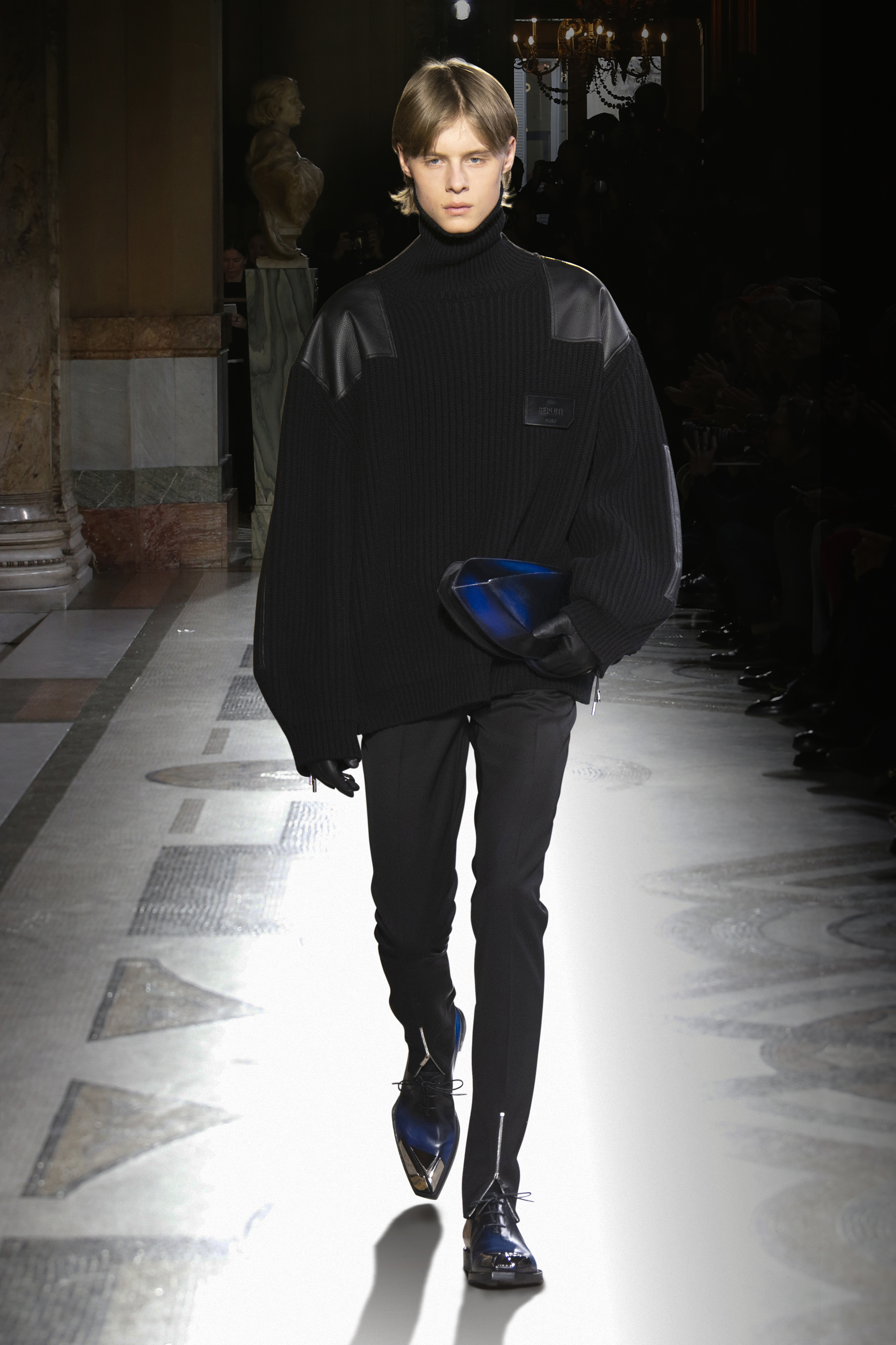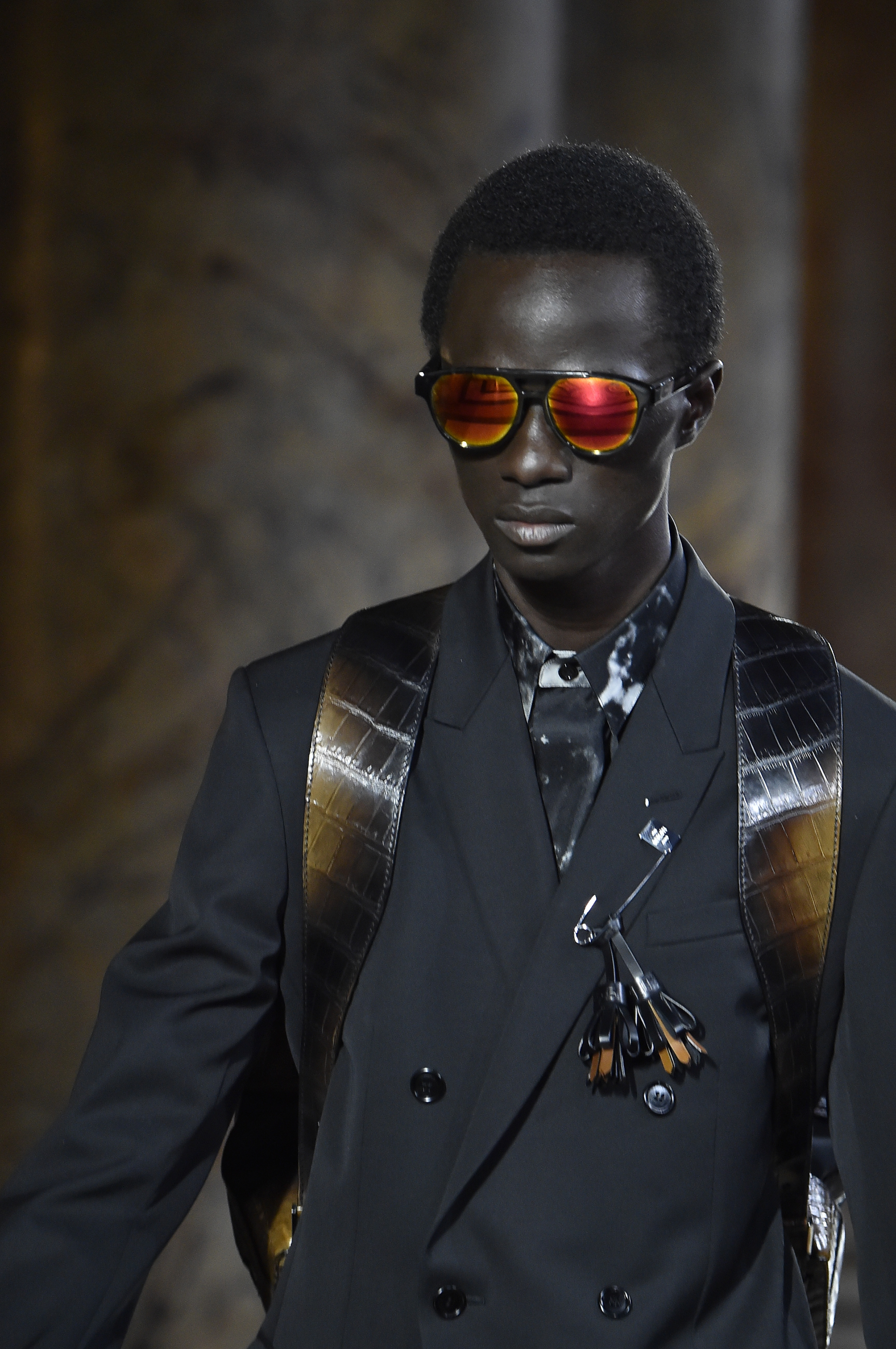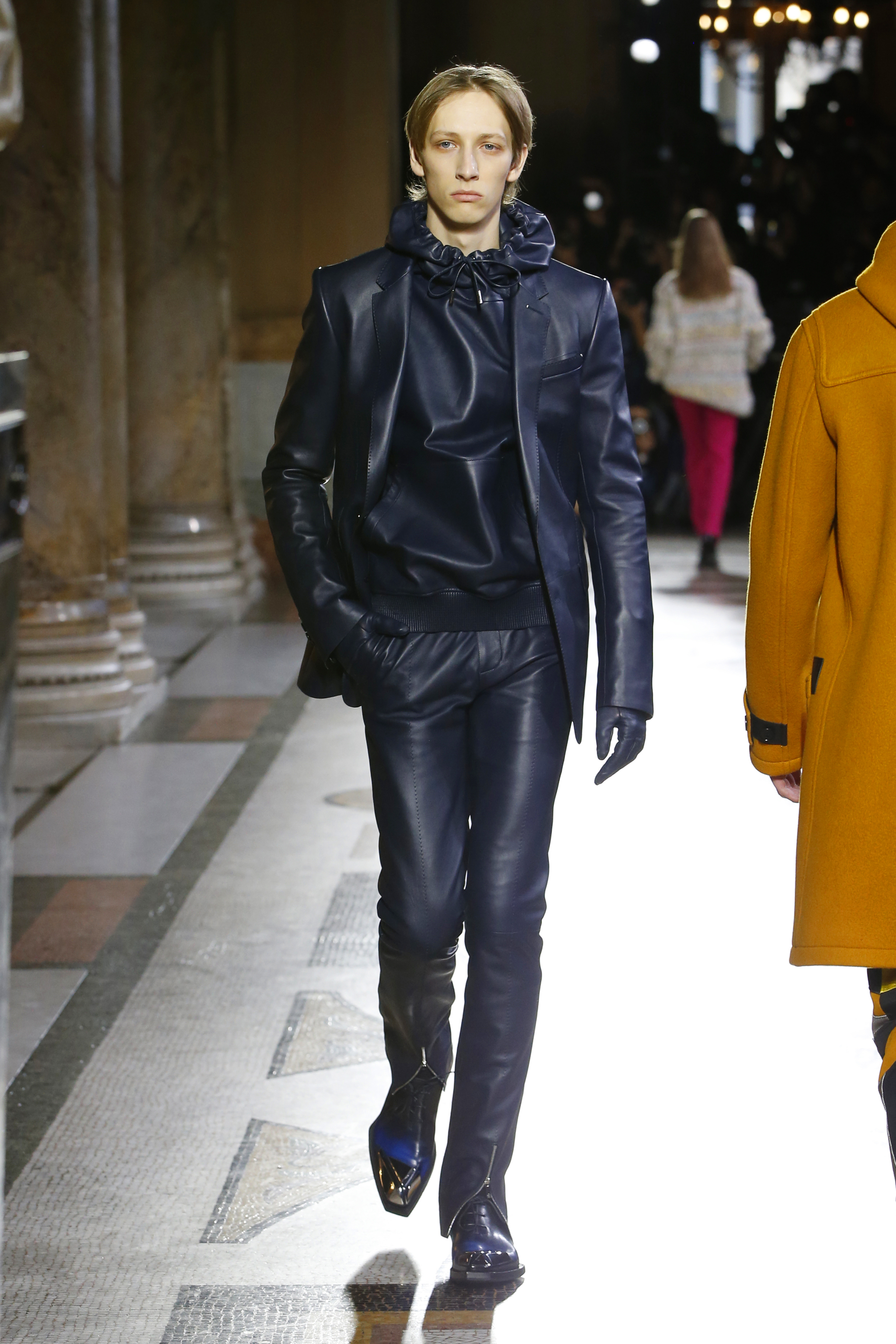 Interpreted in tailoring, the impression of patina is evoked in calfskin and jacquard suiting, expanding the artisanal core of Berluti into a broader identity. The silhouette is defined, the shoulder seater but never too controlled. It paves the way for an exuberant approach to dress where formal tailoring features side-by-side with trousers native to motocross. The idea of recalling patina, a grey shearling coat reminiscent of astrakhan, or a sweater knitted from a thousand metres of multi-coloured leather strings, which reads like yarn.